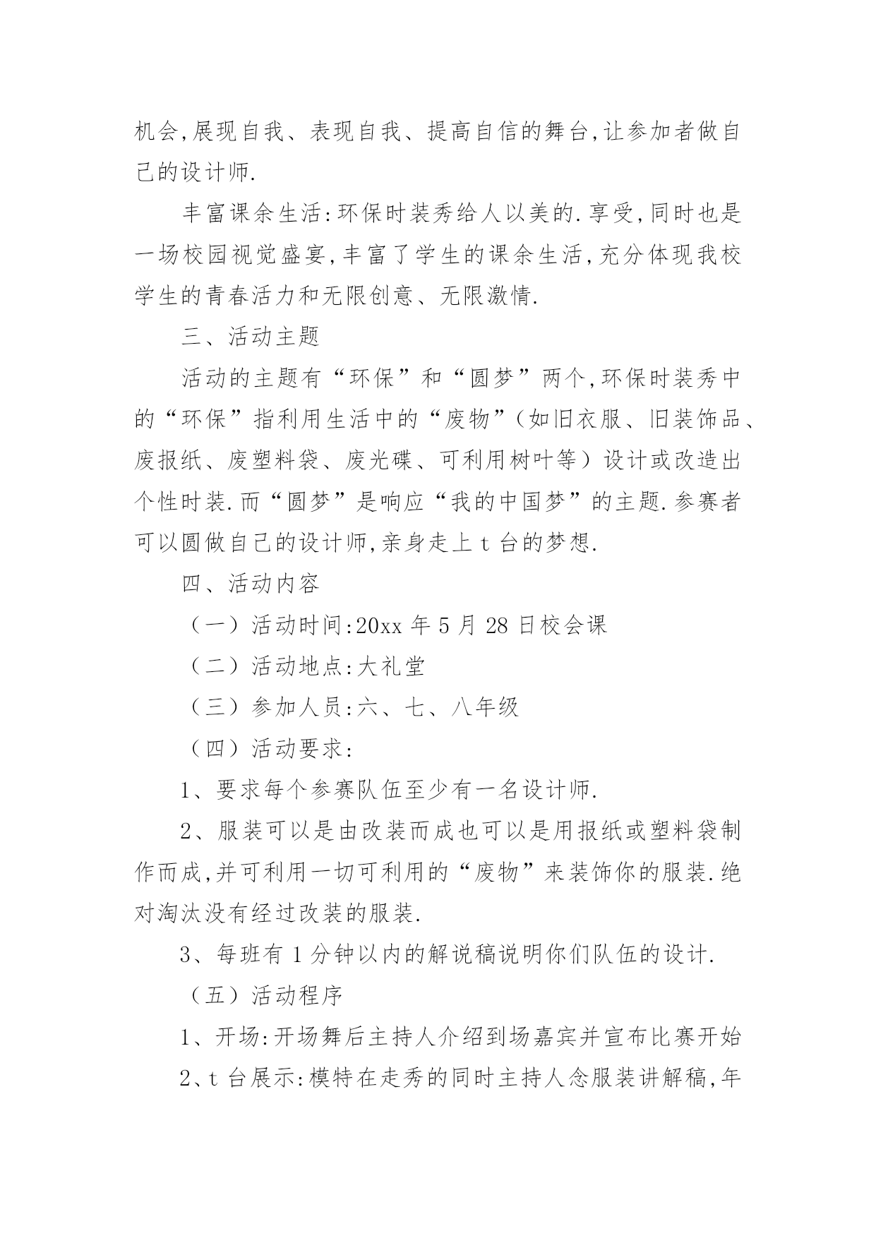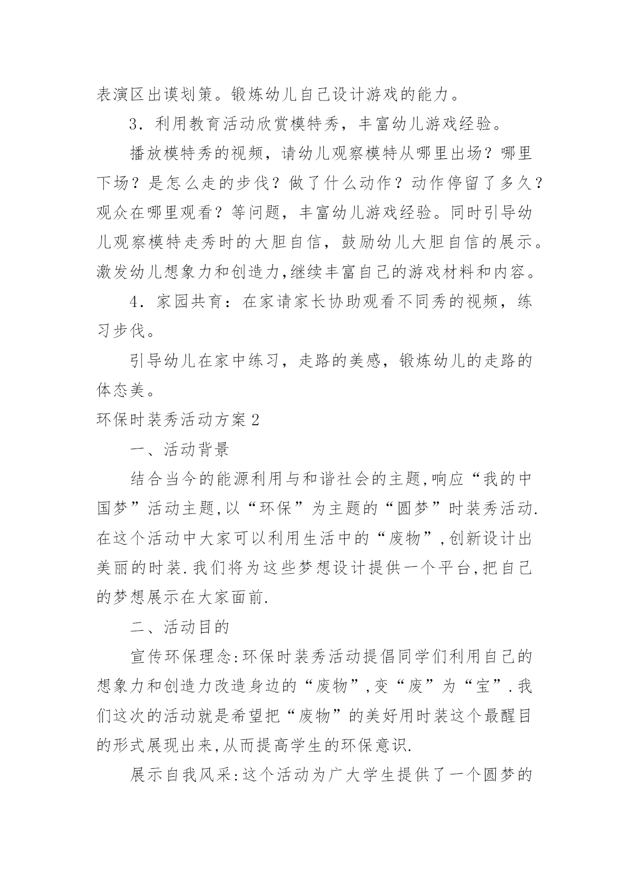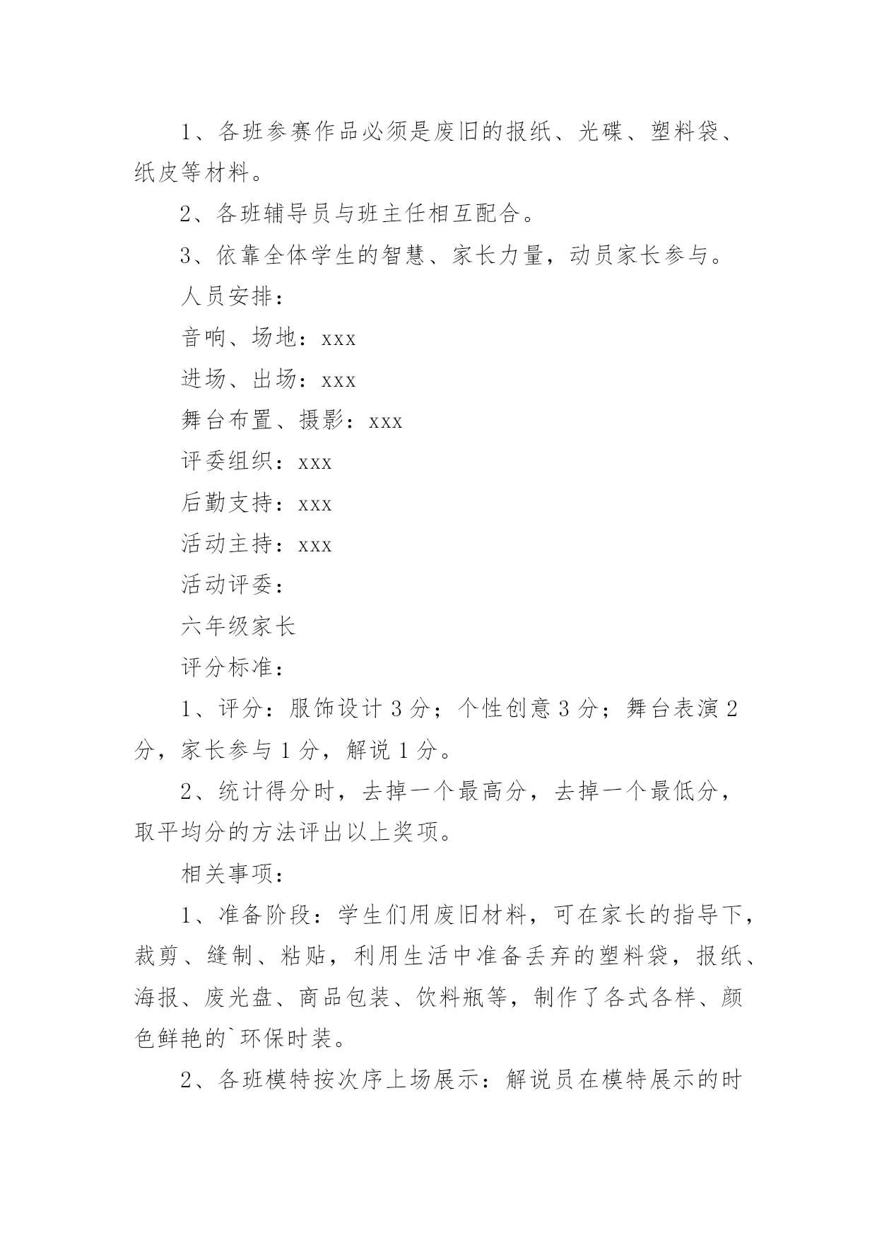 环保时装秀活动方案环保时装秀活动方案为保证事情或工作高起点、高质量、高水平开展,通常需要提前准备好一份方案,方案属于计划类文书的一种。写方案需要注意哪些格式呢?下面是小编为大家收集的环保时装秀活动方案,仅供参考,希望能够帮助到大家。环保时装秀活动方案1第十四届“当代杯"全国幼儿教师职业技能大赛--观察记录参赛作者王畅参赛作品名称我们的环保时装秀观察对象表演区幼儿年龄段/班大班观察时间20xx.04.13观察背景随着主题的开展,孩子们在美工区制作了环保服装,起初只是卖超市,后来小朋友们商量可以用这些服装做什么呢?于是表演区的环保时装秀开始了……观察目标幼儿的环保时装秀游戏情况观察过程今天琪琪和另外4名幼儿来到表演区,他们先分别把屏风横在走廊一字型放好,左边留了一个口,就这样屏风自然隔离开了前台和后场,然后又把服装架挪到了后台。然后琪琪对小朋友说:“好啦我们去超市买衣服吧!”于是他们来到超市挑选自己的走秀服装,付好钱后回到区中。琪琪对另外4名小朋友说:“咱们排成一队,从这里上场”见他们都站好后,她放开音乐,第一个走了出去。只见她双臂摆动,大步的往前走,走到大二班后门的安全标志处转身摆了一个爱心的姿势,然后立即就往回走。一边走一边向下一个小朋友招手。下一个小朋友雨涵看到后赶紧走了出来,甚至带些小跑,走到班级最后一组衣帽柜处,匆忙做了个动作然后就往回跑。琪琪又示意下一个小朋友出场,容容刚要往外走,正好和回来的雨涵面碰面,雨涵只好等她过去后再到后场,身体贴在了墙边,给她让路。她缓缓的步伐走到安全标志处,做了一个提着裙摆下蹲的动作,然后又缓缓的走回,走到一半时,最后一个小博出场了。他迈着较快的步伐,走到衣帽柜处,快速的做了个“耶”的姿势,然后害羞的一笑,捂着嘴小跑着回来,到了后场。第一场秀就这样结束了。观察分析与反思分析:1.幼儿兴趣方面:能看出幼儿对自己发起的表演游戏内容很感兴趣,男孩女孩都喜欢参加。2.幼儿已有经验:幼儿能够自己组织协商进行走秀前的服装道具准备,并且有一定的.走秀知识经验,知道要从后场走到前台,从一端走到另一端,要摆姿势。3.幼儿自我表现方面:在走秀的展示中可以看出佳容婧琪相对比较自信,展示自己的时候很大方。另外几个小朋友有展示的时候稍稍有些害羞不自信。4.未知经验幼儿游戏中,具体的从哪里上场,从哪里下场?怎么走?到哪里停下来做动作?幼儿都不太清楚,游戏中也没有具体的协商制定,有的走的靠前,有的靠后,可以看出幼儿缺乏细致的经验。反思:1.分析走秀精彩照片,鼓励表扬幼儿,激发幼儿自信。把活动区中给幼儿抓拍的好看的姿势照片和服装打扮放给幼儿看,鼓励表扬表演区幼儿,为其建立自信。2.师幼共同讨论关于模特走秀的话题,了解幼儿相关经验。通过讨论了解幼儿想知道关于走模特的什么知识,为幼儿有针对性的丰富经验。同时幼儿间能够相互传递经验,为表演区出谟划策。锻炼幼儿自己设计游戏的能力。3.利用教育活动欣赏模特秀,丰富幼儿游戏经验。播放模特秀的视频,请幼儿观察模特从哪里出场?哪里下场?是怎么走的步伐?做了什么动作?动作停留了多久?观众在哪里观看?等问题,丰富幼儿游戏经验。同时引导幼儿观察模特走秀时的大胆自信,鼓励幼儿大胆自信的展示。激发幼儿想象力和创造力,继续丰富自己的游戏材料和内容。4.家园共育:在家请家长协助观看不同秀的视频,练习步伐。引导幼儿在家中练习,走路的美感,锻炼幼儿的走路的体态美。环保时装秀活动方案2一、活动背景结合当今的能源利用与和谐社会的主题,响应“我的中国梦”活动主题,以“环保”为主题的“圆梦”时装秀活动.在这个活动中大家可以利用生活中的“废物”,创新设计出美丽的时装.我们将为这些梦想设计提供一个平台,把自己的梦想展示在大家面前.二、活动目的宣传环保理念:环保时装秀活动提倡同学们利用自己的想象力和创造力改造身边的“废物”,变“废”为“宝”.我们这次的活动就是希望把“废物”的美好用时装这个最醒目的形式展现出来,从而提高学生的环保意识.展示自我风采:这个活动为广大学生提供了一个圆梦的机会,展现自我、表现自我、提高自信的舞台,让参加者做自己的设计师.丰富课余生活:环保时装秀给人以美的.享受,同时也是一场校园视觉盛宴,丰富了学生的课余生活,充分体现我校学生的青春活力和无限创意、无限激情.三、活动主题活动的主题有“环保”和“圆梦”两个,环保时装秀中的“环保”指利用生活中的“废物”(如旧衣服、旧装饰品、废报纸、废塑料袋、废光碟、可利用树叶等)设计或改造出个性时装.而“圆梦”是响应“我的中国梦”的主题.参赛者可以圆做自己的设计师,亲身走上t台的梦想.四、活动内容(一)活动时间:20xx年5月28日校会课(二)活动地点:大礼堂(三)参加人员:六、七、八年级(四)活动要求:1、要求每个参赛队伍至少有一名设计师.2、服装可以是由改装而