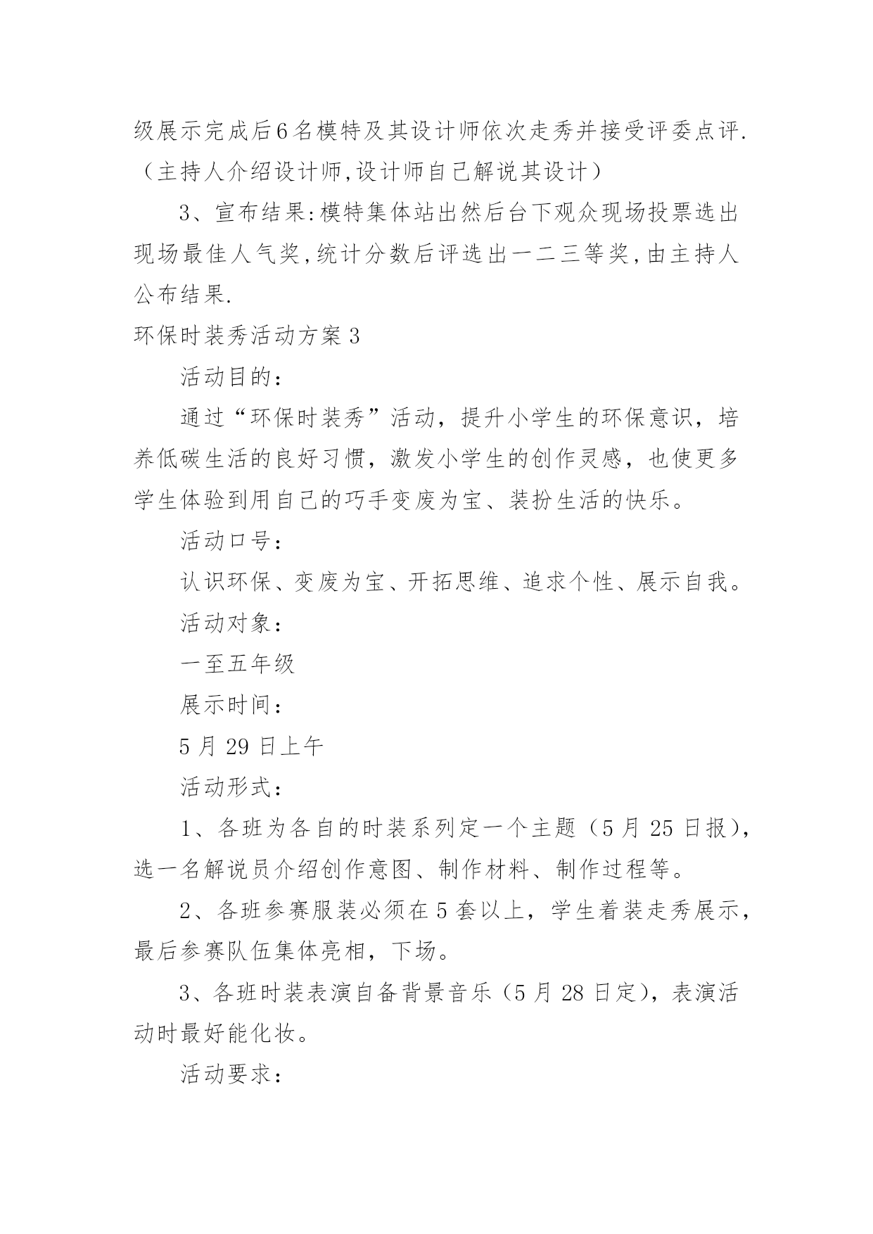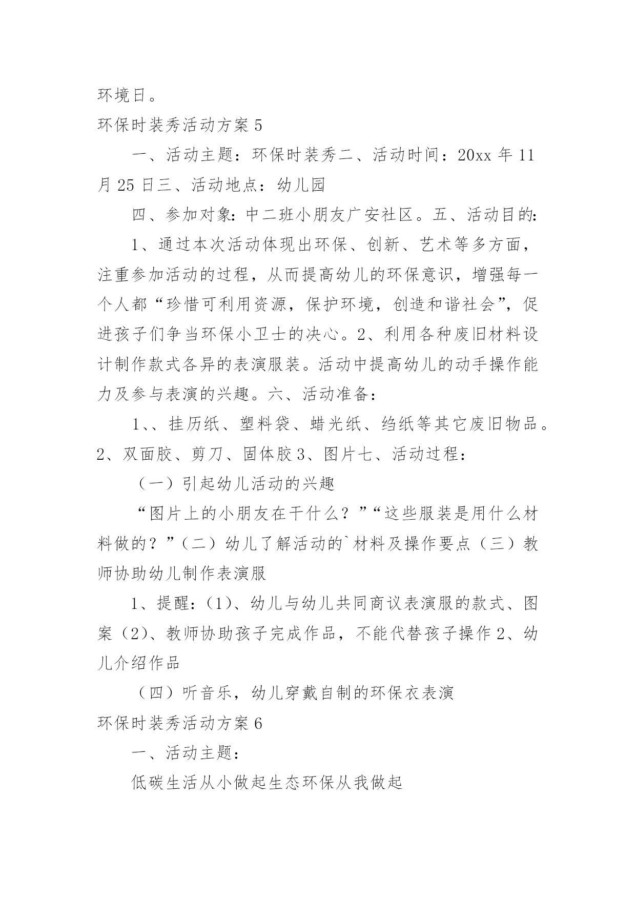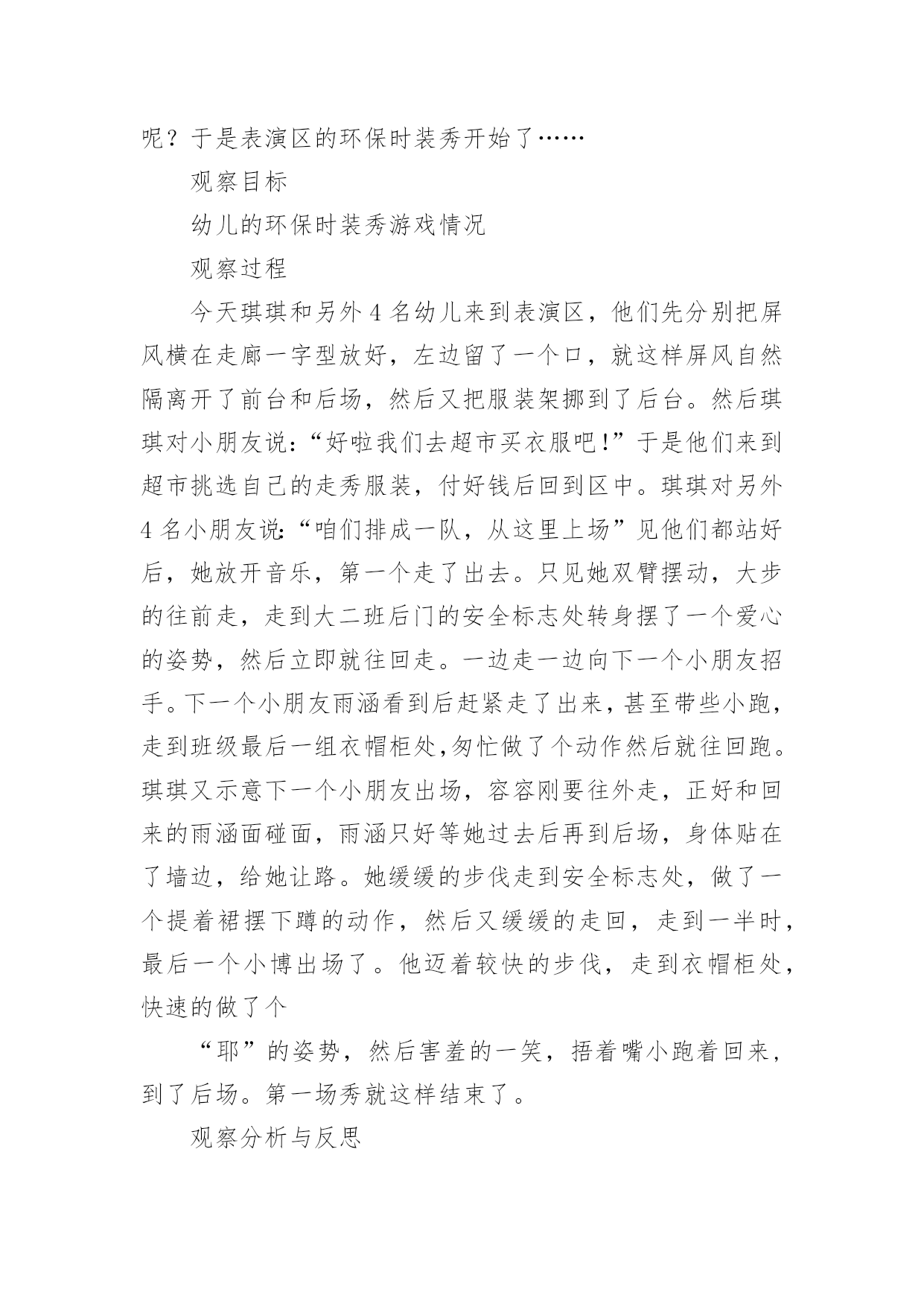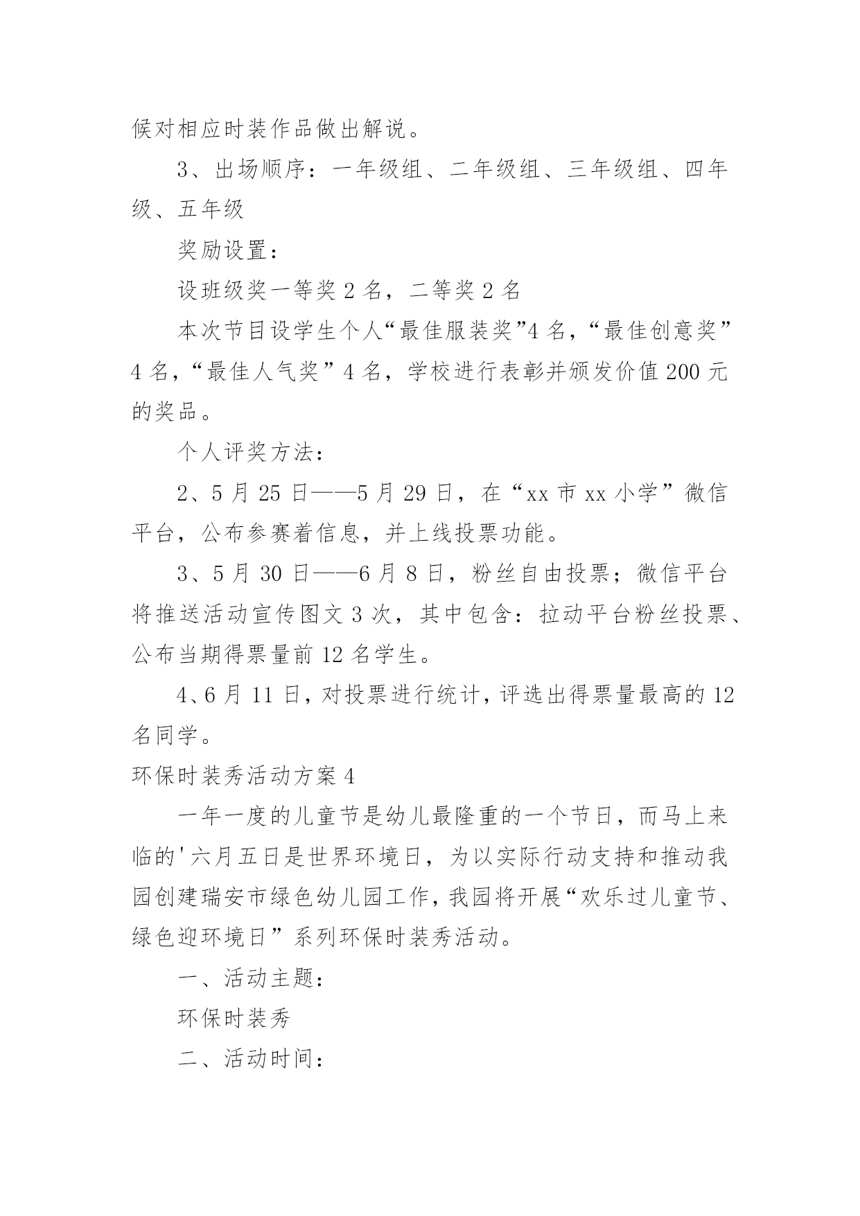 环保时装秀活动方案环保时装秀活动方案为保证事情或工作高起点、高质量、高水平开展,通常需要提前准备好一份方案,方案属于计划类文书的一种。写方案需要注意哪些格式呢?下面是小编为大家收集的环保时装秀活动方案,仅供参考,希望能够帮助到大家。环保时装秀活动方案1第十四届“当代杯"全国幼儿教师职业技能大赛--观察记录参赛作者王畅参赛作品名称我们的环保时装秀观察对象表演区幼儿年龄段/班大班观察时间20xx.04.13观察背景随着主题的开展,孩子们在美工区制作了环保服装,起初只是卖超市,后来小朋友们商量可以用这些服装做什么呢?于是表演区的环保时装秀开始了……观察目标幼儿的环保时装秀游戏情况观察过程今天琪琪和另外4名幼儿来到表演区,他们先分别把屏风横在走廊一字型放好,左边留了一个口,就这样屏风自然隔离开了前台和后场,然后又把服装架挪到了后台。然后琪琪对小朋友说:“好啦我们去超市买衣服吧!”于是他们来到超市挑选自己的走秀服装,付好钱后回到区中。琪琪对另外4名小朋友说:“咱们排成一队,从这里上场”见他们都站好后,她放开音乐,第一个走了出去。只见她双臂摆动,大步的往前走,走到大二班后门的安全标志处转身摆了一个爱心的姿势,然后立即就往回走。一边走一边向下一个小朋友招手。下一个小朋友雨涵看到后赶紧走了出来,甚至带些小跑,走到班级最后一组衣帽柜处,匆忙做了个动作然后就往回跑。琪琪又示意下一个小朋友出场,容容刚要往外走,正好和回来的雨涵面碰面,雨涵只好等她过去后再到后场,身体贴在了墙边,给她让路。她缓缓的步伐走到安全标志处,做了一个提着裙摆下蹲的动作,然后又缓缓的走回,走到一半时,最后一个小博出场了。他迈着较快的步伐,走到衣帽柜处,快速的做了个“耶”的姿势,然后害羞的一笑,捂着嘴小跑着回来,到了后场。第一场秀就这样结束了。观察分析与反思分析:1.幼儿兴趣方面:能看出幼儿对自己发起的表演游戏内容很感兴趣,男孩女孩都喜欢参加。2.幼儿已有经验:幼儿能够自己组织协商进行走秀前的服装道具准备,并且有一定的.走秀知识经验,知道要从后场走到前台,从一端走到另一端,要摆姿势。3.幼儿自我表现方面:在走秀的展示中可以看出佳容婧琪相对比较自信,展示自己的时候很大方。另外几个小朋友有展示的时候稍稍有些害羞不自信。4.未知经验幼儿游戏中,具体的从哪里上场,从哪里下场?怎么走?到哪里停下来做动作?幼儿都不太清楚,游戏中也没有具体的协商制定,有的走的靠前,有的靠后,可以看出幼儿缺乏细致的经验。反思:1.分析走秀精彩照片,鼓励表扬幼儿,激发幼儿自信。把活动区中给幼儿抓拍的好看的姿势照片和服装打扮放给幼儿看,鼓励表扬表演区幼儿,为其建立自信。2.师幼共同讨论关于模特走秀的话题,了解幼儿相关经验。通过讨论了解幼儿想知道关于走模特的什么知识,为幼儿有针对性的丰富经验。同时幼儿间能够相互传递经验,为表演区出谟划策。锻炼幼儿自己设计游戏的能力。3.利用教育活动欣赏模特秀,丰富幼儿游戏经验。播放模特秀的视频,请幼儿观察模特从哪里出场?哪里下场?是怎么走的步伐?做了什么动作?动作停留了多久?观众在哪里观看?等问题,丰富幼儿游戏经验。同时引导幼儿观察模特走秀时的大胆自信,鼓励幼儿大胆自信的展示。激发幼儿想象力和创造力,继续丰富自己的游戏材料和内容。4.家园共育:在家请家长协助观看不同秀的视频,练习步伐。引导幼儿在家中练习,走路的美感,锻炼幼儿的走路的体态美。环保时装秀活动方案2一、活动背景结合当今的能源利用与和谐社会的主题,响应“我的中国梦”活动主题,以“环保”为主题的“圆梦”时装秀活动.在这个活动中大家可以利用生活中的“废物”,创新设计出美丽的时装.我们将为这些梦想设计提供一个平台,把自己的梦想展示在大家面前.二、活动目的宣传环保理念:环保时装秀活动提倡同学们利用自己的想象力和创造力改造身边的“废物”,变“废”为“宝”.我们这次的活动就是希望把“废物”的美好用时装这个最醒目的形式展现出来,从而提高学生的环保意识.展示自我风采:这个活动为广大学生提供了一个圆梦的机会,展现自我、表现自我、提高自信的舞台,让参加者做自己的设计师.丰富课余生活:环保时装秀给人以美的.享受,同时也是一场校园视觉盛宴,丰富了学生的课余生活,充分体现我校学生的青春活力和无限创意、无限激情.三、活动主题活动的主题有“环保”和“圆梦”两个,环保时装秀中的“环保”指利用生活中的“废物”(如旧衣服、旧装饰品、废报纸、废塑料袋、废光碟、可利用树叶等)设计或改造出个性时装.而“圆梦”是响应“我的中国梦”的主题.参赛者可以圆做自己的设计师,亲身走上t台的梦想.四、活动内容(一)活动时间:20xx年5月28日校会课(二)活动地点:大礼堂(三)参加人员:六、七、八年级(四)活动要求:1、要求每个参赛队伍至少有一名设计师.2、服装可以是由改装而
