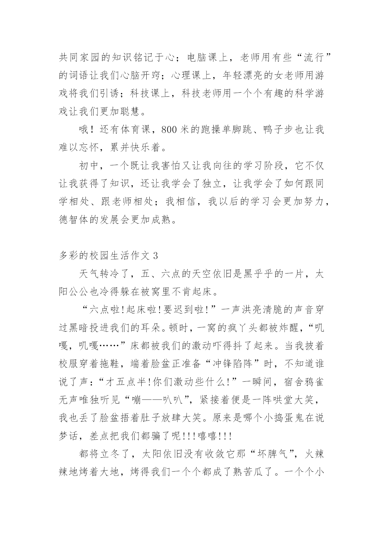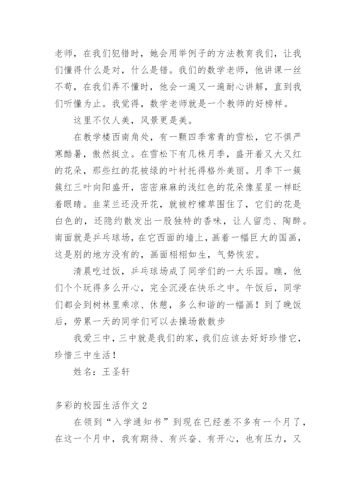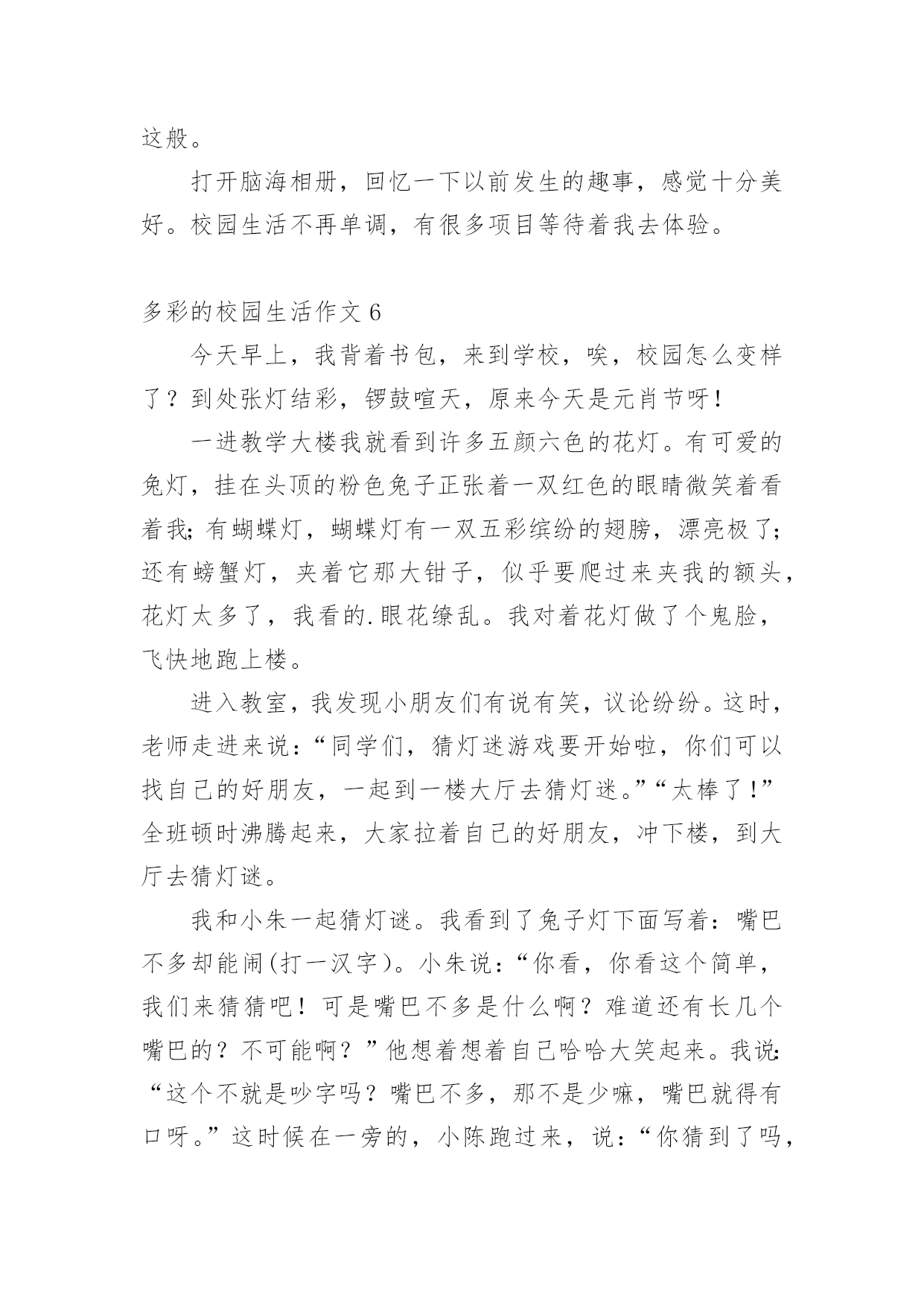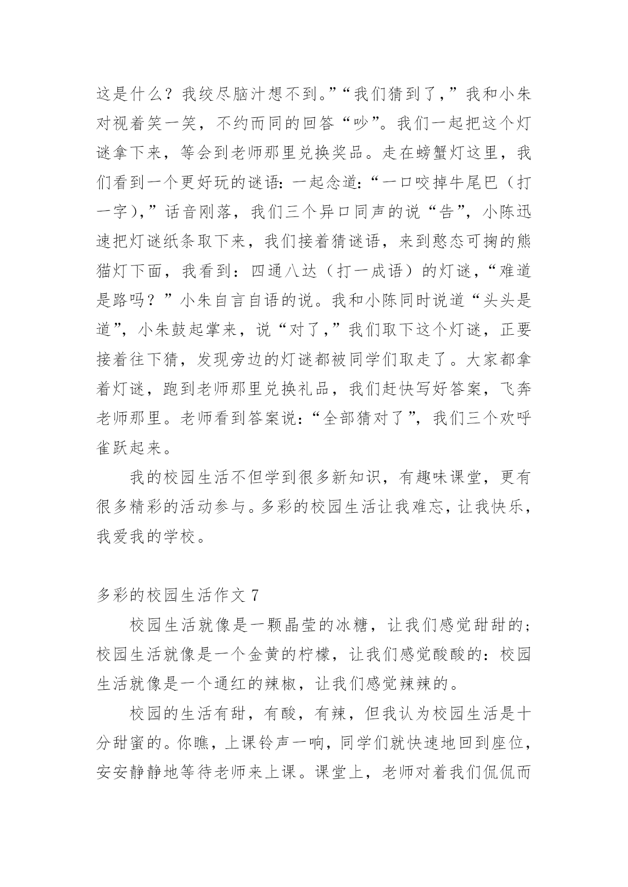 多彩的校园生活作文多彩的校园生活作文【热门】在平凡的学习、工作、生活中,许多人都有过写作文的经历,对作文都不陌生吧,根据写作命题的特点,作文可以分为命题作文和非命题作文。那么问题来了,到底应如何写一篇优秀的作文呢?下面是小编收集整理的多彩的校园生活作文,欢迎大家分享。多彩的校园生活作文1一提到我们的校园,我可有的介绍了。这儿,有可爱的同学,有和蔼的老师,有美丽的风景总之有太多的美好记忆。那次,我不慎跌倒,受了伤,我们班同学看见了,赶紧跑过来帮助我。虽然只是这小小的举动,但我仍被感动,悄然落泪。在学校,朋友们跟我一起哭一起笑,一起度过了多少时光,那份浓浓的友情值得我去好好珍惜。老师,多么伟大的两个字!老师用辛勤的汗水把知识传给了一代又一代的学生。在我的心中,这里的每一位老师都有着一颗认真负责的心。我喜欢我的班主任和语文老师,她们时而幽默风趣,时而认真严厉,时而教我们做人的道理。在我丧气时,班主任会找我谈谈心,她每次都用温柔亲切的.目光望着我,我从她的眼里读出了她对我的期望与信任每当看到班主任那深深的皱纹时,我发自内心的感叹道:您为我们付出的太多太多,唯有好好学习才能报答您。我们的语文老师,在我们犯错时,她会用举例子的方法教育我们,让我们懂得什么是对,什么是错。我们的数学老师,他讲课一丝不苟,在我们弄不懂时,他会一遍又一遍耐心讲解,直到我们听懂为止。我觉得,数学老师就是一个教师的好榜样。这里不仅人美,风景更是美。在教学楼西南角处,有一颗四季常青的雪松,它不惧严寒酷暑,傲然挺立。在雪松下有几株月季,盛开着又大又红的花朵,那些红的花被绿的叶衬托得格外美丽。月季下一簇簇红三叶向阳盛开,密密麻麻的浅红色的花朵像星星一样眨着眼睛。韭菜兰还没开花,就被柠檬草围住了,它们的花是白色的,还隐约散发出一股独特的香味,让人留恋、陶醉。南面就是乒乓球场,在它西面的墙上,画着一幅巨大的国画,这是别的地方没有的,画面栩栩如生,气势恢宏。清晨吃过饭,乒乓球场成了同学们的一大乐园。瞧,他们个个玩得多么开心,完全沉浸在快乐之中。午饭后,同学们都会到树林里乘凉、休憩,多么和谐的一幅画!到了晚饭后,劳累一天的同学们可以去操场散散步我爱三中,三中就是我们的家,我们应该去好好珍惜它,珍惜三中生活!姓名:王圣轩多彩的校园生活作文2在领到“入学通知书”到现在已经差不多有一个月了,在这一个月中,我有期待、有兴奋、有开心,也有压力,又有些许害怕。我在害怕什么呢?是在害怕“掉队”吗?我想也许是。步入初中后;果真,我的成绩如同坐滑梯一般从云层滑入泥中。每次周测发下来时,那鲜红的分数与醒目的“叉叉”都会让我失望。我不禁又添了丝丝迷茫,这成绩为何会如此“不堪入目”?我仿佛被一张网缠住,我努力挣脱。清晨,当我从睡梦中醒来,还没有来得急重温一下美梦,就急忙下床,开始了一天紧张的学习生活。朗朗的读书声还未绝于耳,数学老师就抱着教学资料来到了教室,正被计算题搞得头昏脑涨的时候,英语老师又熟练的英语说:“Good,children”。……一天的学习终于结束了进入梦乡,睡梦却还浮现出作业的影子!但是,初中的生活当真有趣呀!语文老师总用他那时不时有趣的“跑题”的课堂都教学风格带领我们步入语言圣地。数学老师用他那平静的没有一丝波澜的语调将我们带入数学黑洞。英语老师用她那精美华丽的课件与她那口吐流利英语的双唇,让我们进入属于英语的世界。生物课上,一台台显微镜下一个个神奇的细胞,让我领略到生物的奇妙;历史课上,悠久的.历史让我犹如回到了远古的时代,仿佛在与古代人一起生活,过着日出而作、日落而息的生活;政治课上,一个个道理宛如音符一样刻入我的脑中,不曾忘怀。地理课上,老师用他那根长长的教棒,让我将有关我们共同家园的知识铭记于心;电脑课上,老师用有些“流行”的词语让我们心脑开窍;心理课上,年轻漂亮的女老师用游戏将我们引诱;科技课上,科技老师用一个个有趣的科学游戏让我们更加聪慧。哦!还有体育课,800米的跑操单脚跳、鸭子步也让我难以忘怀,累并快乐着。初中,一个既让我害怕又让我向往的学习阶段,它不仅让我获得了知识,还让我学会了独立,让我学会了如何跟同学相处、跟老师相处;我相信,我以后的学习会更加努力,德智体的发展会更加成熟。多彩的校园生活作文3天气转冷了,五、六点的天空依旧是黑乎乎的一片,太阳公公也冷得躲在被窝里不肯起床。“六点啦!起床啦!要迟到啦!”一声洪亮清脆的声音穿过黑暗投进我们的耳朵。顿时,一窝的疯丫头都被炸醒,“叽嘎,叽嘎……”床都被我们的激动吓得抖了起来。当我披着校服穿着拖鞋,端着脸盆正准备“冲锋陷阵”时,不知道谁说了声:“才五点半!你们激动些什么!”一瞬间,宿舍鸦雀无声唯独听见“嘣——叭叭”,紧接着便是一阵哄堂大笑,我也丢了脸盆捂着肚子放肆大笑。原来是哪个小捣蛋鬼在说梦话,差点把我们都骗了呢!!