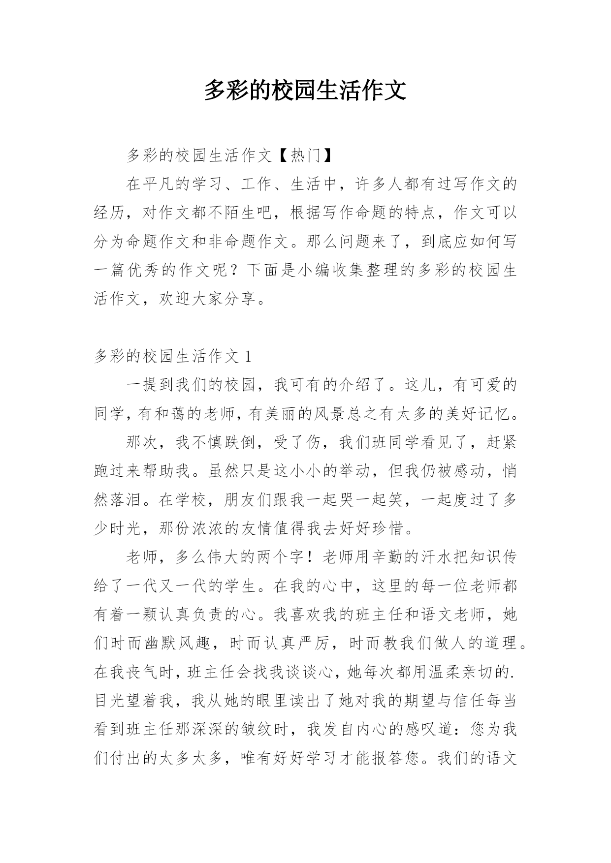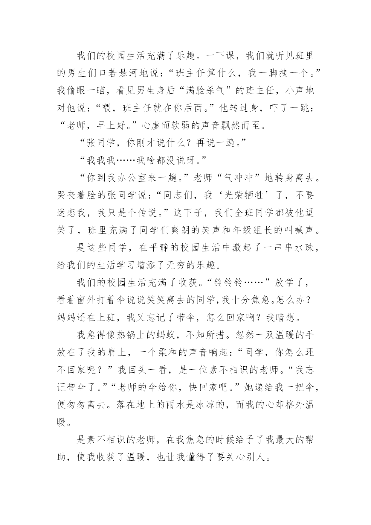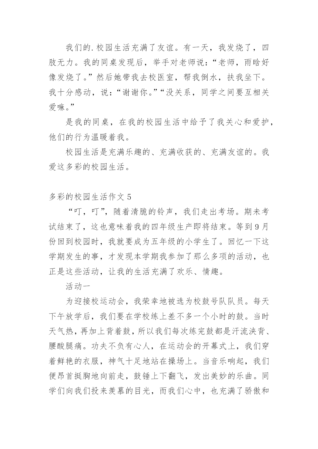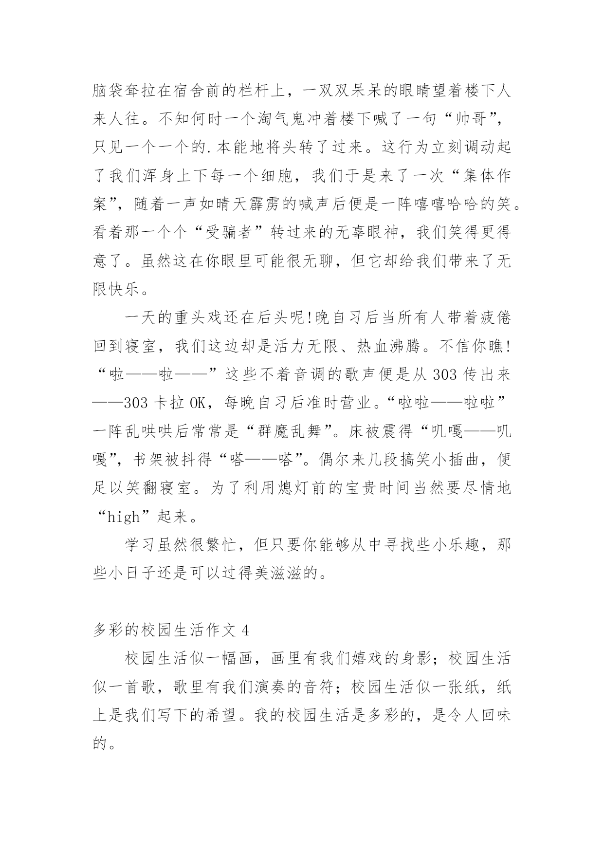 多彩的校园生活作文多彩的校园生活作文【热门】在平凡的学习、工作、生活中,许多人都有过写作文的经历,对作文都不陌生吧,根据写作命题的特点,作文可以分为命题作文和非命题作文。那么问题来了,到底应如何写一篇优秀的作文呢?下面是小编收集整理的多彩的校园生活作文,欢迎大家分享。多彩的校园生活作文1一提到我们的校园,我可有的介绍了。这儿,有可爱的同学,有和蔼的老师,有美丽的风景总之有太多的美好记忆。那次,我不慎跌倒,受了伤,我们班同学看见了,赶紧跑过来帮助我。虽然只是这小小的举动,但我仍被感动,悄然落泪。在学校,朋友们跟我一起哭一起笑,一起度过了多少时光,那份浓浓的友情值得我去好好珍惜。老师,多么伟大的两个字!老师用辛勤的汗水把知识传给了一代又一代的学生。在我的心中,这里的每一位老师都有着一颗认真负责的心。我喜欢我的班主任和语文老师,她们时而幽默风趣,时而认真严厉,时而教我们做人的道理。在我丧气时,班主任会找我谈谈心,她每次都用温柔亲切的.目光望着我,我从她的眼里读出了她对我的期望与信任每当看到班主任那深深的皱纹时,我发自内心的感叹道:您为我们付出的太多太多,唯有好好学习才能报答您。我们的语文老师,在我们犯错时,她会用举例子的方法教育我们,让我们懂得什么是对,什么是错。我们的数学老师,他讲课一丝不苟,在我们弄不懂时,他会一遍又一遍耐心讲解,直到我们听懂为止。我觉得,数学老师就是一个教师的好榜样。这里不仅人美,风景更是美。在教学楼西南角处,有一颗四季常青的雪松,它不惧严寒酷暑,傲然挺立。在雪松下有几株月季,盛开着又大又红的花朵,那些红的花被绿的叶衬托得格外美丽。月季下一簇簇红三叶向阳盛开,密密麻麻的浅红色的花朵像星星一样眨着眼睛。韭菜兰还没开花,就被柠檬草围住了,它们的花是白色的,还隐约散发出一股独特的香味,让人留恋、陶醉。南面就是乒乓球场,在它西面的墙上,画着一幅巨大的国画,这是别的地方没有的,画面栩栩如生,气势恢宏。清晨吃过饭,乒乓球场成了同学们的一大乐园。瞧,他们个个玩得多么开心,完全沉浸在快乐之中。午饭后,同学们都会到树林里乘凉、休憩,多么和谐的一幅画!到了晚饭后,劳累一天的同学们可以去操场散散步我爱三中,三中就是我们的家,我们应该去好好珍惜它,珍惜三中生活!姓名:王圣轩多彩的校园生活作文2在领到“入学通知书”到现在已经差不多有一个月了,在这一个月中,我有期待、有兴奋、有开心,也有压力,又有些许害怕。我在害怕什么呢?是在害怕“掉队”吗?我想也许是。步入初中后;果真,我的成绩如同坐滑梯一般从云层滑入泥中。每次周测发下来时,那鲜红的分数与醒目的“叉叉”都会让我失望。我不禁又添了丝丝迷茫,这成绩为何会如此“不堪入目”?我仿佛被一张网缠住,我努力挣脱。清晨,当我从睡梦中醒来,还没有来得急重温一下美梦,就急忙下床,开始了一天紧张的学习生活。朗朗的读书声还未绝于耳,数学老师就抱着教学资料来到了教室,正被计算题搞得头昏脑涨的时候,英语老师又熟练的英语说:“Good,children”。……一天的学习终于结束了进入梦乡,睡梦却还浮现出作业的影子!但是,初中的生活当真有趣呀!语文老师总用他那时不时有趣的“跑题”的课堂都教学风格带领我们步入语言圣地。数学老师用他那平静的没有一丝波澜的语调将我们带入数学黑洞。英语老师用她那精美华丽的课件与她那口吐流利英语的双唇,让我们进入属于英语的世界。生物课上,一台台显微镜下一个个神奇的细胞,让我领略到生物的奇妙;历史课上,悠久的.历史让我犹如回到了远古的时代,仿佛在与古代人一起生活,过着日出而作、日落而息的生活;政治课上,一个个道理宛如音符一样刻入我的脑中,不曾忘怀。地理课上,老师用他那根长长的教棒,让我将有关我们共同家园的知识铭记于心;电脑课上,老师用有些“流行”的词语让我们心脑开窍;心理课上,年轻漂亮的女老师用游戏将我们引诱;科技课上,科技老师用一个个有趣的科学游戏让我们更加聪慧。哦!还有体育课,800米的跑操单脚跳、鸭子步也让我难以忘怀,累并快乐着。初中,一个既让我害怕又让我向往的学习阶段,它不仅让我获得了知识,还让我学会了独立,让我学会了如何跟同学相处、跟老师相处;我相信,我以后的学习会更加努力,德智体的发展会更加成熟。多彩的校园生活作文3天气转冷了,五、六点的天空依旧是黑乎乎的一片,太阳公公也冷得躲在被窝里不肯起床。“六点啦!起床啦!要迟到啦!”一声洪亮清脆的声音穿过黑暗投进我们的耳朵。顿时,一窝的疯丫头都被炸醒,“叽嘎,叽嘎……”床都被我们的激动吓得抖了起来。当我披着校服穿着拖鞋,端着脸盆正准备“冲锋陷阵”时,不知道谁说了声:“才五点半!你们激动些什么!”一瞬间,宿舍鸦雀无声唯独听见“嘣——叭叭”,紧接着便是一阵哄堂大笑,我也丢了脸盆捂着肚子放肆大笑。原来是哪个小捣蛋鬼在说梦话,差点把我们都骗了呢!!