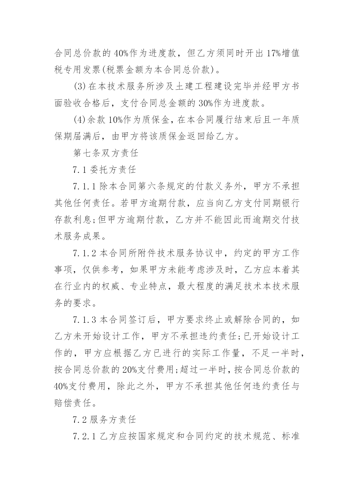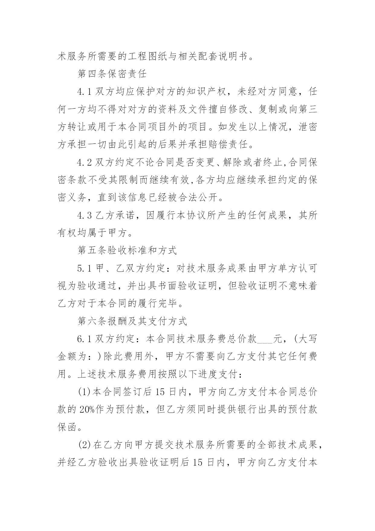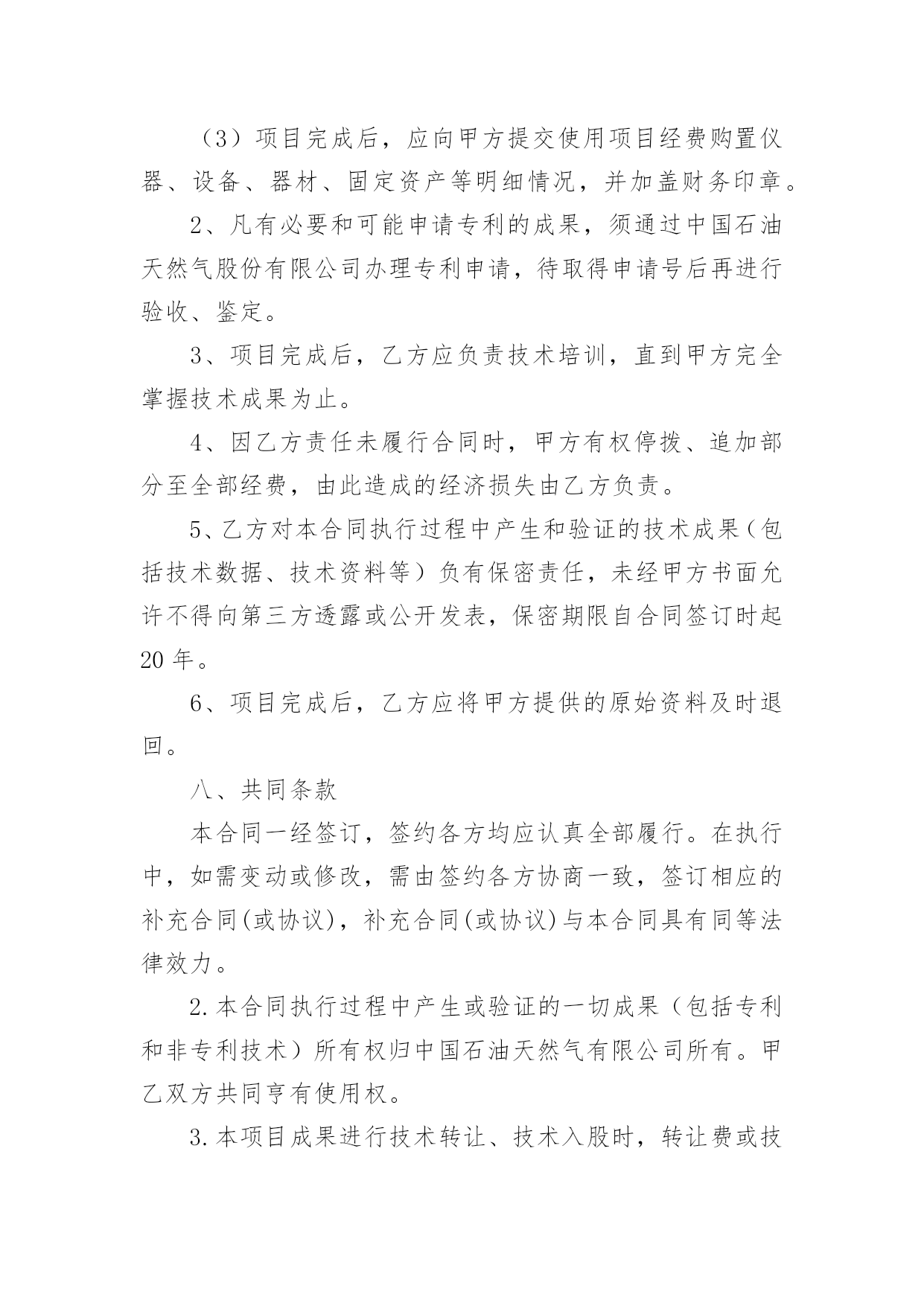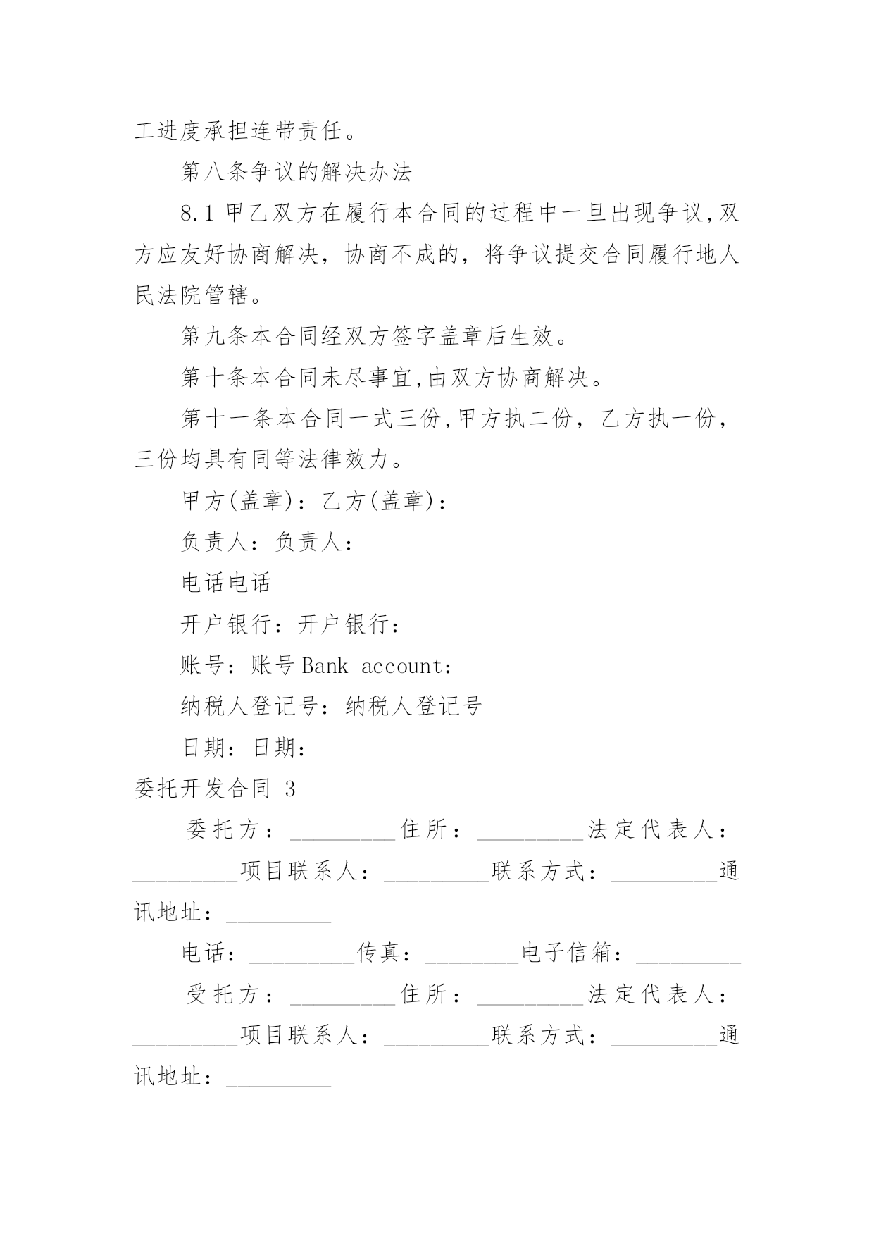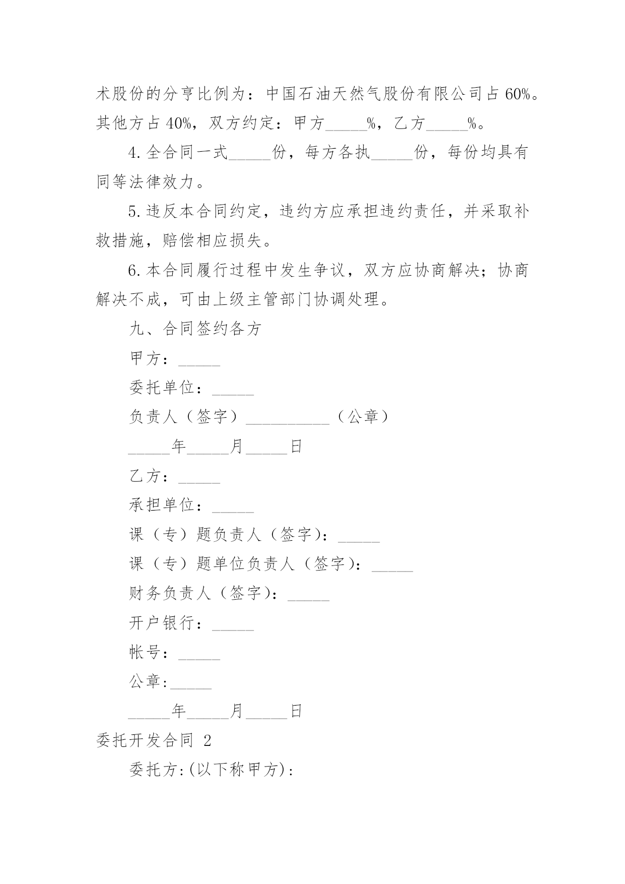 委托开发合同委托开发合同通用15篇随着法律知识的普及,合同的类型越来越多,签订合同可以使我们的合法权益得到法律的保障。那么合同要怎么拟定?想必这让大家都很苦恼吧,以下是小编为大家收集的委托开发合同,欢迎阅读与收藏。委托开发合同1项目名称:__________课(专)题名称:__________委托单位:__________承担单位:__________课(专)题负责人:__________起止日期:_____年_____月_____日合同编制说明1.凡列入股份公司科技计划的项目需要由项目牵头单位委托其他单位研究开发的课(专)题,应由项目牵头单位(委托单位,即甲方)与课(专)题承担单位(受委托单位,即乙方)签订委托开发合同。2.合同中应认真填写项目经费明细表,并作为项目经费管理的依据。3.合同一式10份,上报主持部门2份备案。一、委托研究和开发内容二、主要技术经济考核指标三、提交的成果及验收方式四、进度安排及阶段考核目标(按季度填写)序号专题名称研究内容考核目标起止时间负责人五、项目经费安排(单位:万元)序号受款单位合计______年总计:_____年六、经费明细表单位:______万元序号项目分类核算费用(工作量)(核算标准)小计1直接材料费(品名)2化验分析费(化验分析项目名称)3燃料动力消耗费4设备购置费(设备名称及型号)5小型样机试制费(样机名称)6现场试验费7其他直接费外协费调研费培训费会议评审费其他(列名细)8不可预见费9设备、房屋占用费(设备名称)(房屋用途)合计:_____10直接人员费用(按全工时人数)总计:_____七、责任条款(一)甲方责任1、甲方应按合同约定分批拨付经费,协调检查研究进展,组织验收项目成果。2、甲方根据乙方研究需要,应及时提供有关原始技术资料。3、随项目进展情况,应及时安排现场实验等配合工作,保证项目研究计划的进行。4、因甲方责任未履行合同时,应根据责任与损失大小,确定经济责任及善后处理办法,由双方协调并签订协议书确定。5、因不可抗拒因素造成合同不能完成时,甲方应视情况调整或终止合同,不予追究乙方责任。(二)乙方责任1、乙方应全面履行合同内容,接受甲方对乙方研究工作的检查和协调,并按时向甲方提供以下书面报告:(1)按季度向甲方提供本合同执行情况的书面报告;每年11月15日之前向甲方提交本年度技术工作研究小结和经费使用报告(一式三份)。逾期不报,甲方有权暂停拨款。(2)项目完成后,应向甲方提交合同执行情况总结报告,及时申请验收,并按合同要求无保留地提交完整的技术资料及合同规定的其他形式的成果。(3)项目完成后,应向甲方提交使用项目经费购置仪器、设备、器材、固定资产等明细情况,并加盖财务印章。2、凡有必要和可能申请专利的成果,须通过中国石油天然气股份有限公司办理专利申请,待取得申请号后再进行验收、鉴定。3、项目完成后,乙方应负责技术培训,直到甲方完全掌握技术成果为止。4、因乙方责任未履行合同时,甲方有权停拨、追加部分至全部经费,由此造成的经济损失由乙方负责。5、乙方对本合同执行过程中产生和验证的技术成果(包括技术数据、技术资料等)负有保密责任,未经甲方书面允许不得向第三方透露或公开发表,保密期限自合同签订时起20年。6、项目完成后,乙方应将甲方提供的原始资料及时退回。八、共同条款本合同一经签订,签约各方均应认真全部履行。在执行中,如需变动或修改,需由签约各方协商一致,签订相应的补充合同(或协议),补充合同(或协议)与本合同具有同等法律效力。2.本合同执行过程中产生或验证的一切成果(包括专利和非专利技术)所有权归中国石油天然气有限公司所有。甲乙双方共同亨有使用权。3.本项目成果进行技术转让、技术入股时,转让费或技术股份的分亨比例为:中国石油天然气股份有限公司占60%。其他方占40%,双方约定:甲方_____%,乙方_____%。4.全合同一式_____份,每方各执_____份,每份均具有同等法律效力。5.违反本合同约定,违约方应承担违约责任,并采取补救措施,赔偿相应损失。6.本合同履行过程中发生争议,双方应协商解决;协商解决不成,可由上级主管部门协调处理。九、合同签约各方甲方:_____委托单位:_____负责人(签字)__________(公章)_____年_____月_____日乙方:_____承担单位:_____课(专)题负责人(签字):_____课(专)题单位负责人(签字):_____财务负责人(签字):_____开户银行:_____帐号:_____公章:__________年_____月_____日委托开发合同2委托方:(以下称甲方):法定代表人:地址:服务方:(以下称乙方)法定代表人:地址:鉴于甲方需要就由乙方提供技术、设计等服务;鉴于乙方愿意接受甲方的委托并提供技术服务;根据《
