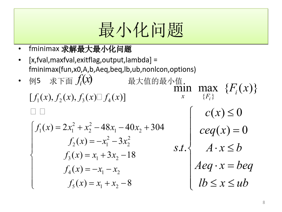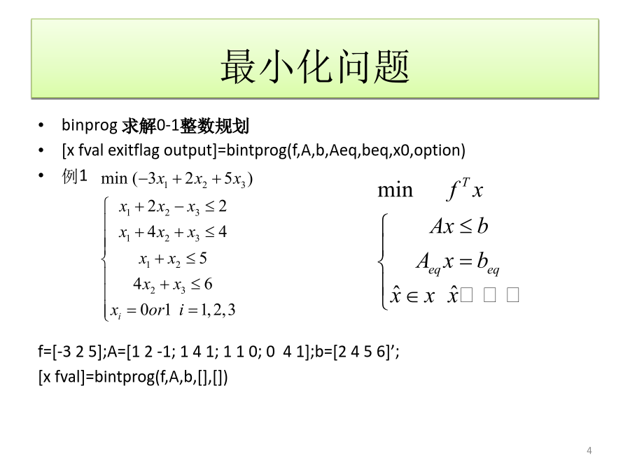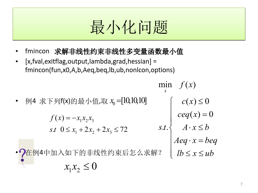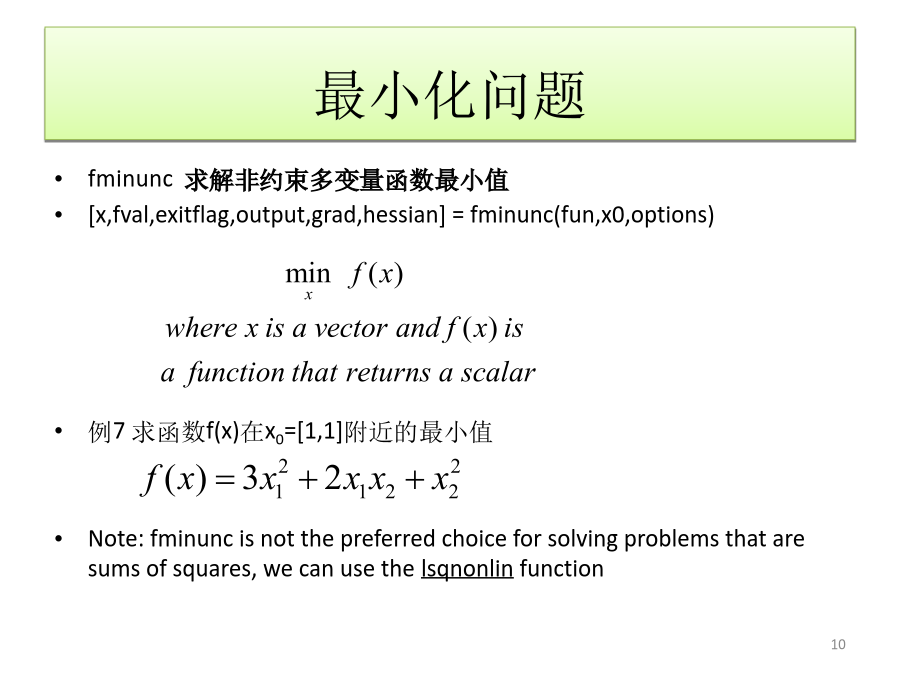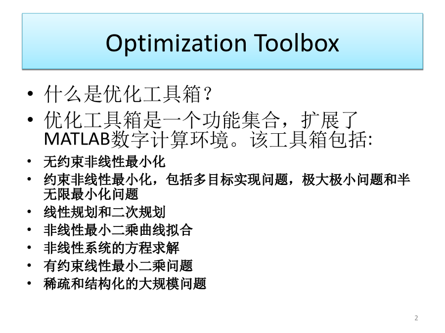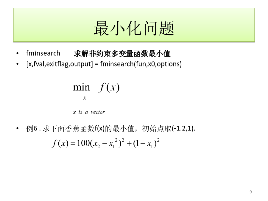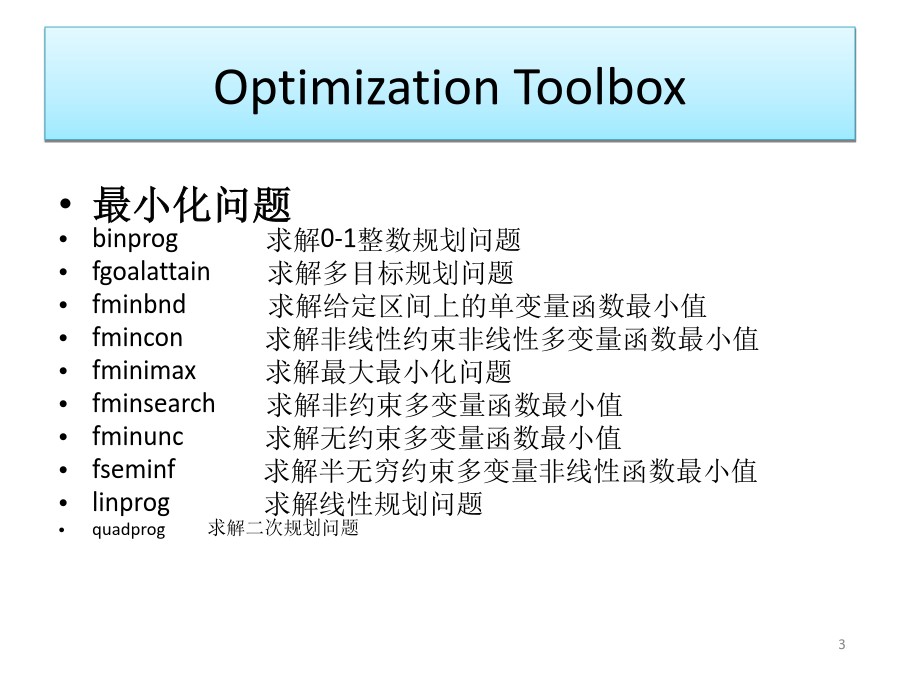 ToolboxUsageOptimizationToolboxOptimizationToolbox最小化问题最小化问题最小化问题?最小化问题最小化问题最小化问题最小化问题最小化问题最小化问题OptimizationToolbox方程求解方程求解OptimizationToolbox最小二乘(曲线拟合)最小二乘(曲线拟合)最小二乘(曲线拟合)最小二乘(曲线拟合)最小二乘(曲线拟合)最小二乘(曲线拟合)最小二乘(曲线拟合)OptimizationToolbox辅助函数辅助函数GARCHToolbox金融时间序列的边缘分布模型随机时间序列模型自回归模型及其性质自回归模型的定义(一阶)自回归序列平稳的条件AR(1)平稳的条件AR(1)平稳的条件AR(p)的自相关函数AR(p)的自相关函数例:求AR(1)的自相关函数例:AR(2)的自相关函数AR(p)自相关函数的拖尾性偏自相关函数AR(p)的滞后算子形式移动平均模型及其性质移动平均模型的定义MA(1)的自相关函数MA(q)的自相关函数滞后算子形式自回归移动平均模型ARMA自回归移动平均模型ARMA(p,q)的性质ARMA(1,1)的自相关函数ARMA(1,1)的自相关函数滞后算子形式性质总结波动模型ARCH模型ARCH模型ARCH模型GARCH模型GARCH模型GARCH模型GARCH模型ARCH表示GARCH模型的ARMA表示模型识别模型的估计和预测1.模型识别与参数估计2.模型的预测与拟合GARCHToolboxGARCHToolboxGARCHToolboxGARCHToolboxGARCH建模函数GARCH建模函数GARCH建模函数GARCH新息序列推断GARCHToolbox统计和检验统计和检验统计和检验统计和检验统计和检验统计和检验统计和检验GARCHToolboxGARCH参数设定GARCH参数设定GARCHToolbox辅助函数辅助函数辅助函数辅助函数辅助函数辅助函数辅助函数辅助函数