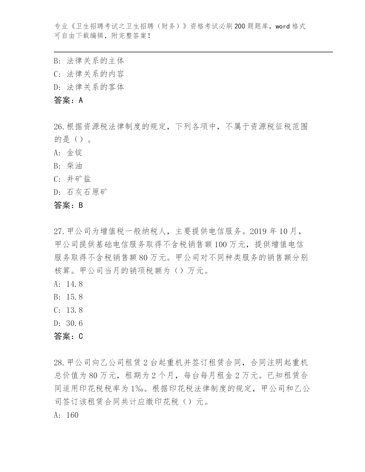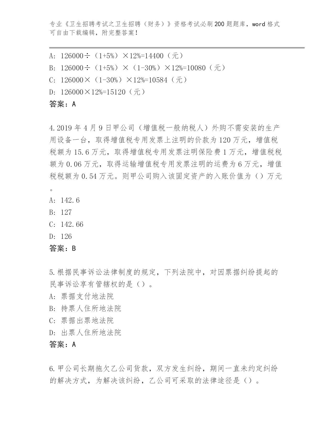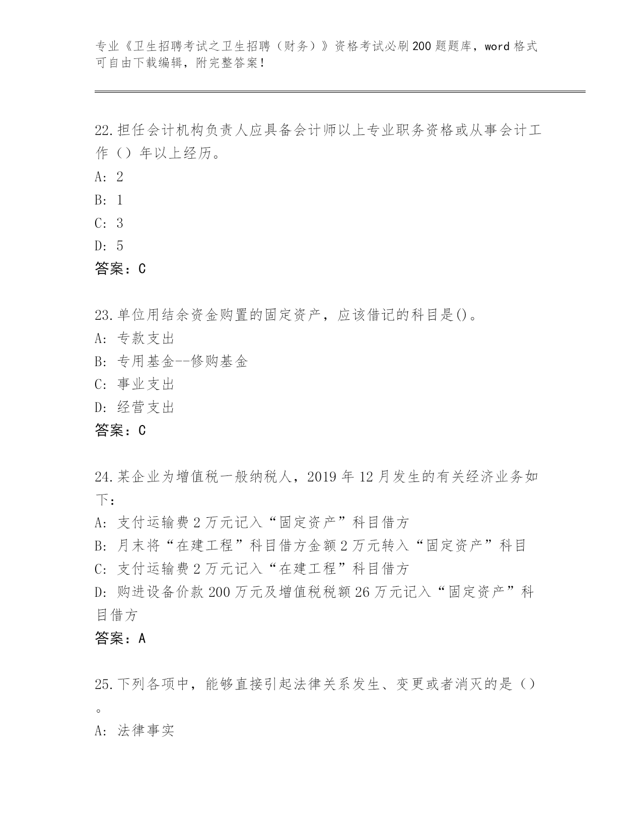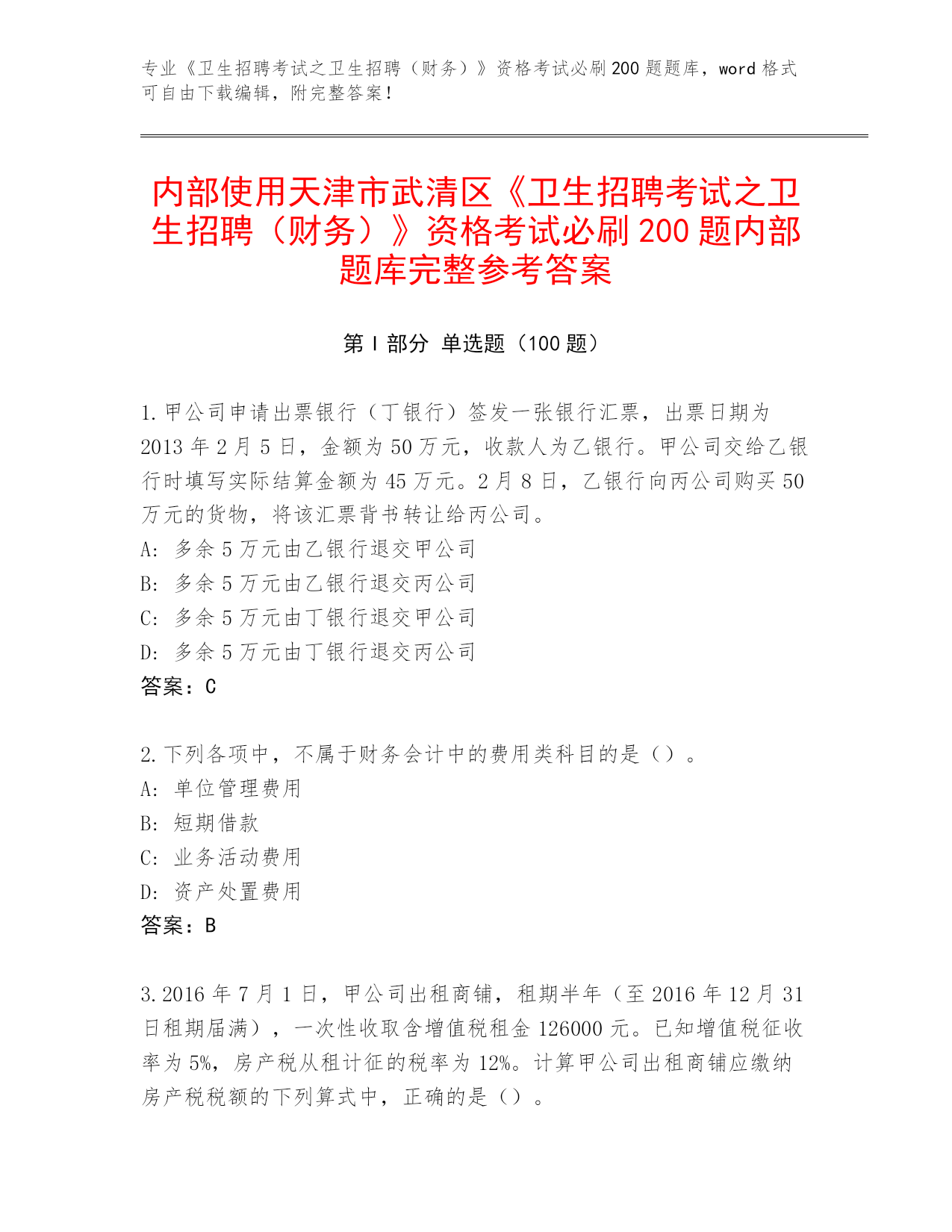 内部使用天津市武清区《卫生招聘考试之卫生招聘(财务)》资格考试必刷200题内部题库完整参考答案