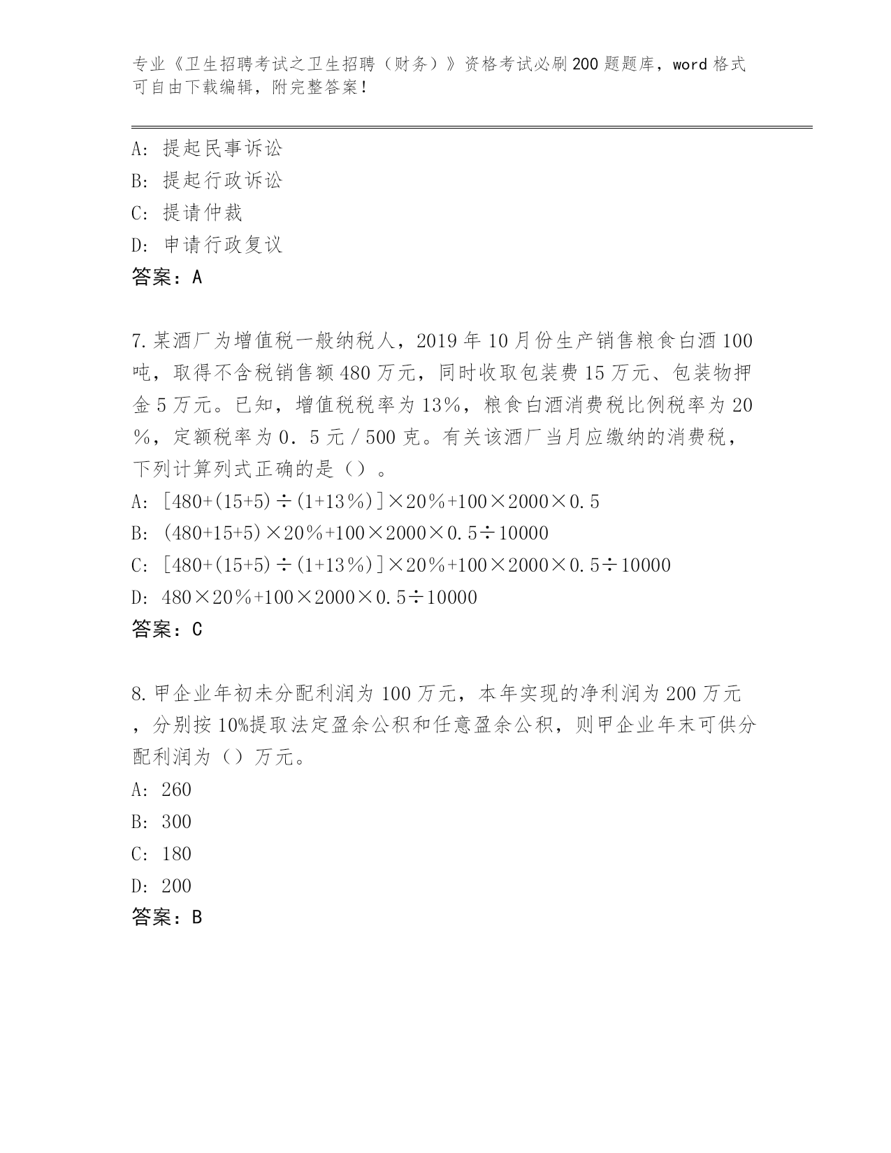内部使用安徽省《卫生招聘考试之卫生招聘(财务)》考试必刷200题内部题库【】