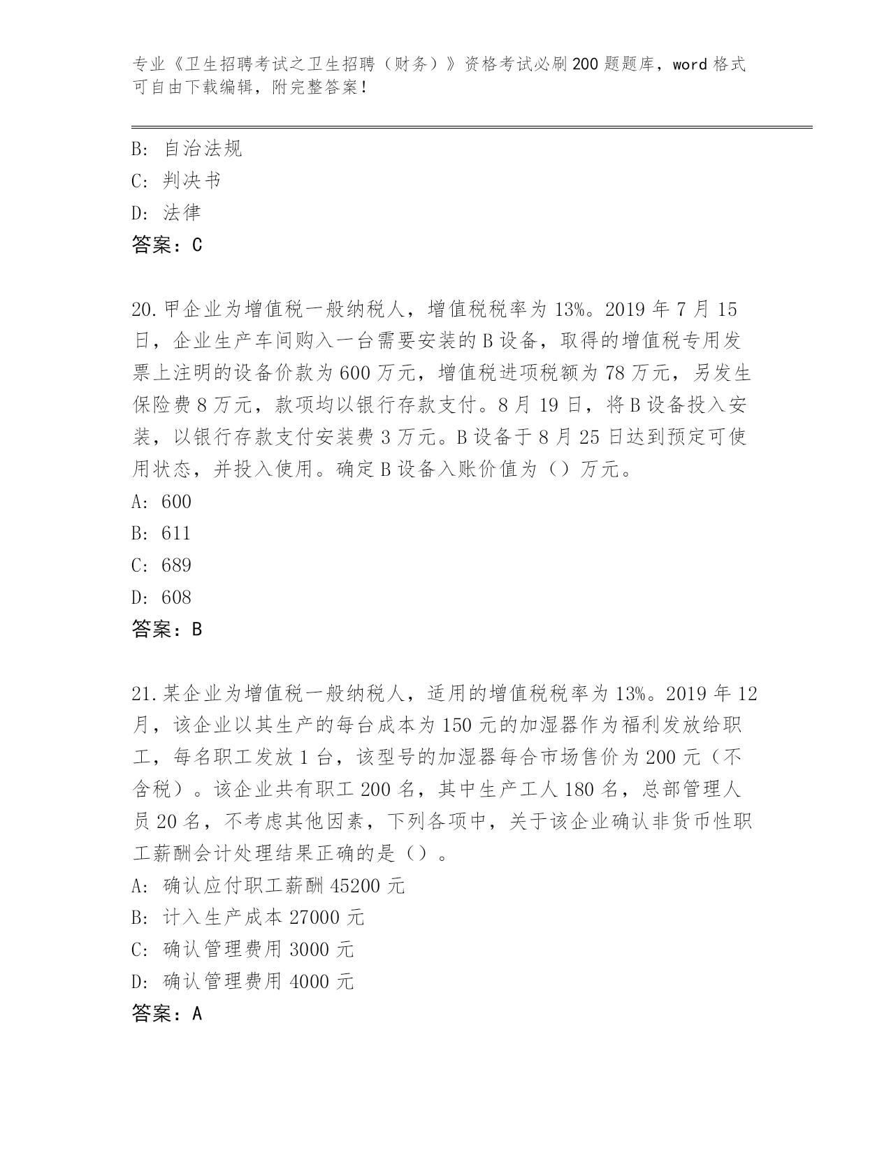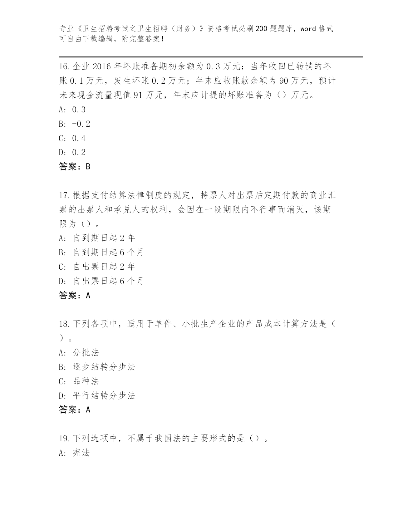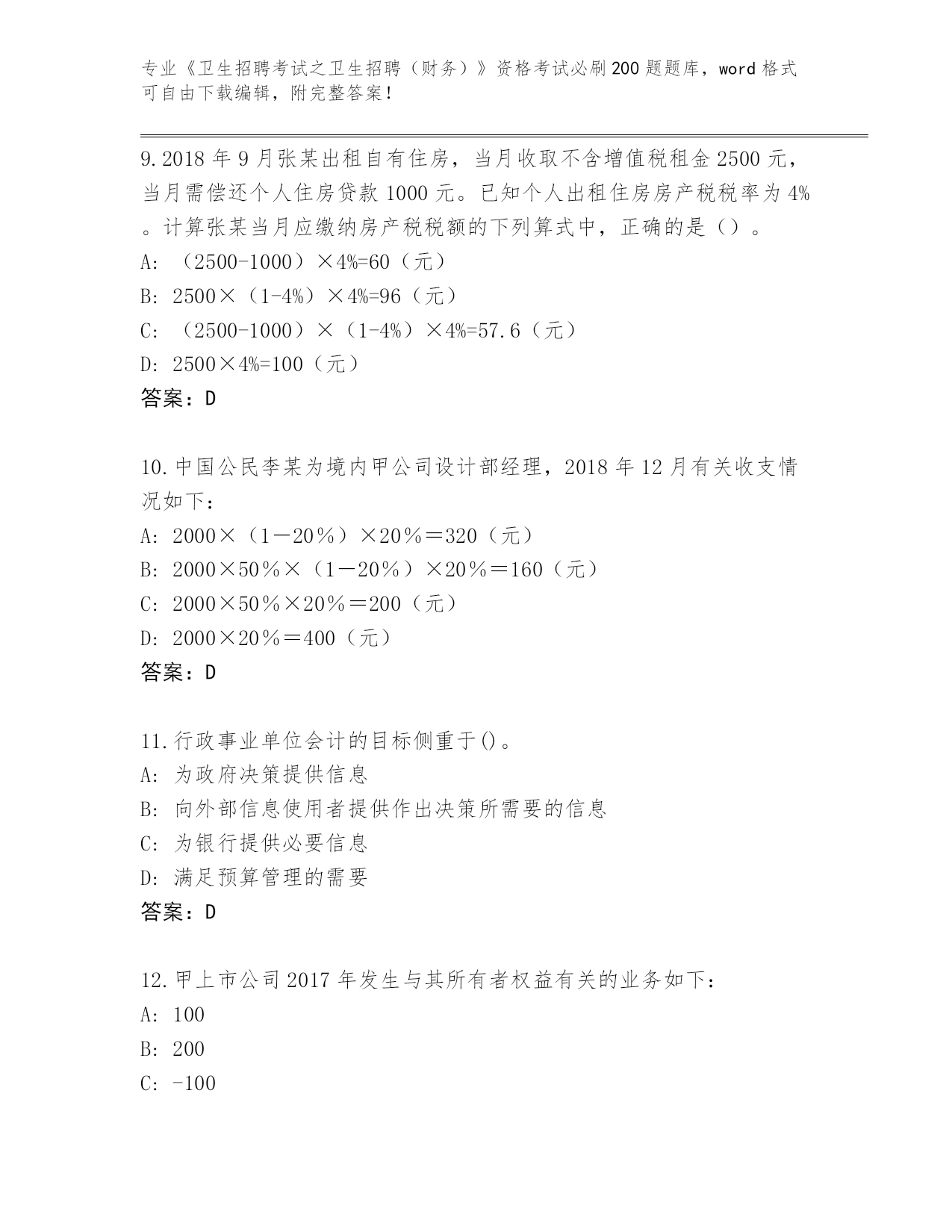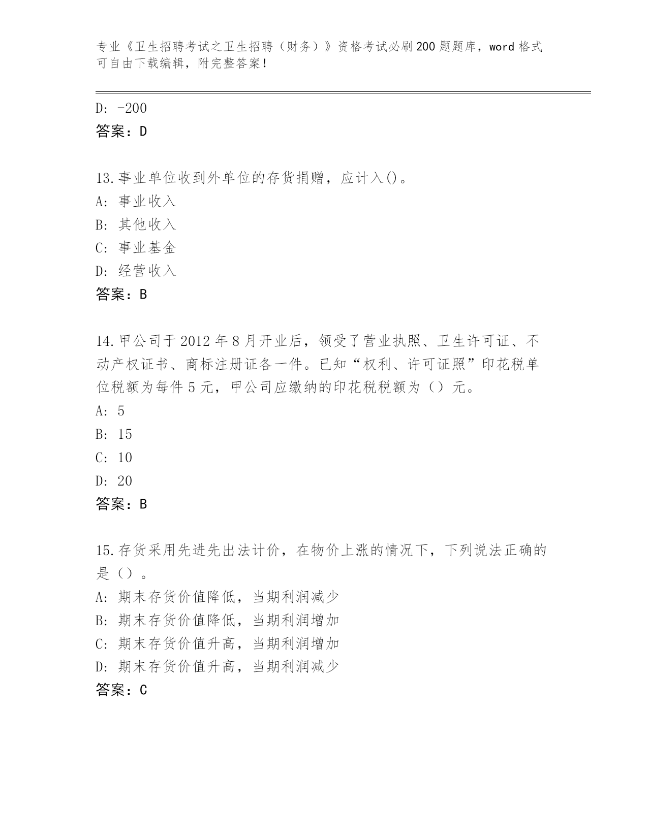 内部使用天津市宝坻区《卫生招聘考试之卫生招聘(财务)》资格考试必刷200题题库及参考答案(预热题)