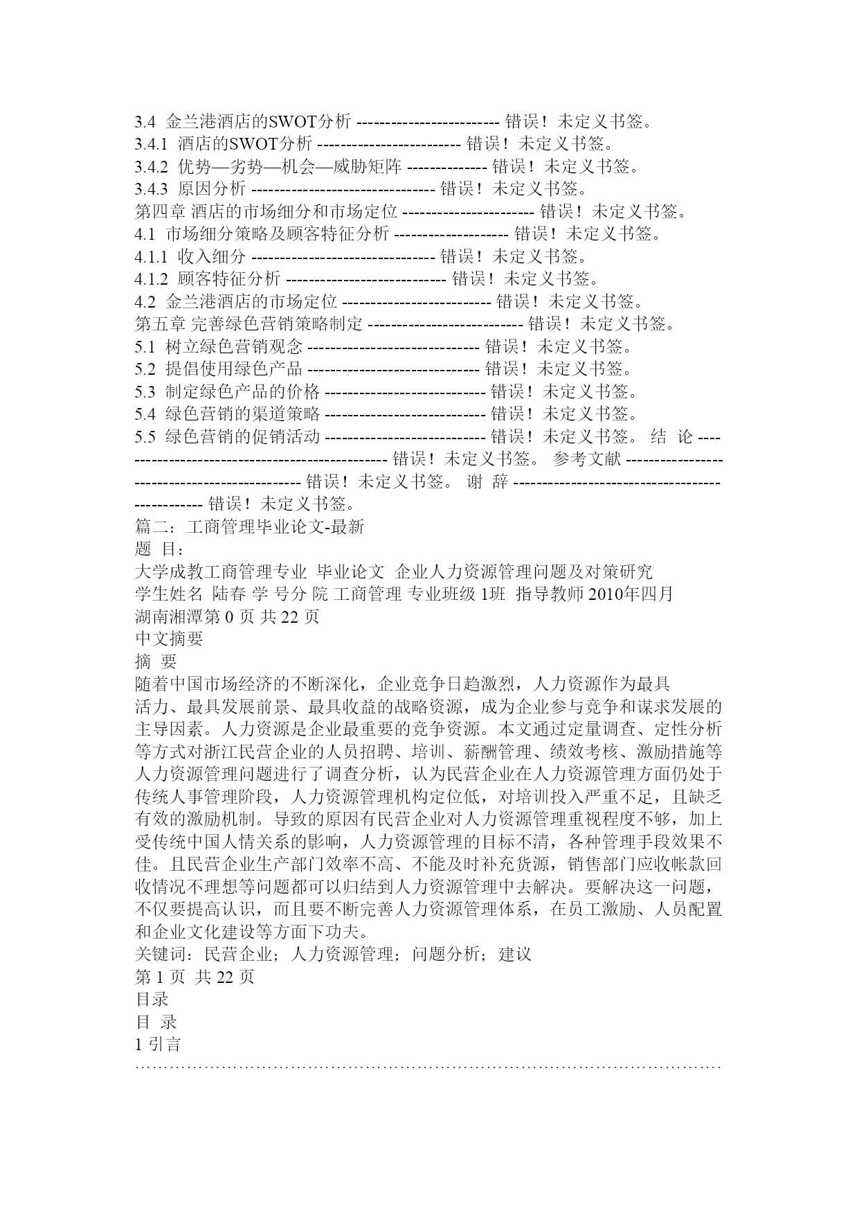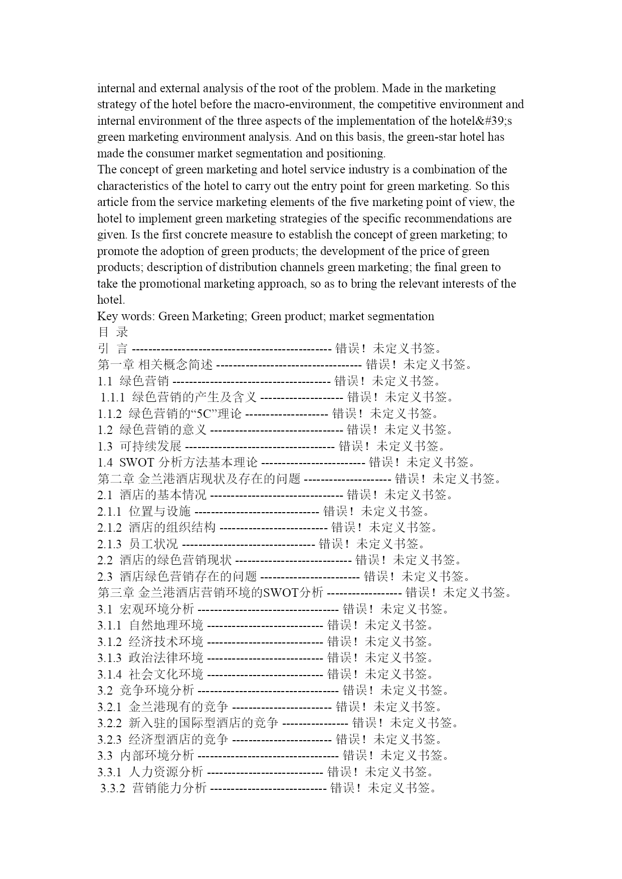 工商管理毕业论文网篇一:工商管理毕业论文学校代码10126学号分类号密级本科毕业论文学院、系经管学院专业名称工商管理年级学生姓名指导教师年月日摘要在感受经济发展带来生活条件的同时,人们也在感受着前所未有的环境恶化、资源短缺、生态危机等等所带来的威胁。一种寻求人与自然和谐相处,资源合理化使用和生态平衡的消费观念逐渐成为潮流,即:“绿色消费”。在这种“绿色”消费观的推动下,一种新的营销思想——绿色营销,被纳入到了企业的营销系统中来,并且已经呈现为企业营销发展的一个趋势。本文分析的重点在于通过对绿色营销理论的分析与对酒店服务行业环境的分析,找到酒店实施绿色营销的策略。文章选取金兰港酒店为研究对象,发现金兰港酒店的绿色营销策略存在形式主义和脱离酒店服务业经营特点等问题,并进一步从内因与外因两个方面分析了问题的根源所在。在对酒店做出营销策略前,对酒店的宏观环境、竞争环境以及内部环境三个方面的绿色营销实施环境做出分析。并在此基础上,对酒店的绿色消费市场做出了细分及定位。将绿色营销的理念与酒店服务业的特性相结合是酒店开展绿色营销的切入点。因此本文从服务营销的5个营销要素的角度,对酒店实施绿色营销的具体策略给出了建议。具体的措施就是首先要树立绿色营销观念;提倡采用绿色产品;制定绿色产品的绿色价格;说明绿色营销的销售管道;最后采取绿色营销的促销方式,从而为酒店带来相关利益的提升。关键词:绿色营销;绿色产品;市场细分AbstractEconomicdevelopmentinthefeelingsbroughtaboutbytheimprovementinlivingconditions,peoplealsoexperienceanunprecedentedlevelofenvironmentaldegradation,shortageofresources,ecologicalcrisisbroughtaboutbythreats,etc..Asearchforharmonybetweenmanandnature,resourcesandecologicalbalanceoftherationalizationoftheuseoftheconcepthasgraduallybecomethetrendofconsumption.Inthis"green"consumerdrivenconcept,anewmarketingidea-greenmarketing,hasbeenintegratedintotheenterprisetothemarketingsystem,andhasemergedasatrendinthedevelopmentofcorporatemarketing.Thisarticlefocusesontheanalysisofmarketingtheorythroughtheanalysisofthegreenonthehotelserviceindustryandenvironmentalanalysis,tofindthehoteltoimplementgreenmarketingstrategies.SelectarticlesofJinlangangHotelstudyfoundthatgreenmarketingstrategyhotelformalismandfromthehotelthereistheoperatingcharacteristicoftheservicesectorandfurtherfromthetwoaspectsofinternalandexternalanalysisoftherootoftheproblem.Madeinthemarketingstrategyofthehotelbeforethemacro-environment,thecompetitiveenvironmentandinternalenvironmentofthethreeaspectsoftheimplementationofthehotel'sgreenmarketingenvironmentanalysis.Andonthisbasis,thegreen-starhotelhasmadetheconsumermarketsegmentationandpositioning.Theconceptofgreenmarketingandhotelserviceindustryisacombinationofthecharacteristicsofthehoteltocarryouttheentrypointforgreenmarketing.Soth