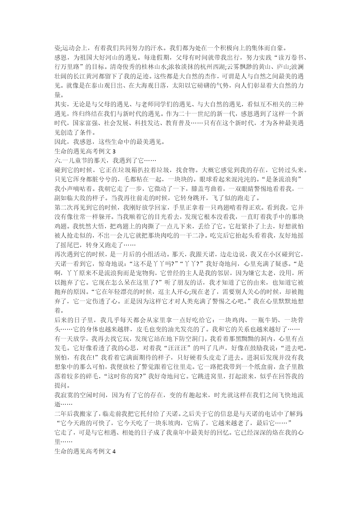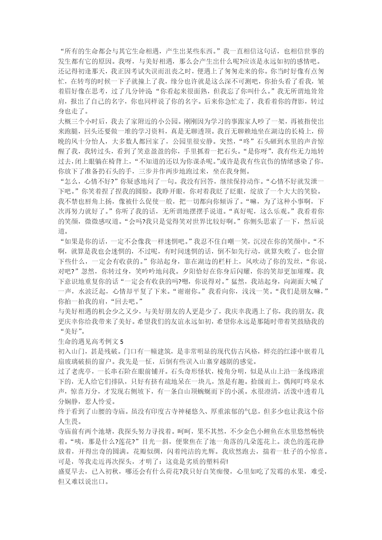 生命的遇见高考作文生命是一场大的遇见。人生短短几十载,却有着太多太多的遇见。那日桂花飘香,细雨朦胧,一个民歌手,在洲渚的丰草间,遇见关关和鸣的睢鸠——于是,有了诗。一起来看看关于生命的遇见高考作文,欢迎大家查阅学习!生命的遇见高考例文1皇帝遇见磁石,蒙恬初识羊毛,立刻有了对物的惊叹和对物的深情。牛郎遇见织女,留下的是一场恻恻的爱情,以及年年夏夜在星空再版又再版的永不褪色的神话。夫子遇见泰山,李白遇见黄河,陈子昂遇见幽州台,米开朗基罗在混沌未凿的大理石中预先遇见了大卫……生命的情境从此就不一样了。我渴望生命里的种.种遇合,人生的栈道上,我是赶路人,却总是忍不住贪看山色,生命里既然有那么多值得伫足的事,相形之下会不会误了宿头也就不是那么重要的事了。昨晚时分,做完作业的我依偎在妈妈的身边,把头埋在妈妈的怀里,感受着妈妈由内至外的温暖,眼前渐渐出现了一幅幅画面。那一幅幅熟悉而又遥远的画面像像电影一样在眼前闪过:一个人,在我出生的时候,承受着巨大的痛苦;一个人,在我开心时陪着我笑,在我痛苦时陪着我一起流泪。儿时,她是我心中的保护神,在我被欺侮时,她可以保护我;当我恐惧时,她可以安慰我;当我调皮时,她也会耐心地教导我。到了我少年的时候,她是一个大姐姐,和我一起玩耍,嬉戏,爱吃零时,爱看电视,总是可以和我在一起嘻嘻哈哈的打闹做一团。在现在的我看来,她的容颜面了,但是,没有改变的,是她那颗永远不会苍老的心。她,还是那样的纯真,那样的充满乐趣,只是,现在又多了一份慈祥,一份责任。----这个人,就是我的母亲。夜色拉开帷幕,丝丝墨一般的寒气浸入心头,冷冷清清,醋酸涩涩,如双眼般忽明忽亮的星光,聚集在环着皎洁光辉的月亮妈妈的身边。夜,有些微寒!感受着母亲的体温,享受着她双手在我身上的轻轻抚触。夜,是那么的寂静!静的让我可以听见温暖的细语,轻轻柔柔,舒服安恬似乎可以触摸,又似乎难以名状。我抬起头,看着妈妈那荡漾着笑意的面庞,心里泛起阵阵涟漪,轻轻而言:“妈妈,感谢生命,让我遇见了你……”生命的遇见高考例文2自然界最美的遇见,是沙漠中的河流,是小鸟与树冠上的巢,是鱼儿和河水,是小草和春雨。而人世间最美的遇见,则是遇见那些心有灵犀的人和事。这些生命中的遇见让我感恩。与父母的遇见,可谓是因缘而起的命中注定而日夜相伴。当我生病的时候,父母悉心照顾我;当我遇到困难了,父母帮我解决;当我不开心了,父母哄我开心;当我考试没考好的时候,父母给予我的不是训斥而是鼓励;当我遇到不会的题目时,父母不是直接给我答案而是引导我思考。父母给了我民主的教育,给我创造了良好的学习条件,这是我一生中最美遇见的开始。不管在什么时候,父母都无私的为我付出,给予我无尽的爱。我和父母之间不只是血缘关系的捆绑,更像命运中的邂逅,彼此都被爱与包容紧相连。感恩,为与老师、同学、的遇见。除了家庭,学校也是人生路上的必经之路。一位位恩师教给我丰富的知识、教导我人生的道理,点燃了我生命中的明灯,指引着我前行的道路。都说学生是成长中的小树苗,而老师就是园丁,为了使学生们成为国家的栋梁之才,不辞劳苦的做各种“浇水、施肥、修剪”的工作。同学们则是我最真挚的朋友们。我们互帮互助、团结友爱、互相学习、共同进步。课堂上,有我们认真听讲的剪影;体育课上,有我们矫健的身姿;运动会上,有着我们共同努力的汗水。我们都为处在一个积极向上的集体而自豪。感恩,为祖国大好河山的遇见。每逢假期,父母有时间就带我出行,努力实践“读万卷书、行万里路”的目标。清奇俊秀的桂林山水;浓妆淡抹的杭州西湖;云雾飘渺的黄山、庐山;波澜壮阔的长江黄河都留下了我的足迹。这些都是大自然的杰作,可谓是人与自然之间最美的遇见。就像是在泰山观日出、在大海观日落,太阳以它磅礴的气势,向人们彰显着大自然的力量。其实,无论是与父母的遇见、与老师同学们的遇见、与大自然的遇见,看似互不相关的三种遇见,终归终结在我们与新时代的遇见。作为二十一世纪的新一代,感恩遇到了这样一个新时代,国家富强、社会发展、科技发达、教育普及……只有在这个新时代,才为各种最美遇见创造了条件。因此,我感恩,这些生命中的最美遇见。生命的遇见高考例文3六.一儿童节的那天,我遇到了它……碰到它的时候,它正在垃圾箱扒拉着垃圾,找食物。大概它感觉到我的存在,它转过头来。只见它浑身都脏兮兮的,毛都粘在一起,一块块的。眼球看起来混沌沌的。“是条流浪狗”我小声嘀咕着。我朝它走了一步,它微动了一下,膝盖弯曲着,一双眼睛警惕地看着我,一副如临大敌的样子。当我再往前走的时候,它转身跳开,飞了似的跑走了。第二次再见到它的时候,我刚好放学回家,手里正拿着一只鸡翅啃着得正欢。看到我,它并没有像往常一样躲开。当我顺着它的目光看去,发现它根本没看我,一直盯着我手中的那块鸡翅。我