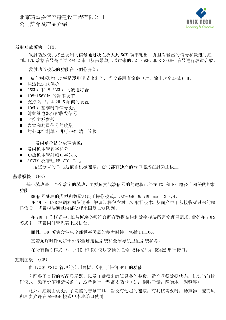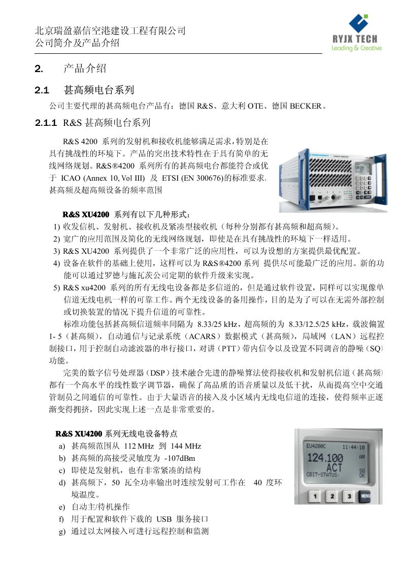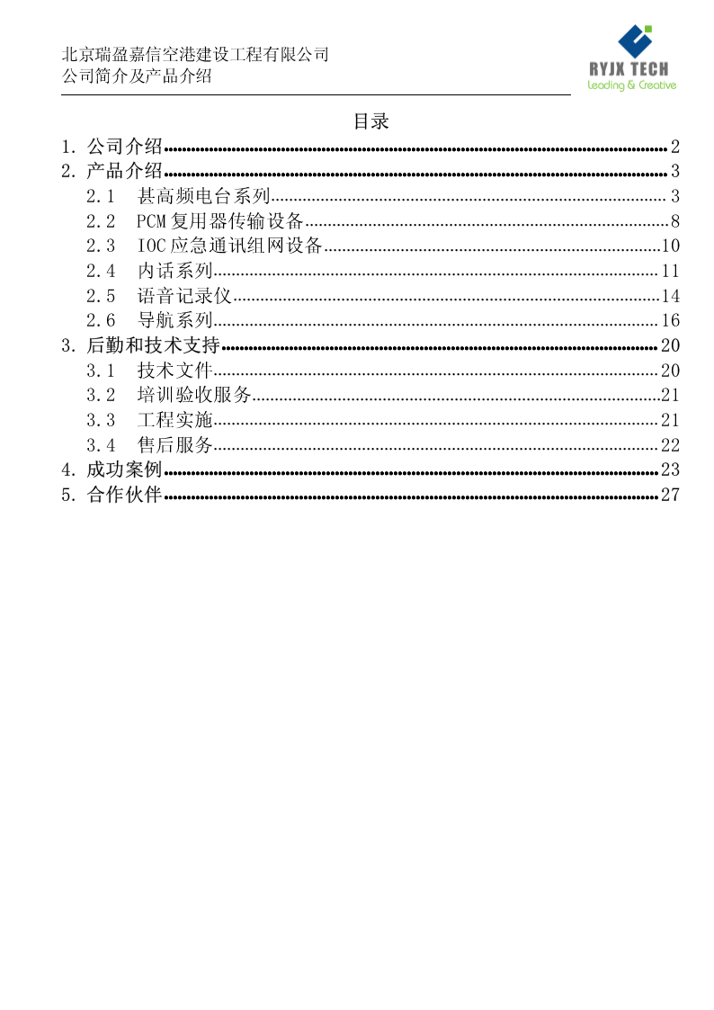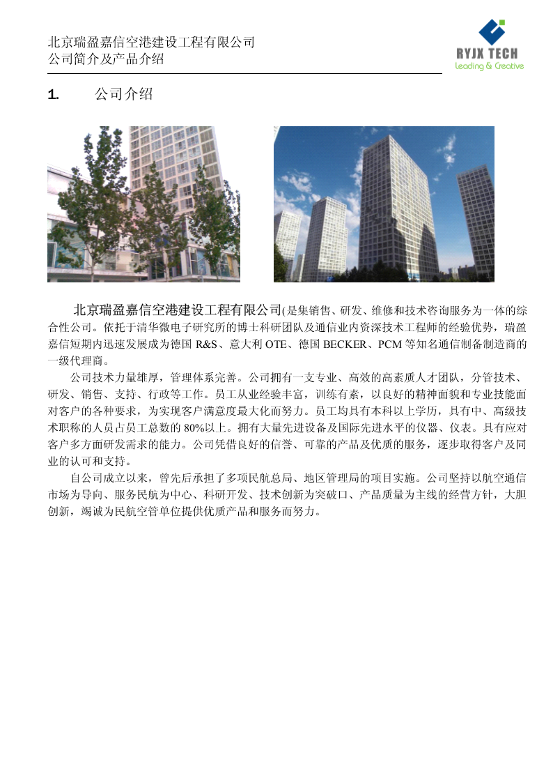 北京瑞盈嘉信空港建设工程有限公司公司简介及产品介绍公司简介公司简介及产品介绍及产品介绍北京瑞盈嘉信空港建设工程有限公司2012年7月目录北京瑞盈嘉信空港建设工程有限公司公司简介及产品介绍目录1.公司介绍................................................................................................................22.产品介绍................................................................................................................32.1甚高频电台系列........................................................................................32.2PCM复用器传输设备.................................................................................82.3IOC应急通讯组网设备...........................................................................102.4内话系列...................................................................................................112.5语音记录仪...............................................................................................142.6导航系列...................................................................................................163.后勤和技术支持.................................................................................................203.1技术文件...................................................................................................203.2培训验收服务...........................................................................................213.3工程实施...................................................................................................213.4售后服务...................................................................................................224.成功案例..............................................................................................................235.合作伙伴..............................................................................................................27北京瑞盈嘉信空港建设工程有限公司公司简介及产品介绍1.公司介绍北京瑞盈嘉信空港建设工程有限公司(是集销售、研发、维修和技术咨询服务为一体的综合性公司。依托于清华微电子研究所的博士科研团队及通信业内资深技术工程师的经验优势,瑞盈嘉信短期内迅速发展成为德国R&S、意大利OTE、德国BECKER、PCM等知名通信制备制造商的一级代理商。公司技术力量雄厚,管理体系完善。公司拥有一支专业、高效的高素质人才团队,分管技术、研发、销售、支持、行政等工作。员工从业经验丰富,训练有素,以良好的精神面貌和专业