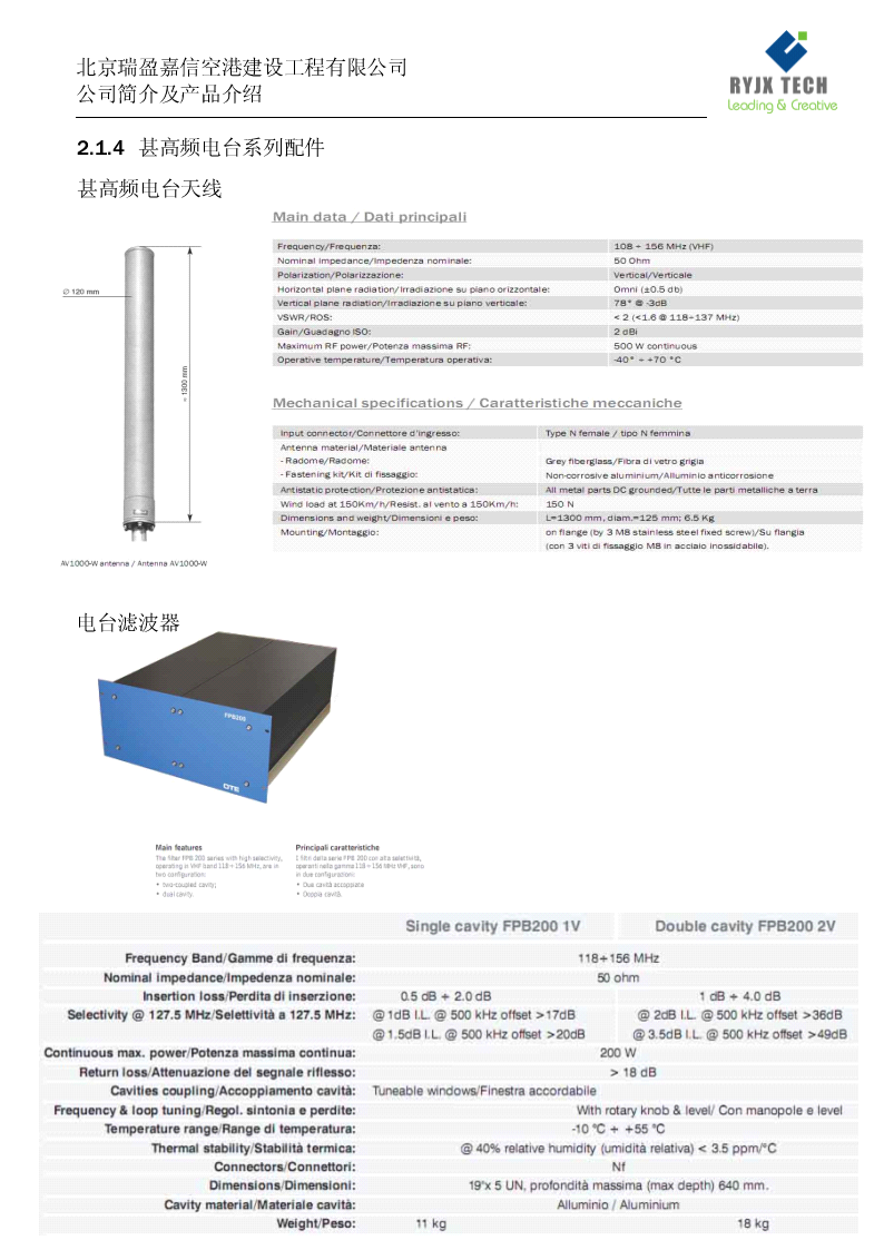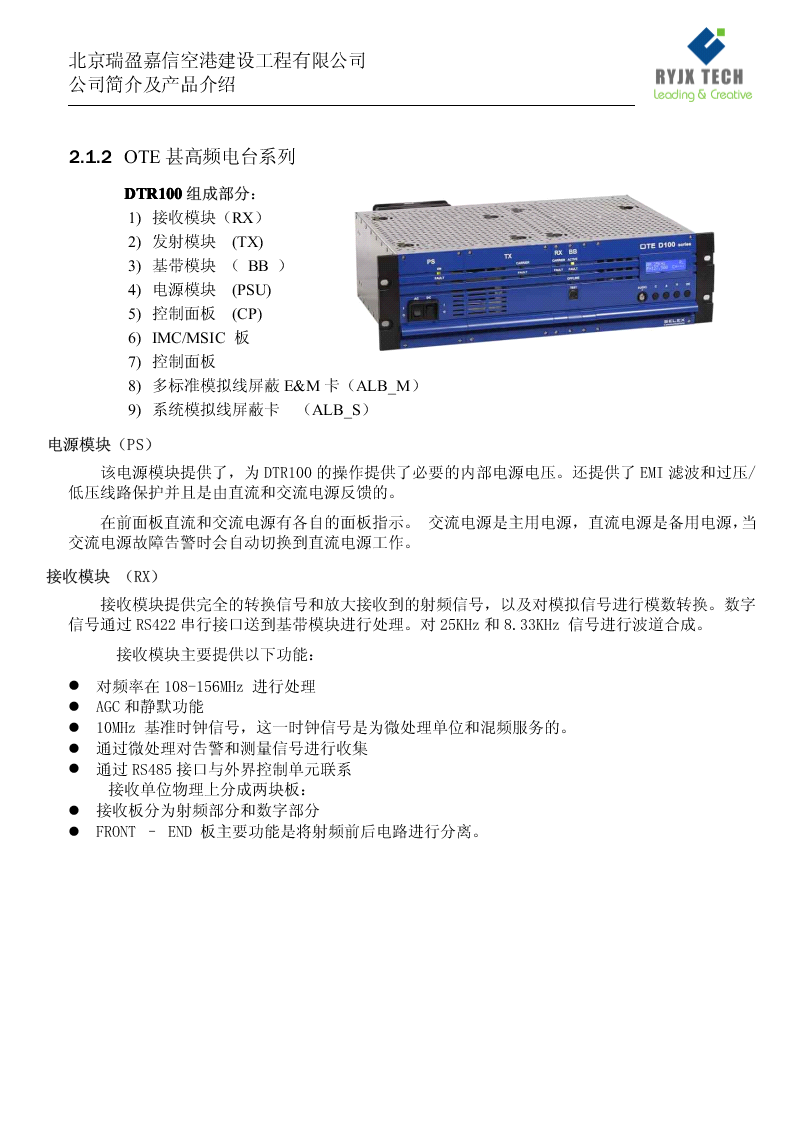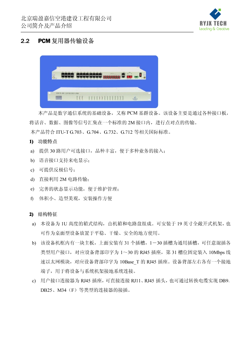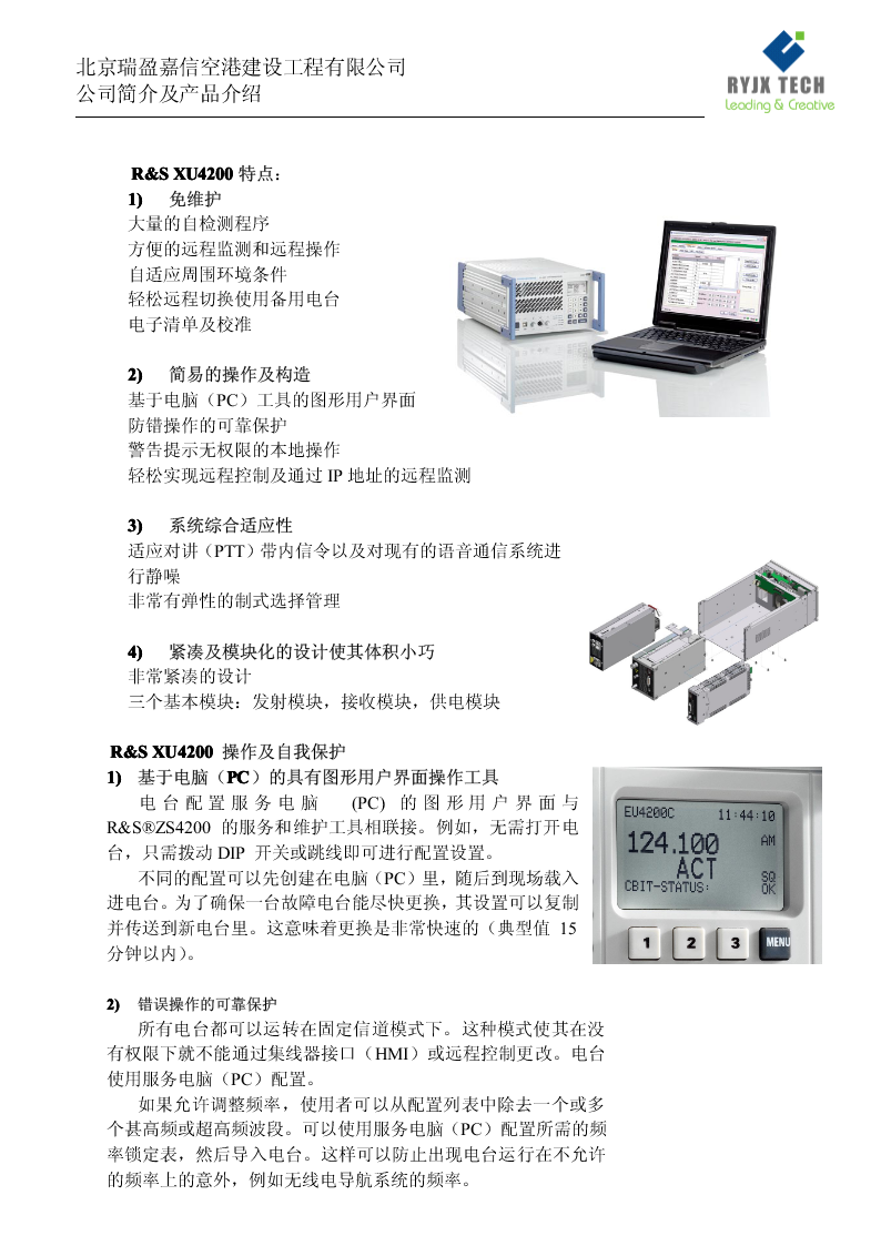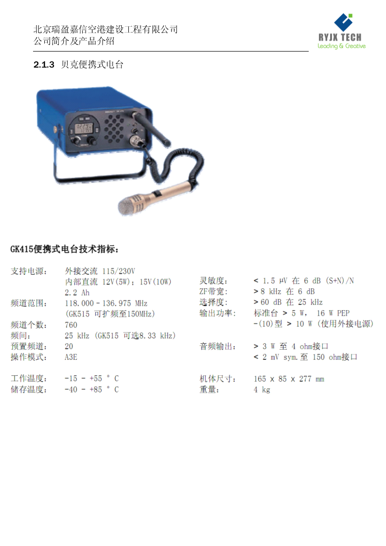 北京瑞盈嘉信空港建设工程有限公司公司简介及产品介绍公司简介公司简介及产品介绍及产品介绍北京瑞盈嘉信空港建设工程有限公司2012年7月目录北京瑞盈嘉信空港建设工程有限公司公司简介及产品介绍目录1.公司介绍................................................................................................................22.产品介绍................................................................................................................32.1甚高频电台系列........................................................................................32.2PCM复用器传输设备.................................................................................82.3IOC应急通讯组网设备...........................................................................102.4内话系列...................................................................................................112.5语音记录仪...............................................................................................142.6导航系列...................................................................................................163.后勤和技术支持.................................................................................................203.1技术文件...................................................................................................203.2培训验收服务...........................................................................................213.3工程实施...................................................................................................213.4售后服务...................................................................................................224.成功案例..............................................................................................................235.合作伙伴..............................................................................................................27北京瑞盈嘉信空港建设工程有限公司公司简介及产品介绍1.公司介绍北京瑞盈嘉信空港建设工程有限公司(是集销售、研发、维修和技术咨询服务为一体的综合性公司。依托于清华微电子研究所的博士科研团队及通信业内资深技术工程师的经验优势,瑞盈嘉信短期内迅速发展成为德国R&S、意大利OTE、德国BECKER、PCM等知名通信制备制造商的一级代理商。公司技术力量雄厚,管理体系完善。公司拥有一支专业、高效的高素质人才团队,分管技术、研发、销售、支持、行政等工作。员工从业经验丰富,训练有素,以良好的精神面貌和专业