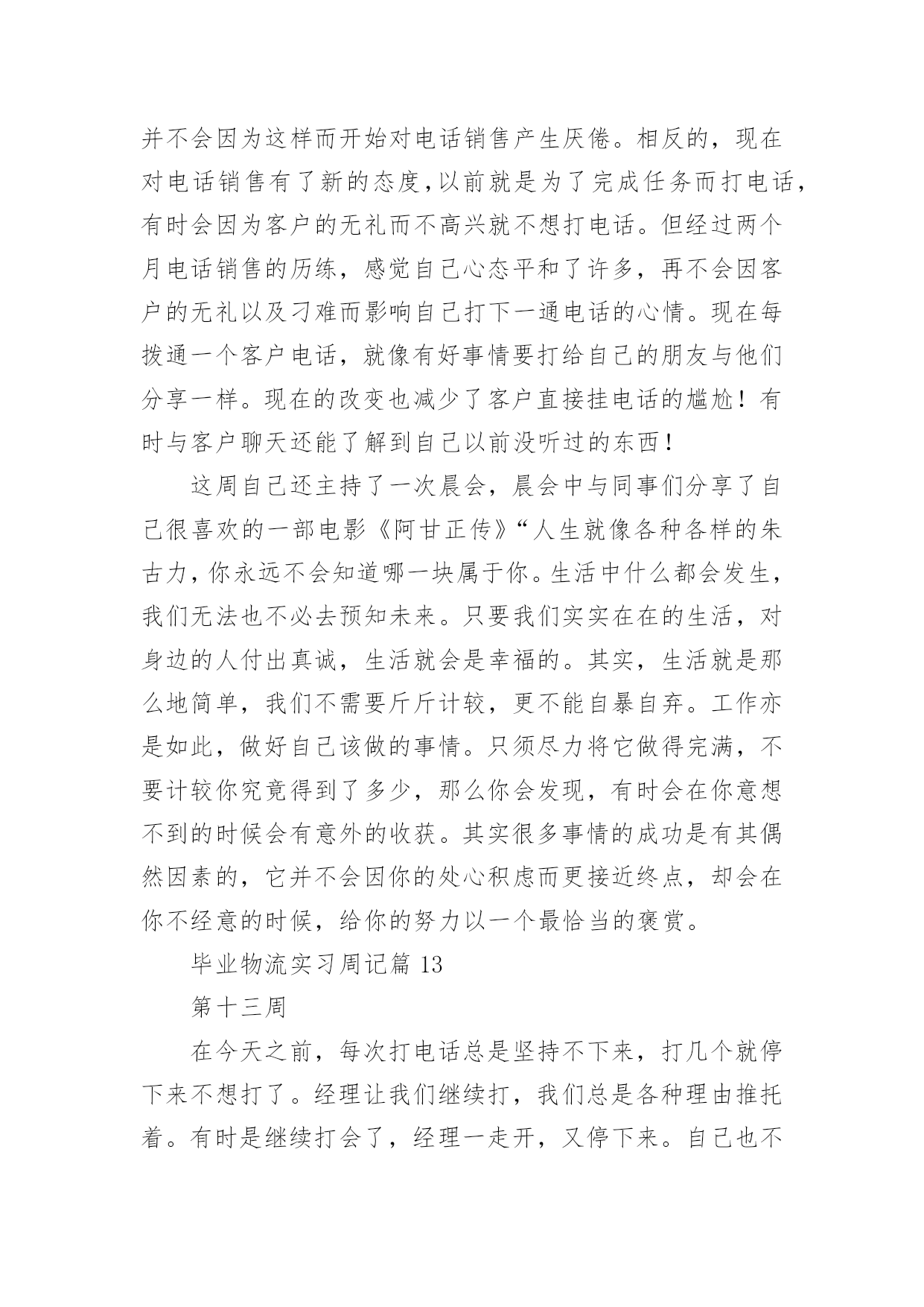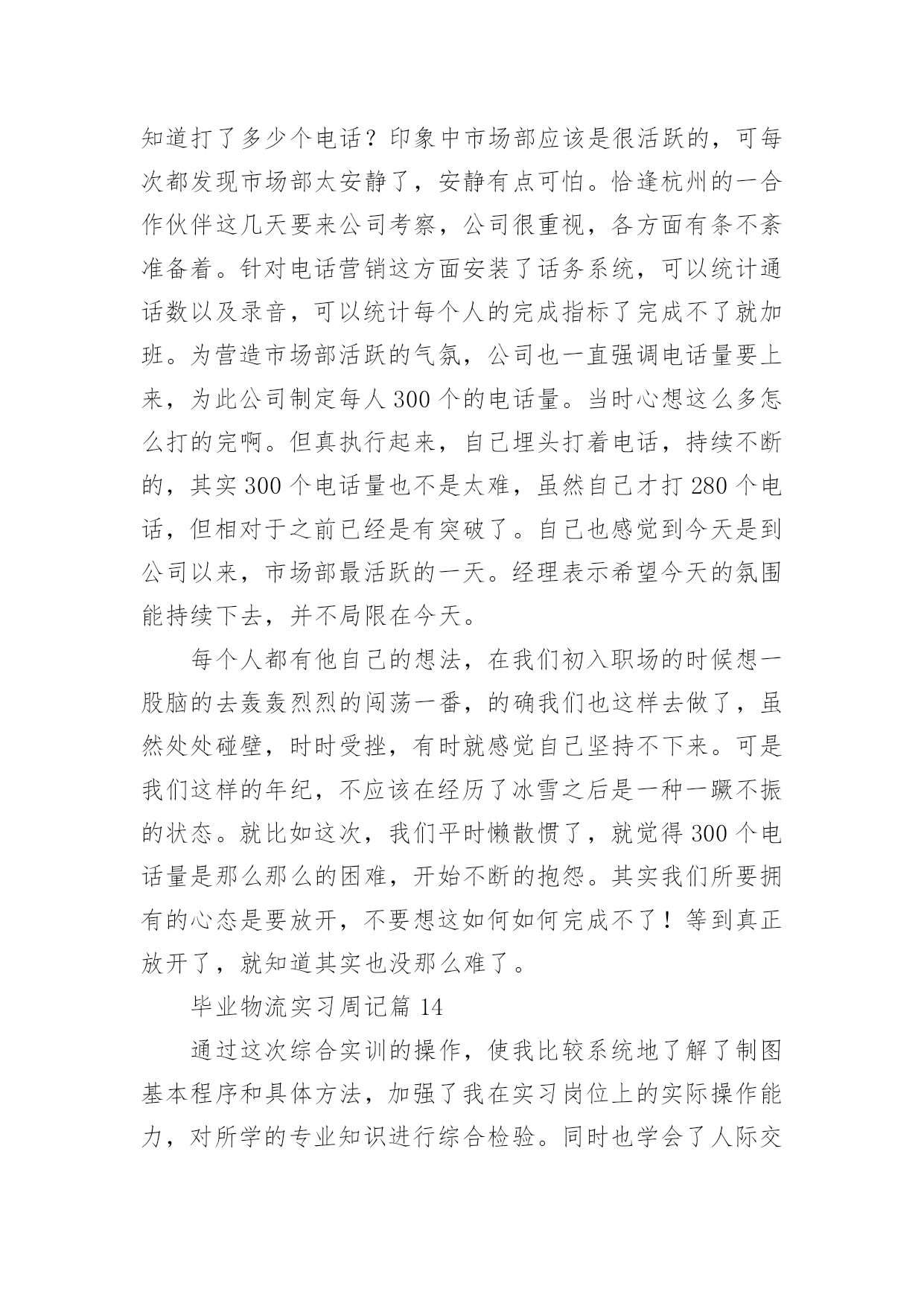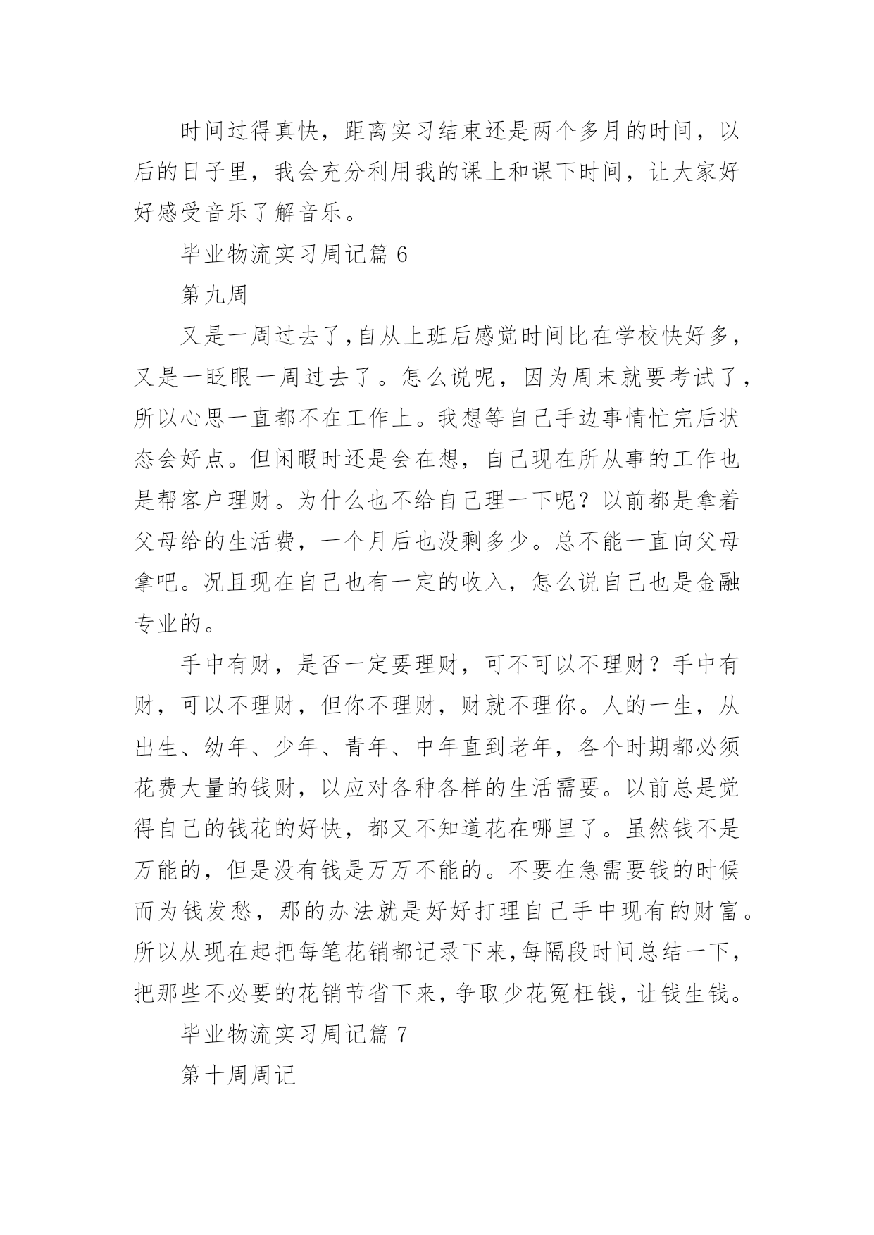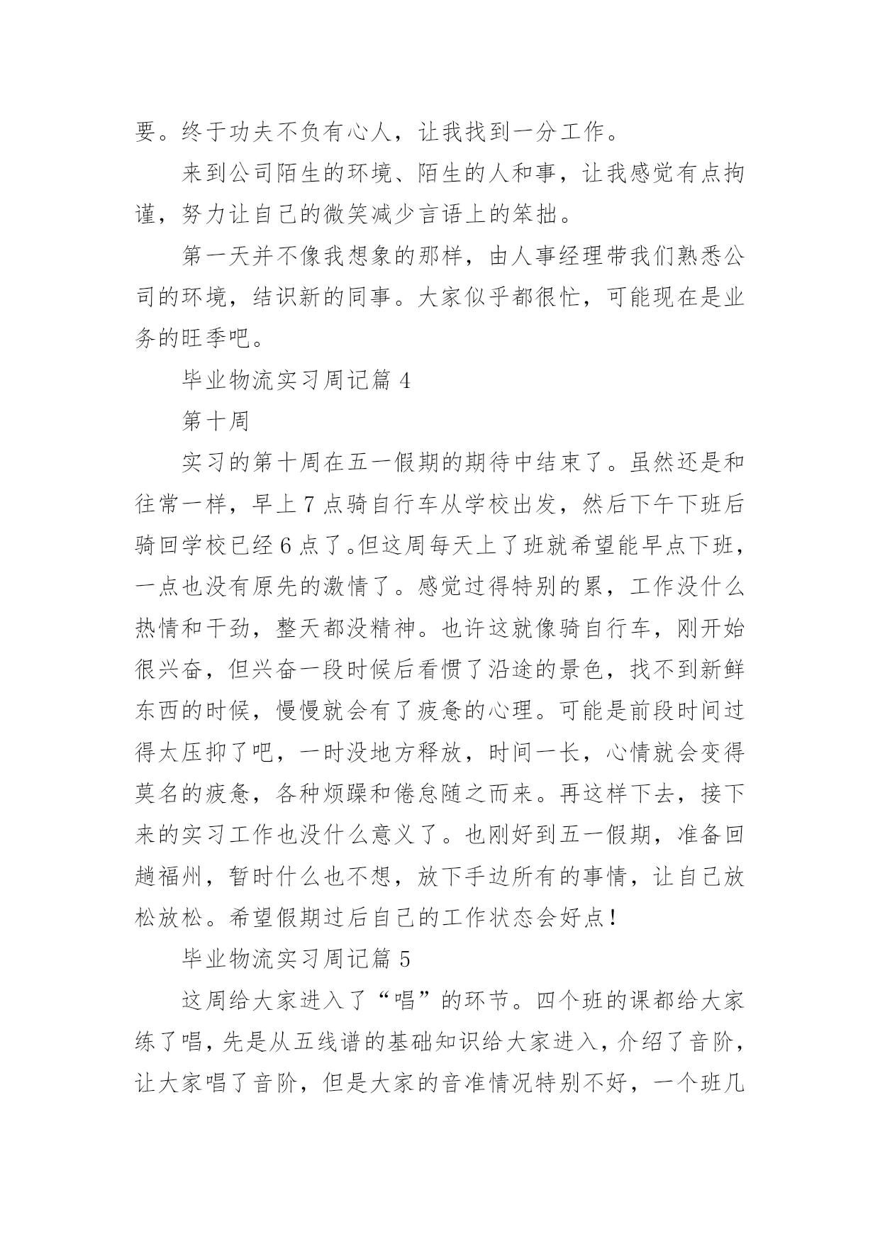 物流实习周记物流实习周记时光匆匆,一个星期已经结束了,相信大家一定感触颇深吧,一定有不少可以记录的东西吧,该写一篇周记了。周记怎么写才条理清晰呢?以下是小编整理的物流实习周记,欢迎阅读与收藏。物流实习周记1毕业物流实习周记篇1第四周的实习时间又要结束了在这四周里我学到最关键的一个能力,就是沟通。实习是在一个大的环境里生活。要懂得跟周围人沟通,学习,不可以在任性。得在学校时,虽然在书本上学到了那些理论知识,可真到了实践中还真是差的很远呢,所以我意识到了自己的交际能力还是差的太远了。所以我决定回学校要好好锻炼自己。当然现在我也在努力的改变自己。真的这学期我学到了很多做人的道理跟知识!第四周的实习时间又要结束了在这四周里我学到最关键的一个能力,就是沟通。实习是在一个大的环境里生活。要懂得跟周围人沟通,学习,不可以在任性。得在学校时,虽然在书本上学到了那些理论知识,可真到了实践中还真是差的很远呢,所以我意识到了自己的交际能力还是差的太远了。所以我决定回学校要好好锻炼自己。当然现在我也在努力的改变自己。真的这学期我学到了很多做人的道理跟知识!毕业物流实习周记篇2第三周周记经过一周的实习,对公司的运作流程也有了一些了解,虽然还没有具体的操作过,但是在接触到新的事务不再不知所措,学会了如何去处理一些突发事件。懂得从中学到一定的处理事情的发那个发,而且从工作地过程中明白了主动出击的重要性,在你可以选择的时候,就要把主动权握在自己手中。相信大家刚开始实习的时候,都做过类似复印打字、整理文档等的“杂活”,因为刚开始对于公司的工作内容、流程还不了解,所以做“杂活”成了实习工作必做的工作。虽然工作比较繁杂但是从中也学到不少的东西。所以说事情是不分大小,只要积极学习积极办事,做好份内事,勤学、勤问、勤做,就会有意想不到的收获。毕业物流实习周记篇3地球总是在转的,时间在一秒一秒的过去,而我还是在为工作的事在发愁,天天去面试,去网吧上网投简历,重复的做同一样事情,结果都是一样。但是我还是没有放弃,而是继续在寻找符合自己的工作,身上的钱花了差不多,这时候的我跟是万分的焦急,又不怎么好意思在开口往家里的人要。终于功夫不负有心人,让我找到一分工作。来到公司陌生的环境、陌生的人和事,让我感觉有点拘谨,努力让自己的微笑减少言语上的笨拙。第一天并不像我想象的那样,由人事经理带我们熟悉公司的环境,结识新的同事。大家似乎都很忙,可能现在是业务的旺季吧。毕业物流实习周记篇4第十周实习的第十周在五一假期的期待中结束了。虽然还是和往常一样,早上7点骑自行车从学校出发,然后下午下班后骑回学校已经6点了。但这周每天上了班就希望能早点下班,一点也没有原先的激情了。感觉过得特别的累,工作没什么热情和干劲,整天都没精神。也许这就像骑自行车,刚开始很兴奋,但兴奋一段时候后看惯了沿途的景色,找不到新鲜东西的时候,慢慢就会有了疲惫的心理。可能是前段时间过得太压抑了吧,一时没地方释放,时间一长,心情就会变得莫名的疲惫,各种烦躁和倦怠随之而来。再这样下去,接下来的实习工作也没什么意义了。也刚好到五一假期,准备回趟福州,暂时什么也不想,放下手边所有的事情,让自己放松放松。希望假期过后自己的工作状态会好点!毕业物流实习周记篇5这周给大家进入了“唱”的环节。四个班的课都给大家练了唱,先是从五线谱的基础知识给大家进入,介绍了音阶,让大家唱了音阶,但是大家的音准情况特别不好,一个班几乎没有几个能唱准的,就是音乐基础为零,从小没有受到音乐的训练和熏陶,导致大家的音准情况特别不理想,但是我让四个班每个班的学生都挨个唱音阶或者单音,我给每个人都做了音准的纠正,有的同学在反复地听和纠正过后能唱准,证明大家还是在听的时候注意力特别不集中,如果注意力高度集中,集中精力去听这个音高,那么很少会唱不准的。周五下午给合唱团排练了,合唱团一共22个人,有的是报的合唱团,有的是因为没有选上自己心仪的项目被调剂到合唱团来了,女生特别少,男生很多,目前我给大家分了三个声部,第一次训练给大家看了一些合唱团演唱或者比赛的视频,告诉大家什么叫合唱,合唱里配合特别重要,大家都听得很认真。给大家做了发声练习,给大家讲解了呼吸方法,气息的运用方法,演唱方法等。唱音的时候,大家还是总唱不准,我依然挨个给大家纠正,因为我觉着如果各个人都唱不准,那么这个团队是无法进行下去了,到后来因为大家总是唱不准我都有些心灰意冷了,在想我到底能不能弄了,五月份还有合唱比赛,但是就大家现在的歌唱状态要想唱一首不跑调的歌基本上是不可能的。课下和我的指导老师交流,蔡老师鼓励了我,说慢慢来,别着急,让他们多听,多给他们纠正音准,让他们多唱,肯定会有一定的效果,我听了之后信心也增加了,可能也因为上课的时候有一位同学在我反复纠正和让他听音的过程中唱准了音,虽然后来又不准了