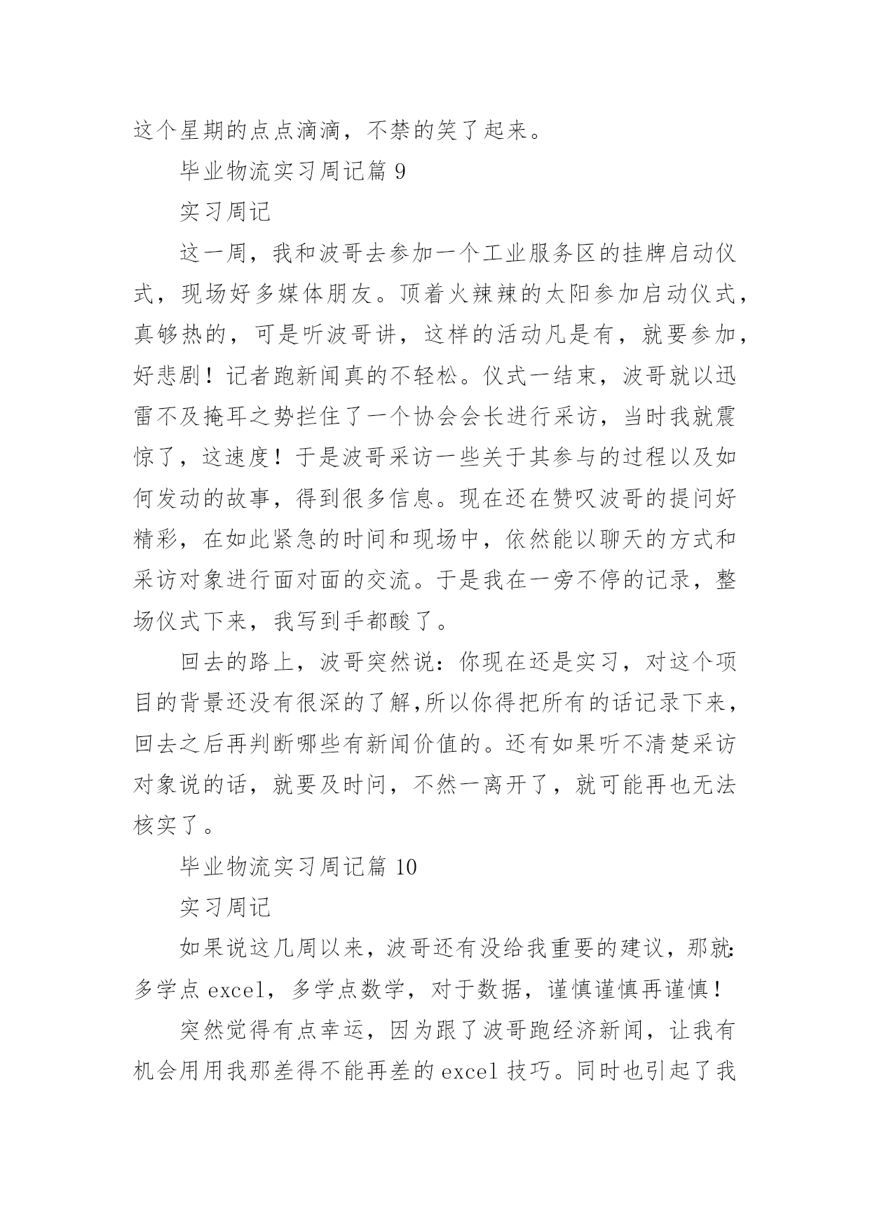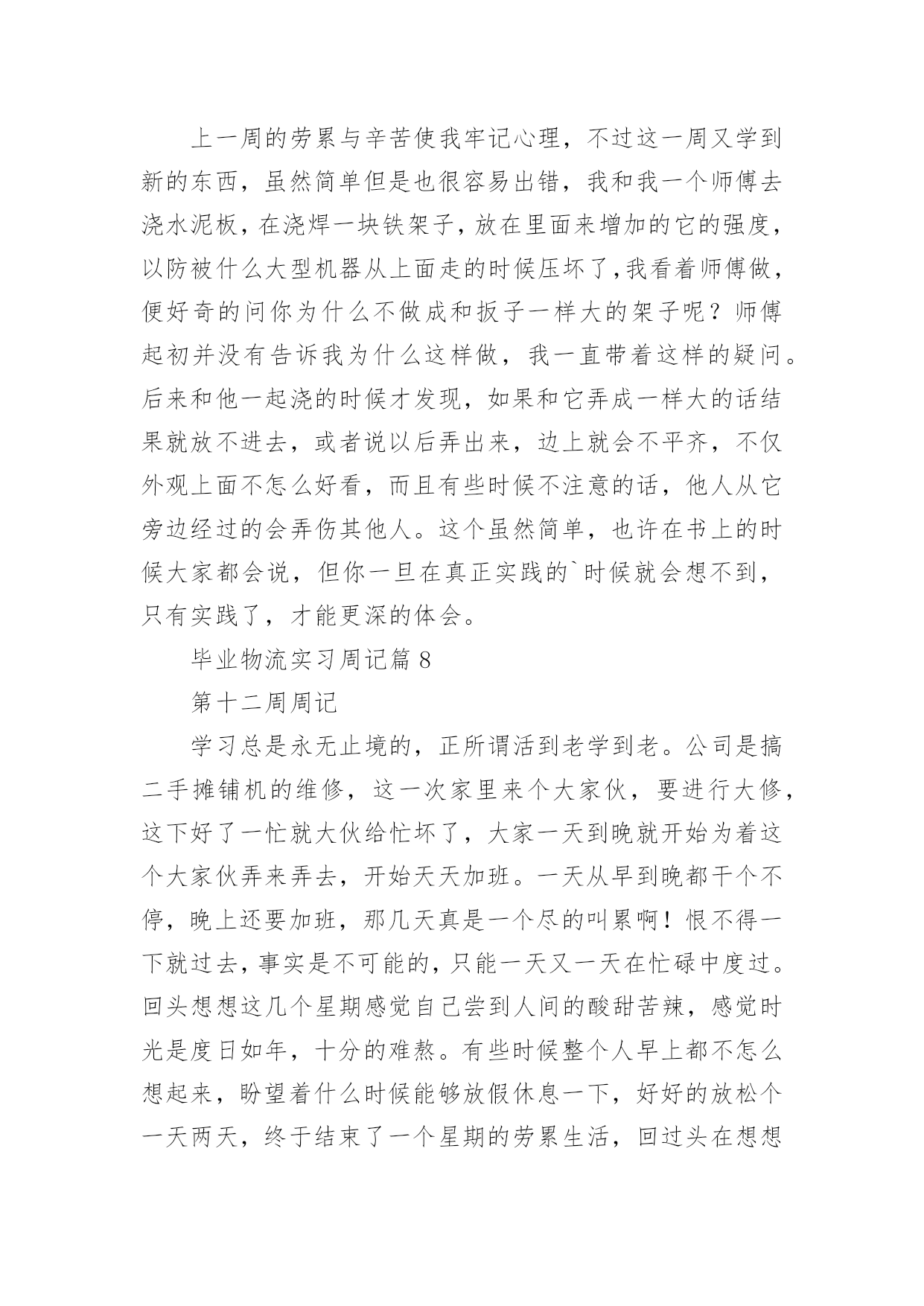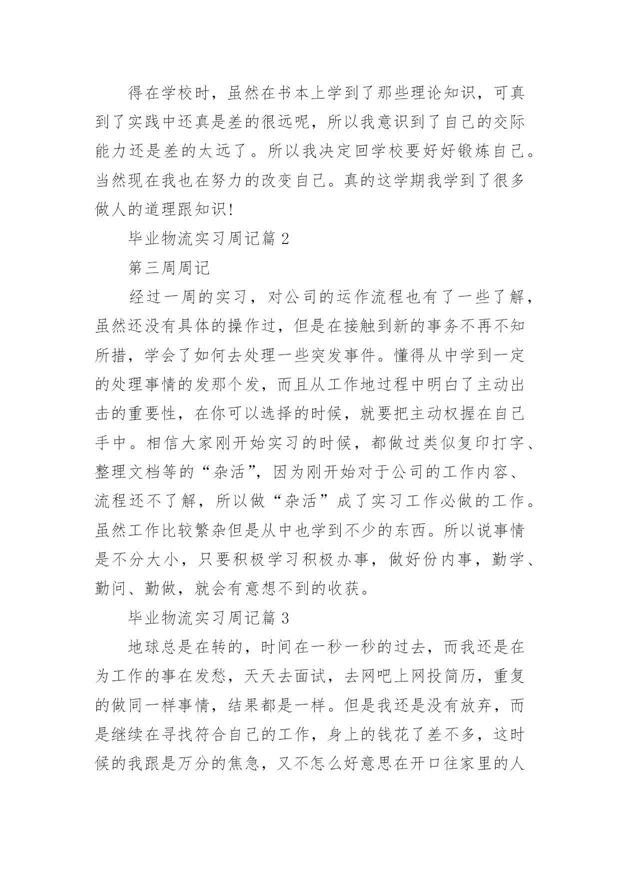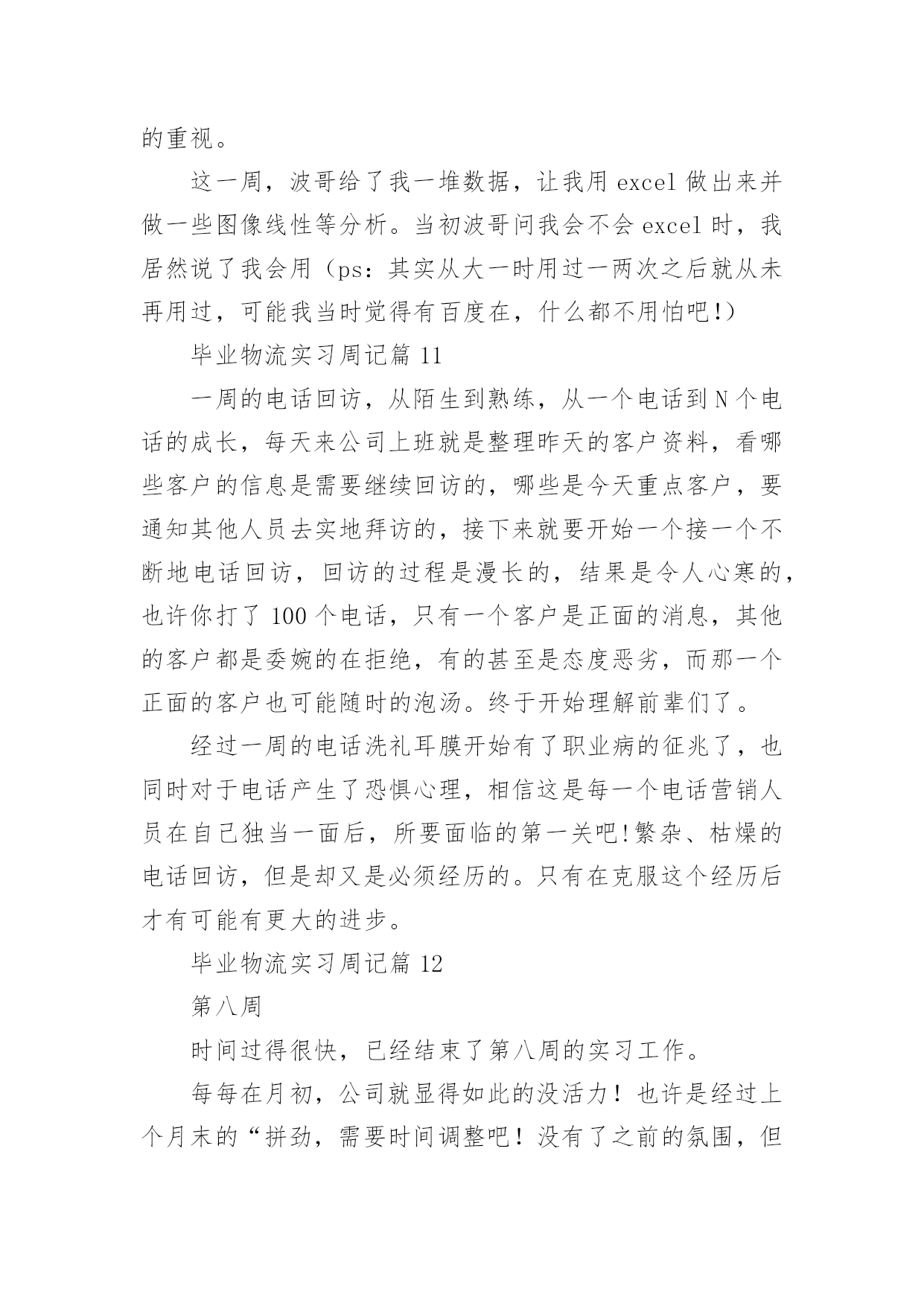 物流实习周记物流实习周记时光匆匆,一个星期已经结束了,相信大家一定感触颇深吧,一定有不少可以记录的东西吧,该写一篇周记了。周记怎么写才条理清晰呢?以下是小编整理的物流实习周记,欢迎阅读与收藏。物流实习周记1毕业物流实习周记篇1第四周的实习时间又要结束了在这四周里我学到最关键的一个能力,就是沟通。实习是在一个大的环境里生活。要懂得跟周围人沟通,学习,不可以在任性。得在学校时,虽然在书本上学到了那些理论知识,可真到了实践中还真是差的很远呢,所以我意识到了自己的交际能力还是差的太远了。所以我决定回学校要好好锻炼自己。当然现在我也在努力的改变自己。真的这学期我学到了很多做人的道理跟知识!第四周的实习时间又要结束了在这四周里我学到最关键的一个能力,就是沟通。实习是在一个大的环境里生活。要懂得跟周围人沟通,学习,不可以在任性。得在学校时,虽然在书本上学到了那些理论知识,可真到了实践中还真是差的很远呢,所以我意识到了自己的交际能力还是差的太远了。所以我决定回学校要好好锻炼自己。当然现在我也在努力的改变自己。真的这学期我学到了很多做人的道理跟知识!毕业物流实习周记篇2第三周周记经过一周的实习,对公司的运作流程也有了一些了解,虽然还没有具体的操作过,但是在接触到新的事务不再不知所措,学会了如何去处理一些突发事件。懂得从中学到一定的处理事情的发那个发,而且从工作地过程中明白了主动出击的重要性,在你可以选择的时候,就要把主动权握在自己手中。相信大家刚开始实习的时候,都做过类似复印打字、整理文档等的“杂活”,因为刚开始对于公司的工作内容、流程还不了解,所以做“杂活”成了实习工作必做的工作。虽然工作比较繁杂但是从中也学到不少的东西。所以说事情是不分大小,只要积极学习积极办事,做好份内事,勤学、勤问、勤做,就会有意想不到的收获。毕业物流实习周记篇3地球总是在转的,时间在一秒一秒的过去,而我还是在为工作的事在发愁,天天去面试,去网吧上网投简历,重复的做同一样事情,结果都是一样。但是我还是没有放弃,而是继续在寻找符合自己的工作,身上的钱花了差不多,这时候的我跟是万分的焦急,又不怎么好意思在开口往家里的人要。终于功夫不负有心人,让我找到一分工作。来到公司陌生的环境、陌生的人和事,让我感觉有点拘谨,努力让自己的微笑减少言语上的笨拙。第一天并不像我想象的那样,由人事经理带我们熟悉公司的环境,结识新的同事。大家似乎都很忙,可能现在是业务的旺季吧。毕业物流实习周记篇4第十周实习的第十周在五一假期的期待中结束了。虽然还是和往常一样,早上7点骑自行车从学校出发,然后下午下班后骑回学校已经6点了。但这周每天上了班就希望能早点下班,一点也没有原先的激情了。感觉过得特别的累,工作没什么热情和干劲,整天都没精神。也许这就像骑自行车,刚开始很兴奋,但兴奋一段时候后看惯了沿途的景色,找不到新鲜东西的时候,慢慢就会有了疲惫的心理。可能是前段时间过得太压抑了吧,一时没地方释放,时间一长,心情就会变得莫名的疲惫,各种烦躁和倦怠随之而来。再这样下去,接下来的实习工作也没什么意义了。也刚好到五一假期,准备回趟福州,暂时什么也不想,放下手边所有的事情,让自己放松放松。希望假期过后自己的工作状态会好点!毕业物流实习周记篇5这周给大家进入了“唱”的环节。四个班的课都给大家练了唱,先是从五线谱的基础知识给大家进入,介绍了音阶,让大家唱了音阶,但是大家的音准情况特别不好,一个班几乎没有几个能唱准的,就是音乐基础为零,从小没有受到音乐的训练和熏陶,导致大家的音准情况特别不理想,但是我让四个班每个班的学生都挨个唱音阶或者单音,我给每个人都做了音准的纠正,有的同学在反复地听和纠正过后能唱准,证明大家还是在听的时候注意力特别不集中,如果注意力高度集中,集中精力去听这个音高,那么很少会唱不准的。周五下午给合唱团排练了,合唱团一共22个人,有的是报的合唱团,有的是因为没有选上自己心仪的项目被调剂到合唱团来了,女生特别少,男生很多,目前我给大家分了三个声部,第一次训练给大家看了一些合唱团演唱或者比赛的视频,告诉大家什么叫合唱,合唱里配合特别重要,大家都听得很认真。给大家做了发声练习,给大家讲解了呼吸方法,气息的运用方法,演唱方法等。唱音的时候,大家还是总唱不准,我依然挨个给大家纠正,因为我觉着如果各个人都唱不准,那么这个团队是无法进行下去了,到后来因为大家总是唱不准我都有些心灰意冷了,在想我到底能不能弄了,五月份还有合唱比赛,但是就大家现在的歌唱状态要想唱一首不跑调的歌基本上是不可能的。课下和我的指导老师交流,蔡老师鼓励了我,说慢慢来,别着急,让他们多听,多给他们纠正音准,让他们多唱,肯定会有一定的效果,我听了之后信心也增加了,可能也因为上课的时候有一位同学在我反复纠正和让他听音的过程中唱准了音,虽然后来又不准了