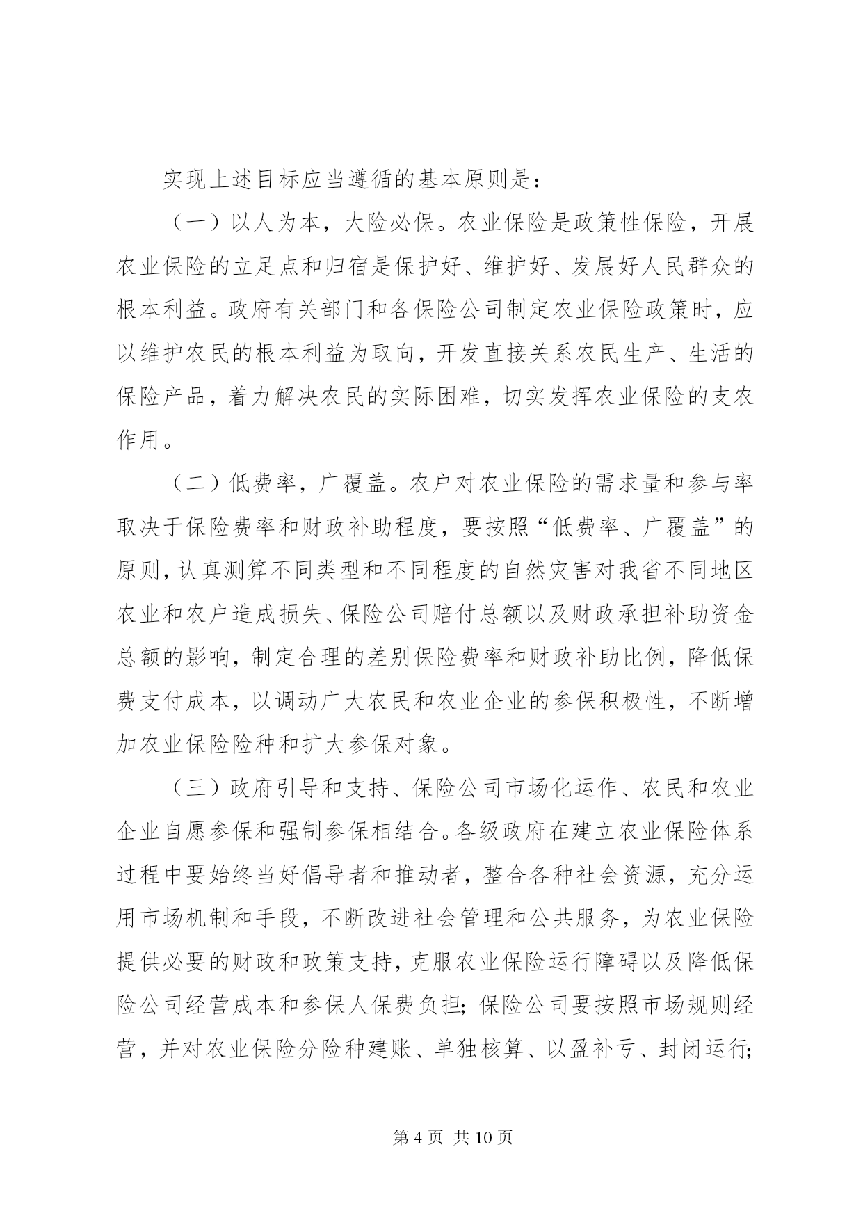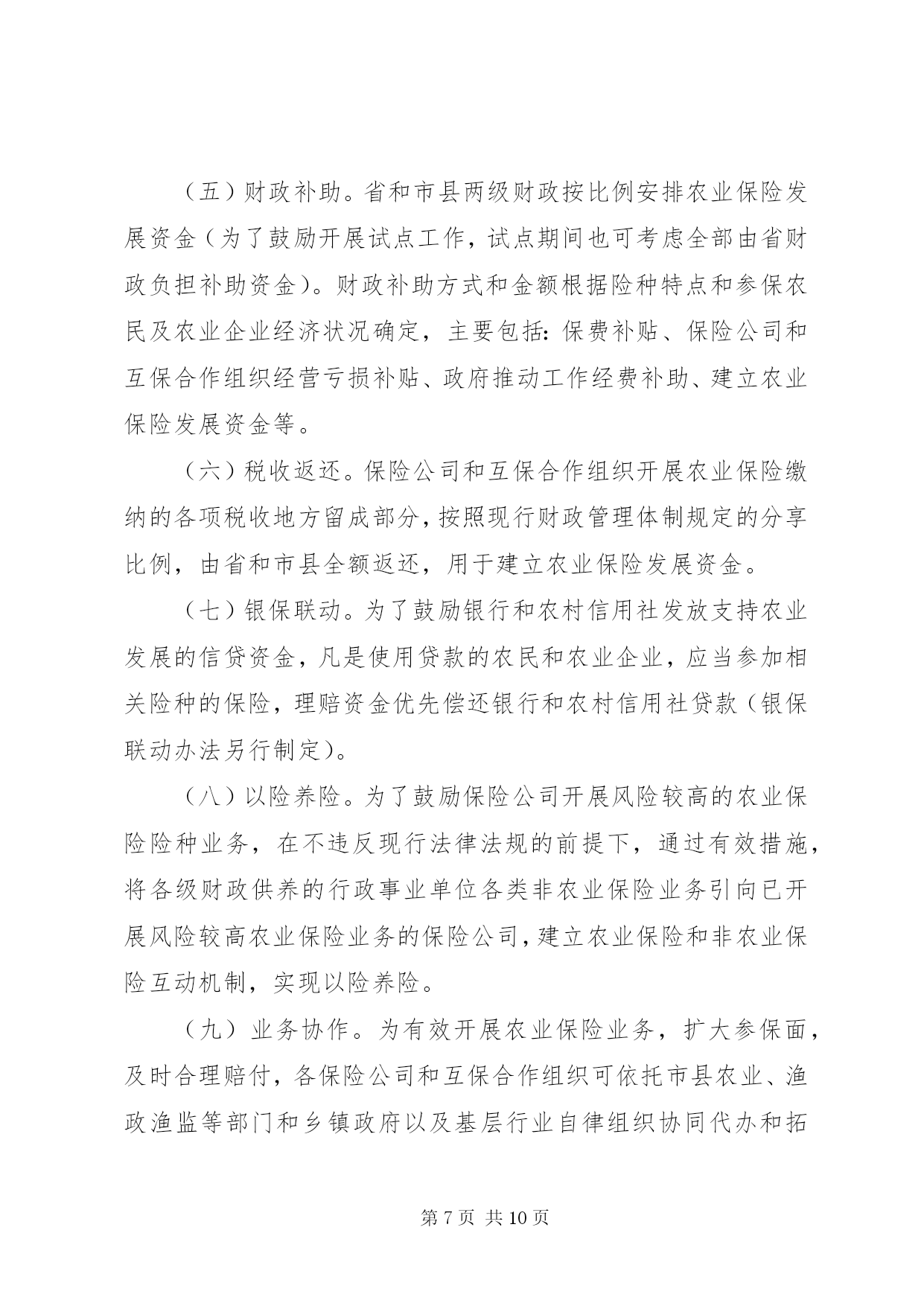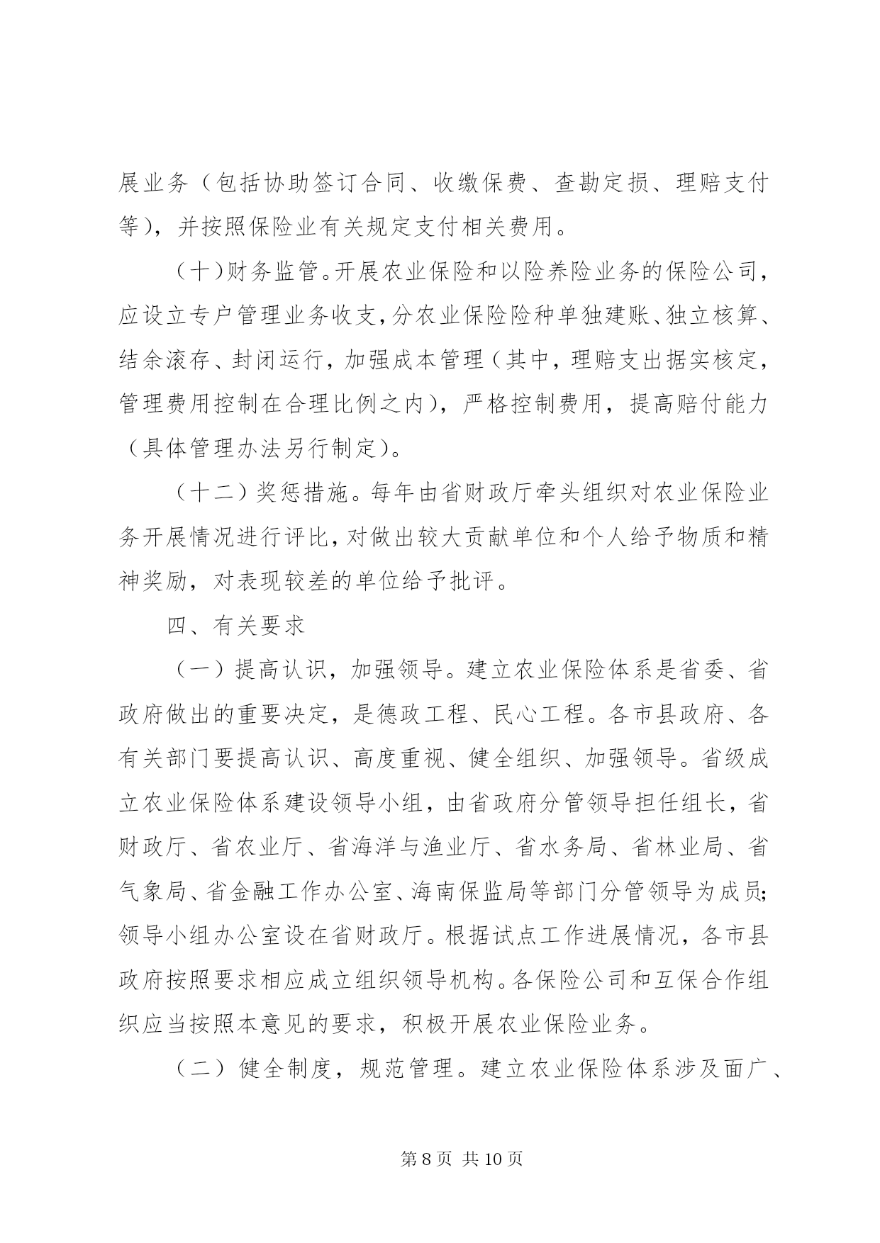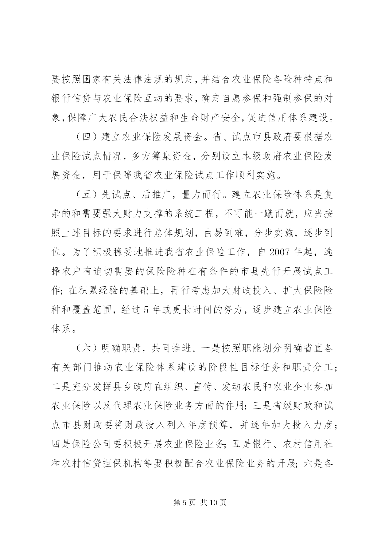 第PAGE\*Arabic\*MERGEFORMAT10页共NUMPAGES\*MERGEFORMAT10页关于建立我省农业保险体系的意见由于农业保险风险大、赔付率高,建省以来只有中国人民财产保险公司海南分公司尝试性地开展了少量农业保险业务。该业务目前总体亏损、业务萎缩、难以为继。我省农业保险的现状与建设社会主义新农村、构建和谐社会的要求极不适应。为了贯彻落实党的十六届五中全会关于建设社会主义新农村的重大决策和《国务院关于保险业改革发展的若干意见》(国发〔200*〕23号)精神,解决我省农民和农业企业在生产过程中迫切需要的农业保险问题,保障农业健康发展、农民增收致富和农村社会稳定,经研究,决定从2007年开始,充分发挥政府职能作用,有组织、有计划、有步骤地开展和推进我省农业保险工作,通过适度的政策扶持和必要的资金投入,解决保险公司不愿介入、农民负担不起高额保费、财政承受不了巨额风险的难题,逐步建立和不断完善农业保险体系。具体意见如下:一、充分认识建立农业保险体系的重要意义农业保险具有经济补偿、资金融通和社会管理功能,是市场经济条件下风险管理的基本手段,是社会保障体系的重要组成部分。建立我省农业保险体系对于建设社会主义新农村、构建和谐社会具有重要作用。(一)建立农业保险体系是解决长期困扰我省因台风等自然灾害造成农业损失、农民减收等问题的重要措施。我省约60%的人口是农民,80%的土地在农村,33%的生产总值来源于第一产业,农业在全省经济发展中具有基础地位、首要地位和支柱地位。然而,我省台风、洪涝、干旱、病虫害和瘟疫等自然灾害较多,对农业生产和农民生活影响很大,往往一次重特大自然灾害就造成农业损失高达数十亿元甚至上百亿元,导致大量农民返贫以及许多农业企业破产倒闭。建立农业保险体系,实行市场化的灾害补偿机制,对增强农业抵御风险的能力、降低农民和农业企业受灾损失、减少和防止农民返贫、完善灾害防范和救助体系以及恢复生产、促进发展等具有不可替代的重要作用。(二)建立农业保险体系有利于建设社会主义新农村和构建和谐社会。建设社会主义新农村关键是发展农业生产力。发展农业生产力需要为其创造必需的外部环境,建立农业保险体系、完善多层次的农业巨灾风险转移分担机制,是发展农业生产力的重要保障。同时,只有大力发展农业生产力,才能逐步缓解农村发展滞后于城市、农民的收入水平大大低于城市居民等社会发展中的不和谐问题。(三)建立农业保险体系有利于实现省委、省政府主攻“三低一小”的战略。要解决当前我省“三低一小”的主要矛盾,需要着力提高城乡居民尤其是农民的收入水平。农业是受自然条件影响较大的产业,建立农业保险体系,充分发挥农业保险在保护农业生产、提高农民收入、稳定农村经济等方面的作用,能够切实解决农业灾害损失得不到及时有效补偿、农民收入无保障的问题。(四)建立农业保险体系是贯彻落实《国务院关于保险业改革发展的若干意见》的具体体现。《国务院关于保险业改革发展的若干意见》明确要求积极稳妥推进试点,发展多形式、多渠道的农业保险。这就要求研究制定支持政策,探索建立适合我省实际情况的农业保险发展模式,改变事后单一的财政补助农业灾害救助模式,将农业保险作为支农方式的创新,纳入农业支持保护体系,逐步建立农业保险与财政补助相结合的农业风险防范与救助机制。二、建立农业保险体系的主要目标和基本原则根据我省农业发展的中长期规划、自然灾害的基本特点、农民和农业企业的实际需要、财政承受能力以及保险公司的经营状况,建立农业保险体系的主要目标是:通过政府推动、财政支持、保险和信贷联动、农业保险和非农业保险互动(即以险养险)、农民和农业企业自愿投保和必要的强制性参保相配合、保险公司一家独保和多家共保以及农民和农业企业互保合作等方式方法,逐步建立起多个经营主体、多种经营方式、多类保险品种,广覆盖、低保费(额),盈利共享、风险共担的农业保险体系和运作机制,让农业保险走进千家万户,实现我省农业保险业务正常运行和可持续发展。实现上述目标应当遵循的基本原则是:(一)以人为本,大险必保。农业保险是政策性保险,开展农业保险的立足点和归宿是保护好、维护好、发展好人民群众的根本利益。政府有关部门和各保险公司制定农业保险政策时,应以维护农民的根本利益为取向,开发直接关系农民生产、生活的保险产品,着力解决农民的实际困难,切实发挥农业保险的支农作用。(二)低费率,广覆盖。农户对农业保险的需求量和参与率取决于保险费率和财政补助程度,要按照“低费率、广覆盖”的原则,认真测算不同类型和不同程度的自然灾害对我省不同地区农业和农户造成损失、保险公司赔付总额以及财政承担补助资金总额的影响,制定合理的差别保险费率和财政补助比例,降低保费支付成本,以调动广大农民和农业企业的参保积极性,不断增加农业保险险种和扩