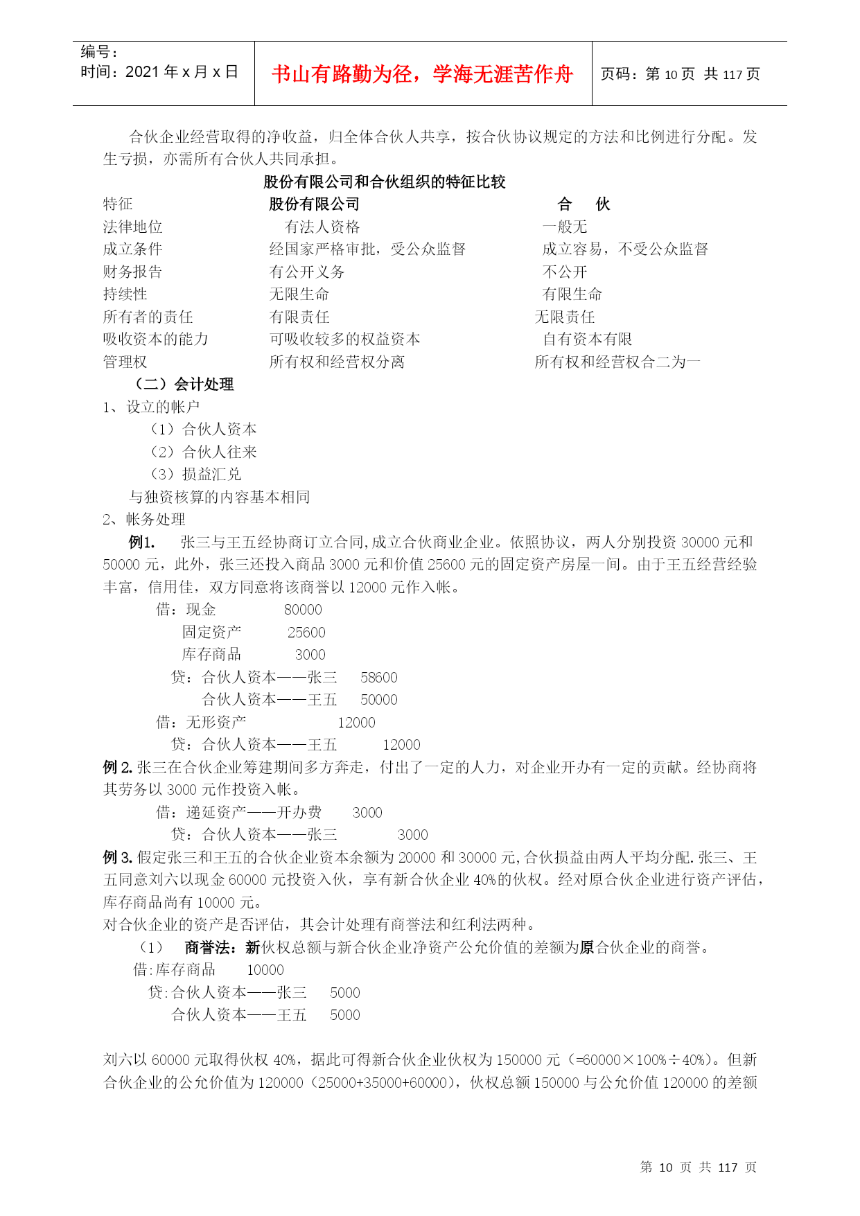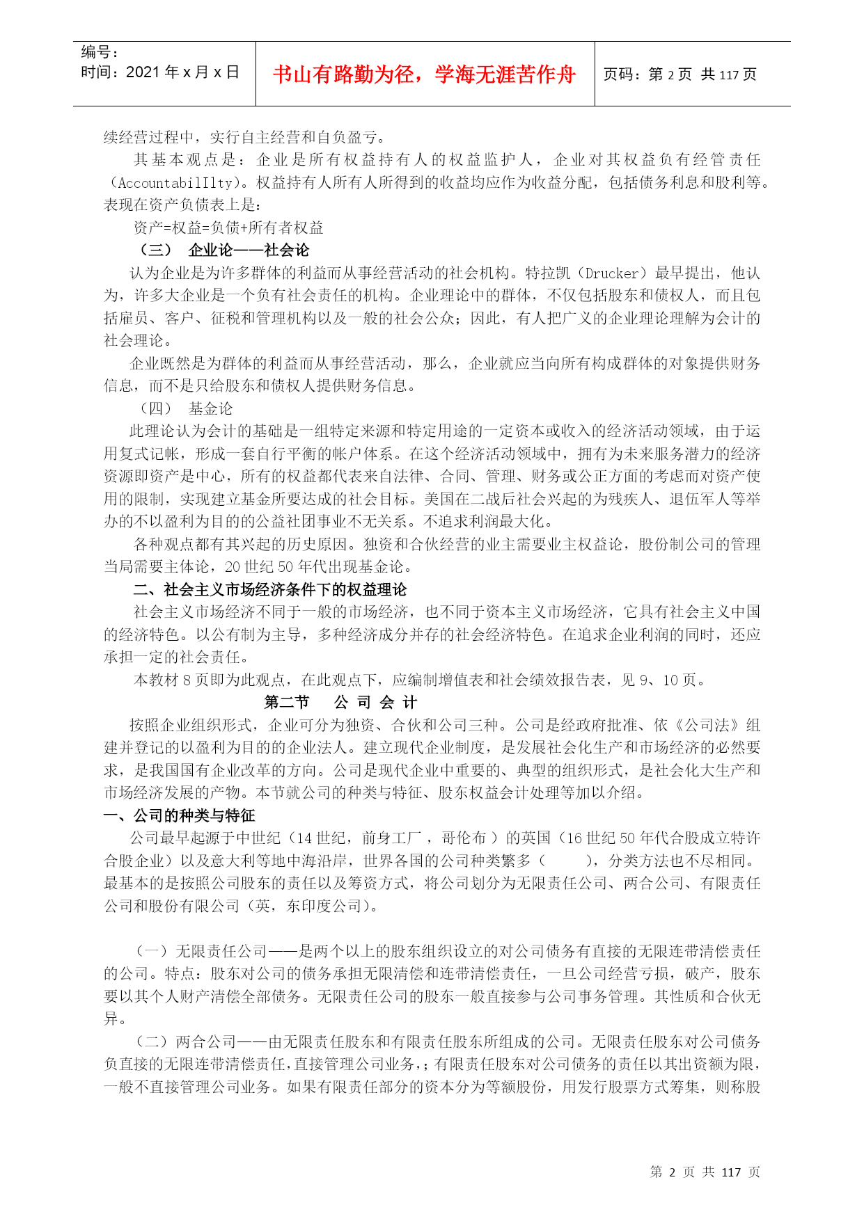 编号:时间:2021年x月x日书山有路勤为径,学海无涯苦作舟页码:第PAGE117页共NUMPAGES117页第PAGE\*MERGEFORMAT117页共NUMPAGES\*MERGEFORMAT117页高级财务会计讲义高级财务会计的产生限于20世纪40年代以前社会经济的规模和水平,国际经济交流发展的程度以及市场物价长期处于较为稳定的水平等条件,使得20世纪40年代后期所成型的财务会计的主体,一般为控制一定经济资源进行经济活动并独立进行会计核算的单一经济实体,资产的计价也是建立在币值不变的历史成本原则基础之上;又由于国际交流的局限性使会计核算的内容主要是国内生产经营活动,商品进出口业务的比重不大,因此,我们对当时成型的这种财务会计称为“一般财务会计”或“传统财务会计”——中级财务会计。二战后,特别是从20世纪60年代开始,由于西方世界科技技术领域取得的突破性进展,以及由此而带动的全球经济迅速发展,使世界经济环境发生了巨大的变化。股份公司的兴起和发展,使集团公司大量涌现,使财务会计的目标更主要地转向外部报告;国际贸易、国际投资、跨国经营迅速发展,西方国家不仅推行商品资本和货币资本的国际化,而且大规模实行生产资本的国际化,从而促使国际间贸易和投资的不断扩大,突破了企业经济活动以国内为主的特征,产生了大量的跨国公司,从而使国际金融市场也得以形成和发展;20世纪70年代西方国家和拉美各国经历了严重的通货膨胀,使得货币持续大幅贬值。当以传统财务会计理论和方法不足以核算和监督这些特殊会计业务充分提供必需的会计信息时,就要通过不断的会计实践和总结,建立新的会计理论和方法,因而使会计这一经济管理活动在传统财务会计的基础上进一步发展,产生了高级财务会计。高级财务会计是运用传统的财务会计理论与方法,对在新的经济条件下出现的一般财务会计中不予包括或不经常发生的企业特殊经济业务进行核算和监督,向与企业有经济利害关系着提供有用的决策会计信息的经济管理活动。从高级财务会计的产生可以看出,它主要是核算和监督那些在新的社会经济条件下出现的,传统财务会计中不予涉及或未广泛深入涉及的各种“特殊经济业务”。权益会计主要权益理论一主要的几种观点权益理论——解释权益的性质,说明对权益的不同认识,以及与之相联系的资本和利润不同概念的差异等等,一般视为权益理论。目前,主要有四种理论观点业主权益论(所有者权益论)产生与18世纪及以前的,以私有制和合伙企业为主导地位的经济环境中,企业经营以业主为中心,经营的目的在于为业主增加财富,追求利润最大化。企业的资产是业主所拥有的财产,企业负债是业主必须用资产清偿的义务;企业的任何收入或收益都是业主权益的增加,所有的费用(成本)开支,都是业主权益的减少,缴纳任何税金,包括交纳的所得税也都列作费用支出,减少业主权益。此理论认为所有者权益是“净资产”,是一个净财富概念,体现在会计等式是资产—负债=业主权益或所有者权益我国现行会计实物中,将发放股利认为是收益的分配,但是,支付债务利息和缴纳所得税,由于他们减少了所有者的财富而被认为是费用,以及投资核算中的权益法。这些观点就是基于上理论。主体论(以公司兴起为背景)认为企业是经营主体,企业与所有者是分离的,所有者与企业债权人同样是企业持续经营所需资本的提供者。企业经营的资产是企业本身的资产,企业持有法人财产权,企业经营的负债是企业本身的债务,都相对独立于所有者的个人财产;所有者不居于企业经营和权益的中心,只是与企业债权人一样,是权益持有人。此理论认为企业是具有自己独立人格的存在主体,在法律上对其资产持有法人财产权,在其持续经营过程中,实行自主经营和自负盈亏。其基本观点是:企业是所有权益持有人的权益监护人,企业对其权益负有经管责任(AccountabilIlty)。权益持有人所有人所得到的收益均应作为收益分配,包括债务利息和股利等。表现在资产负债表上是:资产=权益=负债+所有者权益企业论——社会论认为企业是为许多群体的利益而从事经营活动的社会机构。特拉凯(Drucker)最早提出,他认为,许多大企业是一个负有社会责任的机构。企业理论中的群体,不仅包括股东和债权人,而且包括雇员、客户、征税和管理机构以及一般的社会公众;因此,有人把广义的企业理论理解为会计的社会理论。企业既然是为群体的利益而从事经营活动,那么,企业就应当向所有构成群体的对象提供财务信息,而不是只给股东和债权人提供财务信息。基金论此理论认为会计的基础是一组特定来源和特定用途的一定资本或收入的经济活动领域,由于运用复式记帐,形成一套自行平衡的帐户体系。在这个经济活动领域中,拥有为未来服务潜力的经济资源即资产是中心,所有的权益都代表来自法律、合同、管理、财