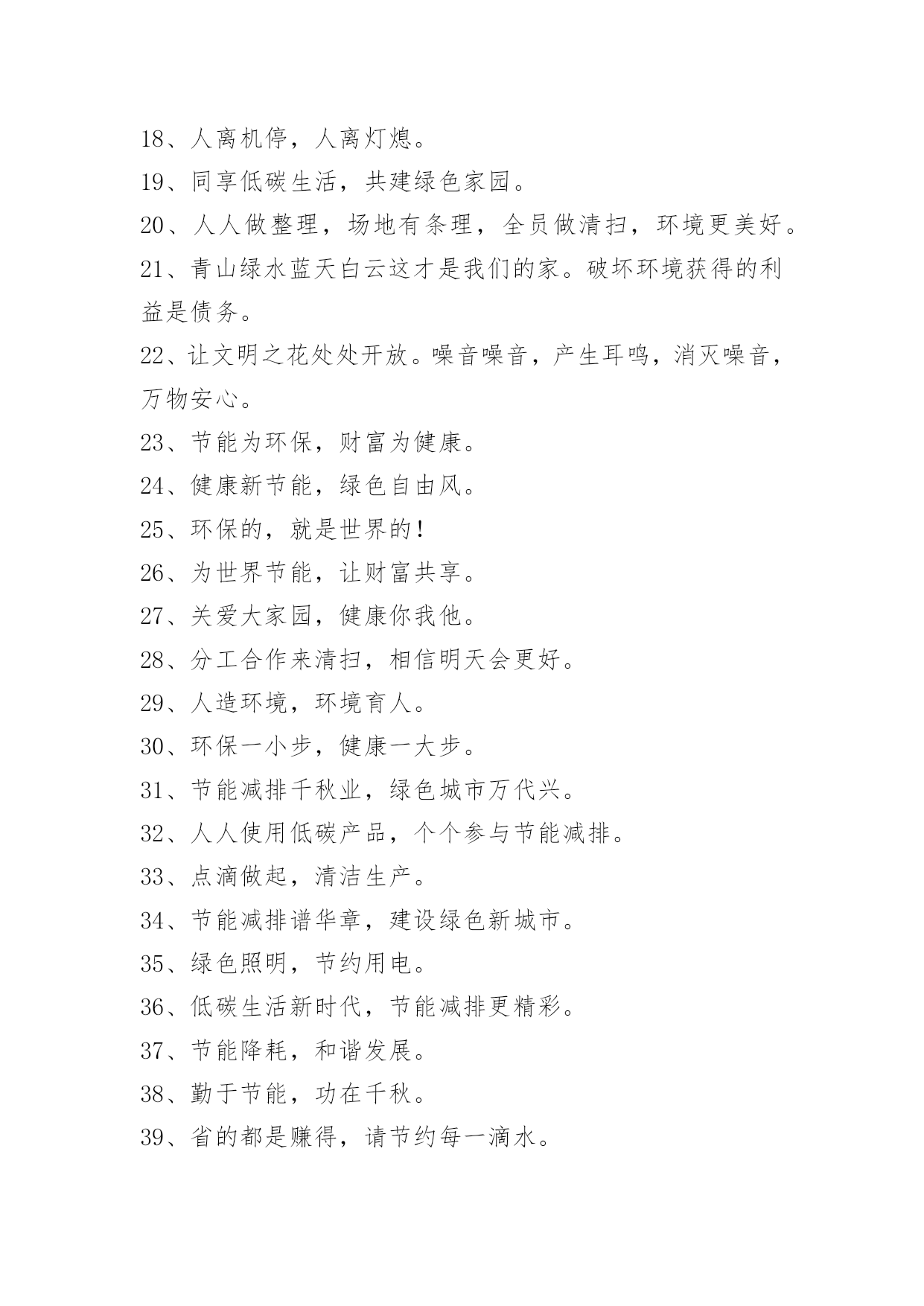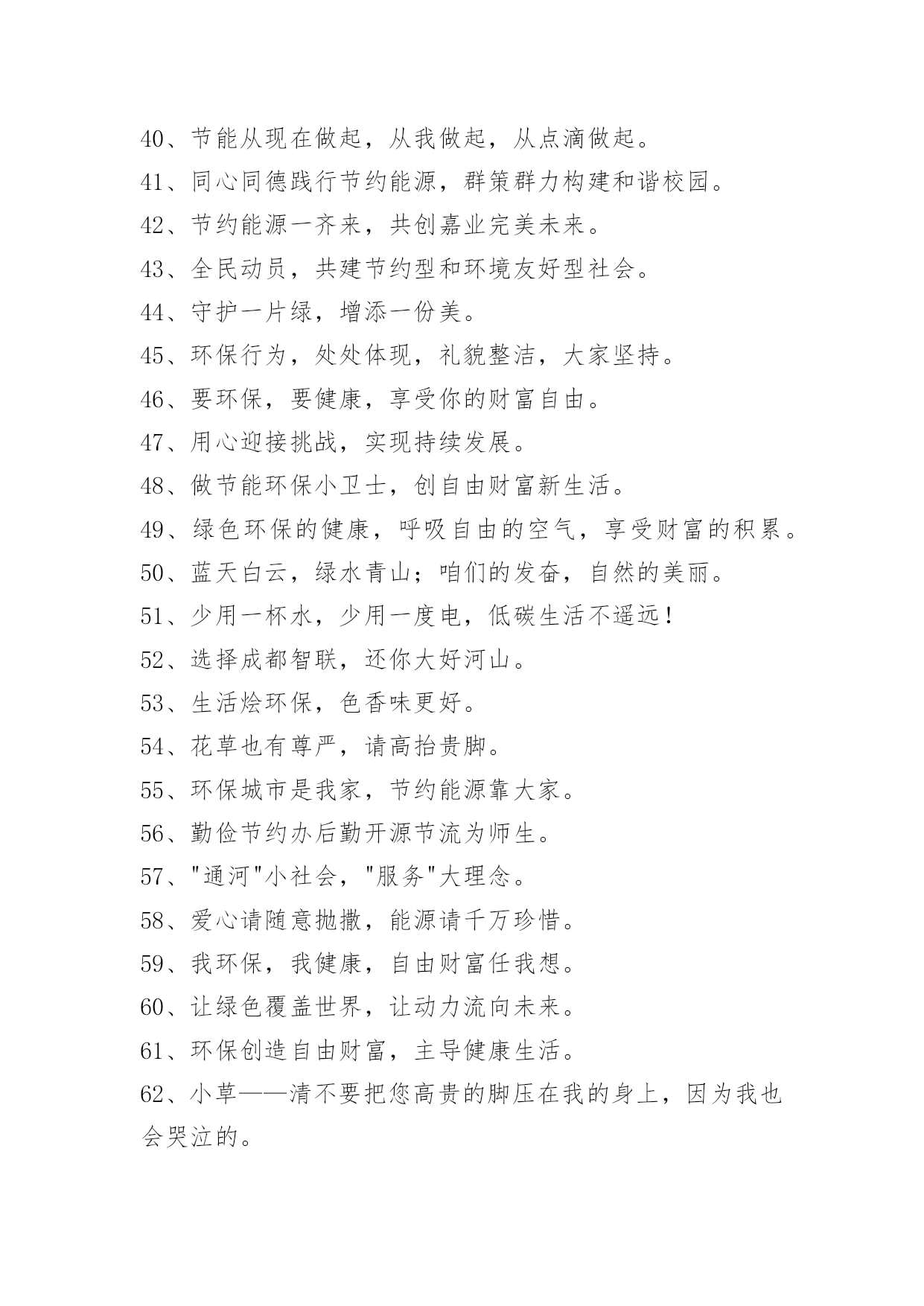 有特色的环保标语2020年有特色的环保标语汇总68句发展为要,环境优先。以下是小编精心整理的有特色的环保标语68句,欢迎大家阅读。1、节约促发展,节约出效益。2、发展绿色交通,共促节能减排。3、学校是我家,保护环境靠大家。校园是我家,卫生靠大家。4、环境靠你我他保护,美景由深圳人共赏。5、人人爱环保,校园更美好。6、绿色,是自然之美,是心灵之声,是人类的依靠。7、可爱小草有生命,人们践踏多可惜。8、请勿把垃圾扔入河内。9、选择佳艺,呵护您家。10、树立企业形象,协调人与自然。11、美好环境,源于力皇。12、节能环保缔造健康生活,健康生活成就财富自由。13、保护环境是每个公民应尽的责任。14、保护环境就是保护咱们自我。15、节约一度电,少排一份碳。16、低碳环保靠大家,绿色走进你我他。17、增强成本意识,同创企业效益。18、人离机停,人离灯熄。19、同享低碳生活,共建绿色家园。20、人人做整理,场地有条理,全员做清扫,环境更美好。21、青山绿水蓝天白云这才是我们的家。破坏环境获得的利益是债务。22、让文明之花处处开放。噪音噪音,产生耳鸣,消灭噪音,万物安心。23、节能为环保,财富为健康。24、健康新节能,绿色自由风。25、环保的,就是世界的!26、为世界节能,让财富共享。27、关爱大家园,健康你我他。28、分工合作来清扫,相信明天会更好。29、人造环境,环境育人。30、环保一小步,健康一大步。31、节能减排千秋业,绿色城市万代兴。32、人人使用低碳产品,个个参与节能减排。33、点滴做起,清洁生产。34、节能减排谱华章,建设绿色新城市。35、绿色照明,节约用电。36、低碳生活新时代,节能减排更精彩。37、节能降耗,和谐发展。38、勤于节能,功在千秋。39、省的都是赚得,请节约每一滴水。40、节能从现在做起,从我做起,从点滴做起。41、同心同德践行节约能源,群策群力构建和谐校园。42、节约能源一齐来,共创嘉业完美未来。43、全民动员,共建节约型和环境友好型社会。44、守护一片绿,增添一份美。45、环保行为,处处体现,礼貌整洁,大家坚持。46、要环保,要健康,享受你的财富自由。47、用心迎接挑战,实现持续发展。48、做节能环保小卫士,创自由财富新生活。49、绿色环保的健康,呼吸自由的空气,享受财富的积累。50、蓝天白云,绿水青山;咱们的发奋,自然的美丽。51、少用一杯水,少用一度电,低碳生活不遥远!52、选择成都智联,还你大好河山。53、生活烩环保,色香味更好。54、花草也有尊严,请高抬贵脚。55、环保城市是我家,节约能源靠大家。56、勤俭节约办后勤开源节流为师生。57、"通河"小社会,"服务"大理念。58、爱心请随意抛撒,能源请千万珍惜。59、我环保,我健康,自由财富任我想。60、让绿色覆盖世界,让动力流向未来。61、环保创造自由财富,主导健康生活。62、小草——清不要把您高贵的脚压在我的身上,因为我也会哭泣的。63、美丽山水,魅力文化,绿色韶关。64、南平生态是金,生态南平是福。65、"灰雾猛霾假仙境,碧水青山真人间。"66、我们需要和平更需要象征和平的绿色世界。67、禁燃禁烧禁炮仗,移风易俗好风尚。68、皇家民生需要,上海力皇环保。