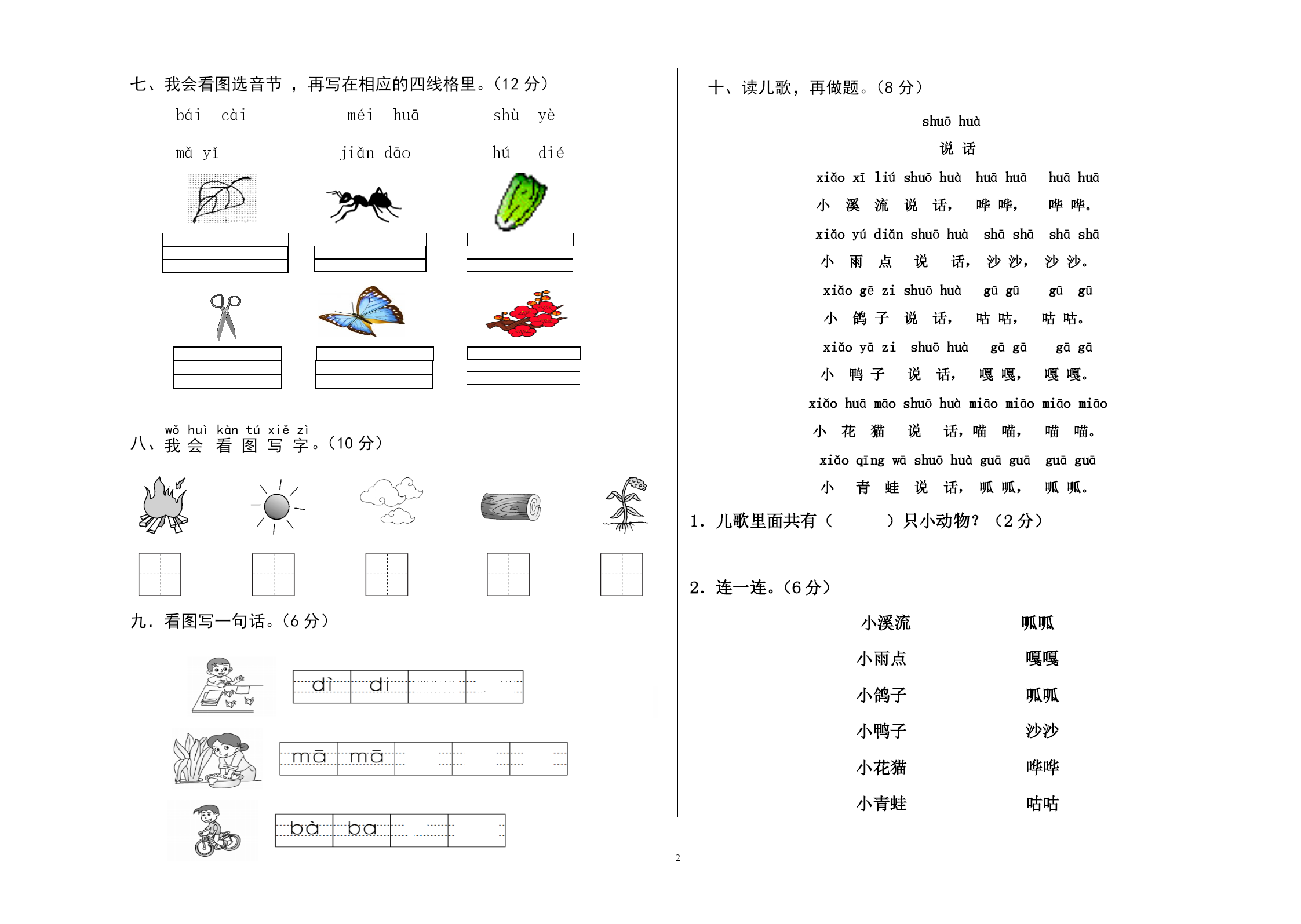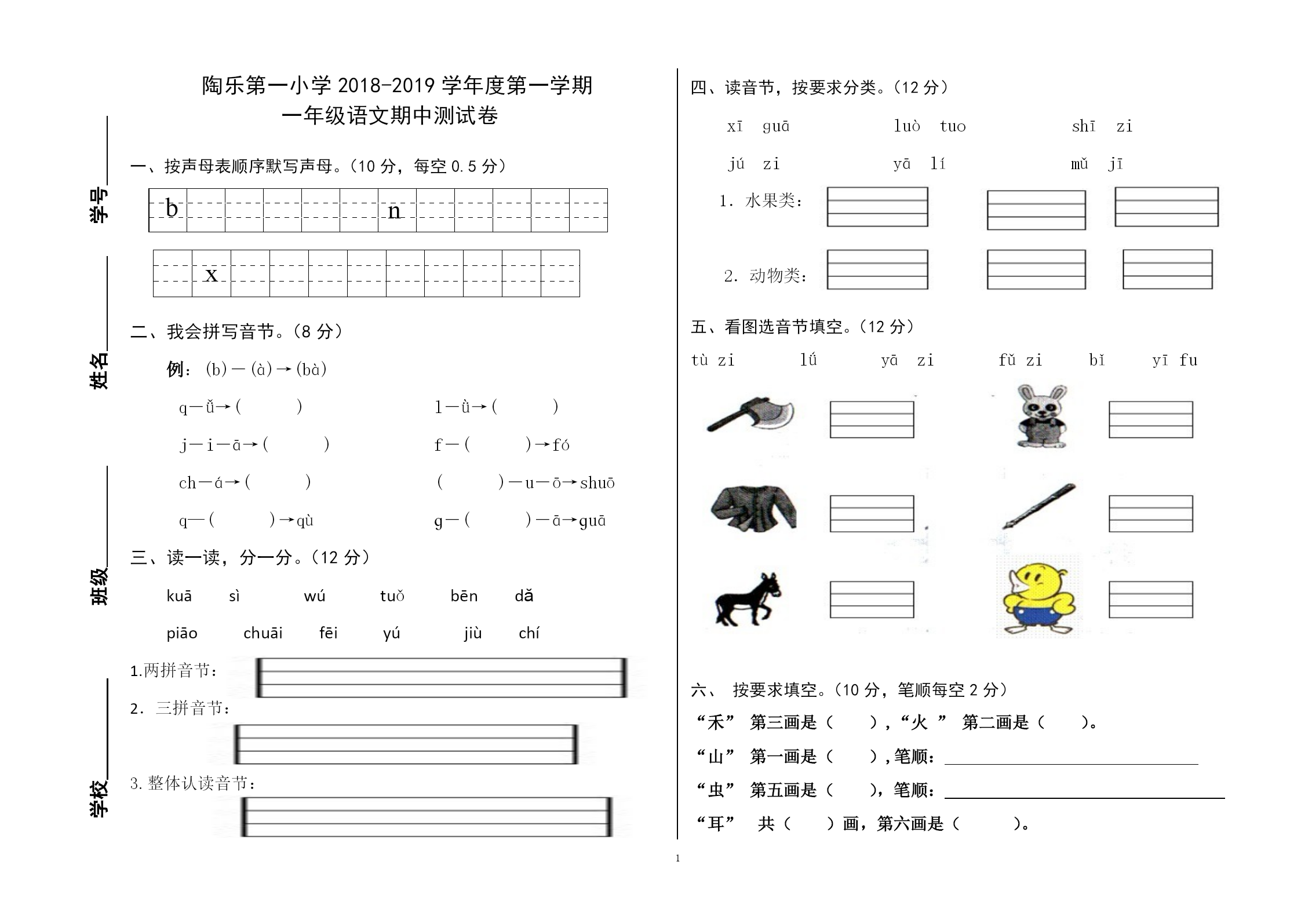 人教版精品文档-一年级语文期中测试卷(2018-2019学年第一学期)