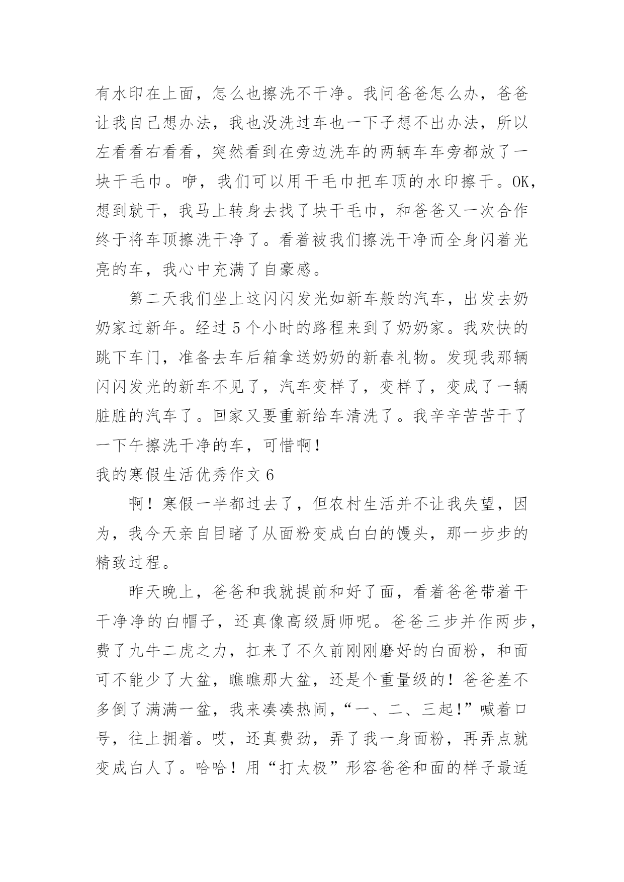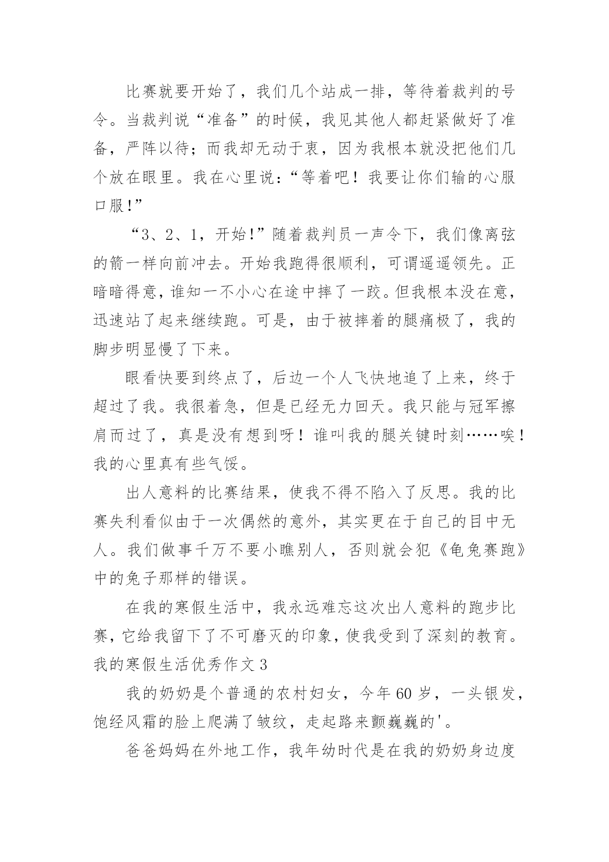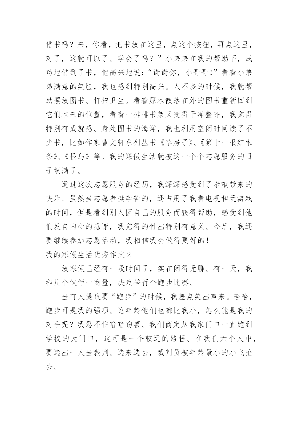 我的寒假生活优秀作文我的寒假生活优秀作文在我们平凡的日常里,大家都经常看到作文的身影吧,作文是人们把记忆中所存储的有关知识、经验和思想用书面形式表达出来的记叙方式。那么你知道一篇好的作文该怎么写吗?下面是小编精心整理的我的寒假生活优秀作文,希望对大家有所帮助。我的寒假生活优秀作文1时间过得真快,一转眼寒假就这么过去了。回想这一个月的寒假生活,我过得充实而有意义。其中,最让我难忘的是到图书馆做文化志愿者的时光。记得第一次去当志愿者那天,我和妈妈早早就出了门。一路上,妈妈都叮嘱我要听工作人员的安排,服从命令听指挥。我的心情忐忑不安,不知道自己能不能胜任志愿者的工作。到了图书馆,我被安排到儿童阅览室服务,主要负责帮不会借书还书的小朋友操作自助机、把散乱的图书分类摆放好,没人的时候还可以自己看看书。听了工作人员的介绍,我心里稍微有点底了。穿上了志愿者的蓝色小马甲,戴上了胸卡,我就正式“上岗”啦!我第一个提供帮助的是一个五六岁的小男孩。我看他手里拿着书在自助借书机前面走来走去,好像不知道怎么操作的样子。于是,我主动走上前去,说道:“小弟弟,你是想借书吗?来,你看,把书放在这里,点这个按钮,再点这里,对了,这就可以了。学会了吗?”小弟弟在我的帮助下,成功地借到了书,他高兴地说:“谢谢你,小哥哥!”看着小弟弟满意的笑脸,我也感到特别高兴。人不多的时候,我就帮助摆放图书、打扫卫生。看着原本散落在外的图书重新回到它们本来的位置,看着一排排书架又变得干净整齐,我觉得特别有成就感。身处图书的海洋,我也利用空闲时间读了不少书,比如作家曹文轩系列丛书《草房子》、《第十一根红木条》、《根鸟》等。我的寒假生活就被这一个个志愿服务的日子填满了。通过这次志愿服务的经历,我深深感受到了奉献带来的快乐。虽然当志愿者挺辛苦的,还占用了我看电视和玩游戏的时间,但是看到别人因自己的服务而获得帮助,感受到他们发自内心的感谢,我觉得的付出特别有意义。今后,我还要继续参加志愿活动,我相信我会做得更好的!我的寒假生活优秀作文2放寒假已经有一段时间了,实在闲得无聊。有一天,我和几个伙伴一商量,决定举行个跑步比赛。当有人提议要“跑步”的时候,我差点笑出声来。哈哈,跑步可是我的强项。论年龄他们也都比我小,怎么能是我的对手呢?我忍不住暗暗窃喜。我们商定从我家门口一直跑到学校的大门口,这可是一个较远的路程。在我们六个人中,要选出一人当裁判。选来选去,裁判员被年龄最小的小飞抢去。比赛就要开始了,我们几个站成一排,等待着裁判的号令。当裁判说“准备”的时候,我见其他人都赶紧做好了准备,严阵以待;而我却无动于衷,因为我根本就没把他们几个放在眼里。我在心里说:“等着吧!我要让你们输的心服口服!”“3、2、1,开始!”随着裁判员一声令下,我们像离弦的箭一样向前冲去。开始我跑得很顺利,可谓遥遥领先。正暗暗得意,谁知一不小心在途中摔了一跤。但我根本没在意,迅速站了起来继续跑。可是,由于被摔着的腿痛极了,我的脚步明显慢了下来。眼看快要到终点了,后边一个人飞快地追了上来,终于超过了我。我很着急,但是已经无力回天。我只能与冠军擦肩而过了,真是没有想到呀!谁叫我的腿关键时刻……唉!我的心里真有些气馁。出人意料的比赛结果,使我不得不陷入了反思。我的比赛失利看似由于一次偶然的意外,其实更在于自己的目中无人。我们做事千万不要小瞧别人,否则就会犯《龟兔赛跑》中的兔子那样的错误。在我的寒假生活中,我永远难忘这次出人意料的跑步比赛,它给我留下了不可磨灭的印象,使我受到了深刻的教育。我的寒假生活优秀作文3我的奶奶是个普通的农村妇女,今年60岁,一头银发,饱经风霜的脸上爬满了皱纹,走起路来颤巍巍的'。爸爸妈妈在外地工作,我年幼时代是在我的奶奶身边度过的。我的奶奶是那样的关心我,使我永远也忘不了。现在,我在爸爸妈妈身边读书,但每到寒假或是暑假,我都要回到我的奶奶的身边。去年寒假的一天,天阴沉沉的,寒风呼呼地刮着。早晨我衣服穿得少,不小心着了凉,中午就发起高烧来,躺在床上。我的家乡是个群山环抱的小山村,那里连个医疗站也没有,请医买药得到乡卫生院去。这可急坏了我的奶奶。她安慰我说:你先躺者,我去给你拔些草药来。我连忙说:我的奶奶,天这么冷,您就别去了吧!我的奶奶哪里肯听,蹒跚地向门外走去。过了好一阵子,门吱呀一声开了。我睁开眼睛,看到我的奶奶回来了。她那银发被山风吹得有些散乱,手里拿着一把青草药,一双黑色的布鞋沾满了黄泥,嘴里不断地咳嗽着。我激动得说不出话来。我的奶奶换了鞋,来到床前看了看我,便到厨房里熬药去了。一会儿,我的奶奶端进一碗草药汤,在床前坐下,扶起我,用充满柔情的声调说:丽冬,快吃药。我大口大口地喝了下去。虽然这药汤很苦,可是,此时我觉得一点儿也不苦。喝完药汤,我的奶奶又说:快躺下,出出汗就会好的。她一边说,一边让我