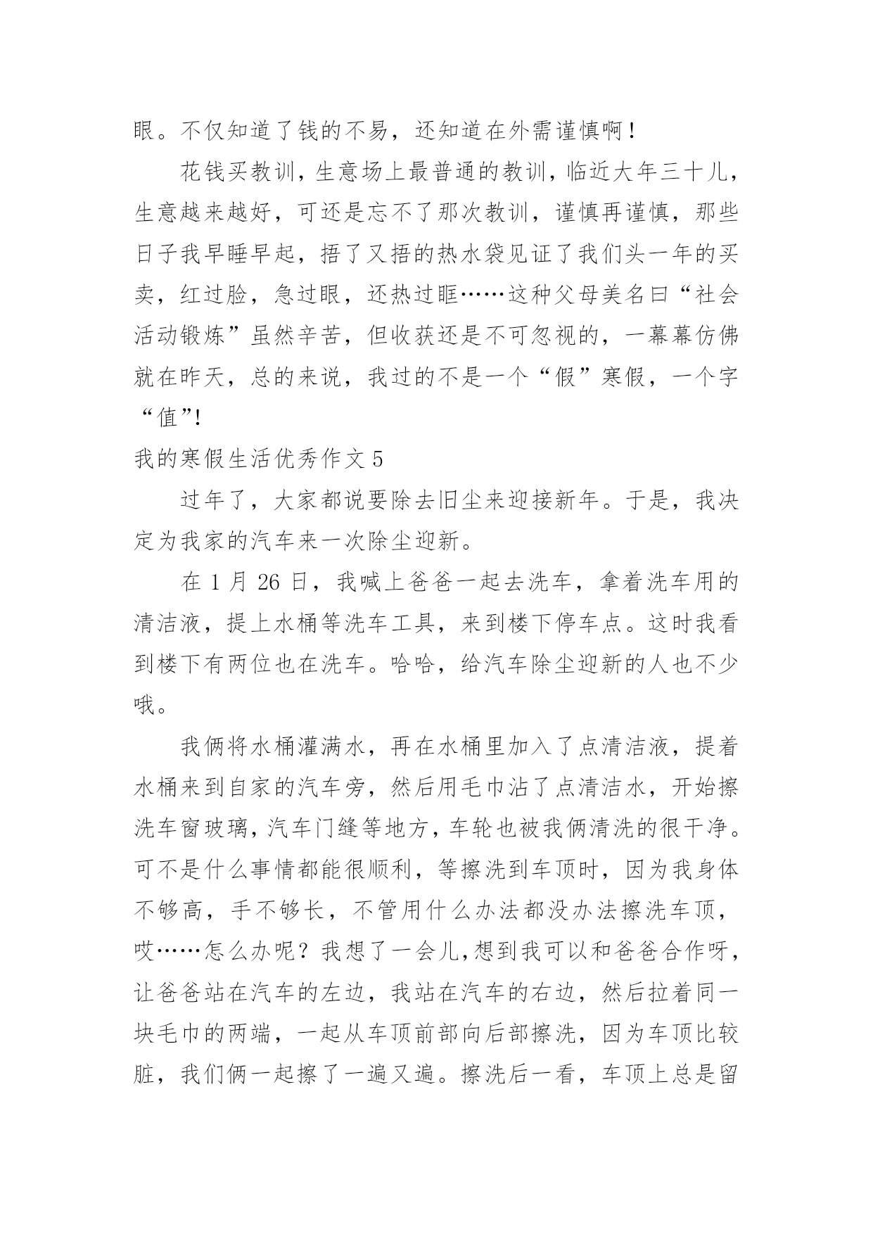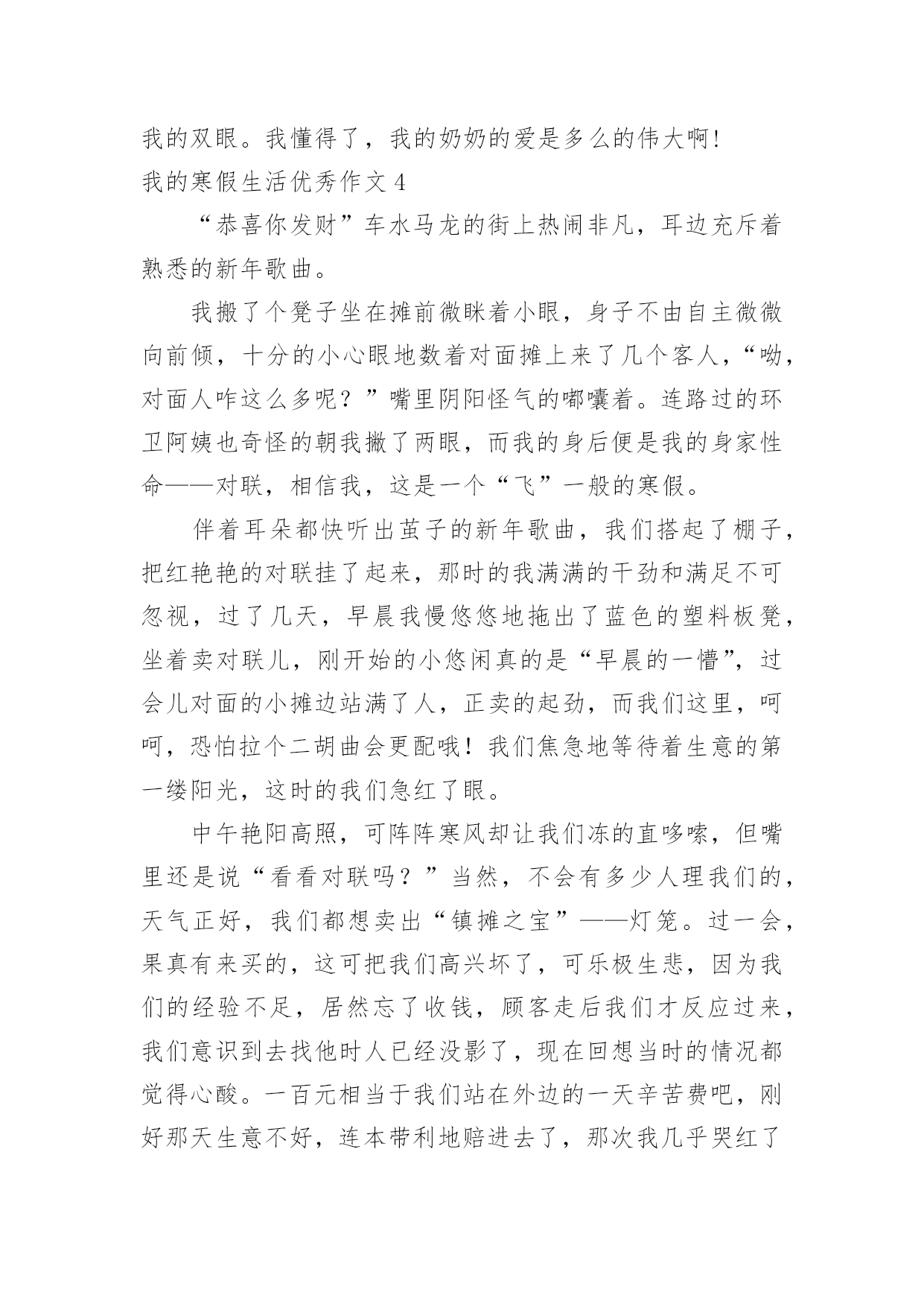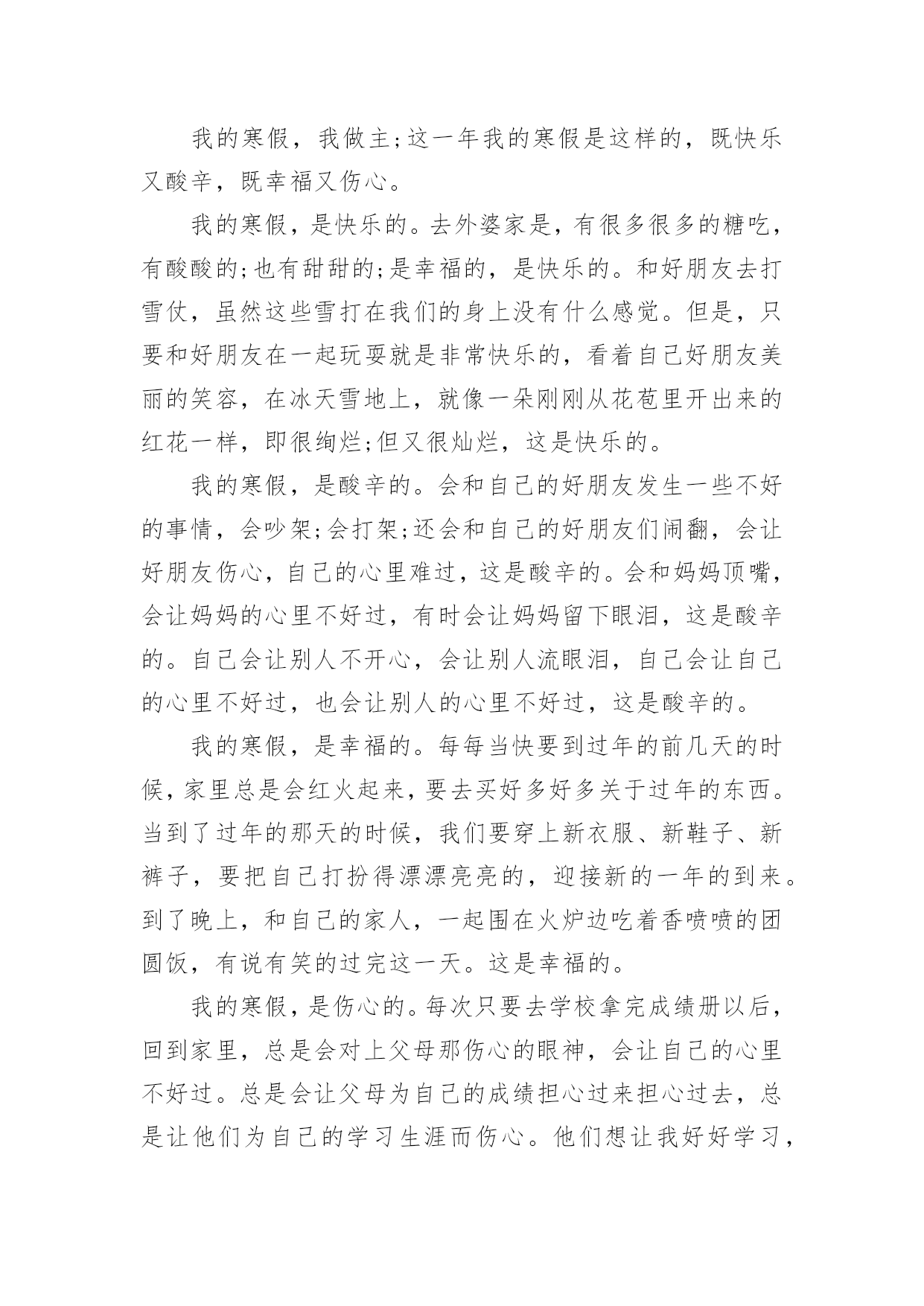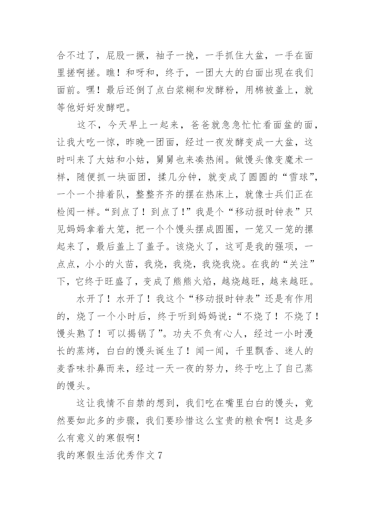 我的寒假生活优秀作文我的寒假生活优秀作文在我们平凡的日常里,大家都经常看到作文的身影吧,作文是人们把记忆中所存储的有关知识、经验和思想用书面形式表达出来的记叙方式。那么你知道一篇好的作文该怎么写吗?下面是小编精心整理的我的寒假生活优秀作文,希望对大家有所帮助。我的寒假生活优秀作文1时间过得真快,一转眼寒假就这么过去了。回想这一个月的寒假生活,我过得充实而有意义。其中,最让我难忘的是到图书馆做文化志愿者的时光。记得第一次去当志愿者那天,我和妈妈早早就出了门。一路上,妈妈都叮嘱我要听工作人员的安排,服从命令听指挥。我的心情忐忑不安,不知道自己能不能胜任志愿者的工作。到了图书馆,我被安排到儿童阅览室服务,主要负责帮不会借书还书的小朋友操作自助机、把散乱的图书分类摆放好,没人的时候还可以自己看看书。听了工作人员的介绍,我心里稍微有点底了。穿上了志愿者的蓝色小马甲,戴上了胸卡,我就正式“上岗”啦!我第一个提供帮助的是一个五六岁的小男孩。我看他手里拿着书在自助借书机前面走来走去,好像不知道怎么操作的样子。于是,我主动走上前去,说道:“小弟弟,你是想借书吗?来,你看,把书放在这里,点这个按钮,再点这里,对了,这就可以了。学会了吗?”小弟弟在我的帮助下,成功地借到了书,他高兴地说:“谢谢你,小哥哥!”看着小弟弟满意的笑脸,我也感到特别高兴。人不多的时候,我就帮助摆放图书、打扫卫生。看着原本散落在外的图书重新回到它们本来的位置,看着一排排书架又变得干净整齐,我觉得特别有成就感。身处图书的海洋,我也利用空闲时间读了不少书,比如作家曹文轩系列丛书《草房子》、《第十一根红木条》、《根鸟》等。我的寒假生活就被这一个个志愿服务的日子填满了。通过这次志愿服务的经历,我深深感受到了奉献带来的快乐。虽然当志愿者挺辛苦的,还占用了我看电视和玩游戏的时间,但是看到别人因自己的服务而获得帮助,感受到他们发自内心的感谢,我觉得的付出特别有意义。今后,我还要继续参加志愿活动,我相信我会做得更好的!我的寒假生活优秀作文2放寒假已经有一段时间了,实在闲得无聊。有一天,我和几个伙伴一商量,决定举行个跑步比赛。当有人提议要“跑步”的时候,我差点笑出声来。哈哈,跑步可是我的强项。论年龄他们也都比我小,怎么能是我的对手呢?我忍不住暗暗窃喜。我们商定从我家门口一直跑到学校的大门口,这可是一个较远的路程。在我们六个人中,要选出一人当裁判。选来选去,裁判员被年龄最小的小飞抢去。比赛就要开始了,我们几个站成一排,等待着裁判的号令。当裁判说“准备”的时候,我见其他人都赶紧做好了准备,严阵以待;而我却无动于衷,因为我根本就没把他们几个放在眼里。我在心里说:“等着吧!我要让你们输的心服口服!”“3、2、1,开始!”随着裁判员一声令下,我们像离弦的箭一样向前冲去。开始我跑得很顺利,可谓遥遥领先。正暗暗得意,谁知一不小心在途中摔了一跤。但我根本没在意,迅速站了起来继续跑。可是,由于被摔着的腿痛极了,我的脚步明显慢了下来。眼看快要到终点了,后边一个人飞快地追了上来,终于超过了我。我很着急,但是已经无力回天。我只能与冠军擦肩而过了,真是没有想到呀!谁叫我的腿关键时刻……唉!我的心里真有些气馁。出人意料的比赛结果,使我不得不陷入了反思。我的比赛失利看似由于一次偶然的意外,其实更在于自己的目中无人。我们做事千万不要小瞧别人,否则就会犯《龟兔赛跑》中的兔子那样的错误。在我的寒假生活中,我永远难忘这次出人意料的跑步比赛,它给我留下了不可磨灭的印象,使我受到了深刻的教育。我的寒假生活优秀作文3我的奶奶是个普通的农村妇女,今年60岁,一头银发,饱经风霜的脸上爬满了皱纹,走起路来颤巍巍的'。爸爸妈妈在外地工作,我年幼时代是在我的奶奶身边度过的。我的奶奶是那样的关心我,使我永远也忘不了。现在,我在爸爸妈妈身边读书,但每到寒假或是暑假,我都要回到我的奶奶的身边。去年寒假的一天,天阴沉沉的,寒风呼呼地刮着。早晨我衣服穿得少,不小心着了凉,中午就发起高烧来,躺在床上。我的家乡是个群山环抱的小山村,那里连个医疗站也没有,请医买药得到乡卫生院去。这可急坏了我的奶奶。她安慰我说:你先躺者,我去给你拔些草药来。我连忙说:我的奶奶,天这么冷,您就别去了吧!我的奶奶哪里肯听,蹒跚地向门外走去。过了好一阵子,门吱呀一声开了。我睁开眼睛,看到我的奶奶回来了。她那银发被山风吹得有些散乱,手里拿着一把青草药,一双黑色的布鞋沾满了黄泥,嘴里不断地咳嗽着。我激动得说不出话来。我的奶奶换了鞋,来到床前看了看我,便到厨房里熬药去了。一会儿,我的奶奶端进一碗草药汤,在床前坐下,扶起我,用充满柔情的声调说:丽冬,快吃药。我大口大口地喝了下去。虽然这药汤很苦,可是,此时我觉得一点儿也不苦。喝完药汤,我的奶奶又说:快躺下,出出汗就会好的。她一边说,一边让我