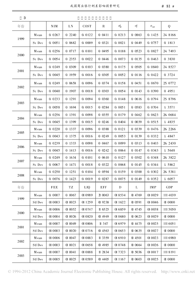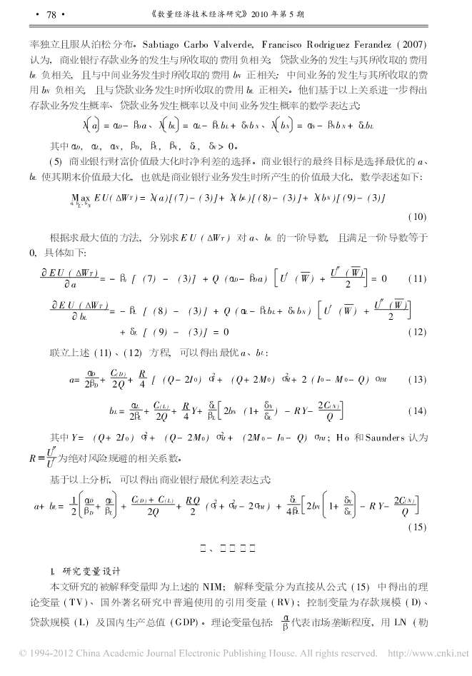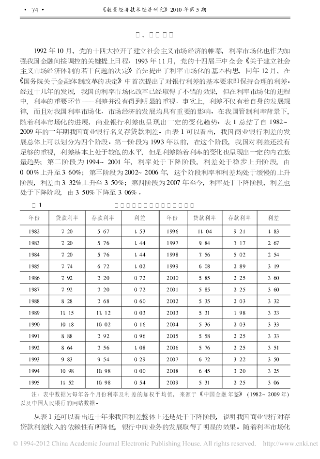 我国商业银行利差影响因素研究73我国商业银行利差影响因素研究程茂勇赵红(西安交通大学管理学院)摘要本文首先分析了我国商业银行利差的发展历程,然后在做市商模型的基础上引入中间业务变量,对银行利差的影响因素进行综合理论分析。在此基础上引入数学表达式中未出现但应考虑的变量建立综合的回归模型,并运用我国上市商业银行数据进行实证研究。研究发现,无论静态回归还是动态回归中,银行的市场垄断程度、运营成本对利差的影响程度都是最大的,并且均显著;中间业务中的佣金与手续费收益对利差有显著的负相关作用;动态回归分析亦显示,利差与上一期的利差也有显著的正相关关系。关键词商业银行利差中间业务决定因素中图分类号F83033文献标识码ATheResearchonTheDeterminantsofInterestSpreadofChinasCommercialBanksAbstract:Firstly,weanalyzethedevelopmentoftheinterestspreadofChinascommercialbanks,andthenmarketmakermodelisaugmentedherewithnontraditionalactivitiesvariablestomakeacomprehensivetheoreticalanalysisforthedeterminantsofinterestspreadBasedonthetheoreticalanalysis,thestudyin-troducesthevariablesthatshouldbeconsideredbuthasntappearedinthemathe-maticalmodel,andthenestablishesacomprehensiveregressionmodelMoreover,theempiricalresearchisconductedbasedontherelevantdataofChinaslistedcom-mercialbanksThestaticanddynamicmodelsinvolvedbothsuggestthatthemarketmonopolydegreeandoperatingcostsarethemostfundamentalfactorsthatinflu-encetheinterestspreadsignificantly;Theincomefromfeesandcommissionsinthenontraditionalactivitieshassignificantlynegativeeffectontheinterestspread;ThedynamicregressiondocumentstheevidencethattheinterestspreadandthatintheprecedingperiodshowsignificantlypositiverelationshipKeywords:CommercialBank;InterestSpread;NontraditionalActivities;Determinants74数量经济技术经济研究2010年第5期一、研究背景1992年10月,党的十四大拉开了建立社会主义市场经济的帷幕,利率市场化也作为加强我国金融间接调控的关键提上日程。1993年11月,党的十四届三中全会关于建立社会主义市场经济体制的若干问题的决定首先提出了利率市场化的基本构思,同年12月,在国务院关于金融体制改革的决定中首次提出了对银行利差的基本要求即保持合理的利差。经过十几年的发展,我国的利率市场化改革已经取得了不错的效果,但在利率市场化的进程中,利率的重要环节利差并没有得到明显的重视。事实上,利差不仅有着自身的发展规律,而且对我国利率市场化、市场经济的发展均具有重要的影响。在我国管制利率背景下,随着利率市场化的进展,商业银行利差也呈现出一定的变化趋势。表1总结了自1982~2009年的一年期我国商业银行名义存贷款利差。由表1可以看出,我国商业银行利差的发展总体上可以划分为四个阶段。第一阶段为1993年以前,在这个阶段,我国对利差还没有足够的重视,利差基本上处于较低的水平,但是利差随着利率的变化也呈现出一定的内在数量趋势;第二阶段为1994~2001年,利率处于下降阶段,利差处于稳步上升阶段,由000%上升至360%;第三阶段为2002~2006年,这个阶段利率和利差均处于缓慢的上升阶段,利差由332%上升至350%