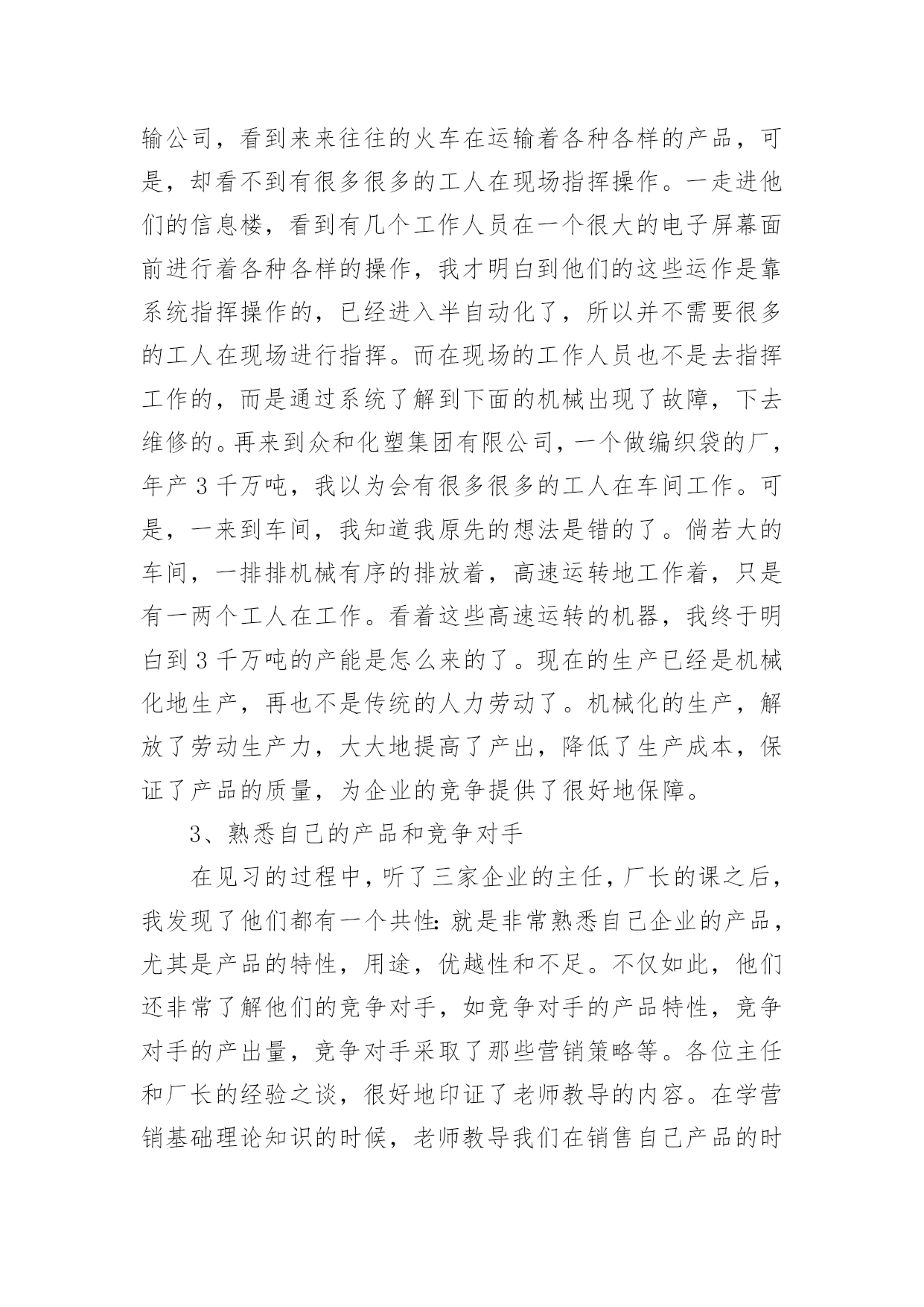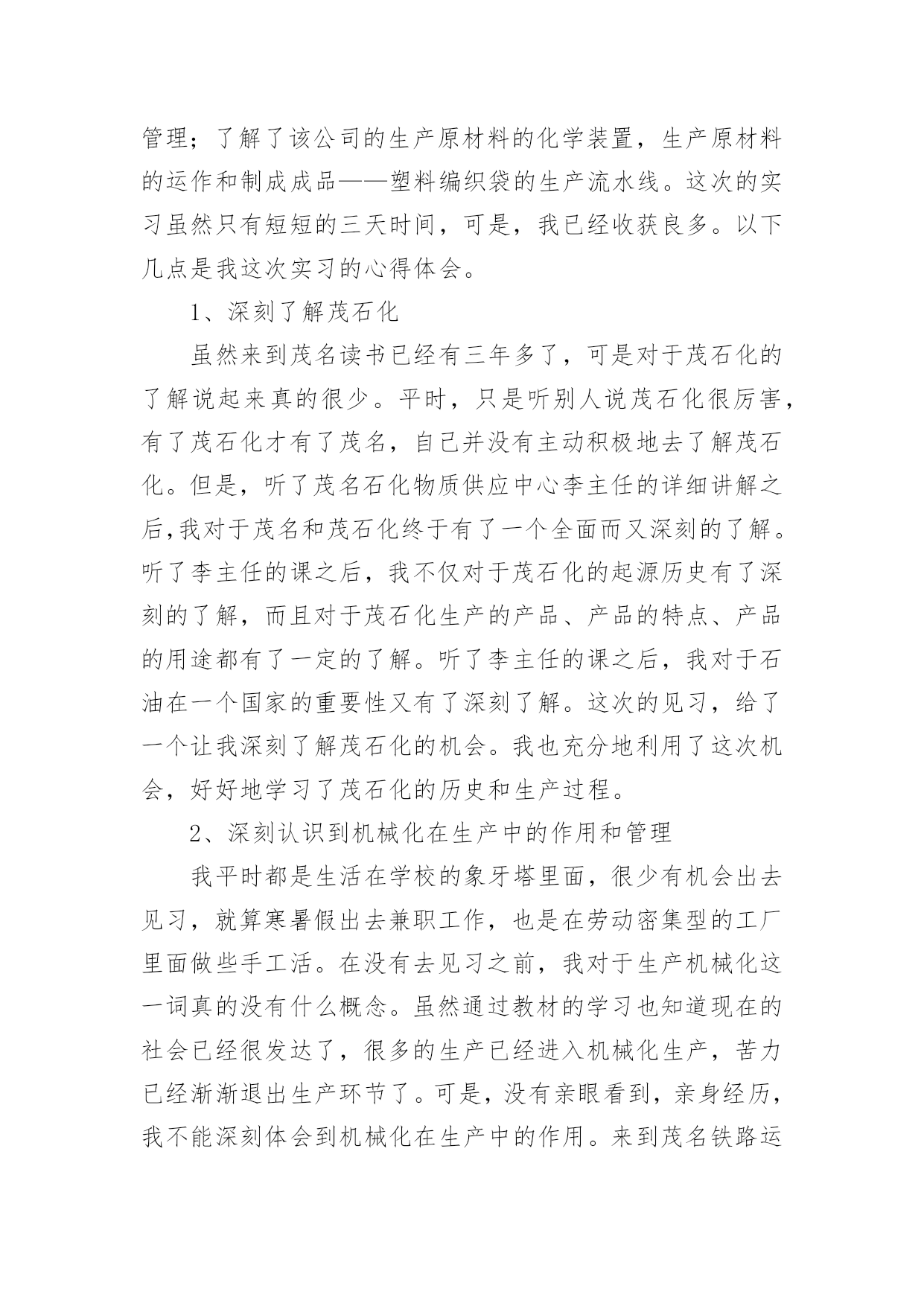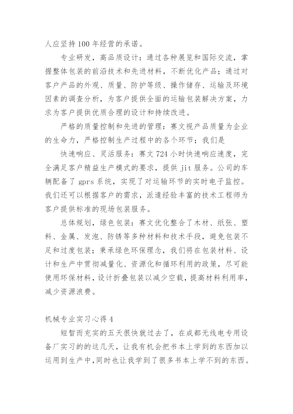 机械专业实习心得机械专业实习心得15篇我们得到了一些心得体会以后,应该马上记录下来,写一篇心得体会,从而不断地丰富我们的思想。但是心得体会有什么要求呢?以下是小编为大家收集的机械专业实习心得,欢迎阅读,希望大家能够喜欢。机械专业实习心得1俗话说:纸上得来终觉浅,欲知此事需躬行。虽然我们学习有关市场营销专业的基础理论知识已经两年多了,但是我们还不怎么了解一个企业是怎样进行营销工作,怎样进行生产的。通过学校组织我们到茂名铁路运输公司,茂名石化物质供应中心,众和化塑集团有限公司等三家企业进行实地考察,参观,听取企业工作人员讲课,学习讨论,我不仅开拓了我的视野,而且还认识了市场营销专业知识在实际工作中的作用。本次实习的过程是这样的:20xx年7月4日,学校组织我们到茂名铁路运输公司进行了参观和学习。20xx年7月5日,学校组织我们到茂名石化物质供应中心进行了实地考察和听取该公司的李主任讲课。通过本次的实习,我了解了铁路运输公司的运输系统及操作和日常工作和管理的情况;了解了茂名石化的原材料是怎样供应,怎样采购,怎样储存和管理;了解了该公司的生产原材料的化学装置,生产原材料的运作和制成成品——塑料编织袋的生产流水线。这次的实习虽然只有短短的三天时间,可是,我已经收获良多。以下几点是我这次实习的心得体会。1、深刻了解茂石化虽然来到茂名读书已经有三年多了,可是对于茂石化的了解说起来真的很少。平时,只是听别人说茂石化很厉害,有了茂石化才有了茂名,自己并没有主动积极地去了解茂石化。但是,听了茂名石化物质供应中心李主任的详细讲解之后,我对于茂名和茂石化终于有了一个全面而又深刻的了解。听了李主任的课之后,我不仅对于茂石化的起源历史有了深刻的了解,而且对于茂石化生产的产品、产品的特点、产品的用途都有了一定的了解。听了李主任的课之后,我对于石油在一个国家的重要性又有了深刻了解。这次的见习,给了一个让我深刻了解茂石化的机会。我也充分地利用了这次机会,好好地学习了茂石化的历史和生产过程。2、深刻认识到机械化在生产中的作用和管理我平时都是生活在学校的象牙塔里面,很少有机会出去见习,就算寒暑假出去兼职工作,也是在劳动密集型的工厂里面做些手工活。在没有去见习之前,我对于生产机械化这一词真的没有什么概念。虽然通过教材的学习也知道现在的社会已经很发达了,很多的生产已经进入机械化生产,苦力已经渐渐退出生产环节了。可是,没有亲眼看到,亲身经历,我不能深刻体会到机械化在生产中的作用。来到茂名铁路运输公司,看到来来往往的火车在运输着各种各样的产品,可是,却看不到有很多很多的工人在现场指挥操作。一走进他们的信息楼,看到有几个工作人员在一个很大的电子屏幕面前进行着各种各样的操作,我才明白到他们的这些运作是靠系统指挥操作的,已经进入半自动化了,所以并不需要很多的工人在现场进行指挥。而在现场的工作人员也不是去指挥工作的,而是通过系统了解到下面的机械出现了故障,下去维修的。再来到众和化塑集团有限公司,一个做编织袋的厂,年产3千万吨,我以为会有很多很多的工人在车间工作。可是,一来到车间,我知道我原先的想法是错的了。倘若大的车间,一排排机械有序的排放着,高速运转地工作着,只是有一两个工人在工作。看着这些高速运转的机器,我终于明白到3千万吨的产能是怎么来的了。现在的生产已经是机械化地生产,再也不是传统的人力劳动了。机械化的生产,解放了劳动生产力,大大地提高了产出,降低了生产成本,保证了产品的质量,为企业的竞争提供了很好地保障。3、熟悉自己的产品和竞争对手在见习的过程中,听了三家企业的主任,厂长的课之后,我发现了他们都有一个共性:就是非常熟悉自己企业的产品,尤其是产品的特性,用途,优越性和不足。不仅如此,他们还非常了解他们的竞争对手,如竞争对手的产品特性,竞争对手的产出量,竞争对手采取了那些营销策略等。各位主任和厂长的经验之谈,很好地印证了老师教导的内容。在学营销基础理论知识的时候,老师教导我们在销售自己产品的时候,我们要非常熟悉产品的特性才能把产品很好地销售出去;在销售产品的时候,我们要宣传产品的优越性从而吸引顾客的眼球;在制定营销策略的时候,我们还要关注竞争对手的营销策略。。。。。。我想理论与实践就是这样相结合的吧。这也是我们常说的:知己知彼,百战不殆。4、质量保证贯彻到实际生产中在学习理论知识的时候,我们都知道也经常强调产品要保证质量才能销售出去,才能提高消费者满意度,可是,我们并不了解在生产过程中到底要怎样才能保证质量。在这次是实习过程中,我学习到众和化塑集团有限公司是这样做的。首先,引进先进的生产设备从而保证质量。众和化塑集团有限公司的生产设备都是非常先进的,这为他们的产品质量提供了保障。其次,建立质量方针政策,在车间的墙上挂上牌子,牌子的内容是这样的——公司质量方针:质量为本,