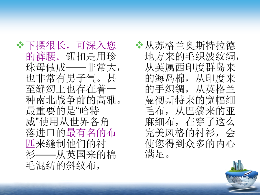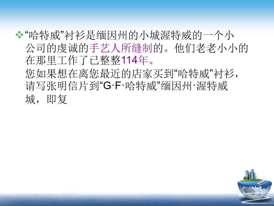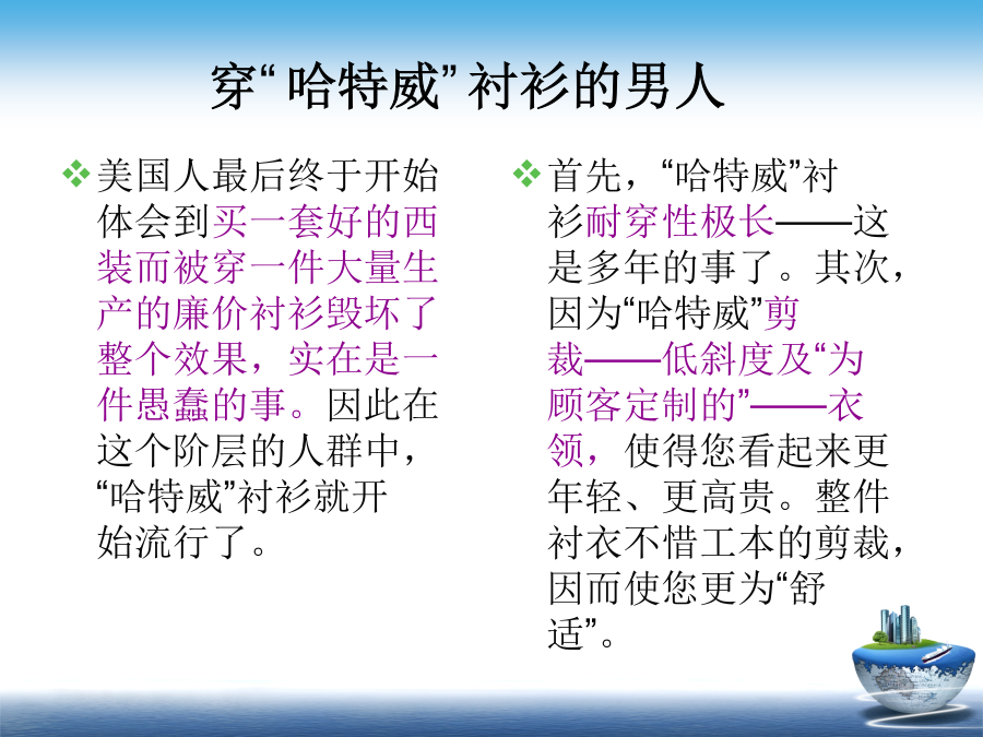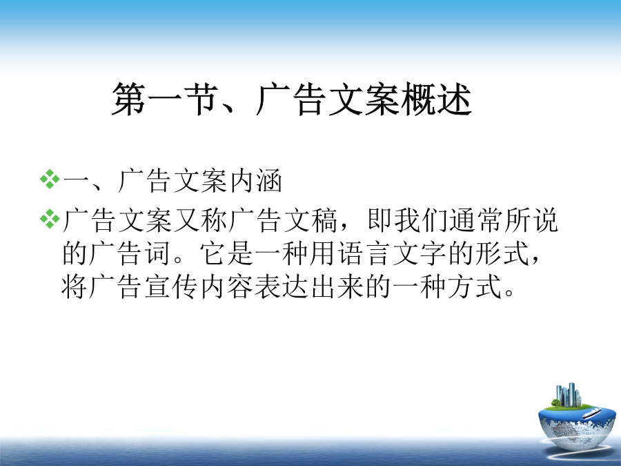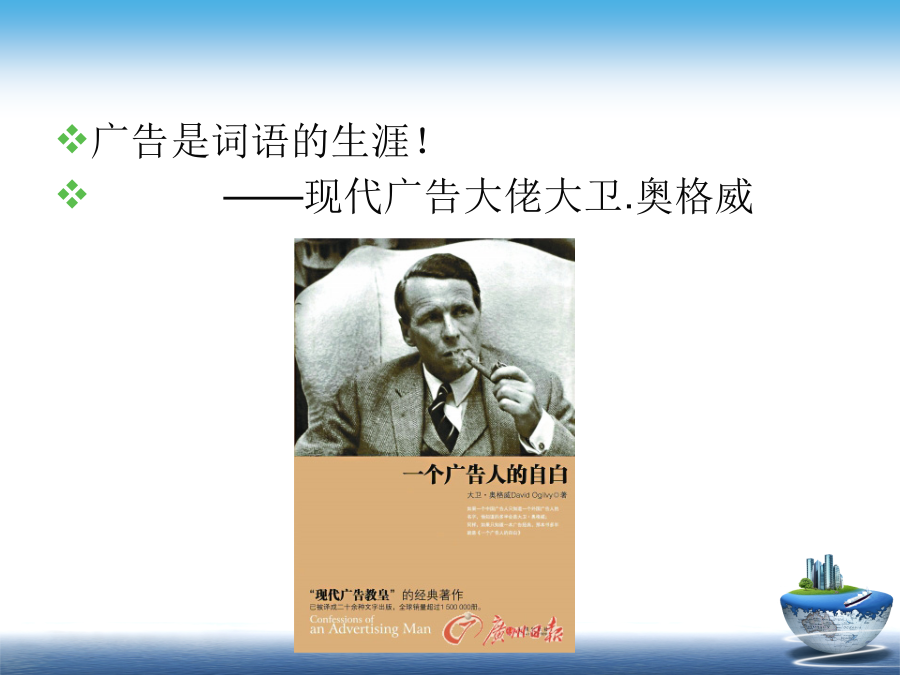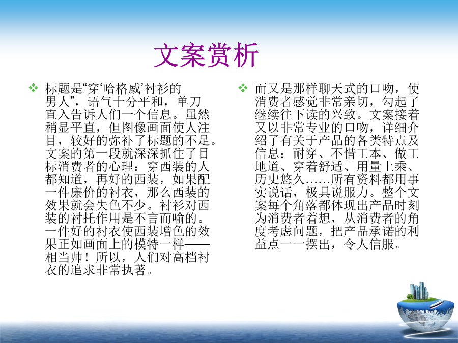 第六章、广告文案本讲内容:1、广告文案概述2、广告文案的结构安排3、广告语言创作一、广告文案内涵广告文案又称广告文稿,即我们通常所说的广告词。它是一种用语言文字的形式,将广告宣传内容表达出来的一种方式。广告是词语的生涯!——现代广告大佬大卫.奥格威穿“哈特威”衬衫的男人下摆很长,可深入您的裤腰。钮扣是用珍珠母做成——非常大,也非常有男子气。甚至缝纫上也存在着一种南北战争前的高雅。最重要的是“哈特威”使用从世界各角落进口的最有名的布匹来缝制他们的衬衫——从英国来的棉毛混纺的斜纹布,“哈特威”衬衫是缅因州的小城渥特威的一个小公司的虔诚的手艺人所缝制的。他们老老小小的在那里工作了已整整114年。您如果想在离您最近的店家买到“哈特威”衬衫,请写张明信片到“G·F·哈特威”缅因州·渥特威城,即复文案赏析广告赏析讨论:如何为这则李维斯衬衫的广告配置文案?知识点补充:Levi's(李维斯)是来自美国西部最闻名的名字之一。1853年犹太青年商人LeviStrauss(李维·史特劳斯)为处理积压的帆布试着做了一批低腰、直筒、臀围紧小的裤子,卖给旧金山的淘金工人。由于这种裤子比棉布裤更结实耐磨而大受欢迎。于是,李维索性开了一家专门生产帆布工装裤的公司,并以自己的名字“Levi's”作为品牌,Levi's(李维斯)的神话也由此展开。思考:你印象中最深的广告语是什么?回想一下为什么记住了它?品味这么一则手镯的广告语:没有人能够锁住我,但我多么希望能够!力波啤酒广告文案:“上海是我长大成人的所在/带着我所有的情怀/第一次乾杯,头一回恋爱/在永远的纯真年代/追过港台同胞,迷上过老外/自己当明星,感觉也不坏/成功的滋味,自己最明白/旧的不去,新的不来/城市的高度,它越变越快/有人出去,有人回来/身边的朋友越穿越新派/上海让我越看越爱/好日子,好时代/我在上海,力波也在。”(该影视广告的广告歌词)力波啤酒“喜欢”上海的理由二、广告文案的作用1、传达广告信息2、表达广告创意3、传递广告画面内涵4、塑造品牌和企业形象芝华士活出骑士风范一怀肝胆见赤诚生逢知己可遇不可求,相知如镜更难能可贵。真正的知己犹如杯中香茗,甘绵醇厚,回味悠长。穿行在纷繁复乱的红尘中,生活在生硬冰冷的城市森林里,真正的肝胆好友落地即兄弟,不求赴汤蹈火,两肋插刀,但求掬捧一片真心,风雨同舟,患难与共,双手紧握,超越世俗间的距离。志趣相投,真性真情,情义之深有如手足,千杯万盏只为共谱一曲高山流水!一片冰心在玉壶荣耀、光环、名望,纸醉金迷的世界,光怪陆离的城市,让你眼花缭乱,喧嚣取代了内心的平静,嘈杂掩盖了真我的呼唤。其实,每个人都在探寻内心的声音,而你,是否也在这条路上跌跌撞撞?坚持心中所想,不为世俗所动,在这唯我主义的时代,有一条迥然不同的路。“大隐隐于市”,才是智者之道。面对现实的纷繁复乱,只淡然一笑,坚守自己的原则,留取一片冰心,换得心灵的澄净。光明磊落,成就非凡,这就是对当代骑士风范的最好诠释。三、广告文案的要求云南白药2、简明精炼,言简意赅3、生动形象,表明创意4、动听流畅,上口易记双喜第二节、广告文案的构成[案例]一个完整的广告文案案例:P154北京现代汽车广告标题案例:P156世界摔角WWE告知广告“不是硬汉不要来!”副标题作为一种设计元素,标题所占的整个空间通常不宜超过整个广告空间的10%~15%广告标题的结构类型:单一型:由一个独立的句子构成的广告标题。特点:单刀直入、简洁明了。例子:P156女鞋广告复合型:由两个或两个以上独立的句子构成广告标题。特点:逻辑关联、相互补充引题:出现在正题之前的引题,又称为肩题或眉题,主要用来交代背景及烘托气氛的。正题:作为母题或主标是用来传导商品信息的主体部分。副题:作为辅题或子题是用来补充说明正题的。(1)引题+正题+副题优点:可以更为详尽、更加全面地阐释商品广告的功能诉求和情感魅力案例:P157汇丰银行广告(2)引题+正题目的是为了通过引题将商品的使用背景和特定场合进行渲染,以便为主题凸显铺平道路。案例:P157哇塞!麦当劳披萨(3)正题+副题优点:可以有效地突出广告画面中的视觉语言和沟通效果。39主标题:想叫“老鼠’’变飞机吗?副标题:网络快车ADSL——高速上网,翱翔网络正文:无论视频点播、网络游戏、远程教育还是实时炒股……网络快车ADSL都将令你梦想——成真。“独享宽带":线路专用,不受用户增加影响。飞一般速度,最高可达8Mbps。“安装简易":“一线多用”:,特别适合中小型公司,上网发烧友及家庭用户。(二)广告标题的表现形式1、新闻性标题人们在阅读广告时,往往希望能从中获取新的商品信息或市场信息,而这类标题正是迎合消费者这种心理。海内存知己天涯若比邻