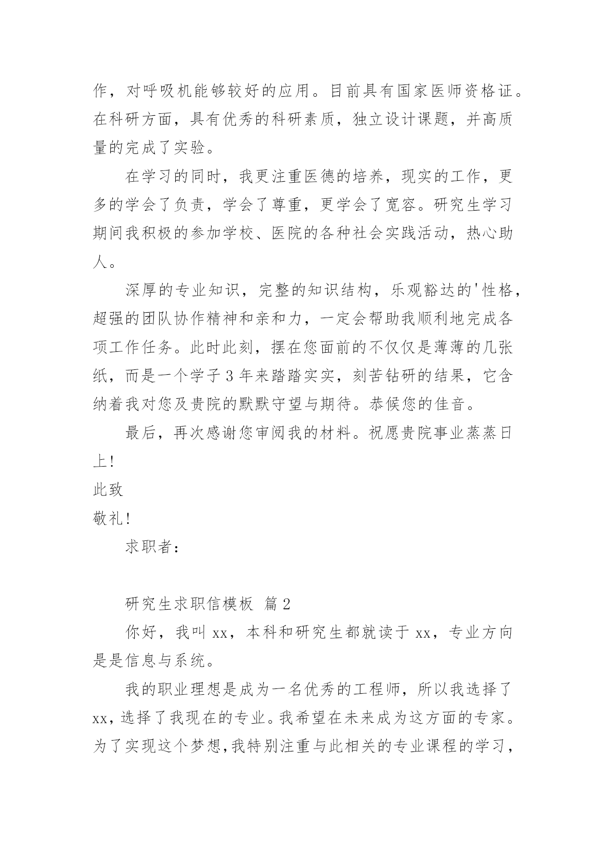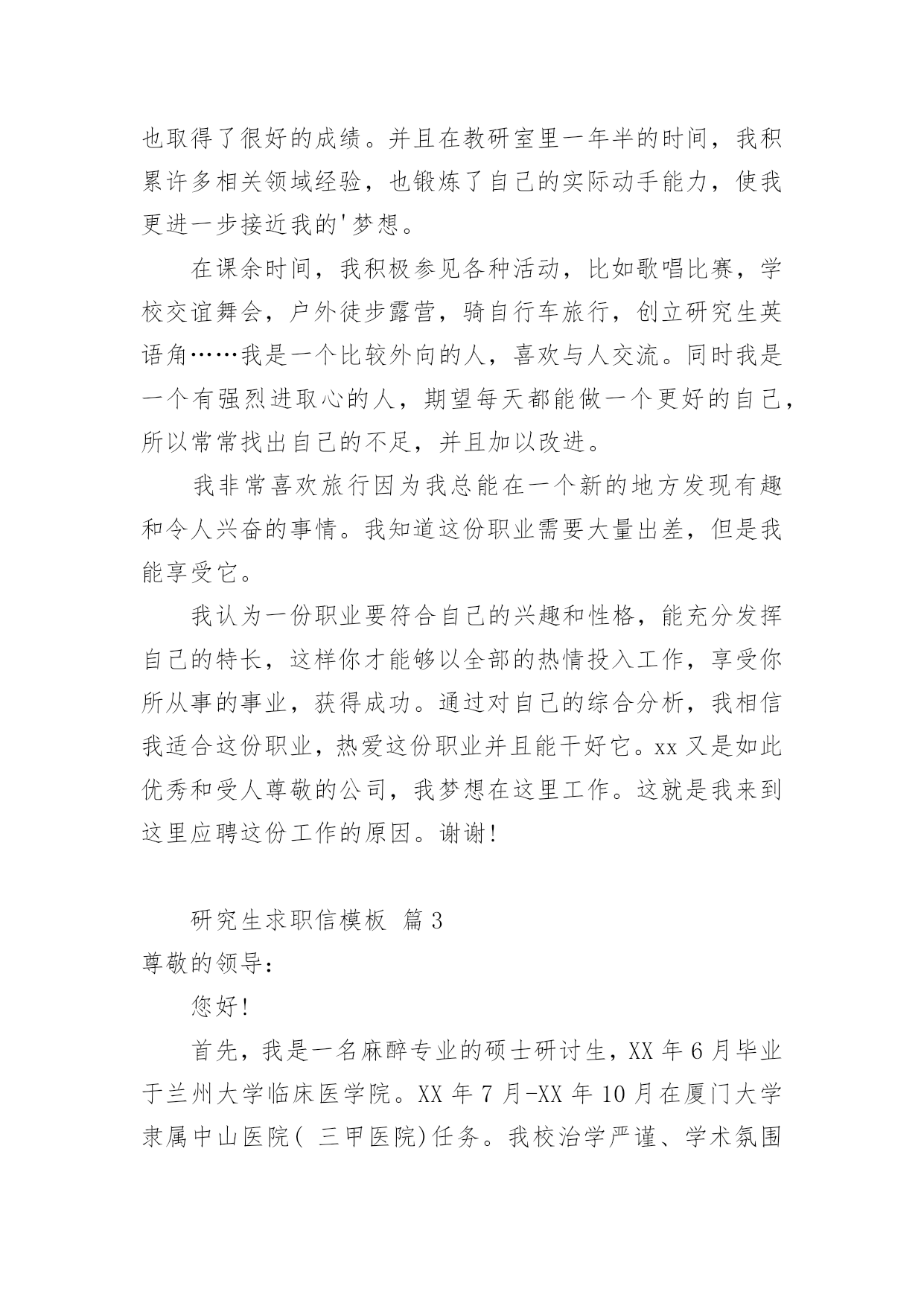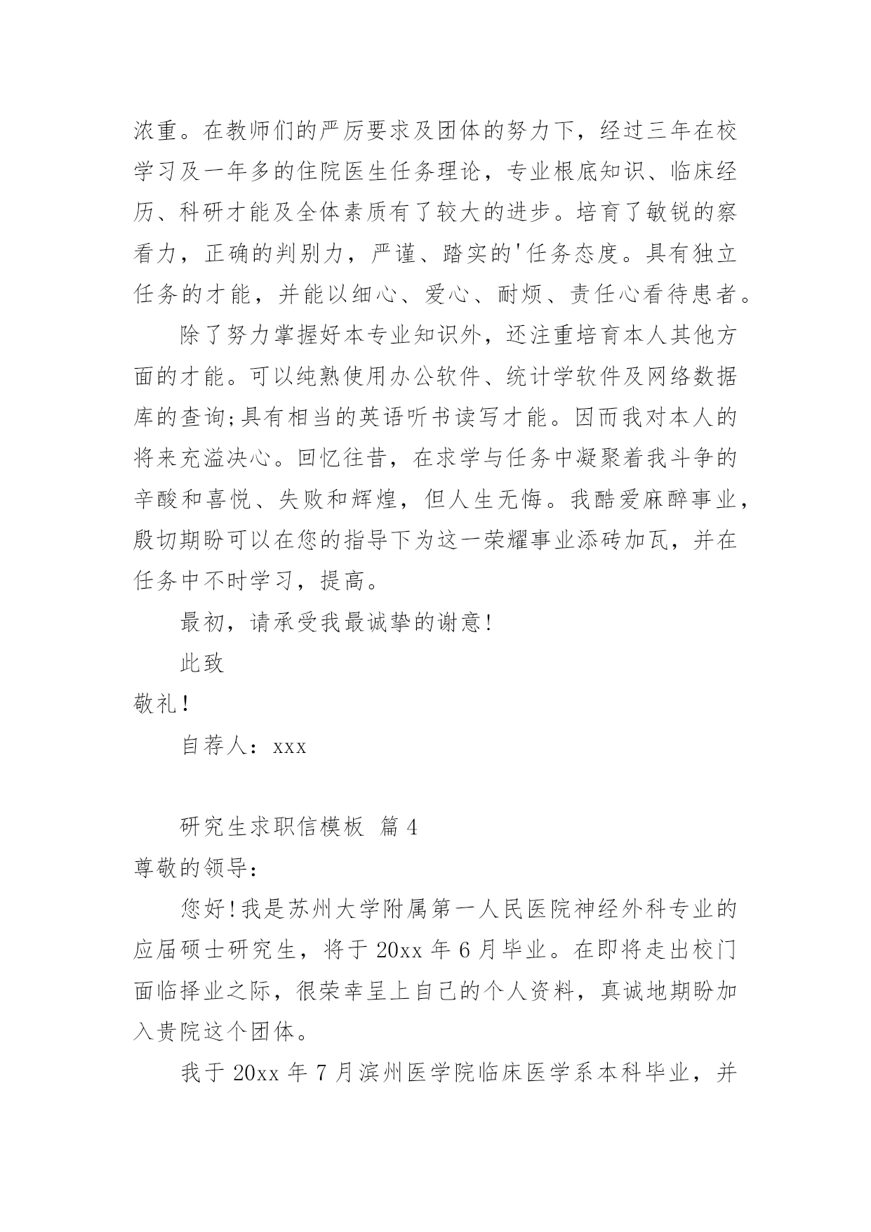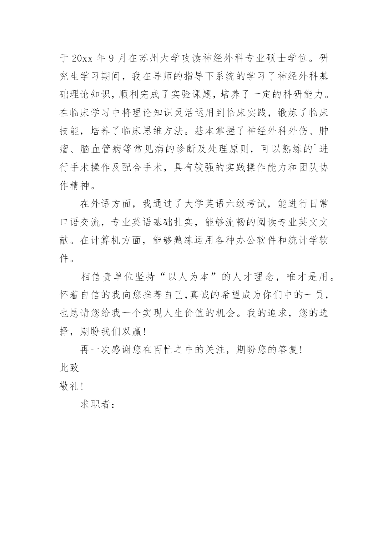 研究生求职信研究生求职信模板日子在弹指一挥间就毫无声息的流逝,又将迎来自己找工作的生活,是时候好好地琢磨一下写求职信的事情了哦。你真的懂得怎么写好求职信吗?下面是小编精心整理的研究生求职信模板,供大家参考借鉴,希望可以帮助到有需要的朋友。研究生求职信模板篇1尊敬的院领导:您好,我十分期望能够成为贵单位的一员,很荣幸有机会向您呈上我的个人资料,谨向各位领导自我推荐。我是暨南大学临床xx届硕士研究生,专业为呼吸内科学,导师为暨南大学第二临床医学院(深圳市人民医院)呼吸内科xx教授(博士生导师)。20xx年,我以优秀的成绩考取暨南大学第二临床学院呼吸内科硕士研究生。在研究生期间,我严格要求自己,在临床和科研方面取得了优异成绩。在临床学习上刻苦勤奋,积极主动地参加各种临床教学活动,不断增強自己的临床思维和临床实践能力,逐渐掌握了常规的临床工作方法和操作技能,对哮喘、肺部感染、气胸、copd等常见病能独立完成诊断与治疗,能独立完成胸穿、胸腔闭式引流、胸膜活检等操作,对呼吸机能够较好的应用。目前具有国家医师资格证。在科研方面,具有优秀的科研素质,独立设计课题,并高质量的完成了实验。在学习的同时,我更注重医德的培养,现实的工作,更多的学会了负责,学会了尊重,更学会了宽容。研究生学习期间我积极的参加学校、医院的各种社会实践活动,热心助人。深厚的专业知识,完整的知识结构,乐观豁达的'性格,超强的团队协作精神和亲和力,一定会帮助我顺利地完成各项工作任务。此时此刻,摆在您面前的不仅仅是薄薄的几张纸,而是一个学子3年来踏踏实实,刻苦钻研的结果,它含纳着我对您及贵院的默默守望与期待。恭候您的佳音。最后,再次感谢您审阅我的材料。祝愿贵院事业蒸蒸日上!此致敬礼!求职者:研究生求职信模板篇2你好,我叫xx,本科和研究生都就读于xx,专业方向是是信息与系统。我的职业理想是成为一名优秀的工程师,所以我选择了xx,选择了我现在的专业。我希望在未来成为这方面的专家。为了实现这个梦想,我特别注重与此相关的专业课程的学习,也取得了很好的成绩。并且在教研室里一年半的时间,我积累许多相关领域经验,也锻炼了自己的实际动手能力,使我更进一步接近我的'梦想。在课余时间,我积极参见各种活动,比如歌唱比赛,学校交谊舞会,户外徒步露营,骑自行车旅行,创立研究生英语角……我是一个比较外向的人,喜欢与人交流。同时我是一个有强烈进取心的人,期望每天都能做一个更好的自己,所以常常找出自己的不足,并且加以改进。我非常喜欢旅行因为我总能在一个新的地方发现有趣和令人兴奋的事情。我知道这份职业需要大量出差,但是我能享受它。我认为一份职业要符合自己的兴趣和性格,能充分发挥自己的特长,这样你才能够以全部的热情投入工作,享受你所从事的事业,获得成功。通过对自己的综合分析,我相信我适合这份职业,热爱这份职业并且能干好它。xx又是如此优秀和受人尊敬的公司,我梦想在这里工作。这就是我来到这里应聘这份工作的原因。谢谢!研究生求职信模板篇3尊敬的领导:您好!首先,我是一名麻醉专业的硕士研讨生,XX年6月毕业于兰州大学临床医学院。XX年7月-XX年10月在厦门大学隶属中山医院(三甲医院)任务。我校治学严谨、学术氛围浓重。在教师们的严厉要求及团体的努力下,经过三年在校学习及一年多的住院医生任务理论,专业根底知识、临床经历、科研才能及全体素质有了较大的进步。培育了敏锐的察看力,正确的判别力,严谨、踏实的'任务态度。具有独立任务的才能,并能以细心、爱心、耐烦、责任心看待患者。除了努力掌握好本专业知识外,还注重培育本人其他方面的才能。可以纯熟使用办公软件、统计学软件及网络数据库的查询;具有相当的英语听书读写才能。因而我对本人的将来充溢决心。回忆往昔,在求学与任务中凝聚着我斗争的辛酸和喜悦、失败和辉煌,但人生无悔。我酷爱麻醉事业,殷切期盼可以在您的指导下为这一荣耀事业添砖加瓦,并在任务中不时学习,提高。最初,请承受我最诚挚的谢意!此致敬礼!自荐人:xxx研究生求职信模板篇4尊敬的领导:您好!我是苏州大学附属第一人民医院神经外科专业的应届硕士研究生,将于20xx年6月毕业。在即将走出校门面临择业之际,很荣幸呈上自己的个人资料,真诚地期盼加入贵院这个团体。我于20xx年7月滨州医学院临床医学系本科毕业,并于20xx年9月在苏州大学攻读神经外科专业硕士学位。研究生学习期间,我在导师的指导下系统的学习了神经外科基础理论知识,顺利完成了实验课题,培养了一定的科研能力。在临床学习中将理论知识灵活运用到临床实践,锻炼了临床技能,培养了临床思维方法。基本掌握了神经外科外伤、肿瘤、脑血管病等常见病的诊断及处理原则,可以熟练的`进行手术操作及配合手术,具有较强的实践操作能力和团队协作精神。在外语方面,我通过了大学英语六级考试,能进行日常口语交流