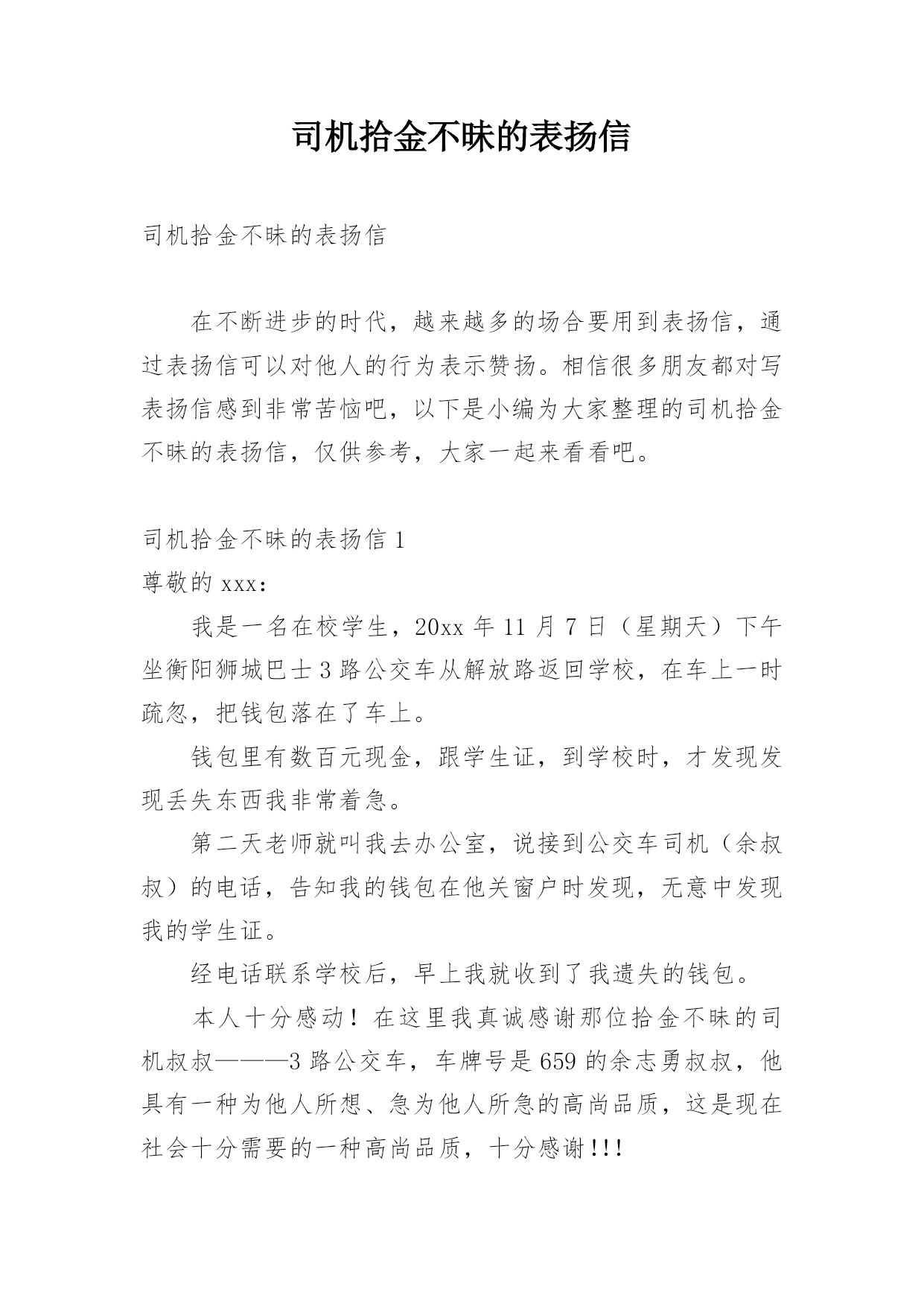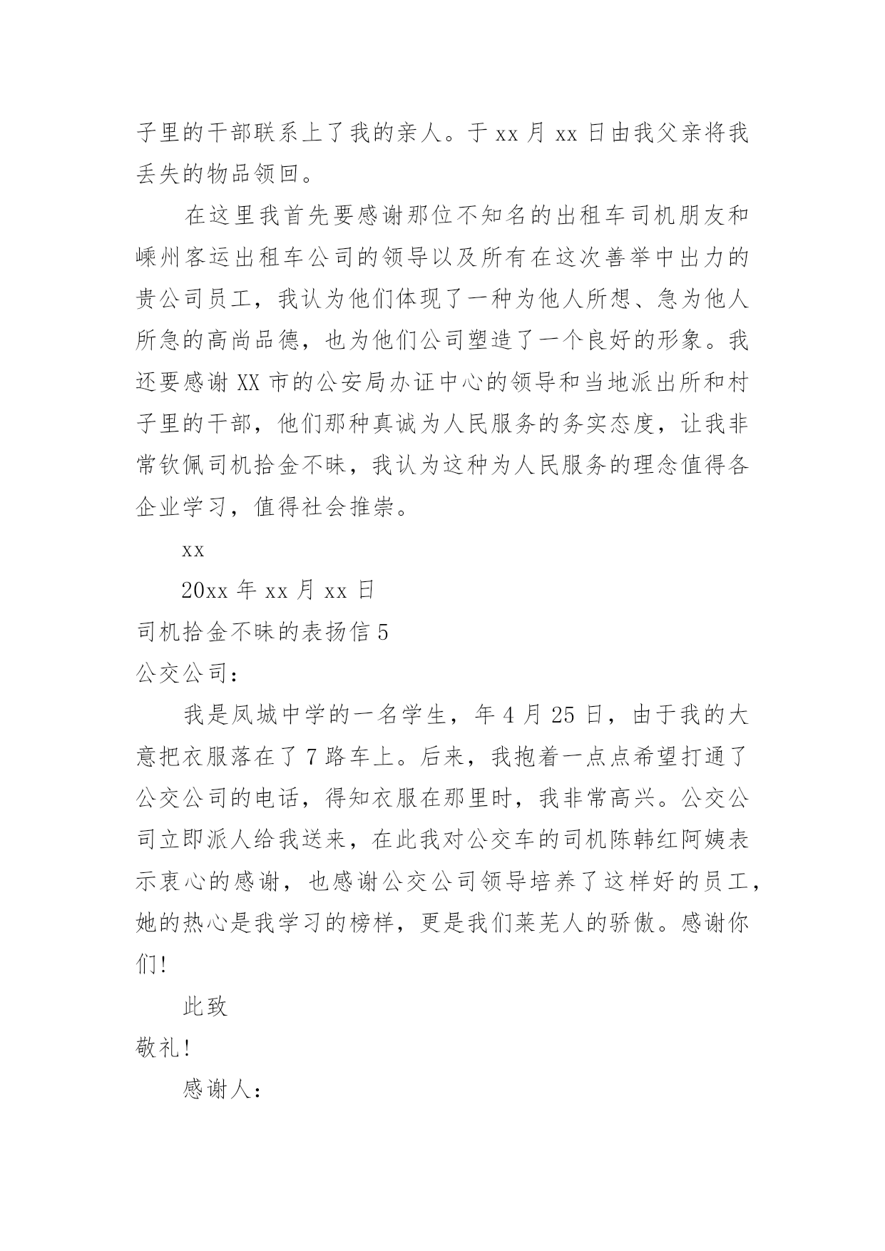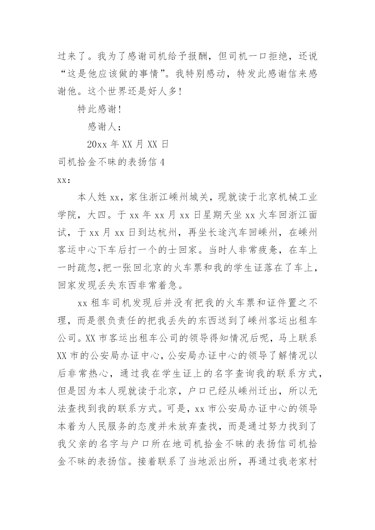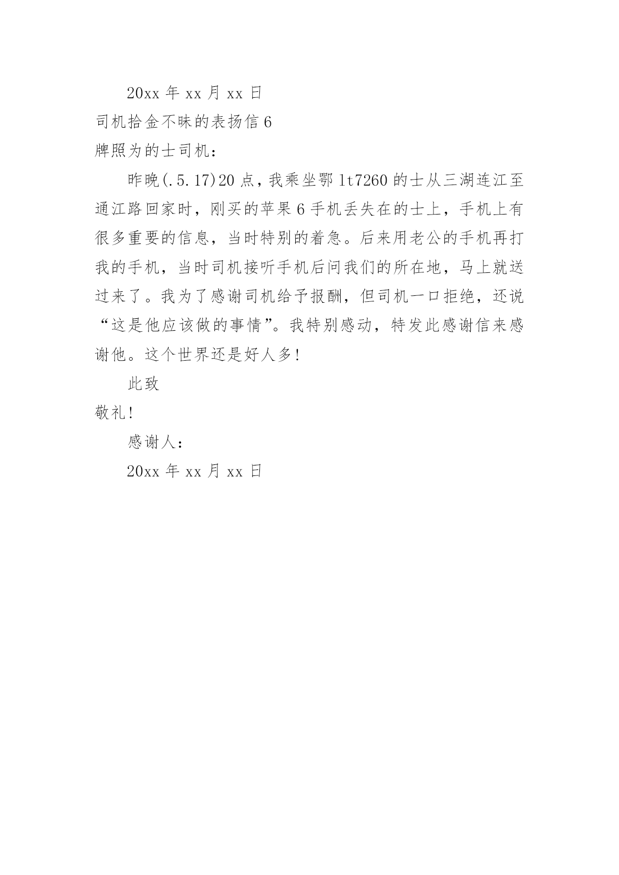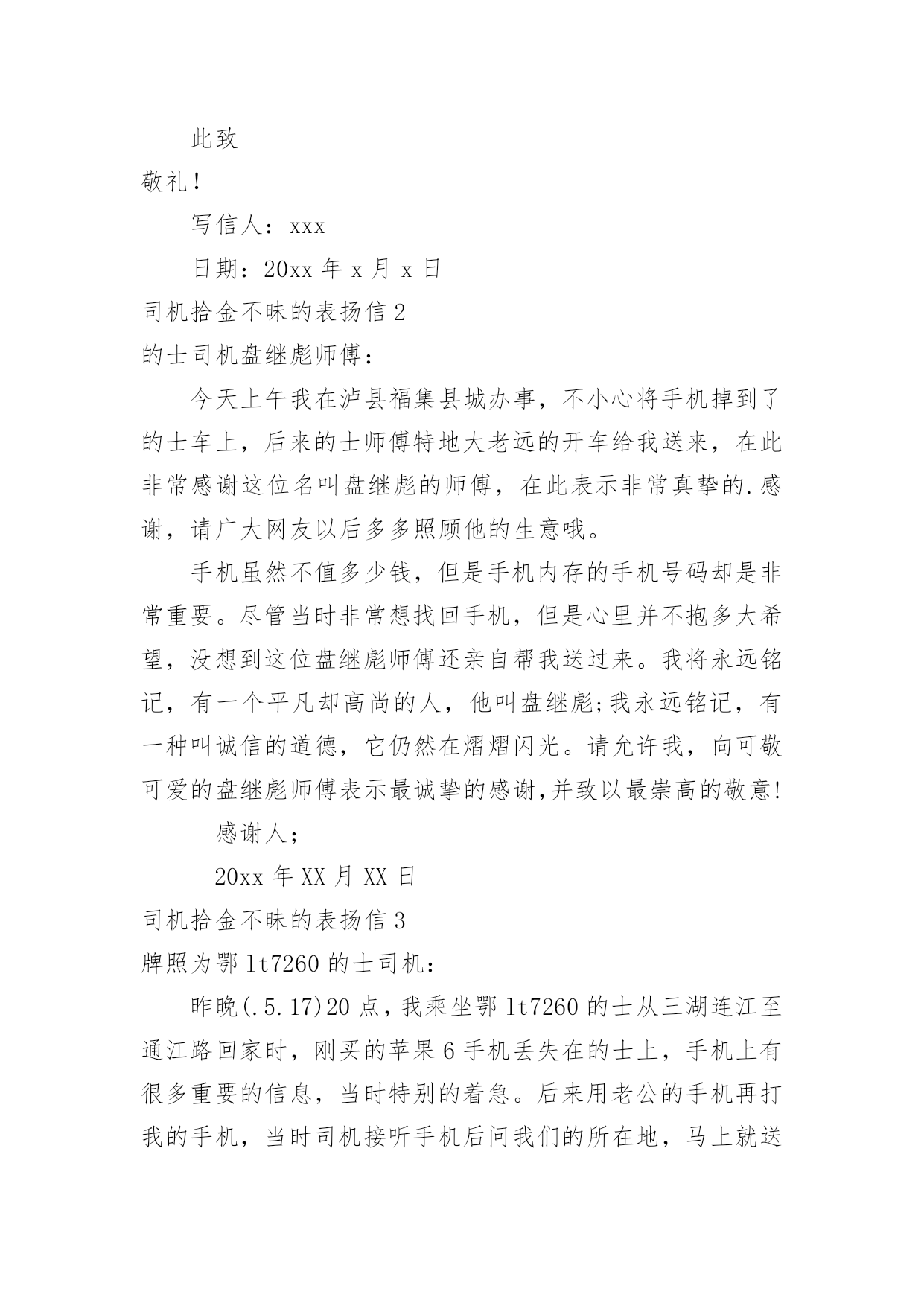 司机拾金不昧的表扬信司机拾金不昧的表扬信在不断进步的时代,越来越多的场合要用到表扬信,通过表扬信可以对他人的行为表示赞扬。相信很多朋友都对写表扬信感到非常苦恼吧,以下是小编为大家整理的司机拾金不昧的表扬信,仅供参考,大家一起来看看吧。司机拾金不昧的表扬信1尊敬的xxx:我是一名在校学生,20xx年11月7日(星期天)下午坐衡阳狮城巴士3路公交车从解放路返回学校,在车上一时疏忽,把钱包落在了车上。钱包里有数百元现金,跟学生证,到学校时,才发现发现丢失东西我非常着急。第二天老师就叫我去办公室,说接到公交车司机(余叔叔)的电话,告知我的钱包在他关窗户时发现,无意中发现我的学生证。经电话联系学校后,早上我就收到了我遗失的钱包。本人十分感动!在这里我真诚感谢那位拾金不昧的司机叔叔———3路公交车,车牌号是659的余志勇叔叔,他具有一种为他人所想、急为他人所急的高尚品质,这是现在社会十分需要的一种高尚品质,十分感谢!!!此致敬礼!写信人:xxx日期:20xx年x月x日司机拾金不昧的表扬信2的士司机盘继彪师傅:今天上午我在泸县福集县城办事,不小心将手机掉到了的士车上,后来的士师傅特地大老远的开车给我送来,在此非常感谢这位名叫盘继彪的师傅,在此表示非常真挚的.感谢,请广大网友以后多多照顾他的生意哦。手机虽然不值多少钱,但是手机内存的手机号码却是非常重要。尽管当时非常想找回手机,但是心里并不抱多大希望,没想到这位盘继彪师傅还亲自帮我送过来。我将永远铭记,有一个平凡却高尚的人,他叫盘继彪;我永远铭记,有一种叫诚信的道德,它仍然在熠熠闪光。请允许我,向可敬可爱的盘继彪师傅表示最诚挚的感谢,并致以最崇高的敬意!感谢人;20xx年XX月XX日司机拾金不昧的表扬信3牌照为鄂lt7260的士司机:昨晚(.5.17)20点,我乘坐鄂lt7260的士从三湖连江至通江路回家时,刚买的苹果6手机丢失在的士上,手机上有很多重要的信息,当时特别的着急。后来用老公的手机再打我的手机,当时司机接听手机后问我们的所在地,马上就送过来了。我为了感谢司机给予报酬,但司机一口拒绝,还说“这是他应该做的事情”。我特别感动,特发此感谢信来感谢他。这个世界还是好人多!特此感谢!感谢人;20xx年XX月XX日司机拾金不昧的表扬信4xx:本人姓xx,家住浙江嵊州城关,现就读于北京机械工业学院,大四。于xx年xx月xx日星期天坐xx火车回浙江面试,于xx月xx日到达杭州,再坐长途汽车回嵊州,在嵊州客运中心下车后打一个的士回家。当时人非常疲惫,在车上一时疏忽,把一张回北京的火车票和我的学生证落在了车上,回家发现丢失东西非常着急。xx租车司机发现后并没有把我的火车票和证件置之不理,而是很负责任的把我丢失的东西送到了嵊州客运出租车公司。XX市客运出租车公司的领导得知情况后呢,马上联系XX市的公安局办证中心,公安局办证中心的领导了解情况以后非常热心,通过我在学生证上的名字查询我的联系方式,但是因为本人现就读于北京,户口已经从嵊州迁出,所以无法查找到我的联系方式。可是,xx市公安局办证中心的领导本着为人民服务的态度并未放弃查找,而是通过努力找到了我父亲的名字与户口所在地司机拾金不昧的表扬信司机拾金不昧的表扬信。接着联系了当地派出所,再通过我老家村子里的干部联系上了我的亲人。于xx月xx日由我父亲将我丢失的物品领回。在这里我首先要感谢那位不知名的出租车司机朋友和嵊州客运出租车公司的领导以及所有在这次善举中出力的贵公司员工,我认为他们体现了一种为他人所想、急为他人所急的高尚品德,也为他们公司塑造了一个良好的形象。我还要感谢XX市的公安局办证中心的领导和当地派出所和村子里的干部,他们那种真诚为人民服务的务实态度,让我非常钦佩司机拾金不昧,我认为这种为人民服务的理念值得各企业学习,值得社会推崇。xx20xx年xx月xx日司机拾金不昧的表扬信5公交公司:我是凤城中学的一名学生,年4月25日,由于我的大意把衣服落在了7路车上。后来,我抱着一点点希望打通了公交公司的电话,得知衣服在那里时,我非常高兴。公交公司立即派人给我送来,在此我对公交车的司机陈韩红阿姨表示衷心的感谢,也感谢公交公司领导培养了这样好的员工,她的热心是我学习的榜样,更是我们莱芜人的骄傲。感谢你们!此致敬礼!感谢人:20xx年xx月xx日司机拾金不昧的表扬信6牌照为的士司机:昨晚(.5.17)20点,我乘坐鄂lt7260的士从三湖连江至通江路回家时,刚买的苹果6手机丢失在的士上,手机上有很多重要的信息,当时特别的着急。后来用老公的手机再打我的手机,当时司机接听手机后问我们的所在地,马上就送过来了。我为了感谢司机给予报酬,但司机一口拒绝,还说“这是他应该做的事情”。我特别感动,特发此感谢信来感谢他。这个世界还是好人多!此致敬礼!感谢人:20xx年x