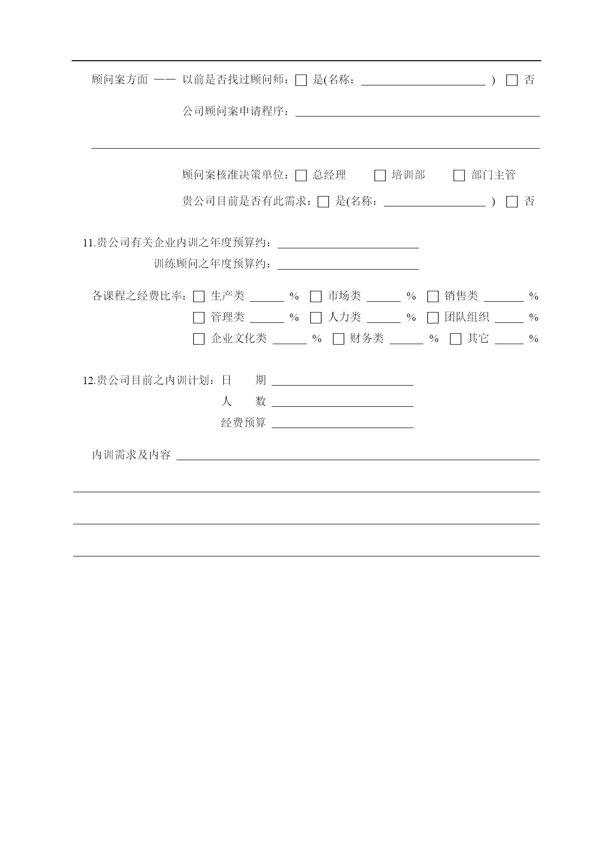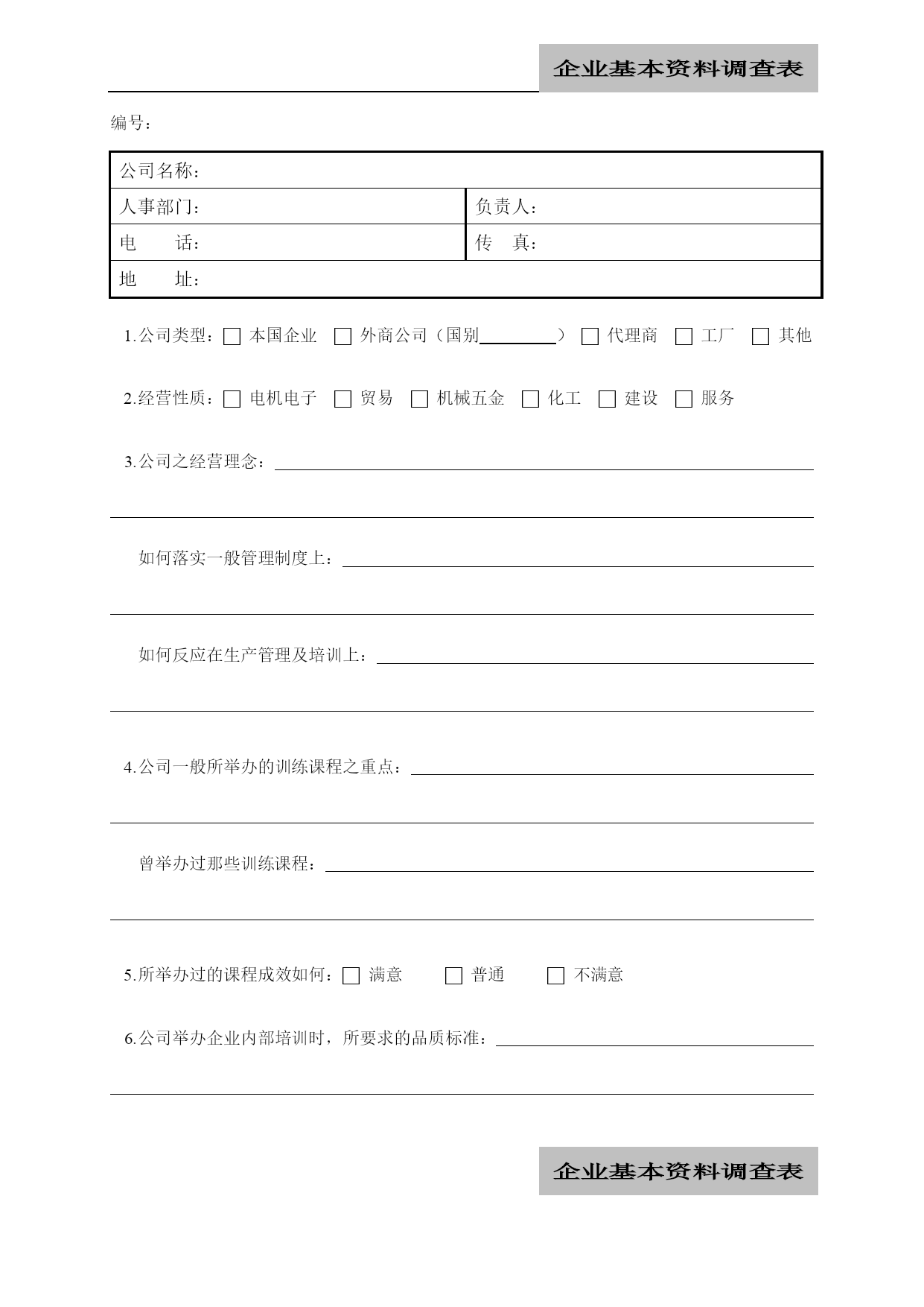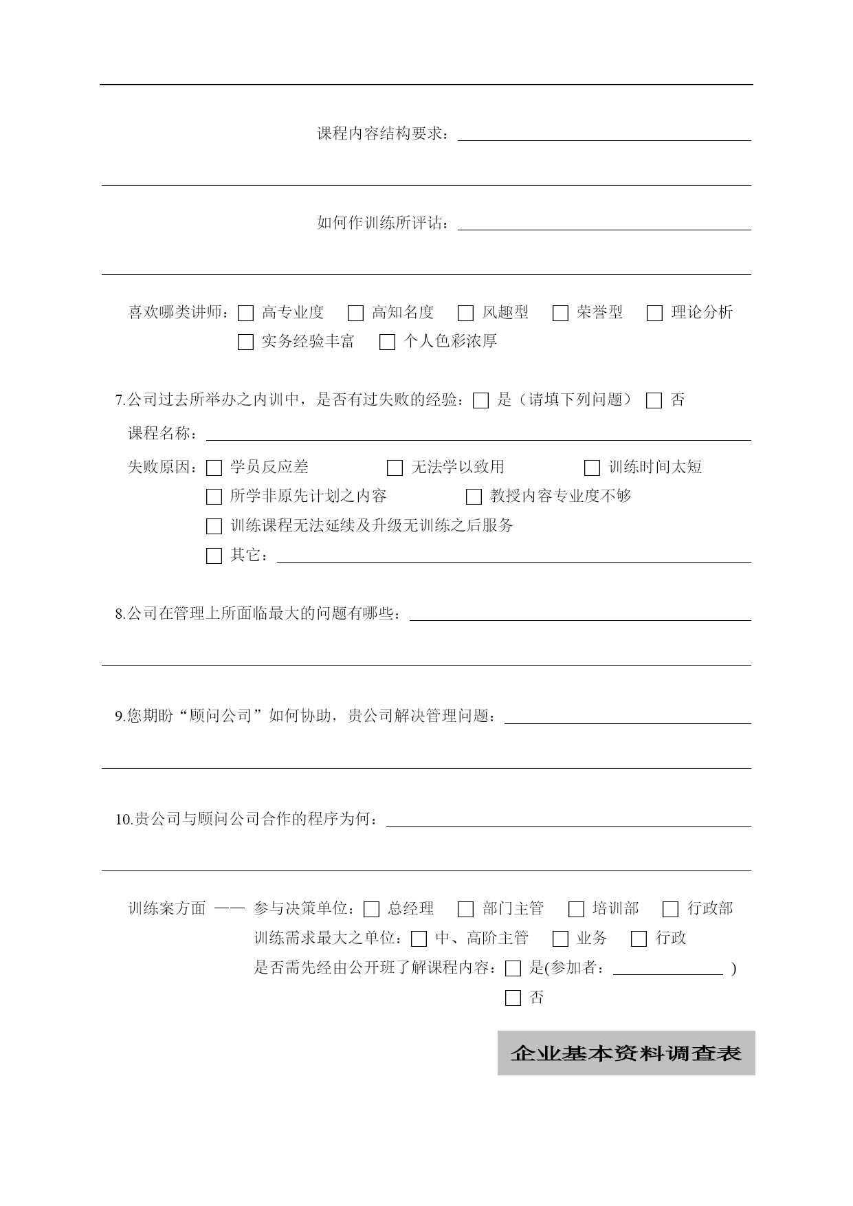 企业基本资料调查表编号:公司名称:人事部门:负责人:电话:传真:地址:公司类型:本国企业外商公司(国别)代理商工厂其他经营性质:电机电子贸易机械五金化工建设服务公司之经营理念:如何落实一般管理制度上:如何反应在生产管理及培训上:公司一般所举办的训练课程之重点:曾举办过那些训练课程:所举办过的课程成效如何:满意普通不满意公司举办企业内部培训时,所要求的品质标准:企业基本资料调查表公司举办企业内部培训时,课程内容结构要求:公司举办企业内部培训时,如何作训练所评诂:喜欢哪类讲师:高专业度高知名度风趣型荣誉型理论分析喜欢哪类讲师:实务经验丰富个人色彩浓厚7.公司过去所举办之内训中,是否有过失败的经验:是(请填下列问题)否课程名称:失败原因:学员反应差无法学以致用训练时间太短失败原因:所学非原先计划之内容教授内容专业度不够失败原因:训练课程无法延续及升级无训练之后服务失败原因:其它:8.公司在管理上所面临最大的问题有哪些:9.您期盼“顾问公司”如何协助,贵公司解决管理问题:10.贵公司与顾问公司合作的程序为何:训练案方面——参与决策单位:总经理部门主管培训部行政部训练案方面——训练需求最大之单位:中、高阶主管业务行政训练案方面——是否需先经由公开班了解课程内容:是(参加者:)训练案方面——是否需先经由公开班了解课程内容:否企业基本资料调查表顾问案方面——以前是否找过顾问师:是(名称:)否训练案方面——公司顾问案申请程序:训练案方面——顾问案核准决策单位:总经理培训部部门主管训练案方面——贵公司目前是否有此需求:是(名称:)否11.贵公司有关企业内训之年度预算约:11.贵公司有关训练顾问之年度预算约:各课程之经费比率:生产类%市场类%销售类%各课程之经费比率:管理类%人力类%团队组织%各课程之经费比率:企业文化类%财务类%其它%12.贵公司目前之内训计划:日期12.贵公司目前之内训计划:人数12.贵公司目前之内训计划:经费预算内训需求及内容