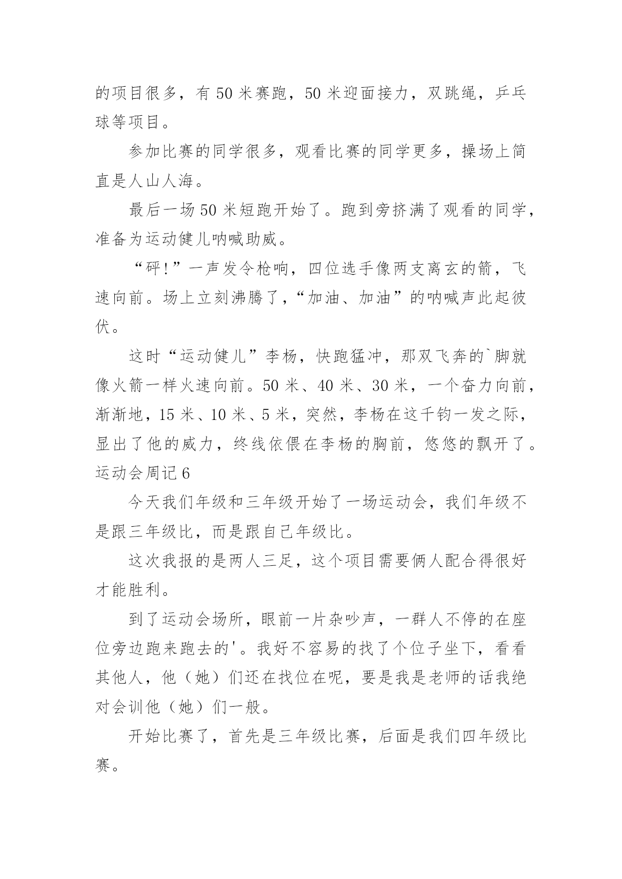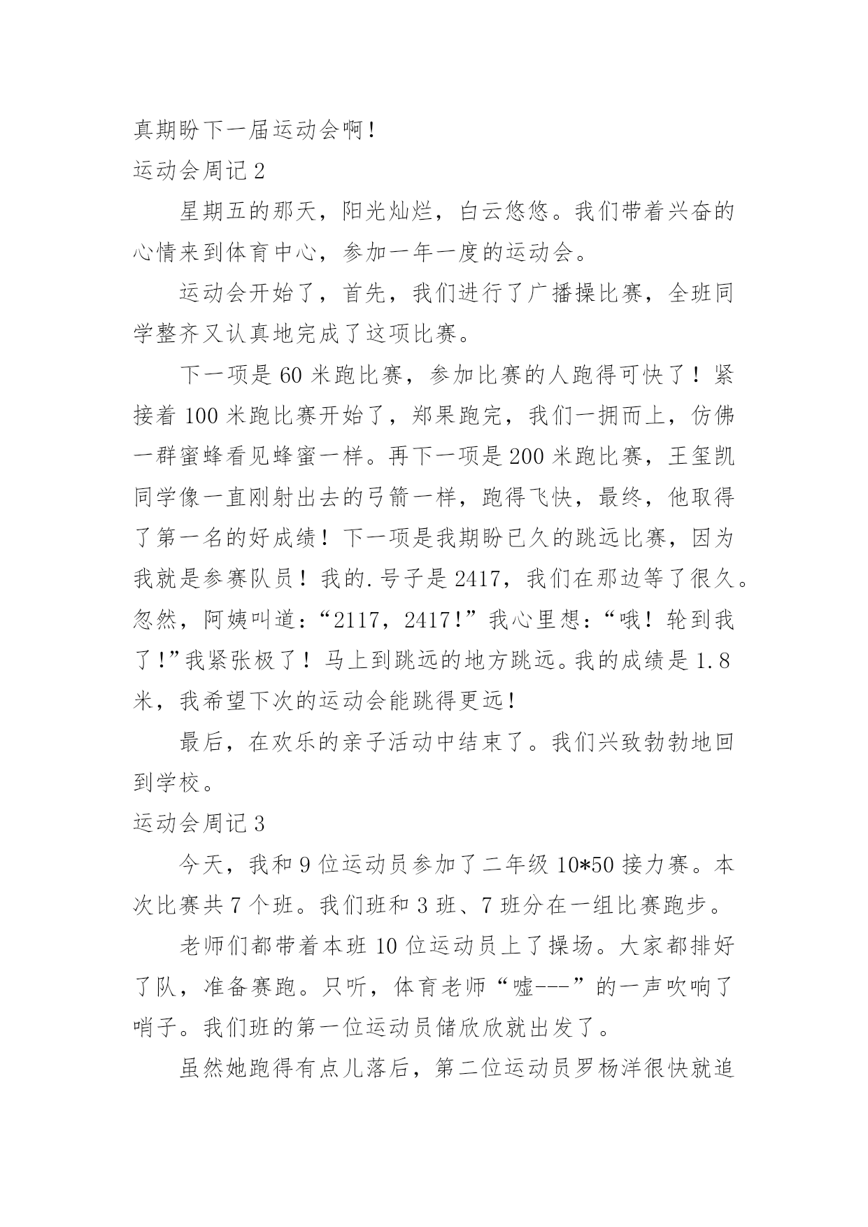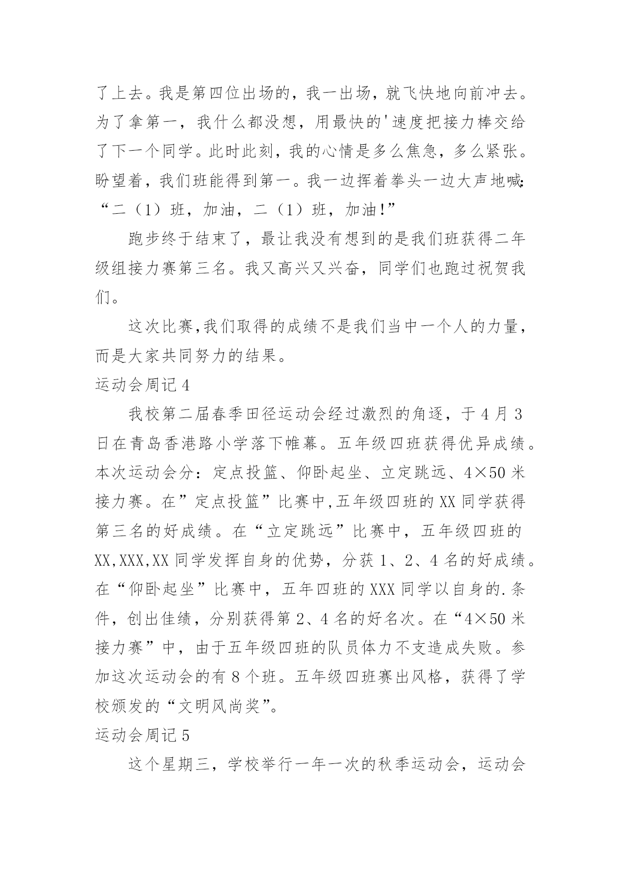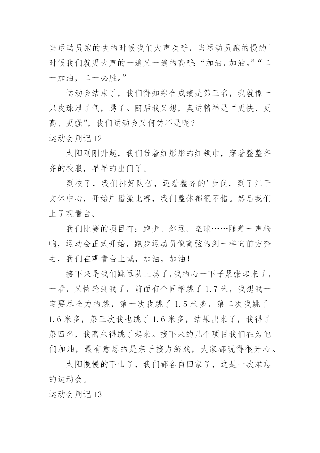 运动会周记运动会周记岁月无痕,流水时光,眨眼间,一个星期已经过去,一周的时间,一定有不少感想,是不是该好好写一篇周记记录一下呢?但是周记有什么要求呢?下面是小编帮大家整理的运动会周记,仅供参考,希望能够帮助到大家。运动会周记1一学期一度的运动会开始了。首先是升旗仪式。接下来接力比赛开始了。我们班以风驰电掣的速度得到了第一。接下来的各项比赛中除了xx没有进入决赛,其他都进入了决赛。上午的比赛也结束了。下午,我们陆续夺得了第一名,第二名,第三名的'好成绩。到xx上场了,一想到xx跑得比我还慢,不禁叹了一口气。发令枪一响,xx竟然落在最后一个,到了最后半圈,连广播里都响起了“xx加油,xx加油”的声音,可是xx还是最后一个越过终点的。该我们的“先锋”xx上场了,他可是全校第一。跑着跑着,xx又开始耍小聪明了,故意落在第二。但是仔细一看,我吓坏了!原来前面有一个人已经跑得无影无踪了。但是第二圈xx超出了我的意料之外,绝地大反击!也不知是我只顾着玩,还是时间太短,运动会结束了。真期盼下一届运动会啊!运动会周记2星期五的那天,阳光灿烂,白云悠悠。我们带着兴奋的心情来到体育中心,参加一年一度的运动会。运动会开始了,首先,我们进行了广播操比赛,全班同学整齐又认真地完成了这项比赛。下一项是60米跑比赛,参加比赛的人跑得可快了!紧接着100米跑比赛开始了,郑果跑完,我们一拥而上,仿佛一群蜜蜂看见蜂蜜一样。再下一项是200米跑比赛,王玺凯同学像一直刚射出去的弓箭一样,跑得飞快,最终,他取得了第一名的好成绩!下一项是我期盼已久的跳远比赛,因为我就是参赛队员!我的.号子是2417,我们在那边等了很久。忽然,阿姨叫道:“2117,2417!”我心里想:“哦!轮到我了!”我紧张极了!马上到跳远的地方跳远。我的成绩是1.8米,我希望下次的运动会能跳得更远!最后,在欢乐的亲子活动中结束了。我们兴致勃勃地回到学校。运动会周记3今天,我和9位运动员参加了二年级10*50接力赛。本次比赛共7个班。我们班和3班、7班分在一组比赛跑步。老师们都带着本班10位运动员上了操场。大家都排好了队,准备赛跑。只听,体育老师“嘘---”的一声吹响了哨子。我们班的第一位运动员储欣欣就出发了。虽然她跑得有点儿落后,第二位运动员罗杨洋很快就追了上去。我是第四位出场的,我一出场,就飞快地向前冲去。为了拿第一,我什么都没想,用最快的'速度把接力棒交给了下一个同学。此时此刻,我的心情是多么焦急,多么紧张。盼望着,我们班能得到第一。我一边挥着拳头一边大声地喊:“二(1)班,加油,二(1)班,加油!”跑步终于结束了,最让我没有想到的是我们班获得二年级组接力赛第三名。我又高兴又兴奋,同学们也跑过祝贺我们。这次比赛,我们取得的成绩不是我们当中一个人的力量,而是大家共同努力的结果。运动会周记4我校第二届春季田径运动会经过激烈的角逐,于4月3日在青岛香港路小学落下帷幕。五年级四班获得优异成绩。本次运动会分:定点投篮、仰卧起坐、立定跳远、4×50米接力赛。在”定点投篮”比赛中,五年级四班的XX同学获得第三名的好成绩。在“立定跳远”比赛中,五年级四班的XX,XXX,XX同学发挥自身的优势,分获1、2、4名的好成绩。在“仰卧起坐”比赛中,五年四班的XXX同学以自身的.条件,创出佳绩,分别获得第2、4名的好名次。在“4×50米接力赛”中,由于五年级四班的队员体力不支造成失败。参加这次运动会的有8个班。五年级四班赛出风格,获得了学校颁发的“文明风尚奖”。运动会周记5这个星期三,学校举行一年一次的秋季运动会,运动会的项目很多,有50米赛跑,50米迎面接力,双跳绳,乒乓球等项目。参加比赛的同学很多,观看比赛的同学更多,操场上简直是人山人海。最后一场50米短跑开始了。跑到旁挤满了观看的同学,准备为运动健儿呐喊助威。“砰!”一声发令枪响,四位选手像两支离玄的箭,飞速向前。场上立刻沸腾了,“加油、加油”的呐喊声此起彼伏。这时“运动健儿”李杨,快跑猛冲,那双飞奔的`脚就像火箭一样火速向前。50米、40米、30米,一个奋力向前,渐渐地,15米、10米、5米,突然,李杨在这千钧一发之际,显出了他的威力,终线依偎在李杨的胸前,悠悠的飘开了。运动会周记6今天我们年级和三年级开始了一场运动会,我们年级不是跟三年级比,而是跟自己年级比。这次我报的是两人三足,这个项目需要俩人配合得很好才能胜利。到了运动会场所,眼前一片杂吵声,一群人不停的在座位旁边跑来跑去的'。我好不容易的找了个位子坐下,看看其他人,他(她)们还在找位在呢,要是我是老师的话我绝对会训他(她)们一般。开始比赛了,首先是三年级比赛,后面是我们四年级比赛。到了四年级比赛了,第一个项目是搬石头过河。一开始,我们班领先了,一看这情况我们班兴奋不已,不停的喊加油,不知道为什么,好像