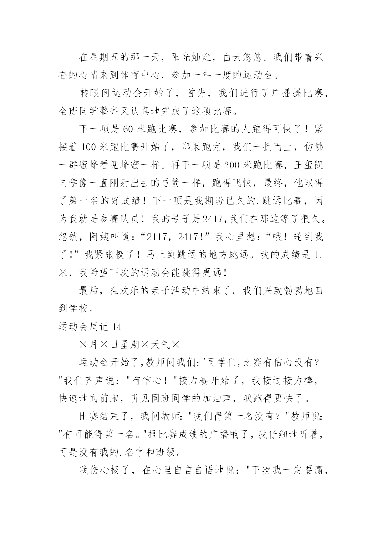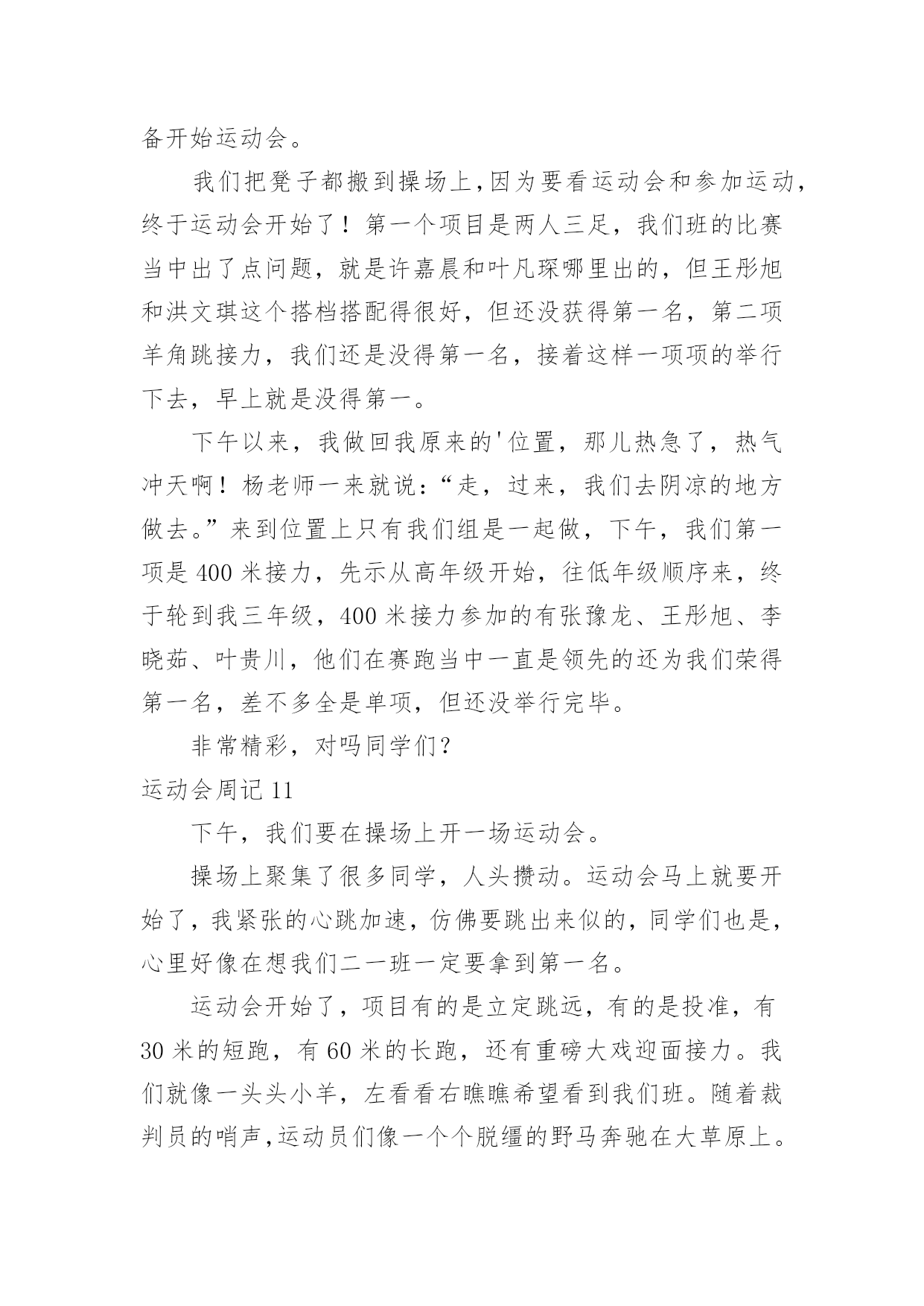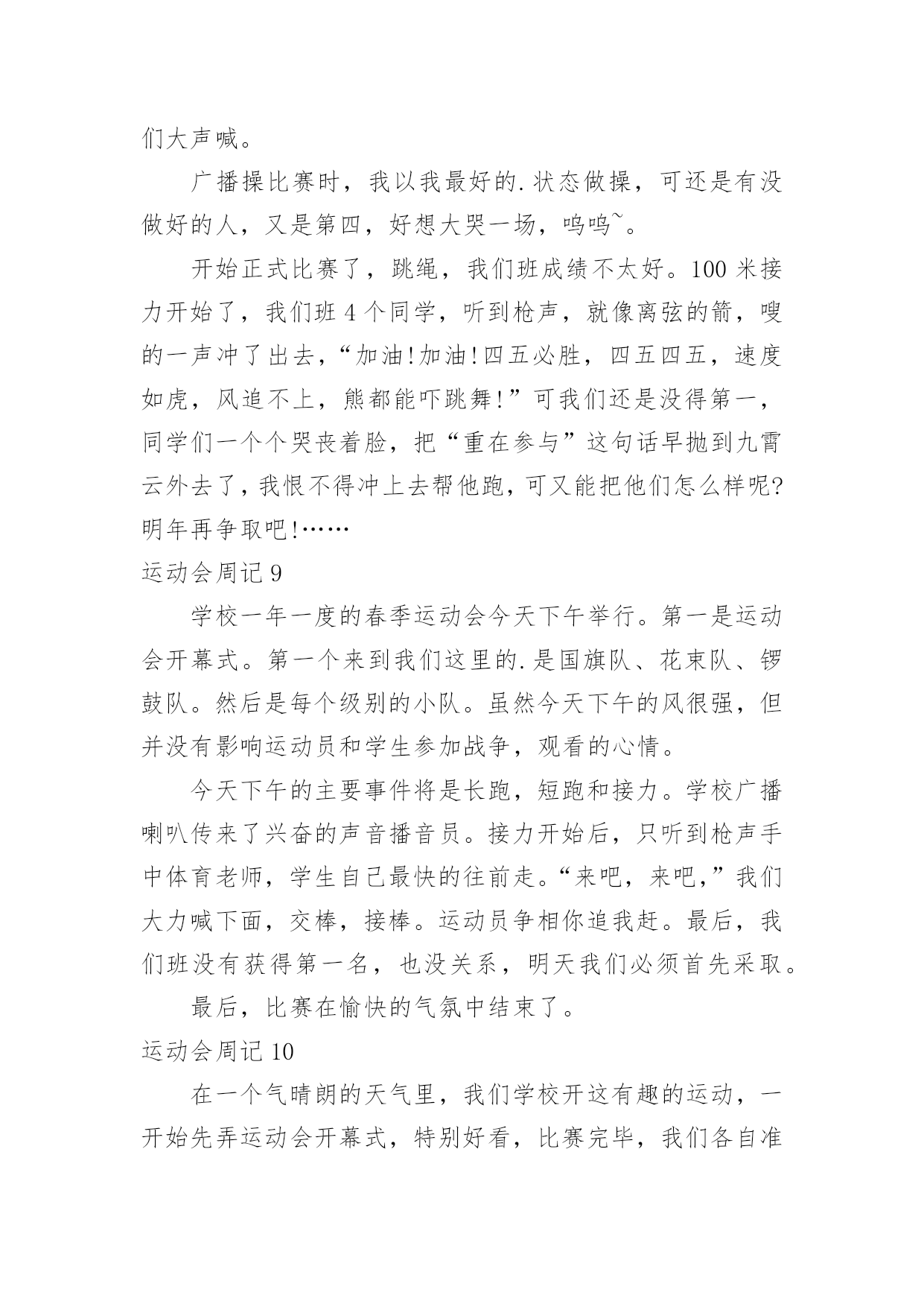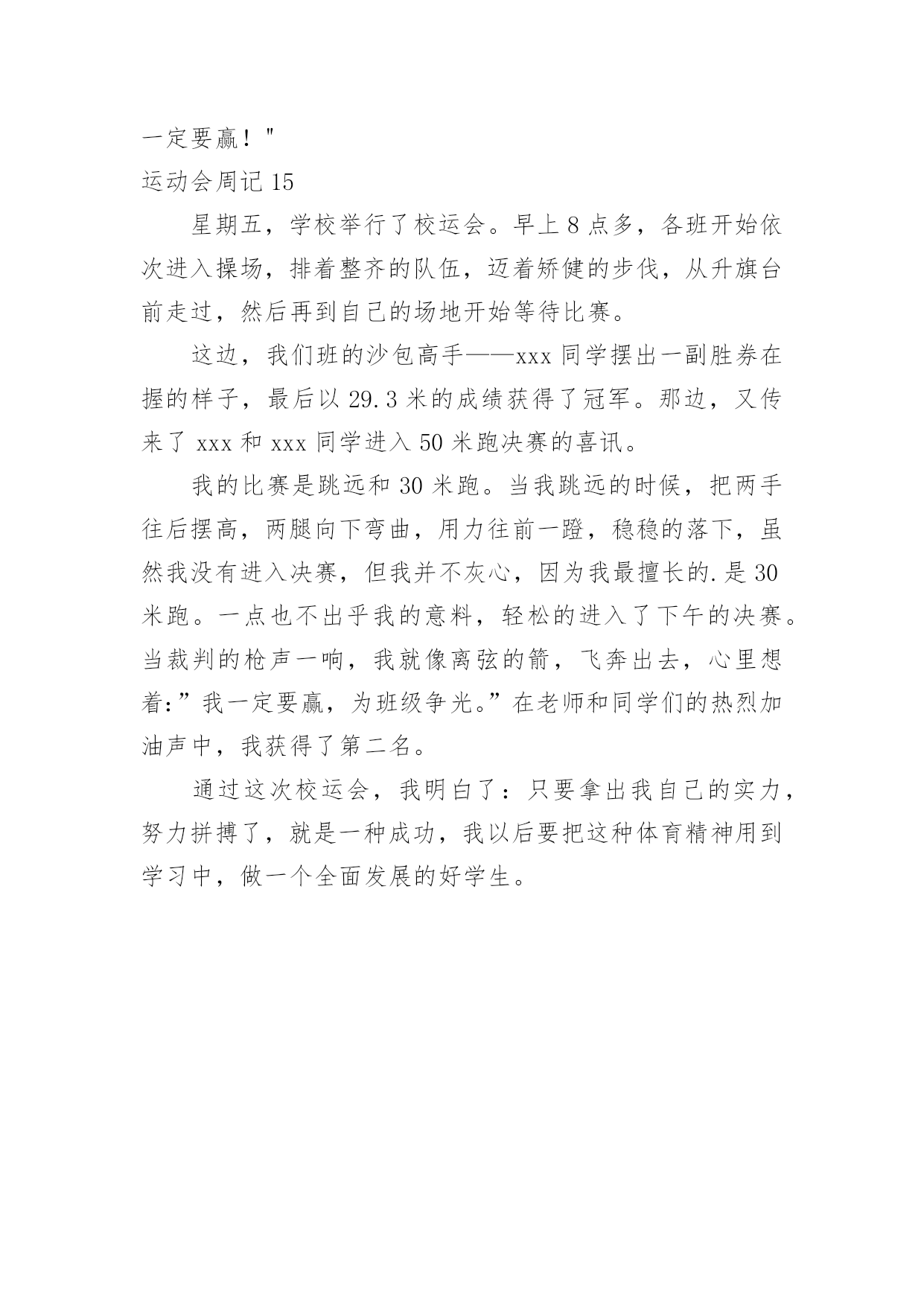 运动会周记运动会周记岁月无痕,流水时光,眨眼间,一个星期已经过去,一周的时间,一定有不少感想,是不是该好好写一篇周记记录一下呢?但是周记有什么要求呢?下面是小编帮大家整理的运动会周记,仅供参考,希望能够帮助到大家。运动会周记1一学期一度的运动会开始了。首先是升旗仪式。接下来接力比赛开始了。我们班以风驰电掣的速度得到了第一。接下来的各项比赛中除了xx没有进入决赛,其他都进入了决赛。上午的比赛也结束了。下午,我们陆续夺得了第一名,第二名,第三名的'好成绩。到xx上场了,一想到xx跑得比我还慢,不禁叹了一口气。发令枪一响,xx竟然落在最后一个,到了最后半圈,连广播里都响起了“xx加油,xx加油”的声音,可是xx还是最后一个越过终点的。该我们的“先锋”xx上场了,他可是全校第一。跑着跑着,xx又开始耍小聪明了,故意落在第二。但是仔细一看,我吓坏了!原来前面有一个人已经跑得无影无踪了。但是第二圈xx超出了我的意料之外,绝地大反击!也不知是我只顾着玩,还是时间太短,运动会结束了。真期盼下一届运动会啊!运动会周记2星期五的那天,阳光灿烂,白云悠悠。我们带着兴奋的心情来到体育中心,参加一年一度的运动会。运动会开始了,首先,我们进行了广播操比赛,全班同学整齐又认真地完成了这项比赛。下一项是60米跑比赛,参加比赛的人跑得可快了!紧接着100米跑比赛开始了,郑果跑完,我们一拥而上,仿佛一群蜜蜂看见蜂蜜一样。再下一项是200米跑比赛,王玺凯同学像一直刚射出去的弓箭一样,跑得飞快,最终,他取得了第一名的好成绩!下一项是我期盼已久的跳远比赛,因为我就是参赛队员!我的.号子是2417,我们在那边等了很久。忽然,阿姨叫道:“2117,2417!”我心里想:“哦!轮到我了!”我紧张极了!马上到跳远的地方跳远。我的成绩是1.8米,我希望下次的运动会能跳得更远!最后,在欢乐的亲子活动中结束了。我们兴致勃勃地回到学校。运动会周记3今天,我和9位运动员参加了二年级10*50接力赛。本次比赛共7个班。我们班和3班、7班分在一组比赛跑步。老师们都带着本班10位运动员上了操场。大家都排好了队,准备赛跑。只听,体育老师“嘘---”的一声吹响了哨子。我们班的第一位运动员储欣欣就出发了。虽然她跑得有点儿落后,第二位运动员罗杨洋很快就追了上去。我是第四位出场的,我一出场,就飞快地向前冲去。为了拿第一,我什么都没想,用最快的'速度把接力棒交给了下一个同学。此时此刻,我的心情是多么焦急,多么紧张。盼望着,我们班能得到第一。我一边挥着拳头一边大声地喊:“二(1)班,加油,二(1)班,加油!”跑步终于结束了,最让我没有想到的是我们班获得二年级组接力赛第三名。我又高兴又兴奋,同学们也跑过祝贺我们。这次比赛,我们取得的成绩不是我们当中一个人的力量,而是大家共同努力的结果。运动会周记4我校第二届春季田径运动会经过激烈的角逐,于4月3日在青岛香港路小学落下帷幕。五年级四班获得优异成绩。本次运动会分:定点投篮、仰卧起坐、立定跳远、4×50米接力赛。在”定点投篮”比赛中,五年级四班的XX同学获得第三名的好成绩。在“立定跳远”比赛中,五年级四班的XX,XXX,XX同学发挥自身的优势,分获1、2、4名的好成绩。在“仰卧起坐”比赛中,五年四班的XXX同学以自身的.条件,创出佳绩,分别获得第2、4名的好名次。在“4×50米接力赛”中,由于五年级四班的队员体力不支造成失败。参加这次运动会的有8个班。五年级四班赛出风格,获得了学校颁发的“文明风尚奖”。运动会周记5这个星期三,学校举行一年一次的秋季运动会,运动会的项目很多,有50米赛跑,50米迎面接力,双跳绳,乒乓球等项目。参加比赛的同学很多,观看比赛的同学更多,操场上简直是人山人海。最后一场50米短跑开始了。跑到旁挤满了观看的同学,准备为运动健儿呐喊助威。“砰!”一声发令枪响,四位选手像两支离玄的箭,飞速向前。场上立刻沸腾了,“加油、加油”的呐喊声此起彼伏。这时“运动健儿”李杨,快跑猛冲,那双飞奔的`脚就像火箭一样火速向前。50米、40米、30米,一个奋力向前,渐渐地,15米、10米、5米,突然,李杨在这千钧一发之际,显出了他的威力,终线依偎在李杨的胸前,悠悠的飘开了。运动会周记6今天我们年级和三年级开始了一场运动会,我们年级不是跟三年级比,而是跟自己年级比。这次我报的是两人三足,这个项目需要俩人配合得很好才能胜利。到了运动会场所,眼前一片杂吵声,一群人不停的在座位旁边跑来跑去的'。我好不容易的找了个位子坐下,看看其他人,他(她)们还在找位在呢,要是我是老师的话我绝对会训他(她)们一般。开始比赛了,首先是三年级比赛,后面是我们四年级比赛。到了四年级比赛了,第一个项目是搬石头过河。一开始,我们班领先了,一看这情况我们班兴奋不已,不停的喊加油,不知道为什么,好像