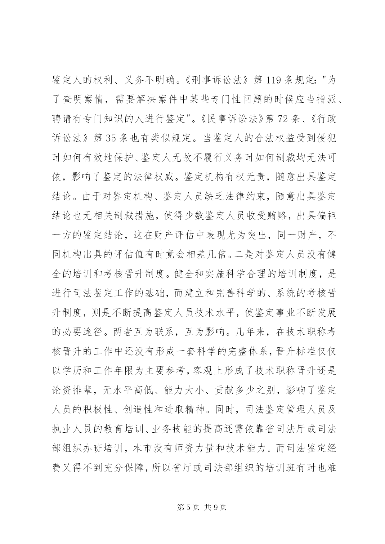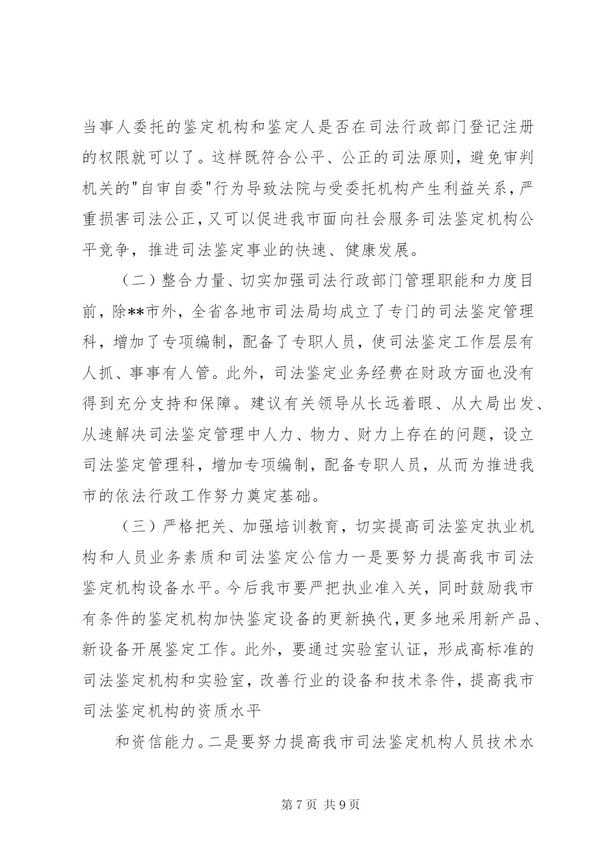 第PAGE\*Arabic\*MERGEFORMAT9页共NUMPAGES\*MERGEFORMAT9页司法鉴定工作状况调研报告市面向社会服务司法鉴定机构如雨后春笋、蓬勃发展起来,司法鉴定管理模式在我市呈现出积极探索、稳妥推进的新局面。但我市也存在着司法鉴定的运行机制较为混乱、司法鉴定从业人员的整体素质不高、司法鉴定人员的管理机制不够科学、合理等问题。为此,笔者根据工作经验和体会,对发展我市司法鉴定事业提出了一些主要对策和建议。【关键词】司法鉴定;现状;问题;对策司法鉴定是在诉讼过程中,对于案件中的某些专门性问题,按诉讼法的规定,经当事人申请,司法机关决定,或司法机关主动决定,指派、聘请具有专门知识的鉴定人,运用科学技术手段,对专门性问题做出判断结论的一种核实证据的活动。简单地说,司法鉴定就是侦查、起诉、审判等诉讼活动中依法进行的鉴定。那么什么是面向社会服务的司法鉴定活动。除司法机关内部鉴定机构因业务需要而进行的无偿司法鉴定活动之外的其他司法鉴定活动,均为面向社会服务的司法鉴定活动。目前,司法鉴定管理模式在我市呈现出积极探索、稳妥推进的新局面。现笔者就我市司法鉴定工作的发展及现状、存在主要问题、完善对策建议作尝试性的探讨。一、我市司法鉴定工作的发展和现状**市面向社会服务司法鉴定工作同全省其他地市相比起步较晚、基础薄弱、规模较小、管理相对滞后。受经济大环境影响,我市面向社会服务的司法鉴定机构数量少、规模小、项目不全、管理不规范。xx年党政机关机构改革时期,面向社会的司法鉴定机构管理职能划入市司法局,但当时没有对司法鉴定管理工作予以正规化管理,所以在"三定"方案中没有单独设立司法鉴定管理科,而是由法制科兼管,为以后的规范化管理和司法鉴定事业发展留下了制约隐患。xx年前,我市只有2家面向社会服务司法鉴定机构:**市工程质量监督站司法鉴定所和黑龙江亚中**分公司司法鉴定所。其中黑龙江亚中**分公司司法鉴定所属省司法鉴定管理处直管,对**市工程质量监督站司法鉴定所的管理实际也是名存实亡。xx年,全国人大常委会《关于司法鉴定管理问题的决定》出台以后,随着管理体制的进一步明确和省厅创新工作积极的影响,市司法局积极宣传运作,我市的司法鉴定管理工作逐步走向规范化,司法鉴定事业才如雨后春笋、蓬勃发展起来。截至目前,我市已有4个种类、9家司法鉴定机构经省厅许可登记、取得司法鉴定执业资格。其中医学类(法医临床)4家;司法会计类2家;工程质量类1家;产权交易类2家。目前,还有2家医学类机构已向省厅申报司法鉴定执业资格,待省厅审查许可。两年来,我市司法鉴定机构数量和接受司法鉴定委托数量均翻了三番。司法鉴定管理工作也稳步加强。今年5月,**市司法鉴定人协会成立,对面向社会服务司法鉴定的管理由单一的行政管理模式转变为行政管理和行业管理双管齐下的管理模式。虽然如此,无论是在司法鉴定机构数量和人员规模、业务开展上,还是在管理模式和工作力度上,我市目前在全省还是处于后几位。二、我市司法鉴定工作存在的主要问题(一)司法鉴定机构的部门设置和运行机制亟待规范首先,当前我市除由司法行政部门管理的面向社会司法鉴定机构外,还存在一些鉴定机构或部门,有些是司法机构内部设置的,有些是行政机关的附属单位,有些本身就是行政机关,公安、检察及卫生、物价等部门对外服务的鉴定机构各级都有。只要机构成立,不管鉴定人员技术、条件是否合格、齐全,都可以挂牌营业,出具鉴定结论。这种行为和做法明显违反全国人大常委会《关于司法鉴定管理问题的决定》的规定。另外,我市司法鉴定的运行机制也较为混乱。当前,尤其是公、检、法等不同系统、不同层次的司法鉴定机构之间受理鉴定的范围不明确,没有一套科学完备的有关鉴定受理的统一制度。在司法实践中,各系统、各层次的鉴定机构的鉴定受理工作普遍存在着随意性、混乱性和重复性,也使得司法鉴定工作的秩序出现了混乱,容易对案件的起诉和审理产生负面的效应。(二)司法鉴定从业人员素质、司法鉴定公信力还需加强首先,由于法律对从事司法鉴定的机构和人员准入资格要求规定不够严格,所以,受委托从事司法鉴定的社会专业鉴定组织仪器设备标准不等,鉴定人员水平也参差不齐,又因为缺乏严密的操作规则和监督制度,难以保证鉴定结论的客观、公正。鉴定人员素质良莠不齐,司法鉴定整体水平不高。由于鉴定机构多而杂乱,难免鉴定人员中有滥竽充数者,特别是依附国家机关的庇护而生存的鉴定机构,其人员素质更令人堪忧,司法鉴定从业人员的整体素质不高,很难形成鉴定人队伍的专业化和职业化。其次,一些鉴定单位或鉴定人为追求经济利益,曲意迎合一些当事人或办案人员的不合理要求,扭曲了司法鉴定的本意,使司法鉴定结论的公正性、客观性大打折扣。同时,由于司法鉴定的费用是由当事人承担,更因为办案人员按司法鉴定结论就是办错了