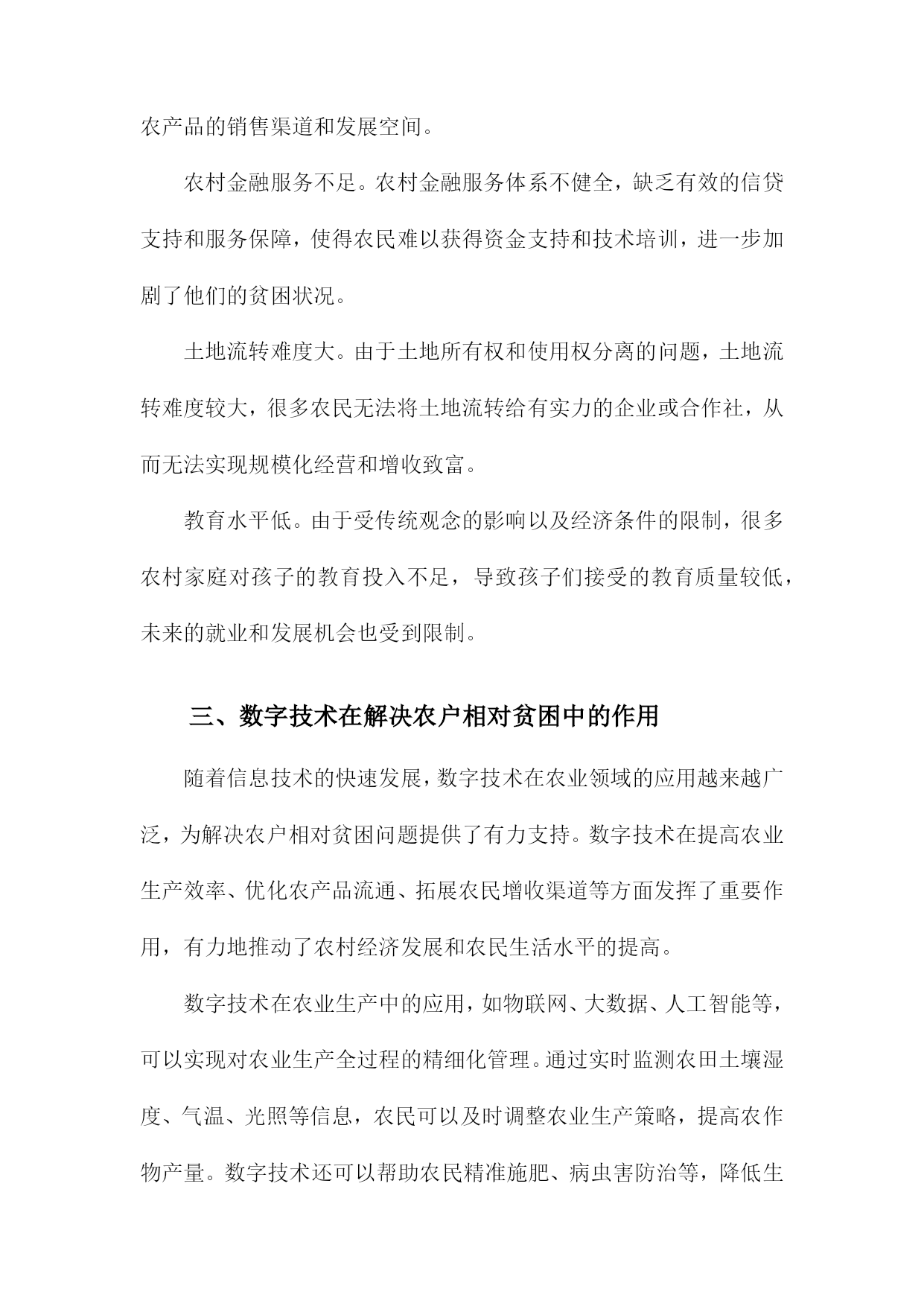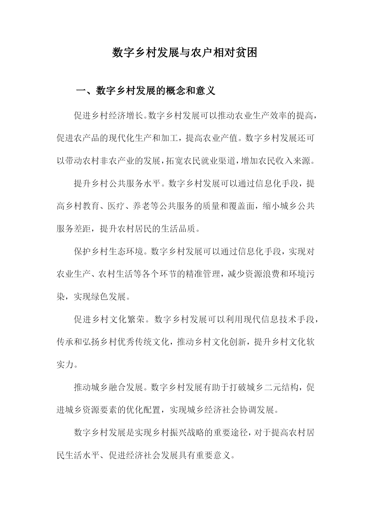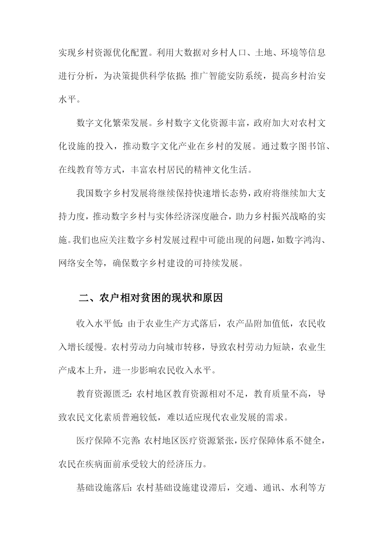 数字乡村发展与农户相对贫困一、数字乡村发展的概念和意义促进乡村经济增长。数字乡村发展可以推动农业生产效率的提高,促进农产品的现代化生产和加工,提高农业产值。数字乡村发展还可以带动农村非农产业的发展,拓宽农民就业渠道,增加农民收入来源。提升乡村公共服务水平。数字乡村发展可以通过信息化手段,提高乡村教育、医疗、养老等公共服务的质量和覆盖面,缩小城乡公共服务差距,提升农村居民的生活品质。保护乡村生态环境。数字乡村发展可以通过信息化手段,实现对农业生产、农村生活等各个环节的精准管理,减少资源浪费和环境污染,实现绿色发展。促进乡村文化繁荣。数字乡村发展可以利用现代信息技术手段,传承和弘扬乡村优秀传统文化,推动乡村文化创新,提升乡村文化软实力。推动城乡融合发展。数字乡村发展有助于打破城乡二元结构,促进城乡资源要素的优化配置,实现城乡经济社会协调发展。数字乡村发展是实现乡村振兴战略的重要途径,对于提高农村居民生活水平、促进经济社会发展具有重要意义。1.数字乡村发展的定义和内涵信息技术的应用:数字乡村发展强调运用现代信息技术,如物联网、云计算、大数据、人工智能等,改造农业生产、农村管理和农村服务等领域,提高农业科技水平和农业生产效率。互联网的普及:数字乡村发展要求加快农村宽带网络建设,提高农村居民的网络覆盖率和使用率,促进农村电子商务、在线教育、远程医疗等新型业态的发展,缩小城乡数字鸿沟。农业产业结构的优化:数字乡村发展着眼于推动农业产业结构调整,发展现代农业,培育新产业、新业态,提高农业附加值,实现农业可持续发展。农村公共服务水平的提升:数字乡村发展旨在通过信息化手段提高农村公共服务水平,包括教育、卫生、社会保障等方面,改善农民生活质量,促进农村社会和谐稳定。农村治理体系和治理能力现代化:数字乡村发展强调运用现代信息技术手段,加强农村基层组织建设,提高农村治理能力和水平,构建有效的乡村治理体系。数字乡村发展是一种以科技创新为核心,以提高农业生产效率、优化农村产业结构、改善农民生活质量为目标的全面发展模式,是实现农业农村现代化的重要途径。2.数字乡村发展的意义和作用数字乡村发展是指利用信息技术手段,推动农村经济社会的现代化、智能化和可持续发展。在当前全球经济一体化和信息化的大背景下,数字乡村发展具有重要意义和作用。数字乡村发展有助于提高农业生产效率,通过运用大数据、云计算、物联网等技术手段,实现农业生产的精准管理、智能决策和资源优化配置,从而提高农业生产效率,增加农民收入。通过智能农业系统,可以实时监测农田土壤湿度、温度等环境信息,为农业生产提供科学依据;通过无人机巡检,可以快速发现病虫害等问题,提高防治效果。数字乡村发展有助于提升农村公共服务水平,通过建设数字化基础设施,如宽带网络、移动通信基站等,实现农村公共服务的便捷化、高效化。通过远程医疗系统,可以让农村居民享受到优质的医疗服务;通过在线教育平台,可以解决农村孩子接受优质教育的问题。数字乡村发展有助于促进农村产业结构调整和升级,通过发展电子商务、互联网金融等新兴产业,推动农村产业结构的优化和转型升级。通过电商平台,可以将农产品销售到全国各地,拓宽销售渠道;通过互联网金融,可以为农民提供贷款、保险等金融服务,降低融资成本。数字乡村发展有助于实现城乡融合发展,通过推动数字乡村建设,缩小城乡之间的数字鸿沟,促进资源要素在城乡间的合理流动和配置。通过发展智慧农业,可以吸引城市人才回乡创业,带动乡村经济发展;通过建设数字化村庄,可以促进农村旅游、文化等产业发展,提高农民生活水平。数字乡村发展对于提高农业生产效率、提升农村公共服务水平、促进农村产业结构调整和升级以及实现城乡融合发展具有重要意义和作用。3.数字乡村发展的现状和趋势基础设施建设不断完善。政府加大投入,推动农村宽带网络、移动通信等基础设施建设,提高农村居民的信息化水平。我国农村宽带网络覆盖率已经超过98,农村移动通信用户数量达到亿户。数字农业蓬勃发展。利用大数据、云计算、物联网等技术,农业生产效率得到显著提高。通过智能农业大棚、无人机等设备,实现精准施肥、病虫害防治等功能,降低农业生产成本,提高农产品质量。电子商务助力乡村经济发展。电商平台如阿里巴巴、京东等纷纷进入农村市场,为农民提供便捷的销售渠道。政府还推出一系列扶持政策,鼓励农村电商发展,带动农民增收致富。智慧乡村建设逐步推进。通过数字化技术,提升乡村治理能力,实现乡村资源优化配置。利用大数据对乡村人口、土地、环境等信息进行分析,为决策提供科学依据;推广智能安防系统,提高乡村治安水平。数字文化繁荣发展。乡村数字文化资源丰富,政府加大对农村文化设施的投入,推动数字文化产业在乡村的发展。通过数字图书馆、在线教育等方式,丰富农村居民的