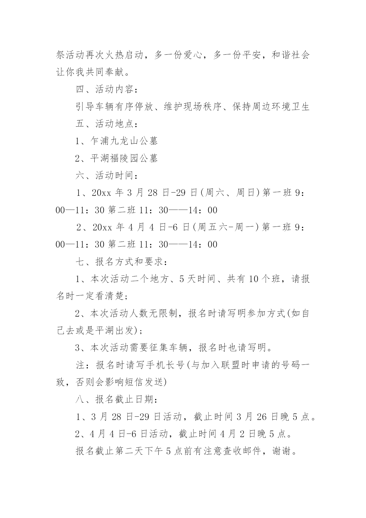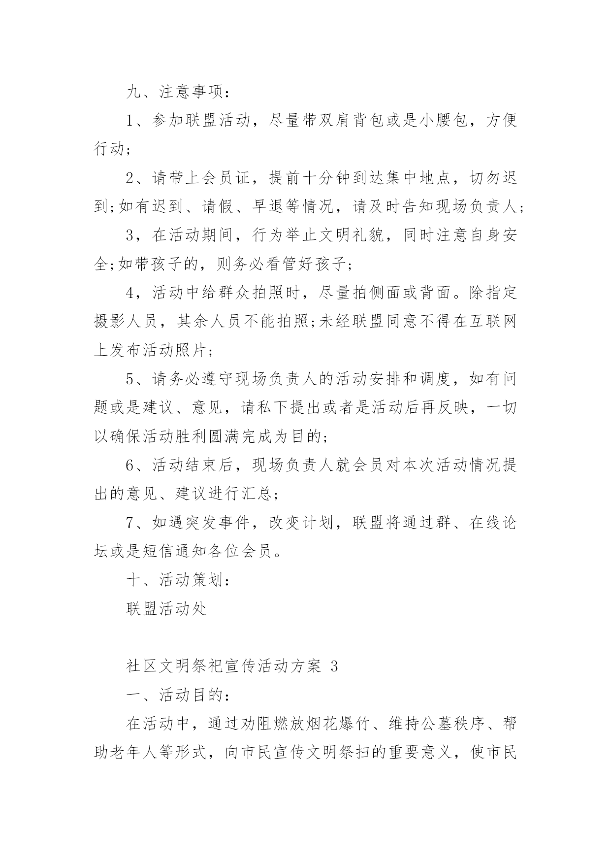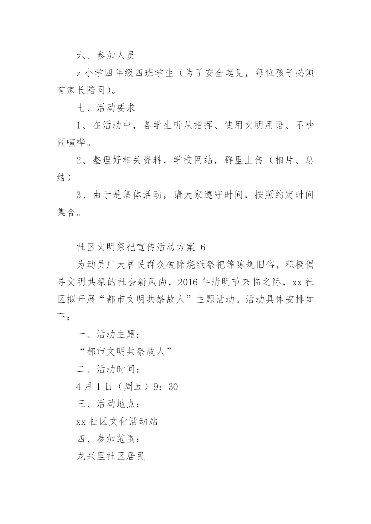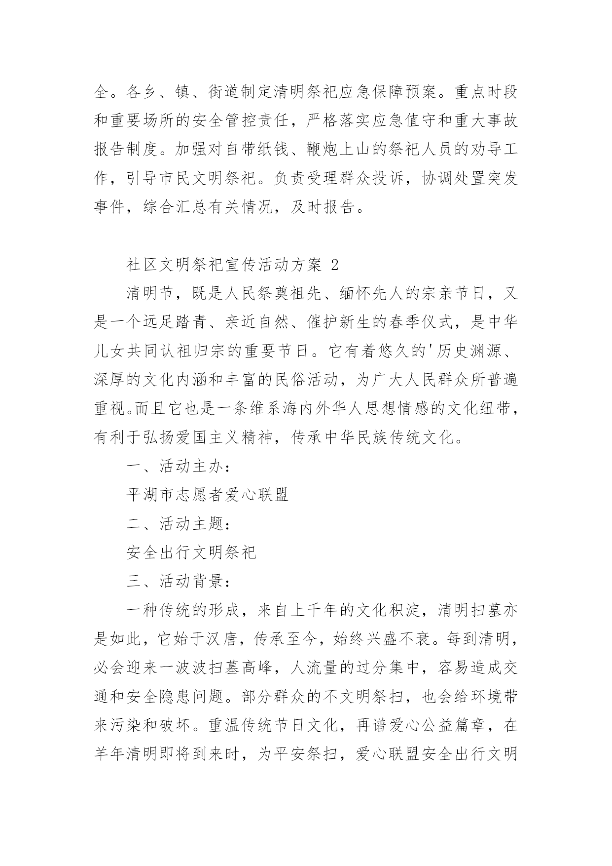 社区文明祭祀宣传活动方案社区文明祭祀宣传活动方案(精选12篇)为了确保活动科学有序进行,往往需要预先制定好活动方案,活动方案是为某一活动所制定的,包括具体行动实施办法细则,步骤等。活动方案要怎么制定呢?下面是小编帮大家整理的社区文明祭祀宣传活动方案,希望对大家有所帮助。社区文明祭祀宣传活动方案1为认真落实民政部等九部委局《关于推行节地生态安葬的指导意见》,确保我区清明祭祀活动安全、有序,充分利用清明节有利时机,开展文明殡葬祭祀新风,根据市民政局要求,结合我区实际,特制定本方案。一、指导思想紧紧围绕"文明祭扫、生态安葬"的主题,开展好清明节祭祀和殡葬改革系列宣传工作,进一步推行节地生态安葬和推动全区殡改工作,倡导厚养薄葬、文明祭祀新风;确保清明节期间人民群众祭祀活动安全顺畅、文明有序。二、时间安排3月15日至4月15日。三、具体措施加大宣传力度。(一)网络、媒体宣传。在《珠晖新闻网》、《党政门户网》,在《珠晖手机报》、设立清明节文明祭祀主题宣传。采访报道清明节宣传活动开展情况,宣传市民文明祭扫和党员干部带头推进殡葬改革正面典型。(二)设点宣传。清明节前,和市殡改办在以下五个人口密集的.街道设点宣传:苗圃的大华社区、建湘机械厂家属区、冶金街道友爱里社区、二七二厂家属区、武广车站广场。主要宣传内容为发放宣传资料、播放殡改纪录片、摆放展版、悬挂横幅等联动开展宣传(相关资料由市殡改办提供);依托宣传点开展问卷调查,收集市民对殡改工作的建议和意见;以"文明殡葬,从我做起"为主题,组织市民开展签名活动;在社区张贴《通告》、《告示》和《倡议书》。集中宣传时间为3月29日至4月1日(4天)。四、工作要求(一)提高认识,加强领导。各乡、镇、街道民政办要加强对殡葬工作的领导,充分认识开展殡葬改革系列宣传活动、做好清明节祭扫安全保障工作的重要性,及早部署,认真落实。把宣传教育工作作为清明节祭扫工作的一项重要工作来抓,按照《方案》要求,抓实抓细,抓出成效。(二)认真部署,精心组织。各乡、镇、街道民政办要认真谋划、精心组织,做好与相关部门的衔接工作。确保殡改工作宣传月活动的成效和清明节祭扫工作的安全、文明。(三)做好安全和服务保障工作。一是防范拥堵和火灾事故。各单位要安排专人在祭祀公交沿途相应停靠点值班,配合交通部门维护安全秩序,确保祭扫通道畅通和祭祀区域安全。各乡、镇、街道制定清明祭祀应急保障预案。重点时段和重要场所的安全管控责任,严格落实应急值守和重大事故报告制度。加强对自带纸钱、鞭炮上山的祭祀人员的劝导工作,引导市民文明祭祀。负责受理群众投诉,协调处置突发事件,综合汇总有关情况,及时报告。社区文明祭祀宣传活动方案2清明节,既是人民祭奠祖先、缅怀先人的宗亲节日,又是一个远足踏青、亲近自然、催护新生的春季仪式,是中华儿女共同认祖归宗的重要节日。它有着悠久的'历史渊源、深厚的文化内涵和丰富的民俗活动,为广大人民群众所普遍重视。而且它也是一条维系海内外华人思想情感的文化纽带,有利于弘扬爱国主义精神,传承中华民族传统文化。一、活动主办:平湖市志愿者爱心联盟二、活动主题:安全出行文明祭祀三、活动背景:一种传统的形成,来自上千年的文化积淀,清明扫墓亦是如此,它始于汉唐,传承至今,始终兴盛不衰。每到清明,必会迎来一波波扫墓高峰,人流量的过分集中,容易造成交通和安全隐患问题。部分群众的不文明祭扫,也会给环境带来污染和破坏。重温传统节日文化,再谱爱心公益篇章,在羊年清明即将到来时,为平安祭扫,爱心联盟安全出行文明祭活动再次火热启动,多一份爱心,多一份平安,和谐社会让你我共同奉献。四、活动内容:引导车辆有序停放、维护现场秩序、保持周边环境卫生五、活动地点:1、乍浦九龙山公墓2、平湖福陵园公墓六、活动时间:1、20xx年3月28日-29日(周六、周日)第一班9:00—11:30第二班11:30——14:002、20xx年4月4日-6日(周五六-周一)第一班9:00—11:30第二班11:30——14:00七、报名方式和要求:1、本次活动二个地方、5天时间、共有10个班,请报名时一定看清楚;2、本次活动人数无限制,报名时请写明参加方式(如自己去或是平湖出发);3、本次活动需要征集车辆,报名时也请写明。注:报名时请写手机长号(与加入联盟时申请的号码一致,否则会影响短信发送)八、报名截止日期:1、3月28日-29日活动,截止时间3月26日晚5点。2、4月4日-6日活动,截止时间4月2日晚5点。报名截止第二天下午5点前有注意查收邮件,谢谢。九、注意事项:1、参加联盟活动,尽量带双肩背包或是小腰包,方便行动;2、请带上会员证,提前十分钟到达集中地点,切勿迟到;如有迟到、请假、早退等情况,请及时告知现场负责人;3,在活动期间,行为举止文明礼貌,同时注意自身安全;如带孩子的,则务必