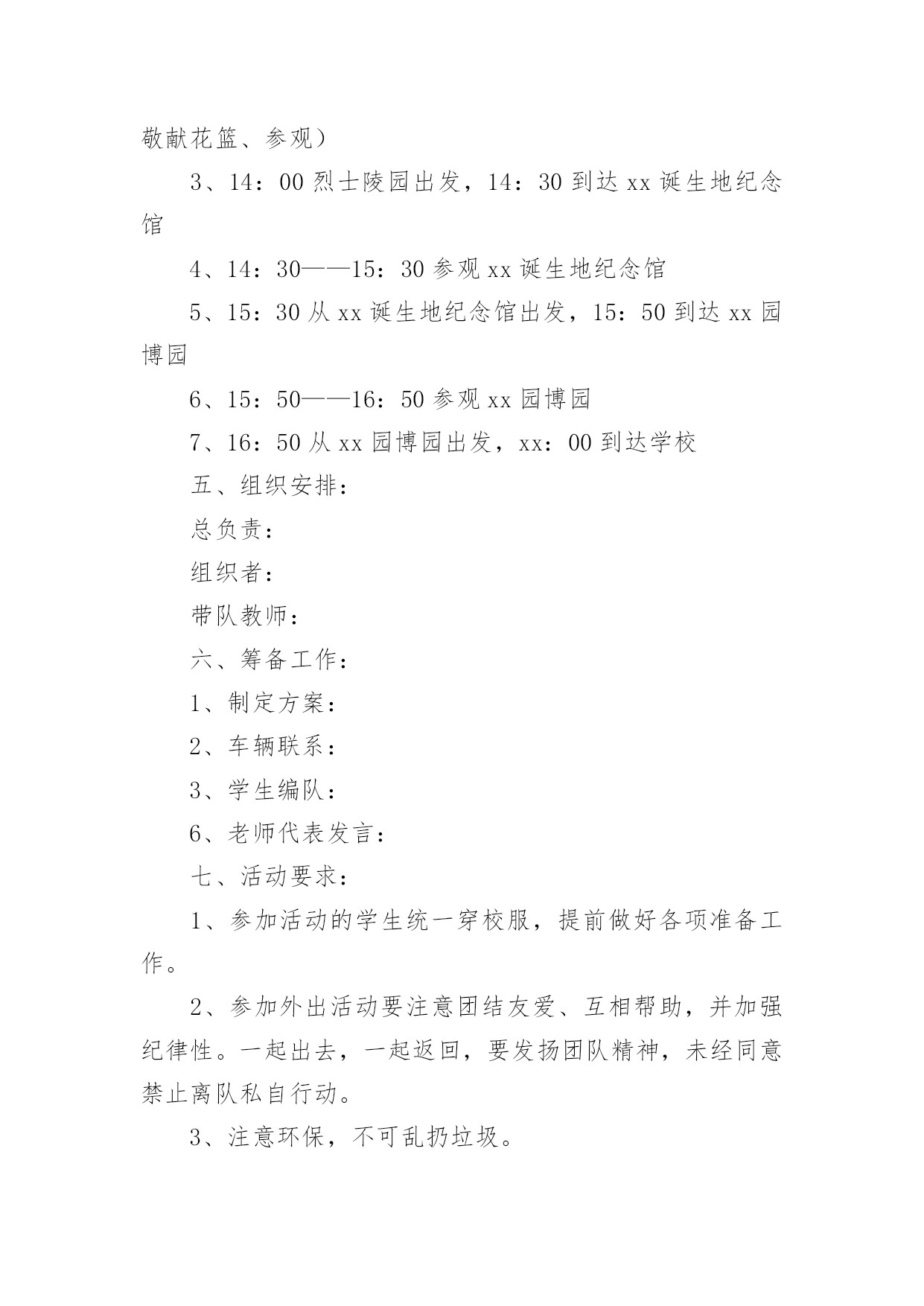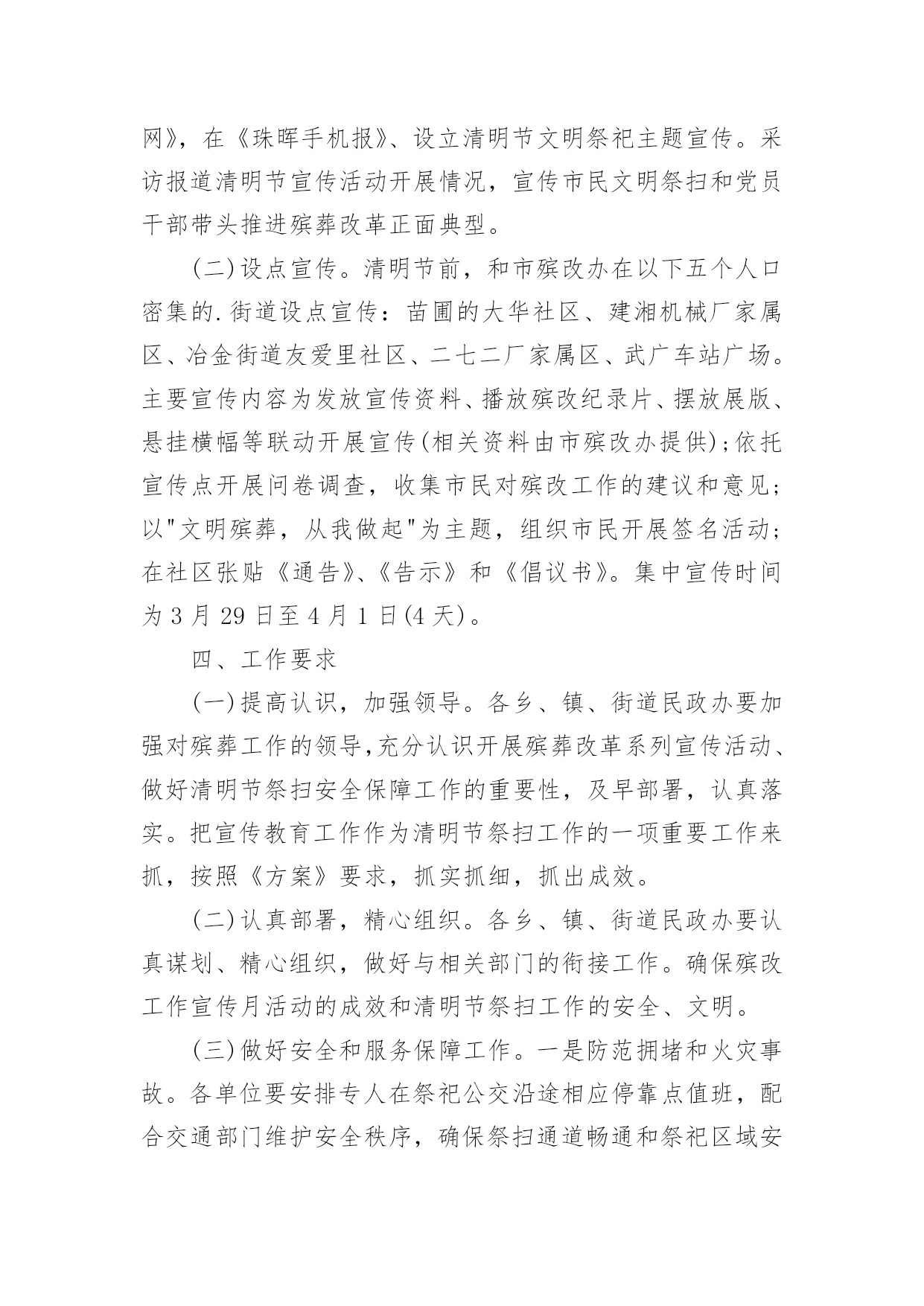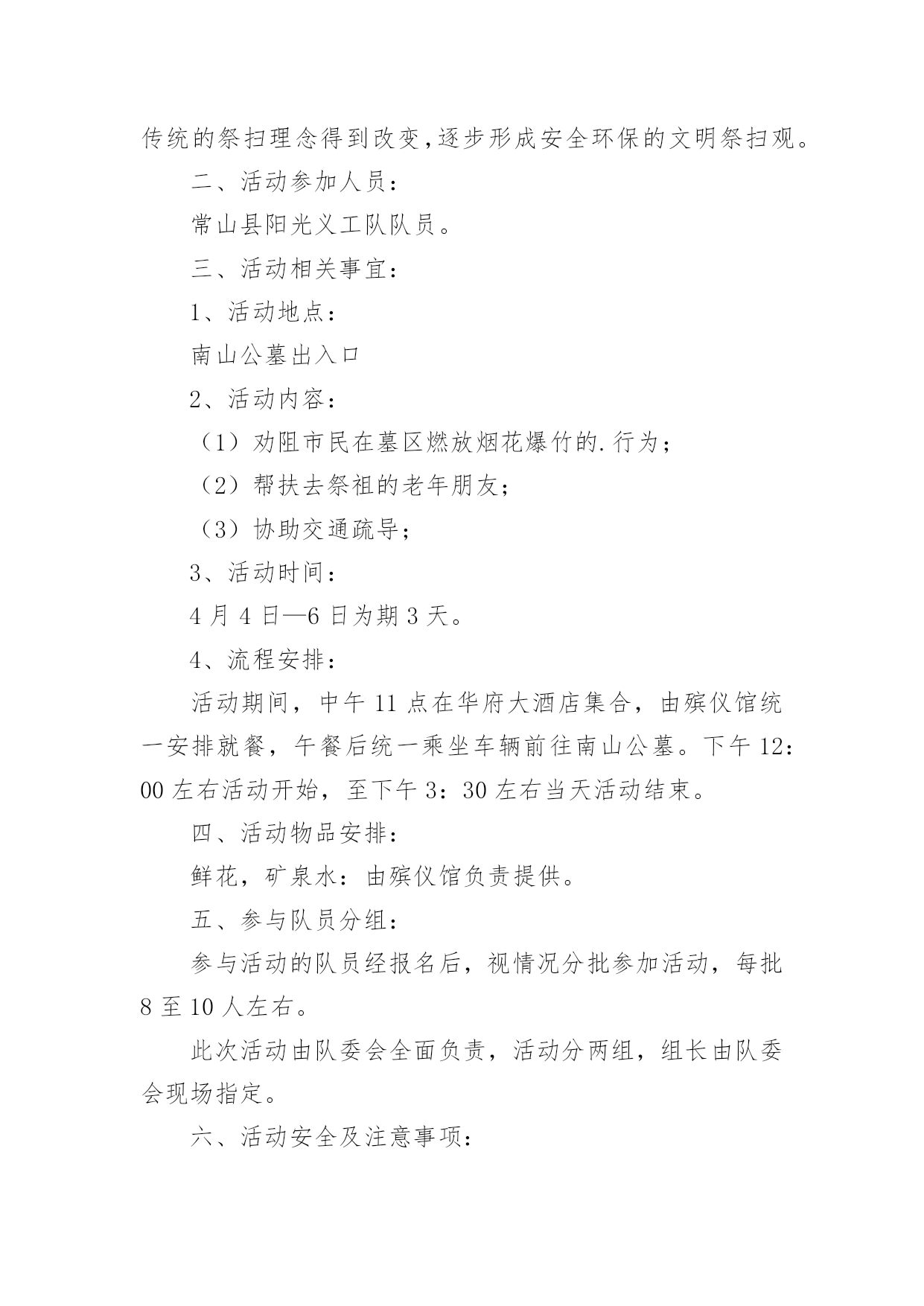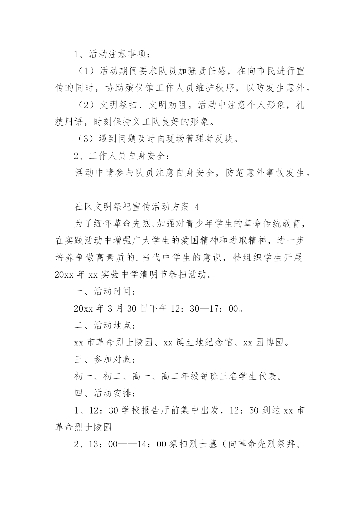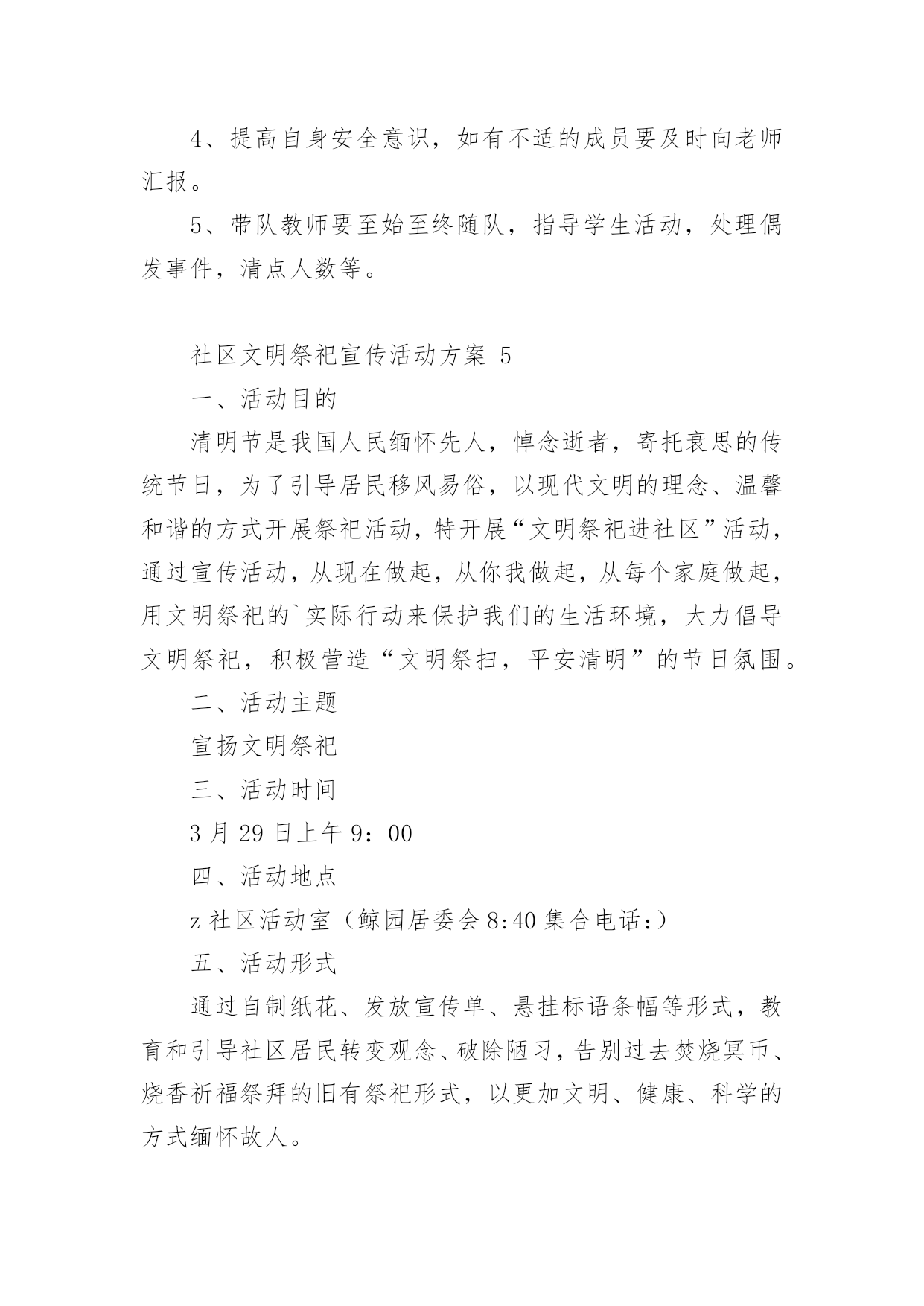 社区文明祭祀宣传活动方案社区文明祭祀宣传活动方案(精选12篇)为了确保活动科学有序进行,往往需要预先制定好活动方案,活动方案是为某一活动所制定的,包括具体行动实施办法细则,步骤等。活动方案要怎么制定呢?下面是小编帮大家整理的社区文明祭祀宣传活动方案,希望对大家有所帮助。社区文明祭祀宣传活动方案1为认真落实民政部等九部委局《关于推行节地生态安葬的指导意见》,确保我区清明祭祀活动安全、有序,充分利用清明节有利时机,开展文明殡葬祭祀新风,根据市民政局要求,结合我区实际,特制定本方案。一、指导思想紧紧围绕"文明祭扫、生态安葬"的主题,开展好清明节祭祀和殡葬改革系列宣传工作,进一步推行节地生态安葬和推动全区殡改工作,倡导厚养薄葬、文明祭祀新风;确保清明节期间人民群众祭祀活动安全顺畅、文明有序。二、时间安排3月15日至4月15日。三、具体措施加大宣传力度。(一)网络、媒体宣传。在《珠晖新闻网》、《党政门户网》,在《珠晖手机报》、设立清明节文明祭祀主题宣传。采访报道清明节宣传活动开展情况,宣传市民文明祭扫和党员干部带头推进殡葬改革正面典型。(二)设点宣传。清明节前,和市殡改办在以下五个人口密集的.街道设点宣传:苗圃的大华社区、建湘机械厂家属区、冶金街道友爱里社区、二七二厂家属区、武广车站广场。主要宣传内容为发放宣传资料、播放殡改纪录片、摆放展版、悬挂横幅等联动开展宣传(相关资料由市殡改办提供);依托宣传点开展问卷调查,收集市民对殡改工作的建议和意见;以"文明殡葬,从我做起"为主题,组织市民开展签名活动;在社区张贴《通告》、《告示》和《倡议书》。集中宣传时间为3月29日至4月1日(4天)。四、工作要求(一)提高认识,加强领导。各乡、镇、街道民政办要加强对殡葬工作的领导,充分认识开展殡葬改革系列宣传活动、做好清明节祭扫安全保障工作的重要性,及早部署,认真落实。把宣传教育工作作为清明节祭扫工作的一项重要工作来抓,按照《方案》要求,抓实抓细,抓出成效。(二)认真部署,精心组织。各乡、镇、街道民政办要认真谋划、精心组织,做好与相关部门的衔接工作。确保殡改工作宣传月活动的成效和清明节祭扫工作的安全、文明。(三)做好安全和服务保障工作。一是防范拥堵和火灾事故。各单位要安排专人在祭祀公交沿途相应停靠点值班,配合交通部门维护安全秩序,确保祭扫通道畅通和祭祀区域安全。各乡、镇、街道制定清明祭祀应急保障预案。重点时段和重要场所的安全管控责任,严格落实应急值守和重大事故报告制度。加强对自带纸钱、鞭炮上山的祭祀人员的劝导工作,引导市民文明祭祀。负责受理群众投诉,协调处置突发事件,综合汇总有关情况,及时报告。社区文明祭祀宣传活动方案2清明节,既是人民祭奠祖先、缅怀先人的宗亲节日,又是一个远足踏青、亲近自然、催护新生的春季仪式,是中华儿女共同认祖归宗的重要节日。它有着悠久的'历史渊源、深厚的文化内涵和丰富的民俗活动,为广大人民群众所普遍重视。而且它也是一条维系海内外华人思想情感的文化纽带,有利于弘扬爱国主义精神,传承中华民族传统文化。一、活动主办:平湖市志愿者爱心联盟二、活动主题:安全出行文明祭祀三、活动背景:一种传统的形成,来自上千年的文化积淀,清明扫墓亦是如此,它始于汉唐,传承至今,始终兴盛不衰。每到清明,必会迎来一波波扫墓高峰,人流量的过分集中,容易造成交通和安全隐患问题。部分群众的不文明祭扫,也会给环境带来污染和破坏。重温传统节日文化,再谱爱心公益篇章,在羊年清明即将到来时,为平安祭扫,爱心联盟安全出行文明祭活动再次火热启动,多一份爱心,多一份平安,和谐社会让你我共同奉献。四、活动内容:引导车辆有序停放、维护现场秩序、保持周边环境卫生五、活动地点:1、乍浦九龙山公墓2、平湖福陵园公墓六、活动时间:1、20xx年3月28日-29日(周六、周日)第一班9:00—11:30第二班11:30——14:002、20xx年4月4日-6日(周五六-周一)第一班9:00—11:30第二班11:30——14:00七、报名方式和要求:1、本次活动二个地方、5天时间、共有10个班,请报名时一定看清楚;2、本次活动人数无限制,报名时请写明参加方式(如自己去或是平湖出发);3、本次活动需要征集车辆,报名时也请写明。注:报名时请写手机长号(与加入联盟时申请的号码一致,否则会影响短信发送)八、报名截止日期:1、3月28日-29日活动,截止时间3月26日晚5点。2、4月4日-6日活动,截止时间4月2日晚5点。报名截止第二天下午5点前有注意查收邮件,谢谢。九、注意事项:1、参加联盟活动,尽量带双肩背包或是小腰包,方便行动;2、请带上会员证,提前十分钟到达集中地点,切勿迟到;如有迟到、请假、早退等情况,请及时告知现场负责人;3,在活动期间,行为举止文明礼貌,同时注意自身安全;如带孩子的,则务必