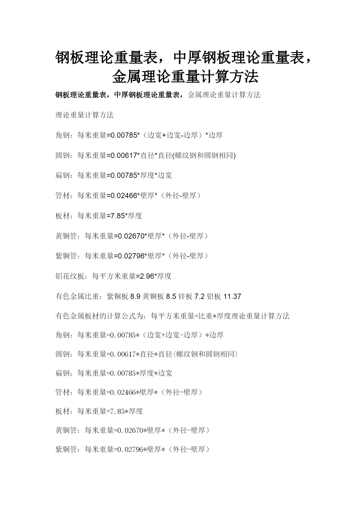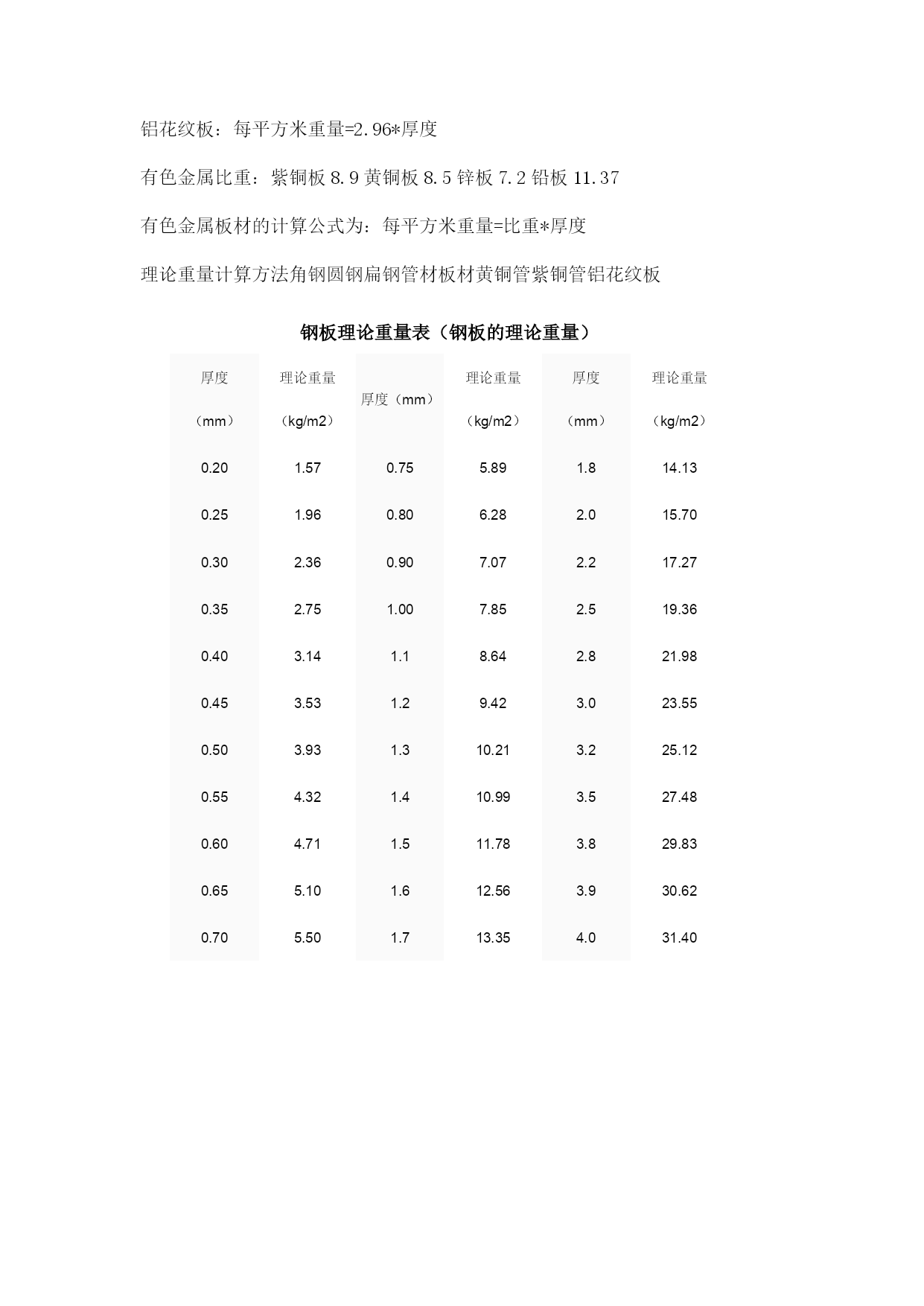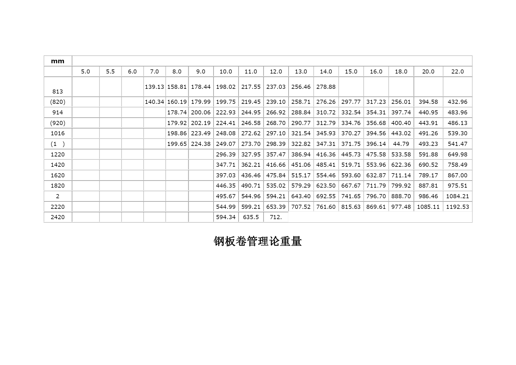 钢板卷管理论重量表优质资料(可以直接使用,可编辑优质资料,欢迎下载)钢板卷管理论重量表公称外径mm公称壁厚mm5.05.56.07.08.09.010.011.012.013.014.015.016.018.020.022.027333.0436.2839.5145.92323.939.3243.1847.0454.7062.3269.89(325)39.4643.3347.2654.9062.5470.13355.643.2347.4851.7360.1868.5776.92(377)45.8850.3954.8963.8772.8081.67406.449.4454.3259.2468.9478.6088.2097.75(426)51.9157.0362.1472.3382.4692.55102.5945755.7361.2466.7377.6988.5899.43110.23120.98131.60142.3450874.2886.4898.64110.75122.81134.82146.78158.69(529)77.3890.11102.78115.41127.99140.51152.99165.42(559)81.8295.29108.70122.07135.38148.65161.87175.0461089.37104.09118.76133.39147.96162.48176.96191.39(630)92.33107.54122.71137.82152.89167.91182.88197.80(660)96.77112.72128.63144.48160.29176.05191.76207.42711104.31121.52138.69155.80172.87189.88206.85223.76(720)105.64123.08140.46157.80175.09192.32209.51226.65(762)130.33148.75167.12185.44203.72221.94240.11258.24公称外径mm公称壁厚mm5.05.56.07.08.09.010.011.012.013.014.015.016.018.020.022.0813139.13158.81178.44198.02217.55237.03256.46278.88(820)140.34160.19179.99199.75219.45239.10258.71276.26297.77317.23256.01394.58432.96914178.74200.06222.93244.95266.92288.84310.72332.54354.31397.74440.95483.96(920)179.92202.19224.41246.58268.70290.77312.79334.76356.68400.40443.91486.131016198.86223.49248.08272.62297.10321.54345.93370.27394.56443.02491.26539.30(1)199.65224.38249.07273.70298.39322.82347.31371.75396.1444.79493.23541.471220296.39327.95357.47386.94416.36445.73475.58533.58591.88649.981420347.71362.21416.66451.06485.41519.71553.96622.36690.52758.491620397.03436.46475.84515.17554.46593.60632.87711.14789.17867.001820446.35490.71535.02579.29623.50667.67711.79799.92887.81975.512495.67544.96594.21643.40692.55741.65796.70888.70986.461084.212220544.99599.21653.39707.52761.60815.63869.61977.481085.111192.532420594.34635.5712.钢板卷管理论重量钢板理论重量表,中厚钢板理论重量表,金属理论重量计算方法钢板理论重量表,中厚钢板理论重量表,金属理论重量计算方法理论重量计算方法角钢:每米重量=0.00785*(边宽+边宽-边厚)*边厚圆钢:每米重量=0.00617*直径*直径(螺纹钢和圆钢相同)扁钢:每米重量=0.00785*厚度*边宽管材:每米重量=0.02466*壁厚*(外径-壁厚)板材:每米重量=7.85*厚度黄铜管