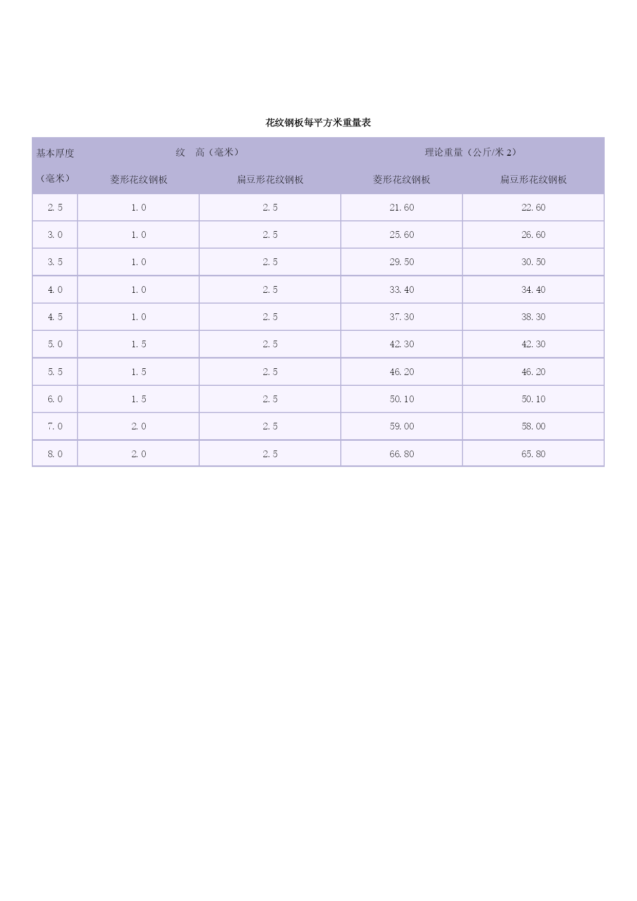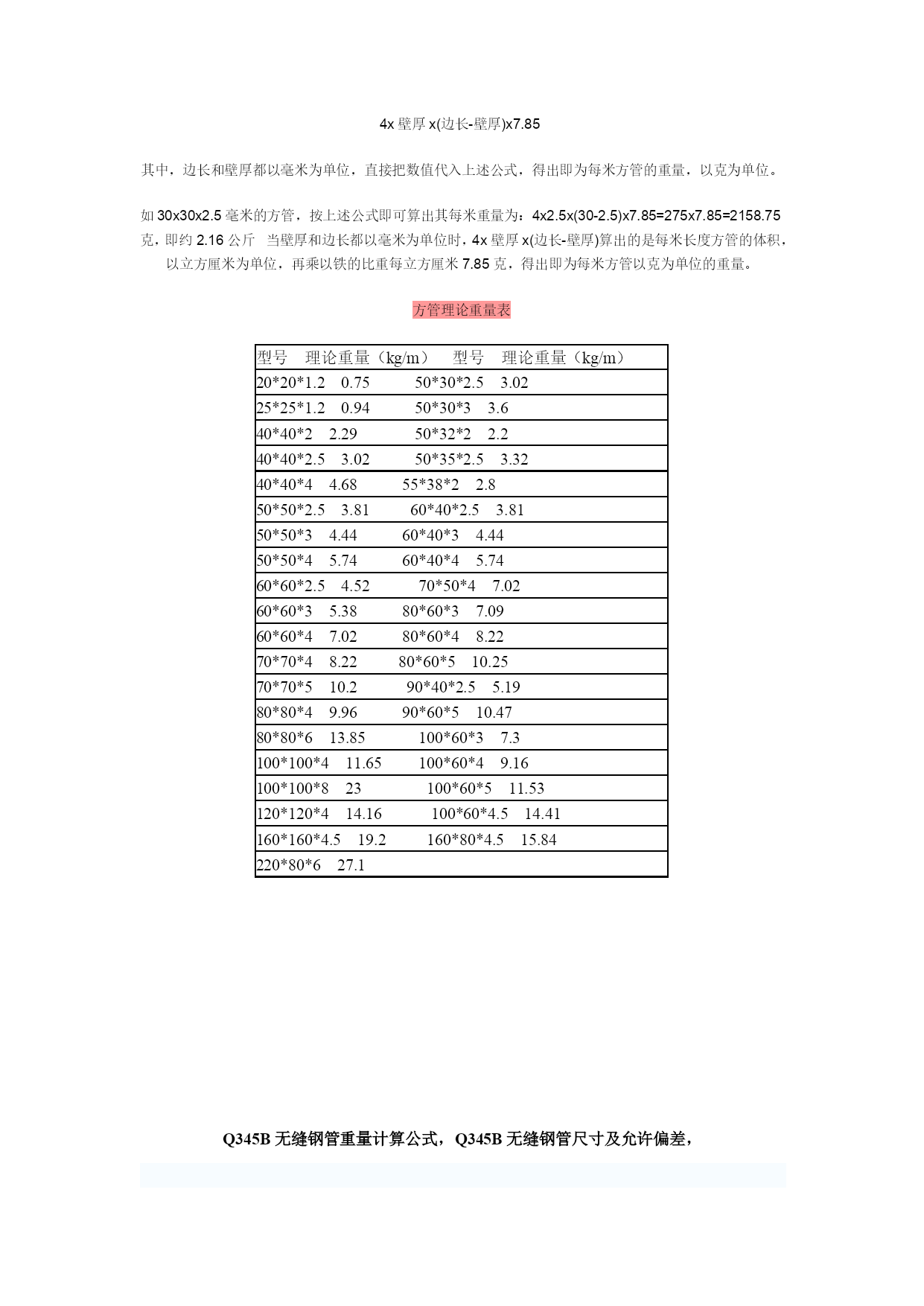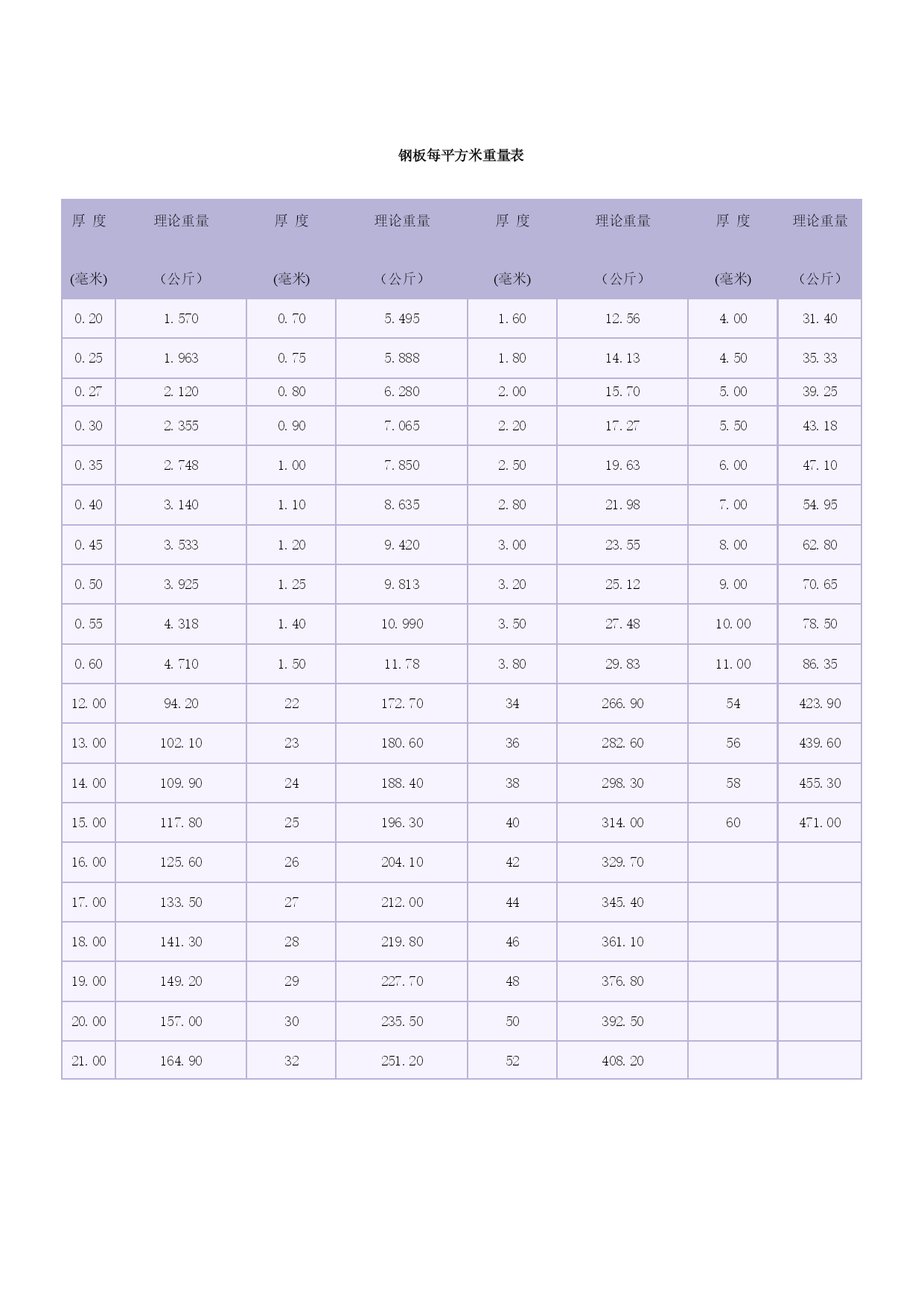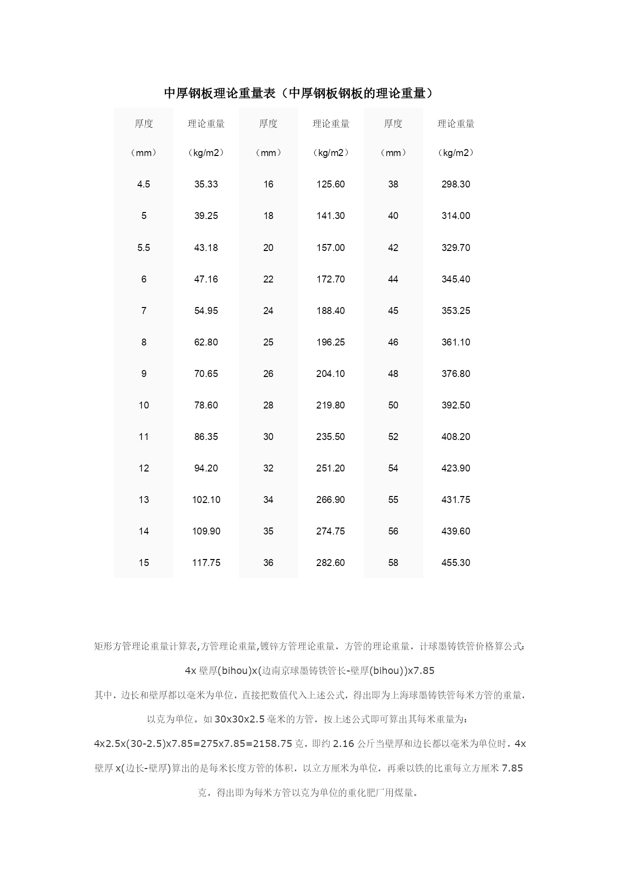钢板卷管理论重量表优质资料(可以直接使用,可编辑优质资料,欢迎下载)钢板卷管理论重量表公称外径mm公称壁厚mm5.05.56.07.08.09.010.011.012.013.014.015.016.018.020.022.027333.0436.2839.5145.92323.939.3243.1847.0454.7062.3269.89(325)39.4643.3347.2654.9062.5470.13355.643.2347.4851.7360.1868.5776.92(377)45.8850.3954.8963.8772.8081.67406.449.4454.3259.2468.9478.6088.2097.75(426)51.9157.0362.1472.3382.4692.55102.5945755.7361.2466.7377.6988.5899.43110.23120.98131.60142.3450874.2886.4898.64110.75122.81134.82146.78158.69(529)77.3890.11102.78115.41127.99140.51152.99165.42(559)81.8295.29108.70122.07135.38148.65161.87175.0461089.37104.09118.76133.39147.96162.48176.96191.39(630)92.33107.54122.71137.82152.89167.91182.88197.80(660)96.77112.72128.63144.48160.29176.05191.76207.42711104.31121.52138.69155.80172.87189.88206.85223.76(720)105.64123.08140.46157.80175.09192.32209.51226.65(762)130.33148.75167.12185.44203.72221.94240.11258.24公称外径mm公称壁厚mm5.05.56.07.08.09.010.011.012.013.014.015.016.018.020.022.0813139.13158.81178.44198.02217.55237.03256.46278.88(820)140.34160.19179.99199.75219.45239.10258.71276.26297.77317.23256.01394.58432.96914178.74200.06222.93244.95266.92288.84310.72332.54354.31397.74440.95483.96(920)179.92202.19224.41246.58268.70290.77312.79334.76356.68400.40443.91486.131016198.86223.49248.08272.62297.10321.54345.93370.27394.56443.02491.26539.30(1)199.65224.38249.07273.70298.39322.82347.31371.75396.1444.79493.23541.471220296.39327.95357.47386.94416.36445.73475.58533.58591.88649.981420347.71362.21416.66451.06485.41519.71553.96622.36690.52758.491620397.03436.46475.84515.17554.46593.60632.87711.14789.17867.001820446.35490.71535.02579.29623.50667.67711.79799.92887.81975.512495.67544.96594.21643.40692.55741.65796.70888.70986.461084.212220544.99599.21653.39707.52761.60815.63869.61977.481085.111192.532420594.34635.5712.钢板卷管理论重量钢板理论重量表,中厚钢板理论重量表,金属理论重量计算方法钢板理论重量表,中厚钢板理论重量表,金属理论重量计算方法理论重量计算方法角钢:每米重量=0.00785*(边宽+边宽-边厚)*边厚圆钢:每米重量=0.00617*直径*直径(螺纹钢和圆钢相同)扁钢:每米重量=0.00785*厚度*边宽管材:每米重量=0.02466*壁厚*(外径-壁厚)板材:每米重量=7.85*厚度黄铜管