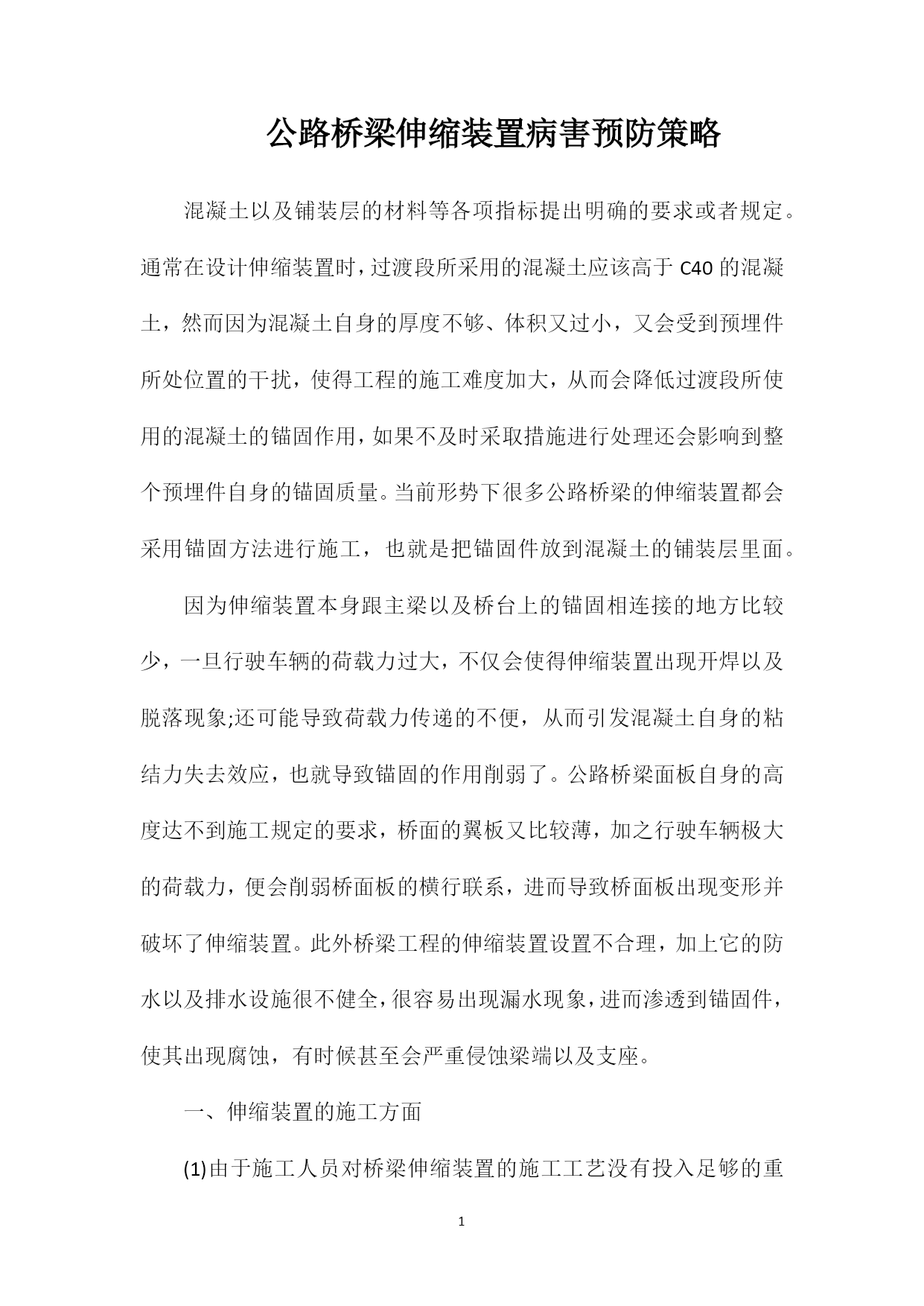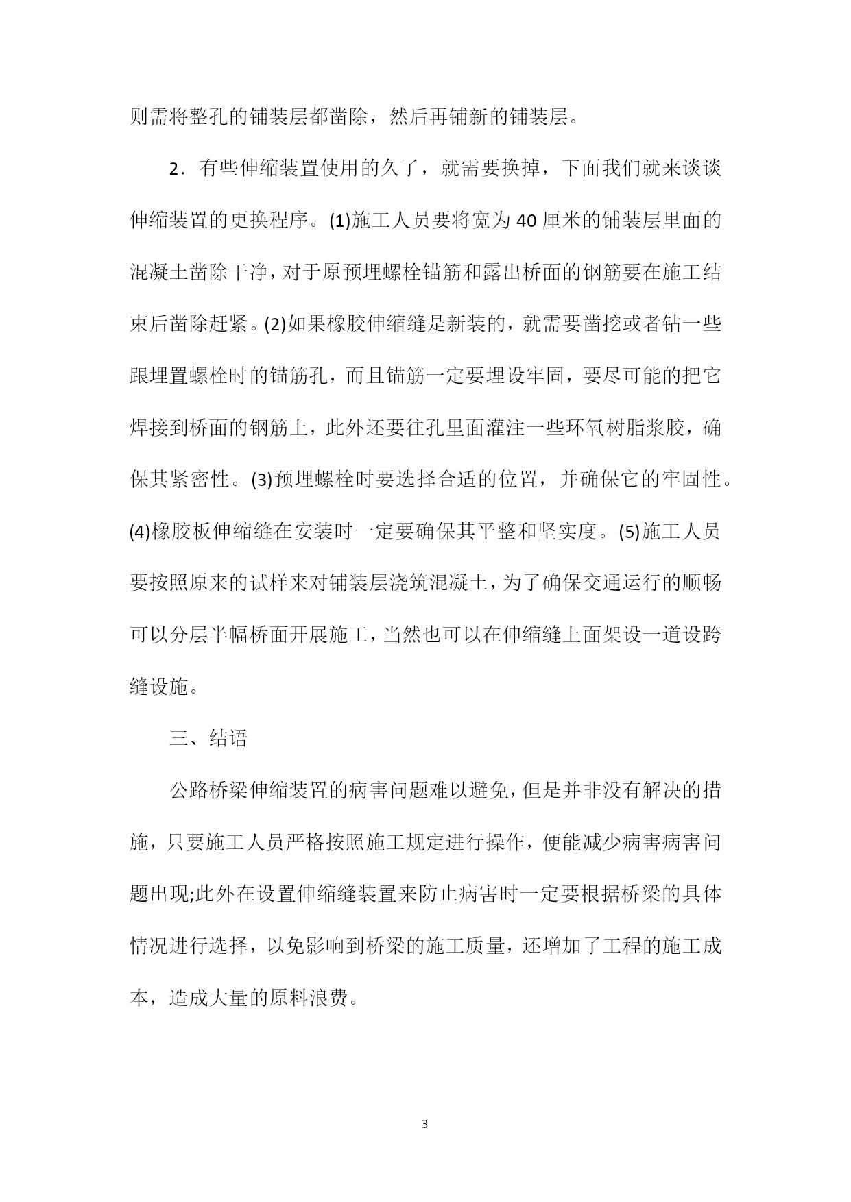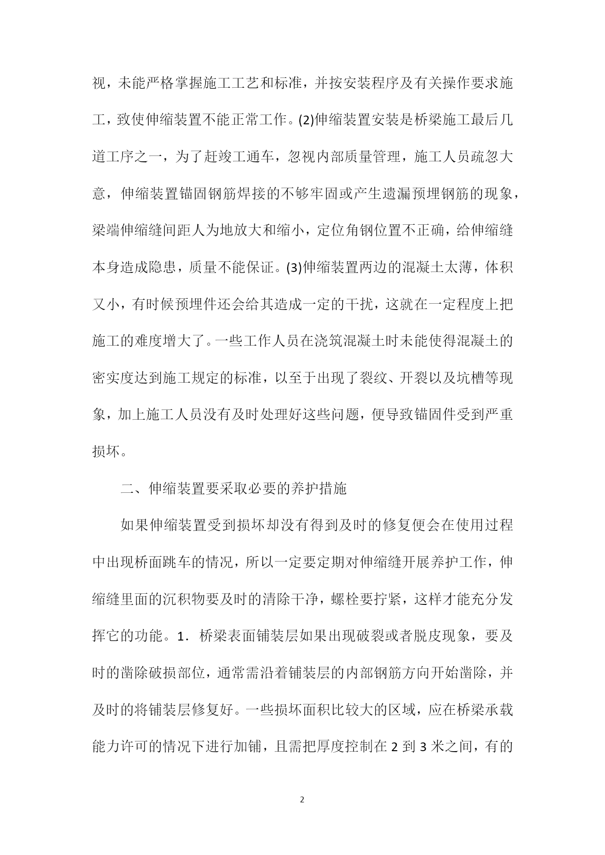 PAGEPAGE3公路桥梁伸缩装置病害预防策略混凝土以及铺装层的材料等各项指标提出明确的要求或者规定。通常在设计伸缩装置时,过渡段所采用的混凝土应该高于C40的混凝土,然而因为混凝土自身的厚度不够、体积又过小,又会受到预埋件所处位置的干扰,使得工程的施工难度加大,从而会降低过渡段所使用的混凝土的锚固作用,如果不及时采取措施进行处理还会影响到整个预埋件自身的锚固质量。当前形势下很多公路桥梁的伸缩装置都会采用锚固方法进行施工,也就是把锚固件放到混凝土的铺装层里面。因为伸缩装置本身跟主梁以及桥台上的锚固相连接的地方比较少,一旦行驶车辆的荷载力过大,不仅会使得伸缩装置出现开焊以及脱落现象;还可能导致荷载力传递的不便,从而引发混凝土自身的粘结力失去效应,也就导致锚固的作用削弱了。公路桥梁面板自身的高度达不到施工规定的要求,桥面的翼板又比较薄,加之行驶车辆极大的荷载力,便会削弱桥面板的横行联系,进而导致桥面板出现变形并破坏了伸缩装置。此外桥梁工程的伸缩装置设置不合理,加上它的防水以及排水设施很不健全,很容易出现漏水现象,进而渗透到锚固件,使其出现腐蚀,有时候甚至会严重侵蚀梁端以及支座。一、伸缩装置的施工方面(1)由于施工人员对桥梁伸缩装置的施工工艺没有投入足够的重视,未能严格掌握施工工艺和标准,并按安装程序及有关操作要求施工,致使伸缩装置不能正常工作。(2)伸缩装置安装是桥梁施工最后几道工序之一,为了赶竣工通车,忽视内部质量管理,施工人员疏忽大意,伸缩装置锚固钢筋焊接的不够牢固或产生遗漏预埋钢筋的现象,梁端伸缩缝间距人为地放大和缩小,定位角钢位置不正确,给伸缩缝本身造成隐患,质量不能保证。(3)伸缩装置两边的混凝土太薄,体积又小,有时候预埋件还会给其造成一定的干扰,这就在一定程度上把施工的难度增大了。一些工作人员在浇筑混凝土时未能使得混凝土的密实度达到施工规定的标准,以至于出现了裂纹、开裂以及坑槽等现象,加上施工人员没有及时处理好这些问题,便导致锚固件受到严重损坏。二、伸缩装置要采取必要的养护措施如果伸缩装置受到损坏却没有得到及时的修复便会在使用过程中出现桥面跳车的情况,所以一定要定期对伸缩缝开展养护工作,伸缩缝里面的沉积物要及时的清除干净,螺栓要拧紧,这样才能充分发挥它的功能。1.桥梁表面铺装层如果出现破裂或者脱皮现象,要及时的凿除破损部位,通常需沿着铺装层的内部钢筋方向开始凿除,并及时的将铺装层修复好。一些损坏面积比较大的区域,应在桥梁承载能力许可的情况下进行加铺,且需把厚度控制在2到3米之间,有的则需将整孔的铺装层都凿除,然后再铺新的铺装层。2.有些伸缩装置使用的久了,就需要换掉,下面我们就来谈谈伸缩装置的更换程序。(1)施工人员要将宽为40厘米的铺装层里面的混凝土凿除干净,对于原预埋螺栓锚筋和露出桥面的钢筋要在施工结束后凿除赶紧。(2)如果橡胶伸缩缝是新装的,就需要凿挖或者钻一些跟埋置螺栓时的锚筋孔,而且锚筋一定要埋设牢固,要尽可能的把它焊接到桥面的钢筋上,此外还要往孔里面灌注一些环氧树脂浆胶,确保其紧密性。(3)预埋螺栓时要选择合适的位置,并确保它的牢固性。(4)橡胶板伸缩缝在安装时一定要确保其平整和坚实度。(5)施工人员要按照原来的试样来对铺装层浇筑混凝土,为了确保交通运行的顺畅可以分层半幅桥面开展施工,当然也可以在伸缩缝上面架设一道设跨缝设施。三、结语公路桥梁伸缩装置的病害问题难以避免,但是并非没有解决的措施,只要施工人员严格按照施工规定进行操作,便能减少病害病害问题出现;此外在设置伸缩缝装置来防止病害时一定要根据桥梁的具体情况进行选择,以免影响到桥梁的施工质量,还增加了工程的施工成本,造成大量的原料浪费。