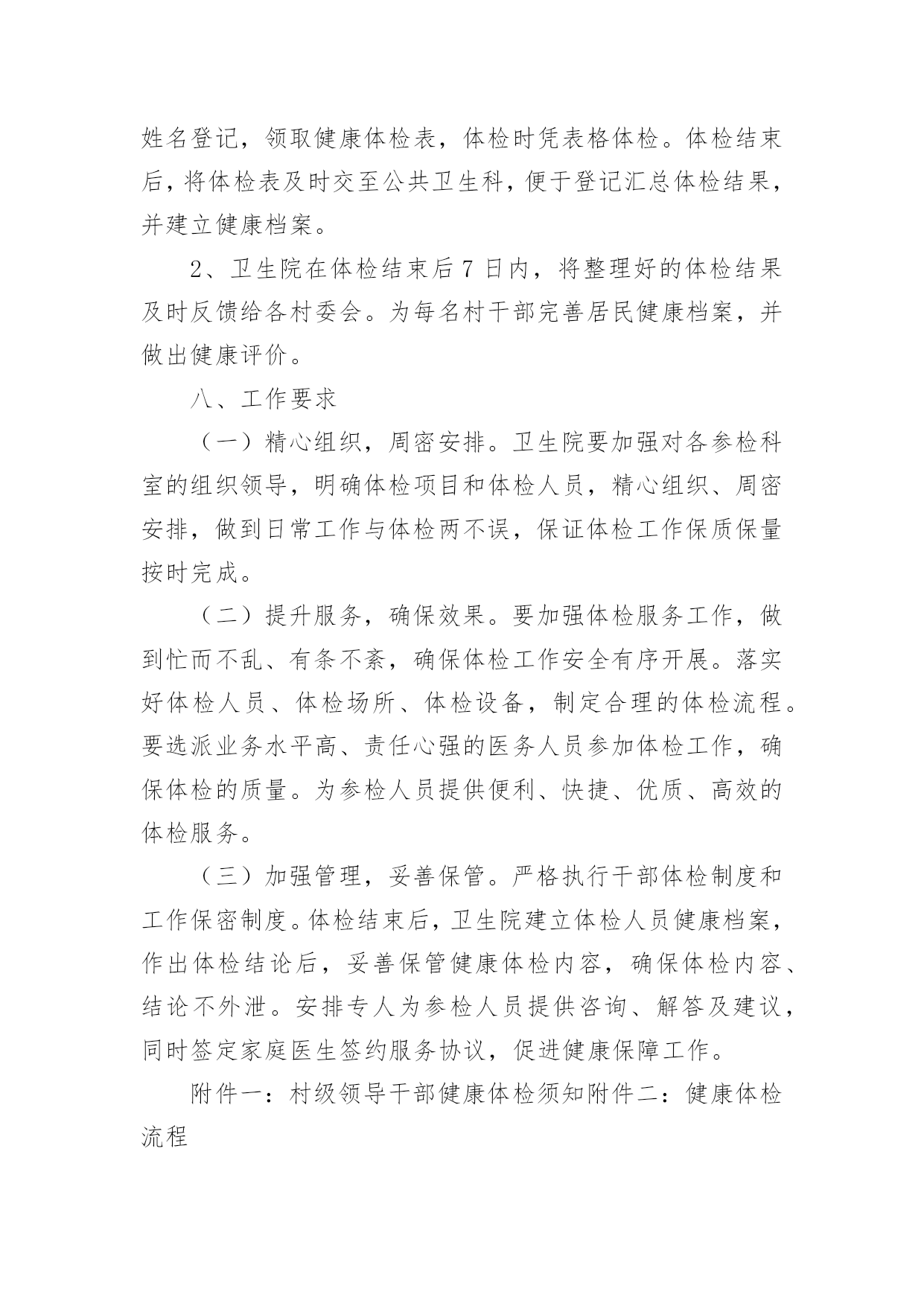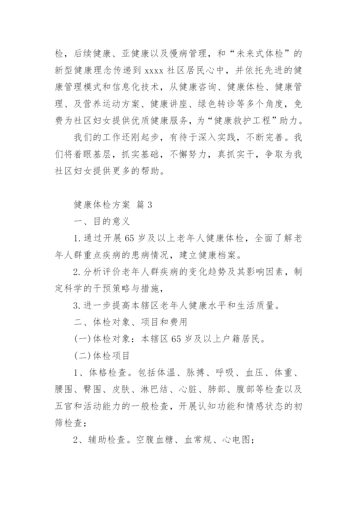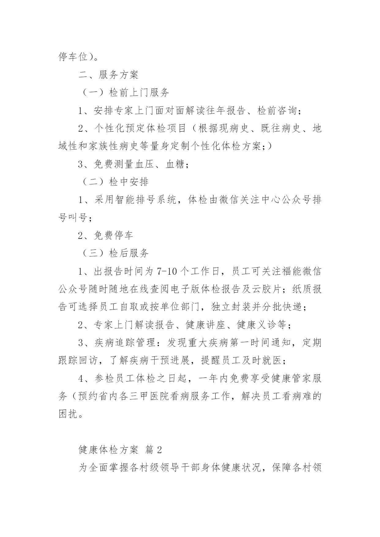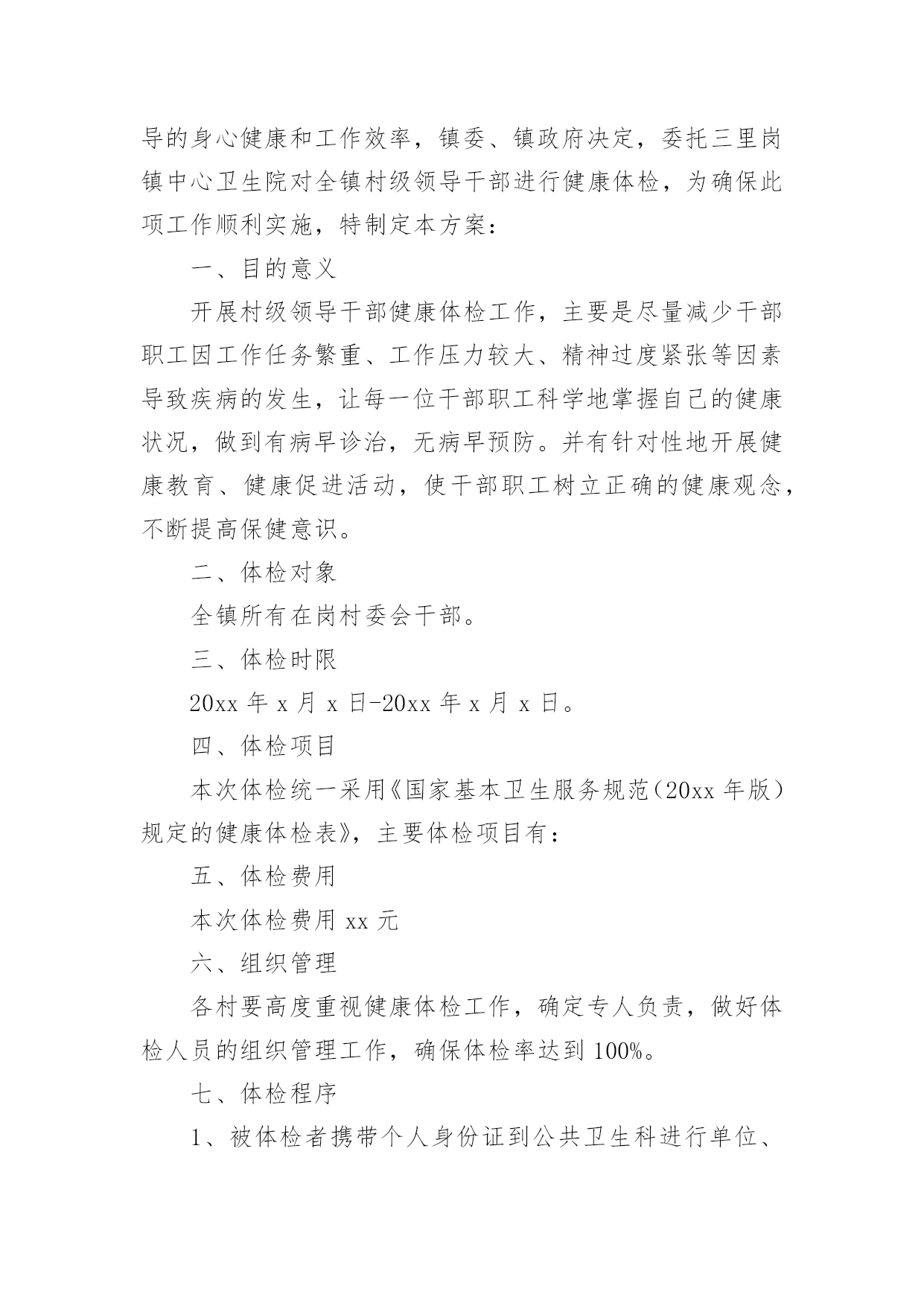 健康体检方案健康体检方案(通用21篇)为了保障事情或工作顺利、圆满进行,我们需要事先制定方案,方案是解决一个问题或者一项工程,一个课题的详细过程。方案的格式和要求是什么样的呢?以下是小编为大家整理的健康体检方案,欢迎大家借鉴与参考,希望对大家有所帮助。健康体检方案篇1一、体检卡优惠说明体检卡:长期有效、不限使用次数、不限本人1、分层体检2楼男宾区、3楼女宾区、4楼及5楼贵宾区,7楼独立的检验中心,充分保护隐私;2、体检卡充值享受?折优惠增值3、超出卡内金额项目可再享受?折优惠,现场以现金、医保卡、微信、支付宝或银行卡、信用卡方式缴费;4、家属自费体检整体享受7折优惠,家属不限人数;5、参检员工体检之日起,一年内免费享受健康管家服务(预约省内各三甲医院知名专家看病服务,解决员工看病难的困扰);6、体检卡丢失需凭借体检者身份证补办,中心一楼收费窗口办理;7、免费停车(中心大楼背后60个停车位、酒店300个停车位)。二、服务方案(一)检前上门服务1、安排专家上门面对面解读往年报告、检前咨询;2、个性化预定体检项目(根据现病史、既往病史、地域性和家族性病史等量身定制个性化体检方案;)3、免费测量血压、血糖;(二)检中安排1、采用智能排号系统,体检由微信关注中心公众号排号叫号;2、免费停车(三)检后服务1、出报告时间为7-10个工作日,员工可关注福能微信公众号随时随地在线查阅电子版体检报告及云胶片;纸质报告可选择员工自取或按单位部门,独立封装并分批快递;2、专家上门解读报告、健康讲座、健康义诊等;3、疾病追踪管理:发现重大疾病第一时间通知,定期跟踪回访,了解疾病干预进展,提醒员工及时就医;4、参检员工体检之日起,一年内免费享受健康管家服务(预约省内各三甲医院看病服务工作,解决员工看病难的困扰。健康体检方案篇2为全面掌握各村级领导干部身体健康状况,保障各村领导的身心健康和工作效率,镇委、镇政府决定,委托三里岗镇中心卫生院对全镇村级领导干部进行健康体检,为确保此项工作顺利实施,特制定本方案:一、目的意义开展村级领导干部健康体检工作,主要是尽量减少干部职工因工作任务繁重、工作压力较大、精神过度紧张等因素导致疾病的发生,让每一位干部职工科学地掌握自己的健康状况,做到有病早诊治,无病早预防。并有针对性地开展健康教育、健康促进活动,使干部职工树立正确的健康观念,不断提高保健意识。二、体检对象全镇所有在岗村委会干部。三、体检时限20xx年x月x日-20xx年x月x日。四、体检项目本次体检统一采用《国家基本卫生服务规范(20xx年版)规定的健康体检表》,主要体检项目有:五、体检费用本次体检费用xx元六、组织管理各村要高度重视健康体检工作,确定专人负责,做好体检人员的组织管理工作,确保体检率达到100%。七、体检程序1、被体检者携带个人身份证到公共卫生科进行单位、姓名登记,领取健康体检表,体检时凭表格体检。体检结束后,将体检表及时交至公共卫生科,便于登记汇总体检结果,并建立健康档案。2、卫生院在体检结束后7日内,将整理好的体检结果及时反馈给各村委会。为每名村干部完善居民健康档案,并做出健康评价。八、工作要求(一)精心组织,周密安排。卫生院要加强对各参检科室的组织领导,明确体检项目和体检人员,精心组织、周密安排,做到日常工作与体检两不误,保证体检工作保质保量按时完成。(二)提升服务,确保效果。要加强体检服务工作,做到忙而不乱、有条不紊,确保体检工作安全有序开展。落实好体检人员、体检场所、体检设备,制定合理的体检流程。要选派业务水平高、责任心强的医务人员参加体检工作,确保体检的质量。为参检人员提供便利、快捷、优质、高效的体检服务。(三)加强管理,妥善保管。严格执行干部体检制度和工作保密制度。体检结束后,卫生院建立体检人员健康档案,作出体检结论后,妥善保管健康体检内容,确保体检内容、结论不外泄。安排专人为参检人员提供咨询、解答及建议,同时签定家庭医生签约服务协议,促进健康保障工作。附件一:村级领导干部健康体检须知附件二:健康体检流程附件1:村级领导干部健康体检须知1、体检前三日开始,饮食宜清淡。体检前一天要注意休息,避免剧烈运动和情绪激动,保证充足睡眠。2、体检前一天晚上10点开始禁食水,以免影响体检结果。3、体检当日禁食早餐,在抽血、B超检查后方可进餐。4、女士应特别注意:孕或可能已受怀孕者,请预先告知医护人员,勿做Χ光及宫颈涂片检查。5、检查当天请着轻便服装,不要佩戴金属饰品;不要化妆,不要穿连衣裙、连裤袜,勿穿有金属扣子之内衣裤、勿携带贵重饰品及勿戴隐形眼镜。6、体检前应如实填写个人疾病史,并主动告知体检医师。7、心电图和测量血压时应保持心情稳定,避免精神紧张。8、慢性病史者,请携带病历,并及时向医生提供既往病史,手术史等,如正在服用某些药物也应及时