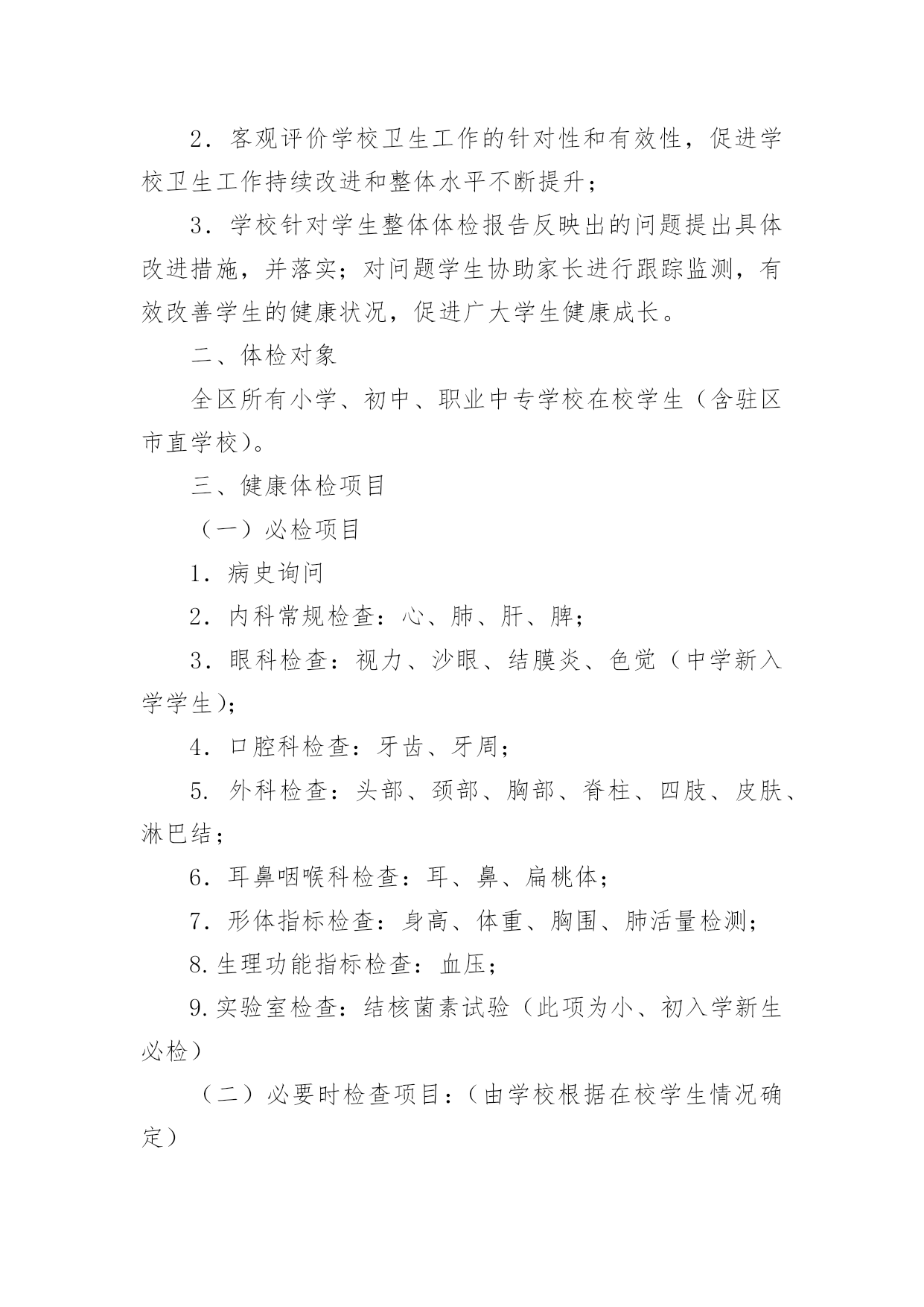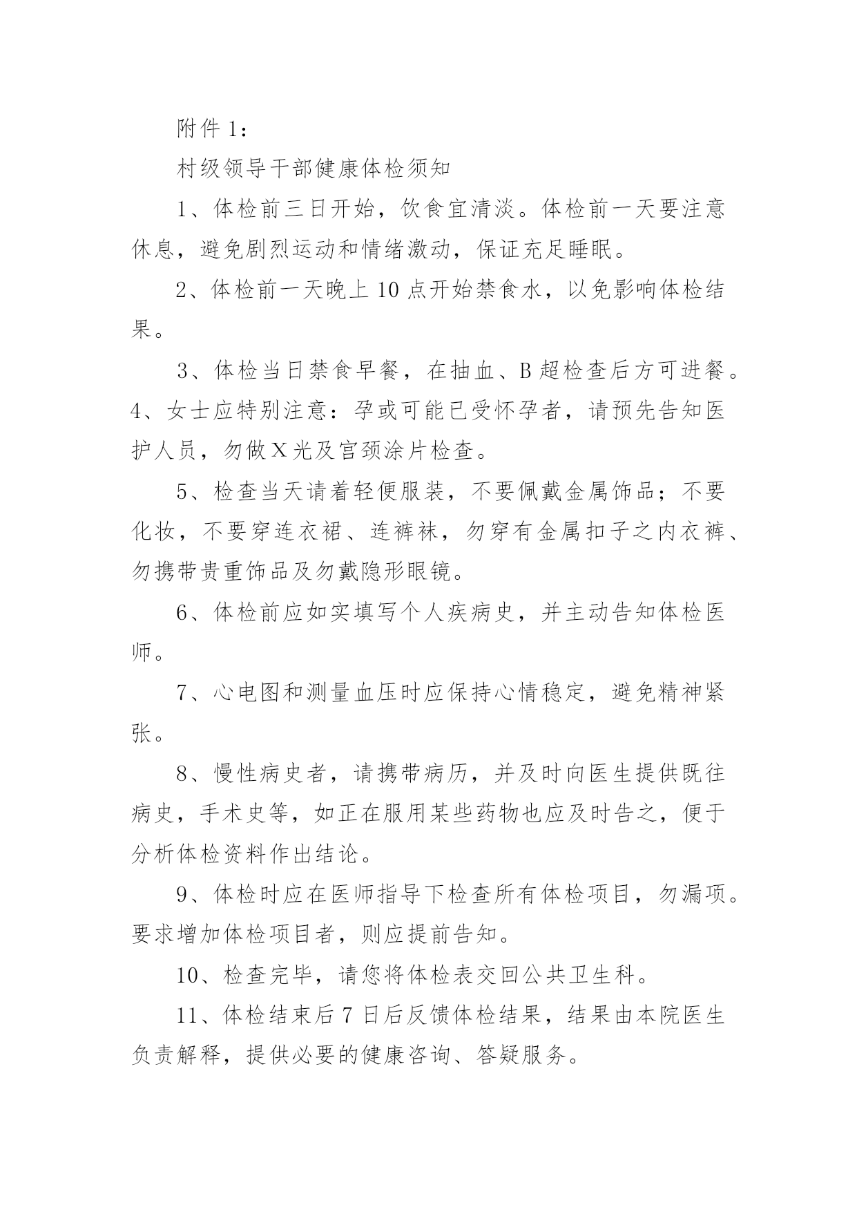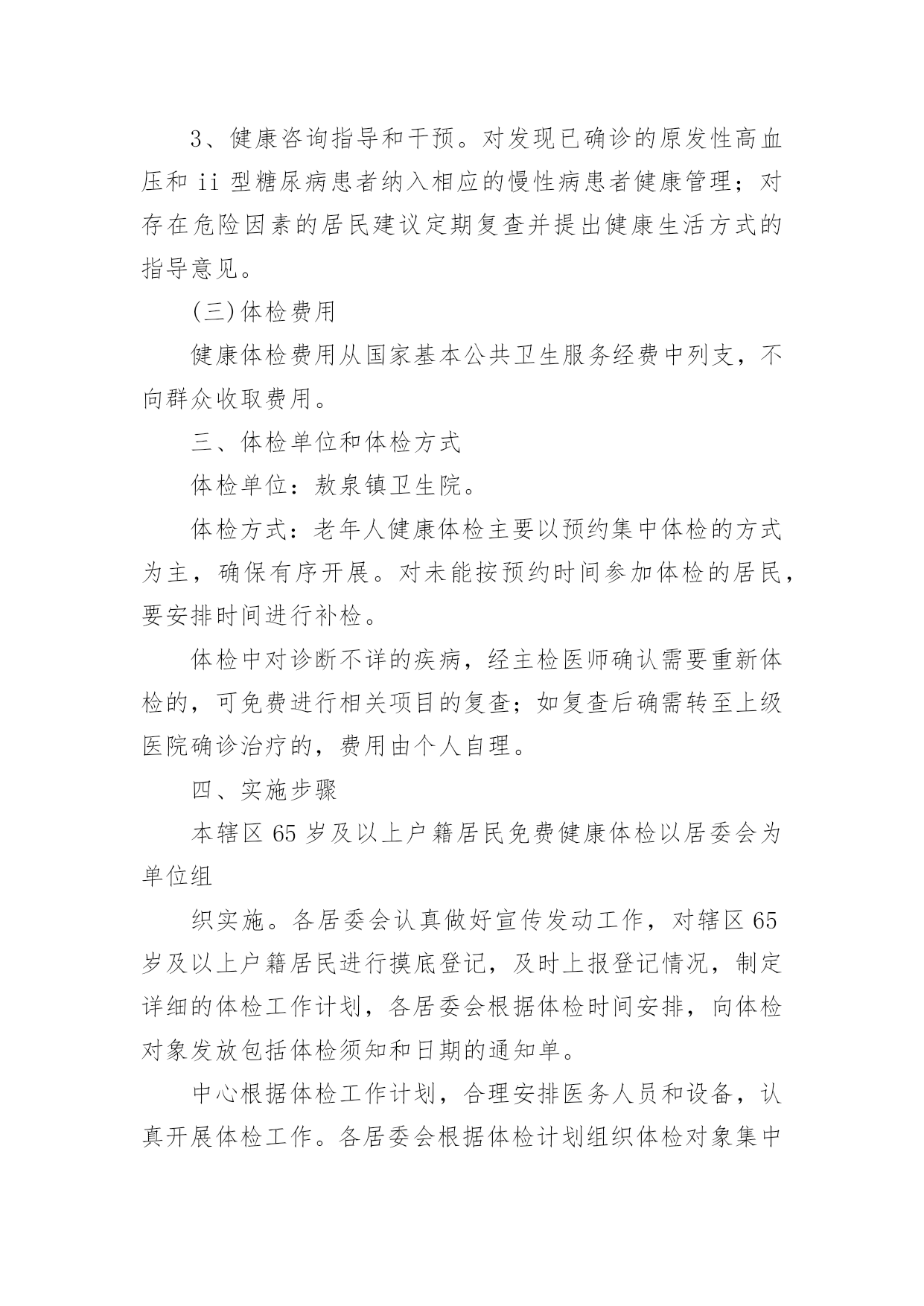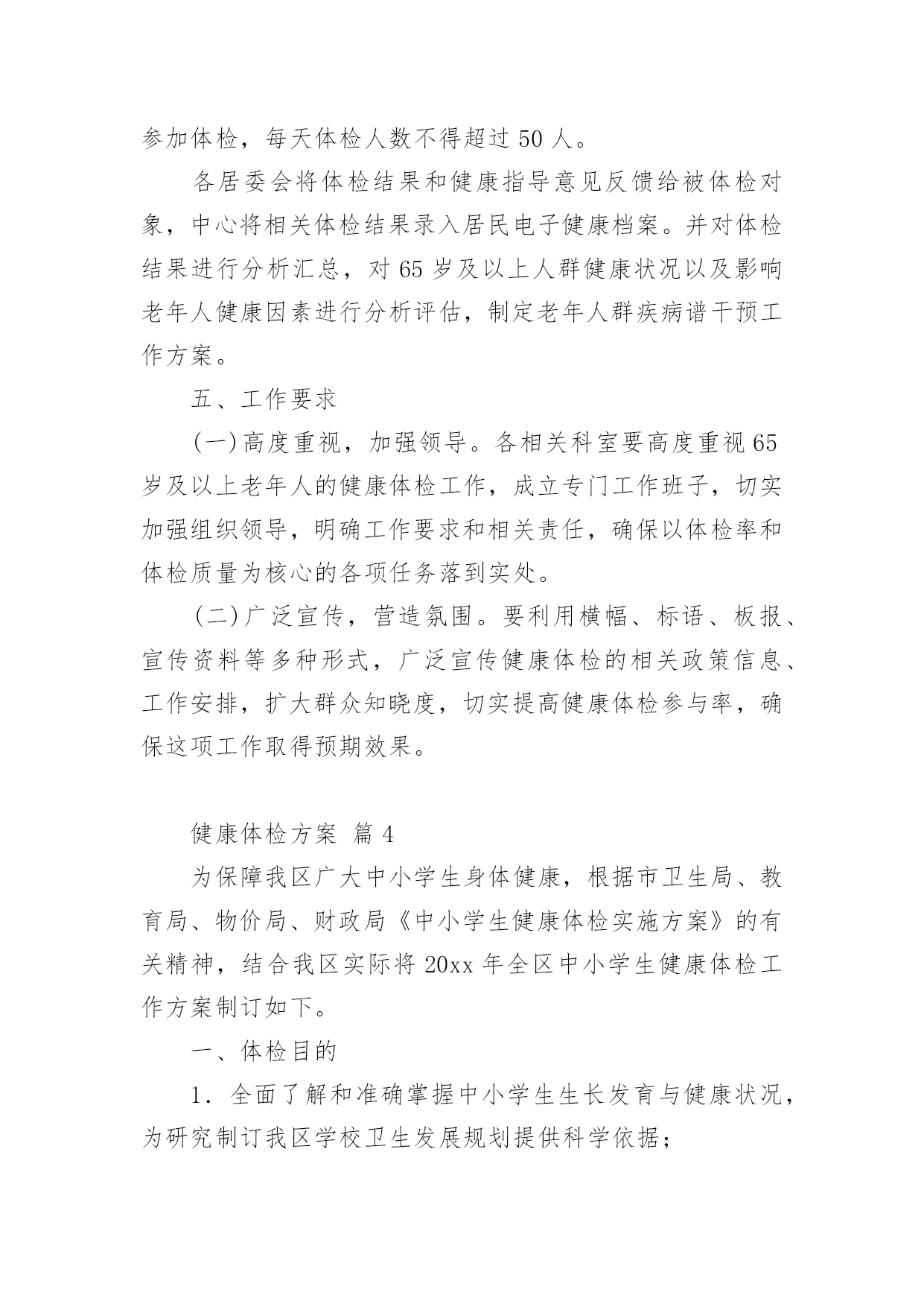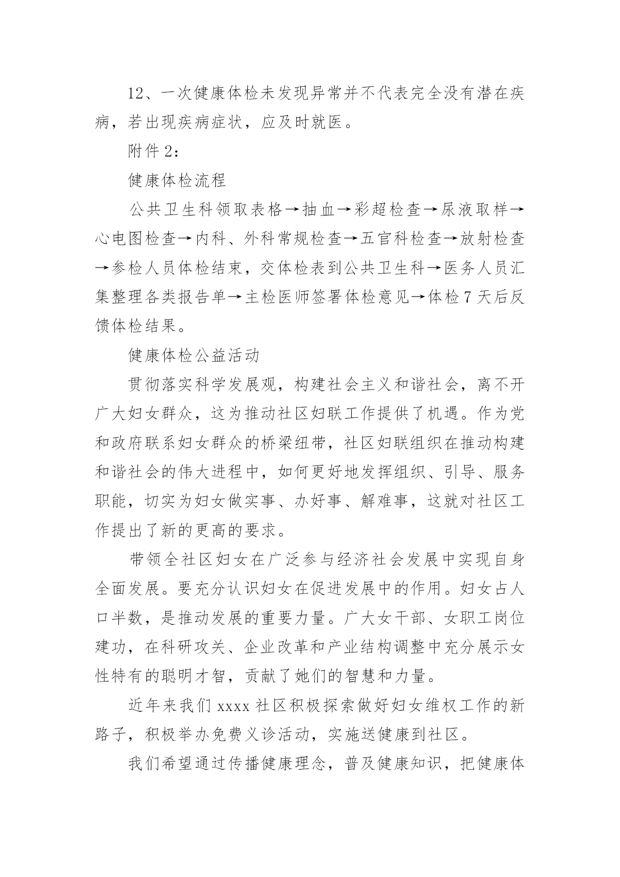 健康体检方案健康体检方案(通用21篇)为了保障事情或工作顺利、圆满进行,我们需要事先制定方案,方案是解决一个问题或者一项工程,一个课题的详细过程。方案的格式和要求是什么样的呢?以下是小编为大家整理的健康体检方案,欢迎大家借鉴与参考,希望对大家有所帮助。健康体检方案篇1一、体检卡优惠说明体检卡:长期有效、不限使用次数、不限本人1、分层体检2楼男宾区、3楼女宾区、4楼及5楼贵宾区,7楼独立的检验中心,充分保护隐私;2、体检卡充值享受?折优惠增值3、超出卡内金额项目可再享受?折优惠,现场以现金、医保卡、微信、支付宝或银行卡、信用卡方式缴费;4、家属自费体检整体享受7折优惠,家属不限人数;5、参检员工体检之日起,一年内免费享受健康管家服务(预约省内各三甲医院知名专家看病服务,解决员工看病难的困扰);6、体检卡丢失需凭借体检者身份证补办,中心一楼收费窗口办理;7、免费停车(中心大楼背后60个停车位、酒店300个停车位)。二、服务方案(一)检前上门服务1、安排专家上门面对面解读往年报告、检前咨询;2、个性化预定体检项目(根据现病史、既往病史、地域性和家族性病史等量身定制个性化体检方案;)3、免费测量血压、血糖;(二)检中安排1、采用智能排号系统,体检由微信关注中心公众号排号叫号;2、免费停车(三)检后服务1、出报告时间为7-10个工作日,员工可关注福能微信公众号随时随地在线查阅电子版体检报告及云胶片;纸质报告可选择员工自取或按单位部门,独立封装并分批快递;2、专家上门解读报告、健康讲座、健康义诊等;3、疾病追踪管理:发现重大疾病第一时间通知,定期跟踪回访,了解疾病干预进展,提醒员工及时就医;4、参检员工体检之日起,一年内免费享受健康管家服务(预约省内各三甲医院看病服务工作,解决员工看病难的困扰。健康体检方案篇2为全面掌握各村级领导干部身体健康状况,保障各村领导的身心健康和工作效率,镇委、镇政府决定,委托三里岗镇中心卫生院对全镇村级领导干部进行健康体检,为确保此项工作顺利实施,特制定本方案:一、目的意义开展村级领导干部健康体检工作,主要是尽量减少干部职工因工作任务繁重、工作压力较大、精神过度紧张等因素导致疾病的发生,让每一位干部职工科学地掌握自己的健康状况,做到有病早诊治,无病早预防。并有针对性地开展健康教育、健康促进活动,使干部职工树立正确的健康观念,不断提高保健意识。二、体检对象全镇所有在岗村委会干部。三、体检时限20xx年x月x日-20xx年x月x日。四、体检项目本次体检统一采用《国家基本卫生服务规范(20xx年版)规定的健康体检表》,主要体检项目有:五、体检费用本次体检费用xx元六、组织管理各村要高度重视健康体检工作,确定专人负责,做好体检人员的组织管理工作,确保体检率达到100%。七、体检程序1、被体检者携带个人身份证到公共卫生科进行单位、姓名登记,领取健康体检表,体检时凭表格体检。体检结束后,将体检表及时交至公共卫生科,便于登记汇总体检结果,并建立健康档案。2、卫生院在体检结束后7日内,将整理好的体检结果及时反馈给各村委会。为每名村干部完善居民健康档案,并做出健康评价。八、工作要求(一)精心组织,周密安排。卫生院要加强对各参检科室的组织领导,明确体检项目和体检人员,精心组织、周密安排,做到日常工作与体检两不误,保证体检工作保质保量按时完成。(二)提升服务,确保效果。要加强体检服务工作,做到忙而不乱、有条不紊,确保体检工作安全有序开展。落实好体检人员、体检场所、体检设备,制定合理的体检流程。要选派业务水平高、责任心强的医务人员参加体检工作,确保体检的质量。为参检人员提供便利、快捷、优质、高效的体检服务。(三)加强管理,妥善保管。严格执行干部体检制度和工作保密制度。体检结束后,卫生院建立体检人员健康档案,作出体检结论后,妥善保管健康体检内容,确保体检内容、结论不外泄。安排专人为参检人员提供咨询、解答及建议,同时签定家庭医生签约服务协议,促进健康保障工作。附件一:村级领导干部健康体检须知附件二:健康体检流程附件1:村级领导干部健康体检须知1、体检前三日开始,饮食宜清淡。体检前一天要注意休息,避免剧烈运动和情绪激动,保证充足睡眠。2、体检前一天晚上10点开始禁食水,以免影响体检结果。3、体检当日禁食早餐,在抽血、B超检查后方可进餐。4、女士应特别注意:孕或可能已受怀孕者,请预先告知医护人员,勿做Χ光及宫颈涂片检查。5、检查当天请着轻便服装,不要佩戴金属饰品;不要化妆,不要穿连衣裙、连裤袜,勿穿有金属扣子之内衣裤、勿携带贵重饰品及勿戴隐形眼镜。6、体检前应如实填写个人疾病史,并主动告知体检医师。7、心电图和测量血压时应保持心情稳定,避免精神紧张。8、慢性病史者,请携带病历,并及时向医生提供既往病史,手术史等,如正在服用某些药物也应及时