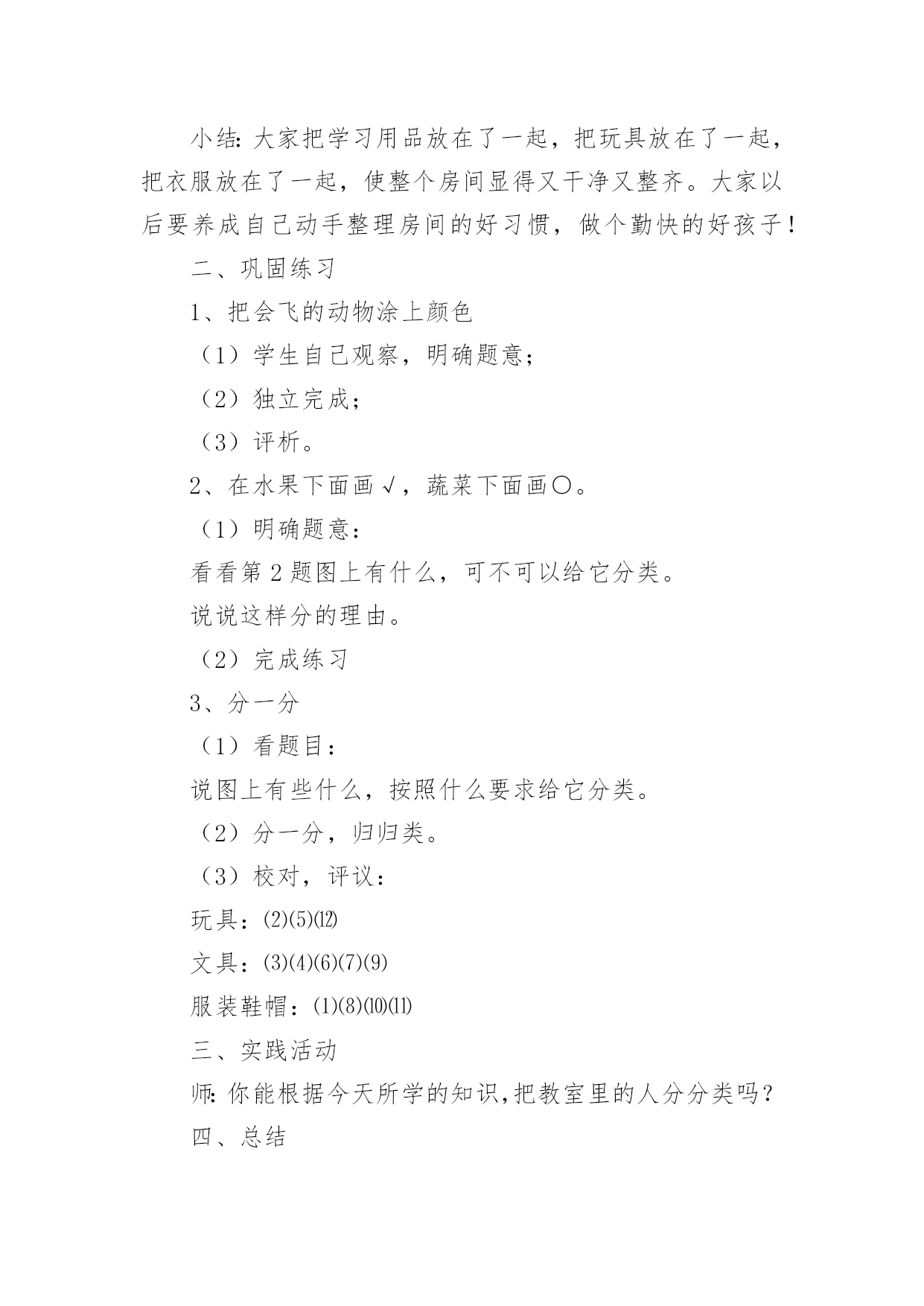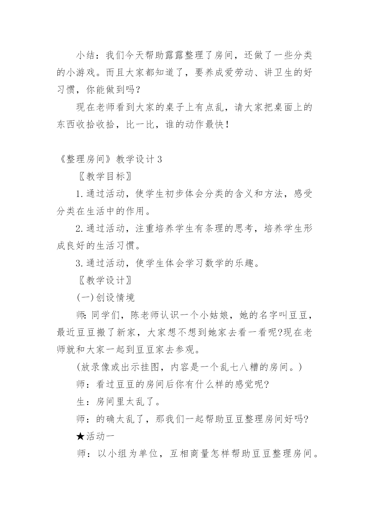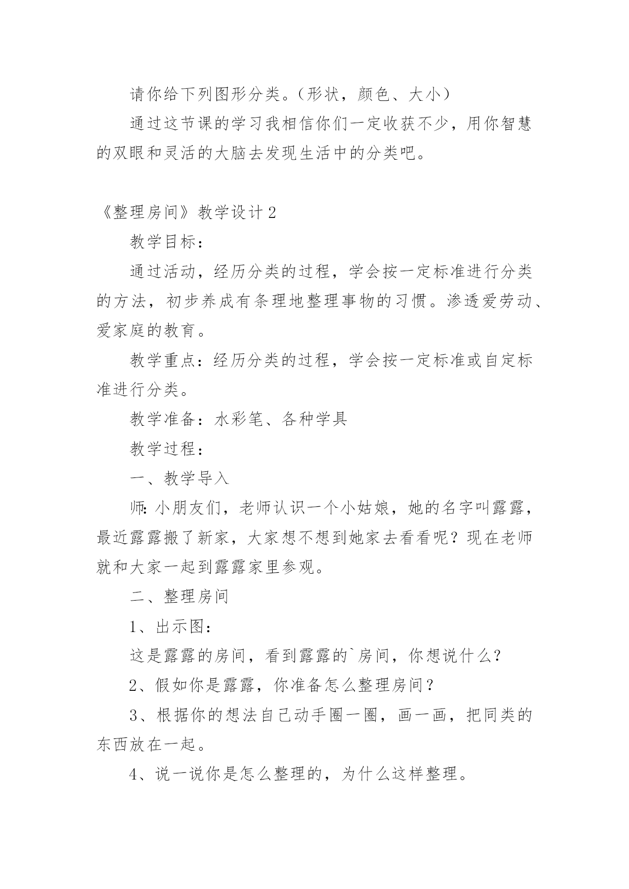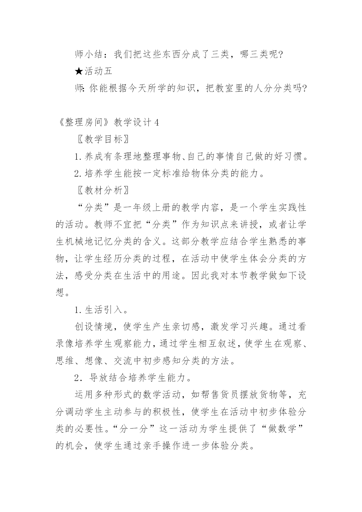 《整理房间》教学设计作为一名优秀的教育工作者,常常需要准备教学设计,教学设计一般包括教学目标、教学重难点、教学方法、教学步骤与时间分配等环节。那么写教学设计需要注意哪些问题呢?下面是小编为大家收集的《整理房间》教学设计,希望能够帮助到大家。《整理房间》教学设计1教学内容:北师大版(一年级上册)第52~53页的内容教学目标:1、知识目标:通过活动,初步体会分类的含义和方法,感受分类在生活中的作用,能对物体进行整理分类。2、能力目标:通过学习,培养学生的动手操作能力、判断能力、合作交流能力。3、情感目标:培养有条理地思考问题与良好的生活习惯。教学重点:学会按一定标准来分类教学难点:能用不同的标准来分类教学准备:课件学具教学过程:一、激思:师:同学们,你们有自己的房间吗?谁是自己整理的请举手。我们一起来看看同学们整理的效果如何?我们的好朋友淘气和笑笑也有自己的房间,想不想去看看?这是淘气的房间,这是笑笑的房间,你想说点什么?今天我们就一起来帮淘气整理房间。板题:《整理房间》二、启思1、都说笑笑笑房间整齐,我们来看看她是怎么整理的?学习她的好方法来帮淘气整理好吗?生:好!2、看看笑笑房间里都有些什么?这么多东西,她是如何摆放的?3、你知道她为什么把球和玩具熊放在一起吗?仔细想想他们是干什么用的?(引出三类:服装类、学习用品类、玩具类)4、我们看到笑笑是把有相同用途的物品一类一类来摆放的,分成了“玩具类”“学习用品类”“服装类”。这就是:分类。三、展思:1、再来看看淘气的房间,看来淘气像你们大多数人一样还不会整理自己的物品。今天老师把淘气房间的一些物品带到了课堂上,来看看这是什么?应该放在哪一类?为什么放在这一类?例如:这个是铅笔,学习用的,所以放在学习用品类。2、看看这是什么?应放在哪一类?为什么放在这一类?(袜子、玩具熊......)师:现在淘气房间的其余物品都在你们手上了,拿到物品的同学请你想一想,你要把它贴在哪一类?为什么贴在这一类?准备好了来站队,把这些物品在黑板上分类贴好。5、我们来看看淘气的房间中每一类都有哪些物品?(生读)6、经过你们的`整理,看看淘气的房间变成什么样了?7、淘气要用铅笔该去哪一类找?玩具小汽车呢?8、淘气的妈妈又买来了故事书,放在哪一类?为什么?9、冬天来了,妈妈给淘气买了一条围巾,应该放在哪一类?为什么?10、现在你觉得分类有什么好处?四、促思:其实,在我们的生活中分类也有许多分类,我们一起来看看(欣赏生活中的分类)五、拓思:1、今天学习了分类,帮淘气整理了房间,你收获大吗?敢不敢接受挑战?2、那就让我们一起开启今天的阳光之旅吧!(1)一缕阳光:你能按照会飞和不会飞来给下列动物分类吗?(2)光芒闪耀:小组合作:你能给下列物品分类吗?温馨提示:1、拿出学习袋里的学具,小组内说一说都有哪物品?2、小组讨论,你想怎样给他们分类?说说你的理由。(3)潜能无限:请你给下列图形分类。(形状,颜色、大小)通过这节课的学习我相信你们一定收获不少,用你智慧的双眼和灵活的大脑去发现生活中的分类吧。《整理房间》教学设计2教学目标:通过活动,经历分类的过程,学会按一定标准进行分类的方法,初步养成有条理地整理事物的习惯。渗透爱劳动、爱家庭的教育。教学重点:经历分类的过程,学会按一定标准或自定标准进行分类。教学准备:水彩笔、各种学具教学过程:一、教学导入师:小朋友们,老师认识一个小姑娘,她的名字叫露露,最近露露搬了新家,大家想不想到她家去看看呢?现在老师就和大家一起到露露家里参观。二、整理房间1、出示图:这是露露的房间,看到露露的`房间,你想说什么?2、假如你是露露,你准备怎么整理房间?3、根据你的想法自己动手圈一圈,画一画,把同类的东西放在一起。4、说一说你是怎么整理的,为什么这样整理。小结:大家把学习用品放在了一起,把玩具放在了一起,把衣服放在了一起,使整个房间显得又干净又整齐。大家以后要养成自己动手整理房间的好习惯,做个勤快的好孩子!二、巩固练习1、把会飞的动物涂上颜色(1)学生自己观察,明确题意;(2)独立完成;(3)评析。2、在水果下面画√,蔬菜下面画○。(1)明确题意:看看第2题图上有什么,可不可以给它分类。说说这样分的理由。(2)完成练习3、分一分(1)看题目:说图上有些什么,按照什么要求给它分类。(2)分一分,归归类。(3)校对,评议:玩具:⑵⑸⑿文具:⑶⑷⑹⑺⑼服装鞋帽:⑴⑻⑽⑾三、实践活动师:你能根据今天所学的知识,把教室里的人分分类吗?四、总结小结:我们今天帮助露露整理了房间,还做了一些分类的小游戏。而且大家都知道了,要养成爱劳动、讲卫生的好习惯,你能做到吗?现在老师看到大家的桌子上有点乱,请大家把桌面上的东西收拾收拾,比一比,谁的动作最快!《整理房间》教学设计3〖教学目标〗1.通过活动,使学生初步体会