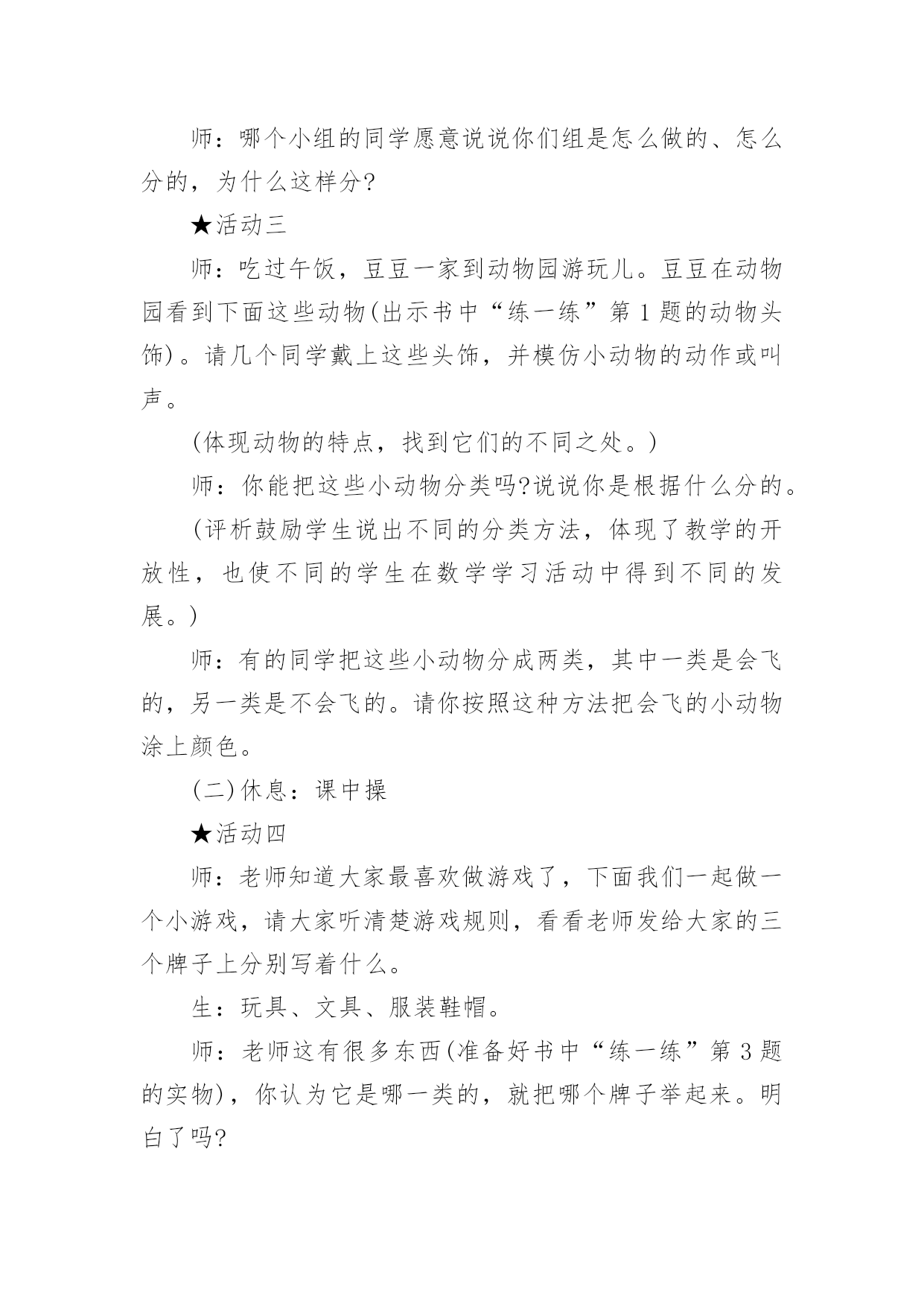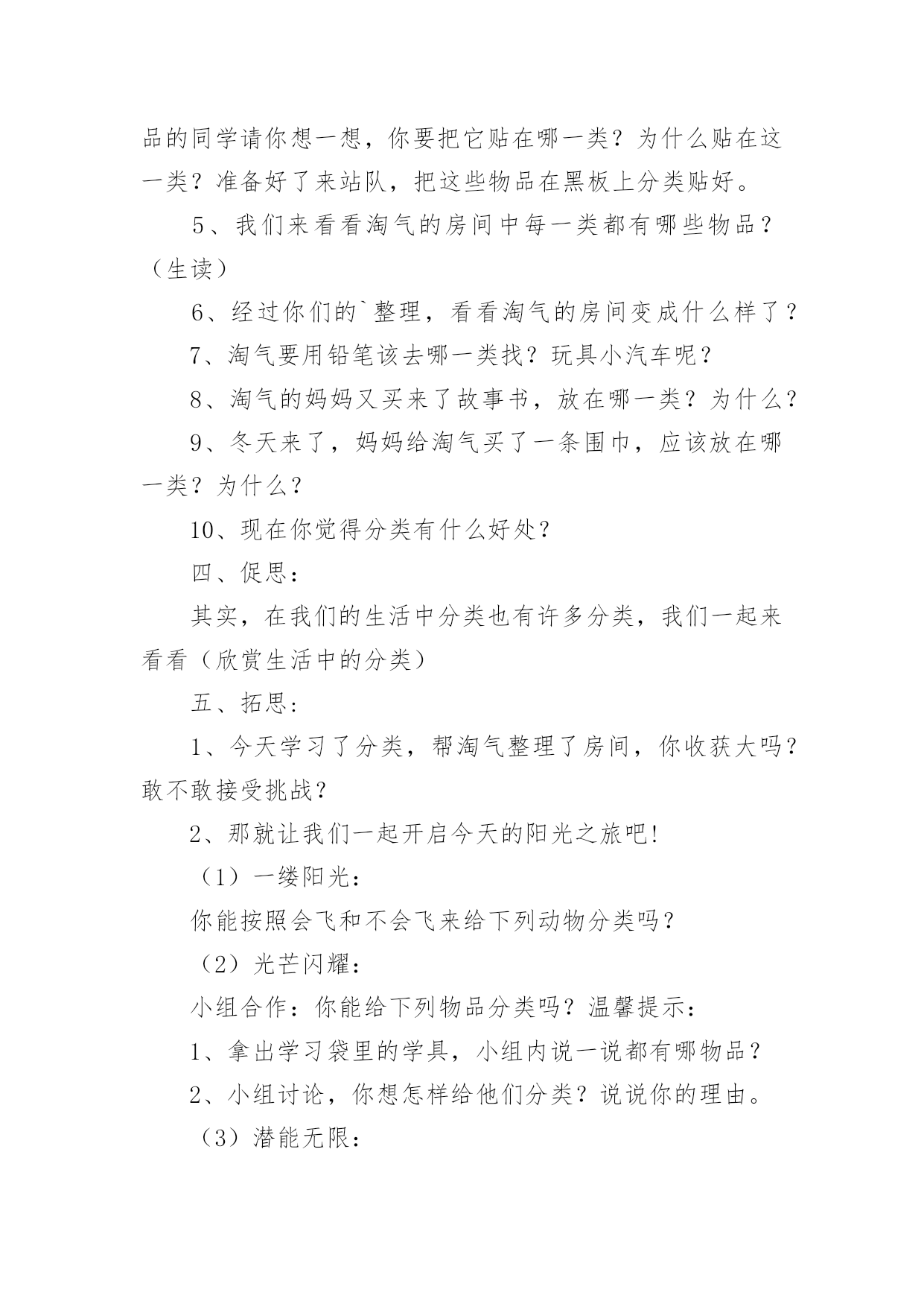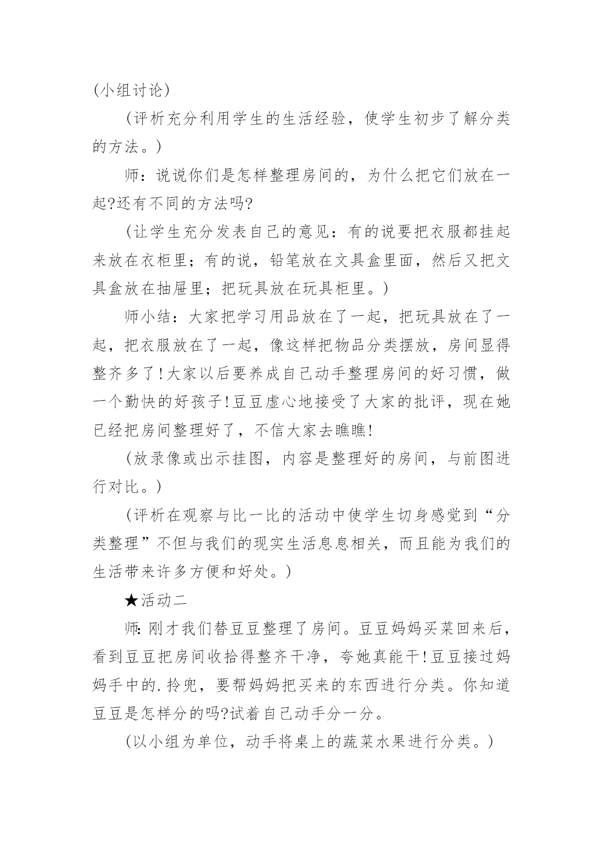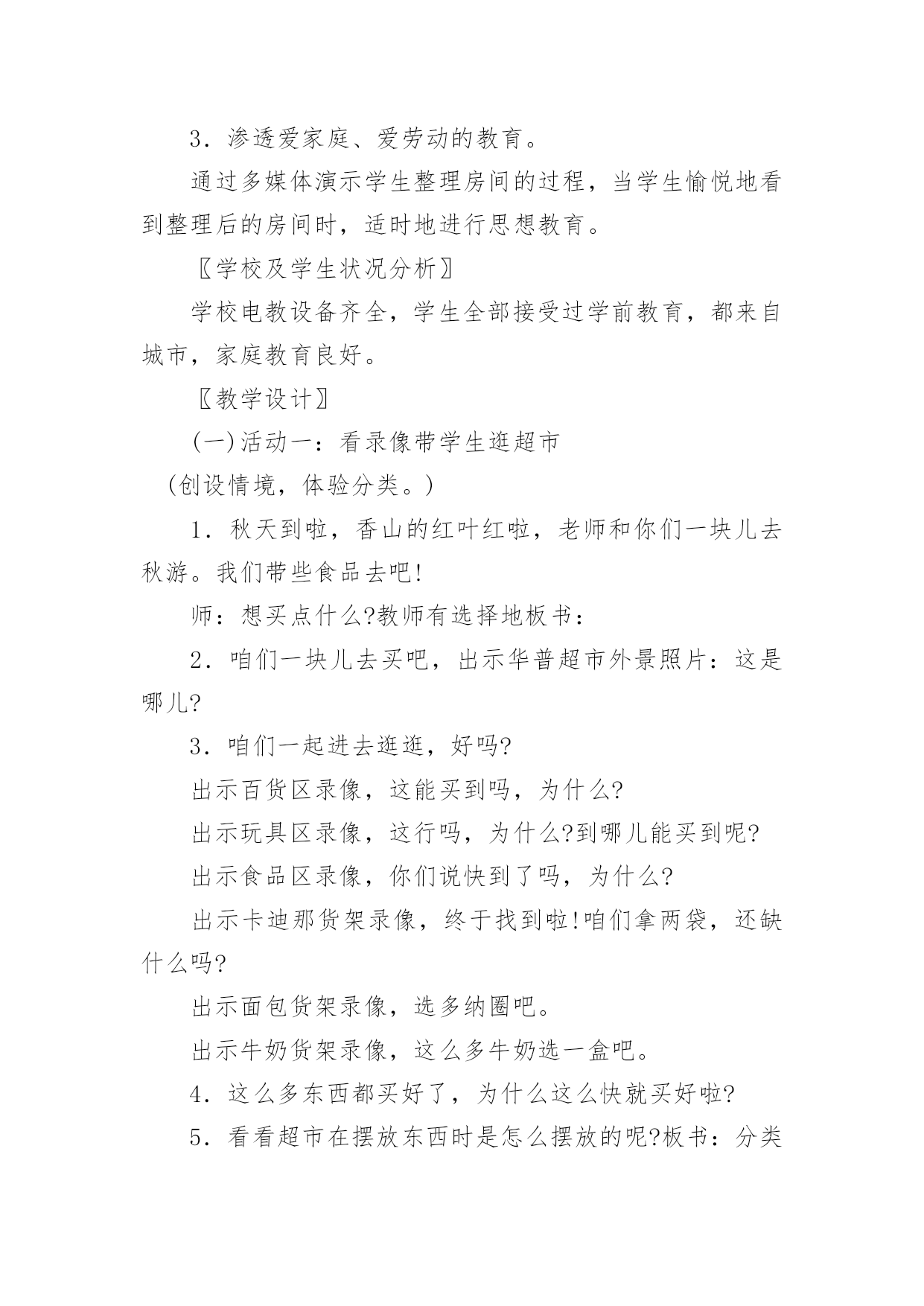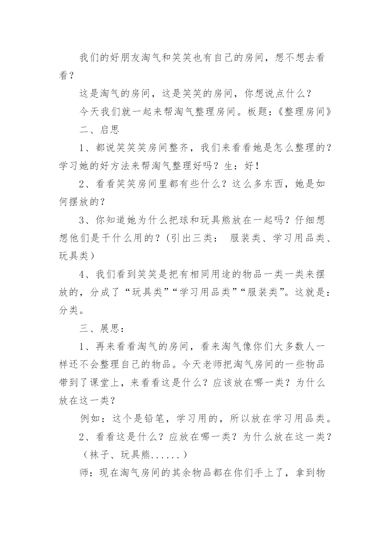 《整理房间》教学设计作为一名优秀的教育工作者,常常需要准备教学设计,教学设计一般包括教学目标、教学重难点、教学方法、教学步骤与时间分配等环节。那么写教学设计需要注意哪些问题呢?下面是小编为大家收集的《整理房间》教学设计,希望能够帮助到大家。《整理房间》教学设计1教学内容:北师大版(一年级上册)第52~53页的内容教学目标:1、知识目标:通过活动,初步体会分类的含义和方法,感受分类在生活中的作用,能对物体进行整理分类。2、能力目标:通过学习,培养学生的动手操作能力、判断能力、合作交流能力。3、情感目标:培养有条理地思考问题与良好的生活习惯。教学重点:学会按一定标准来分类教学难点:能用不同的标准来分类教学准备:课件学具教学过程:一、激思:师:同学们,你们有自己的房间吗?谁是自己整理的请举手。我们一起来看看同学们整理的效果如何?我们的好朋友淘气和笑笑也有自己的房间,想不想去看看?这是淘气的房间,这是笑笑的房间,你想说点什么?今天我们就一起来帮淘气整理房间。板题:《整理房间》二、启思1、都说笑笑笑房间整齐,我们来看看她是怎么整理的?学习她的好方法来帮淘气整理好吗?生:好!2、看看笑笑房间里都有些什么?这么多东西,她是如何摆放的?3、你知道她为什么把球和玩具熊放在一起吗?仔细想想他们是干什么用的?(引出三类:服装类、学习用品类、玩具类)4、我们看到笑笑是把有相同用途的物品一类一类来摆放的,分成了“玩具类”“学习用品类”“服装类”。这就是:分类。三、展思:1、再来看看淘气的房间,看来淘气像你们大多数人一样还不会整理自己的物品。今天老师把淘气房间的一些物品带到了课堂上,来看看这是什么?应该放在哪一类?为什么放在这一类?例如:这个是铅笔,学习用的,所以放在学习用品类。2、看看这是什么?应放在哪一类?为什么放在这一类?(袜子、玩具熊......)师:现在淘气房间的其余物品都在你们手上了,拿到物品的同学请你想一想,你要把它贴在哪一类?为什么贴在这一类?准备好了来站队,把这些物品在黑板上分类贴好。5、我们来看看淘气的房间中每一类都有哪些物品?(生读)6、经过你们的`整理,看看淘气的房间变成什么样了?7、淘气要用铅笔该去哪一类找?玩具小汽车呢?8、淘气的妈妈又买来了故事书,放在哪一类?为什么?9、冬天来了,妈妈给淘气买了一条围巾,应该放在哪一类?为什么?10、现在你觉得分类有什么好处?四、促思:其实,在我们的生活中分类也有许多分类,我们一起来看看(欣赏生活中的分类)五、拓思:1、今天学习了分类,帮淘气整理了房间,你收获大吗?敢不敢接受挑战?2、那就让我们一起开启今天的阳光之旅吧!(1)一缕阳光:你能按照会飞和不会飞来给下列动物分类吗?(2)光芒闪耀:小组合作:你能给下列物品分类吗?温馨提示:1、拿出学习袋里的学具,小组内说一说都有哪物品?2、小组讨论,你想怎样给他们分类?说说你的理由。(3)潜能无限:请你给下列图形分类。(形状,颜色、大小)通过这节课的学习我相信你们一定收获不少,用你智慧的双眼和灵活的大脑去发现生活中的分类吧。《整理房间》教学设计2教学目标:通过活动,经历分类的过程,学会按一定标准进行分类的方法,初步养成有条理地整理事物的习惯。渗透爱劳动、爱家庭的教育。教学重点:经历分类的过程,学会按一定标准或自定标准进行分类。教学准备:水彩笔、各种学具教学过程:一、教学导入师:小朋友们,老师认识一个小姑娘,她的名字叫露露,最近露露搬了新家,大家想不想到她家去看看呢?现在老师就和大家一起到露露家里参观。二、整理房间1、出示图:这是露露的房间,看到露露的`房间,你想说什么?2、假如你是露露,你准备怎么整理房间?3、根据你的想法自己动手圈一圈,画一画,把同类的东西放在一起。4、说一说你是怎么整理的,为什么这样整理。小结:大家把学习用品放在了一起,把玩具放在了一起,把衣服放在了一起,使整个房间显得又干净又整齐。大家以后要养成自己动手整理房间的好习惯,做个勤快的好孩子!二、巩固练习1、把会飞的动物涂上颜色(1)学生自己观察,明确题意;(2)独立完成;(3)评析。2、在水果下面画√,蔬菜下面画○。(1)明确题意:看看第2题图上有什么,可不可以给它分类。说说这样分的理由。(2)完成练习3、分一分(1)看题目:说图上有些什么,按照什么要求给它分类。(2)分一分,归归类。(3)校对,评议:玩具:⑵⑸⑿文具:⑶⑷⑹⑺⑼服装鞋帽:⑴⑻⑽⑾三、实践活动师:你能根据今天所学的知识,把教室里的人分分类吗?四、总结小结:我们今天帮助露露整理了房间,还做了一些分类的小游戏。而且大家都知道了,要养成爱劳动、讲卫生的好习惯,你能做到吗?现在老师看到大家的桌子上有点乱,请大家把桌面上的东西收拾收拾,比一比,谁的动作最快!《整理房间》教学设计3〖教学目标〗1.通过活动,使学生初步体会