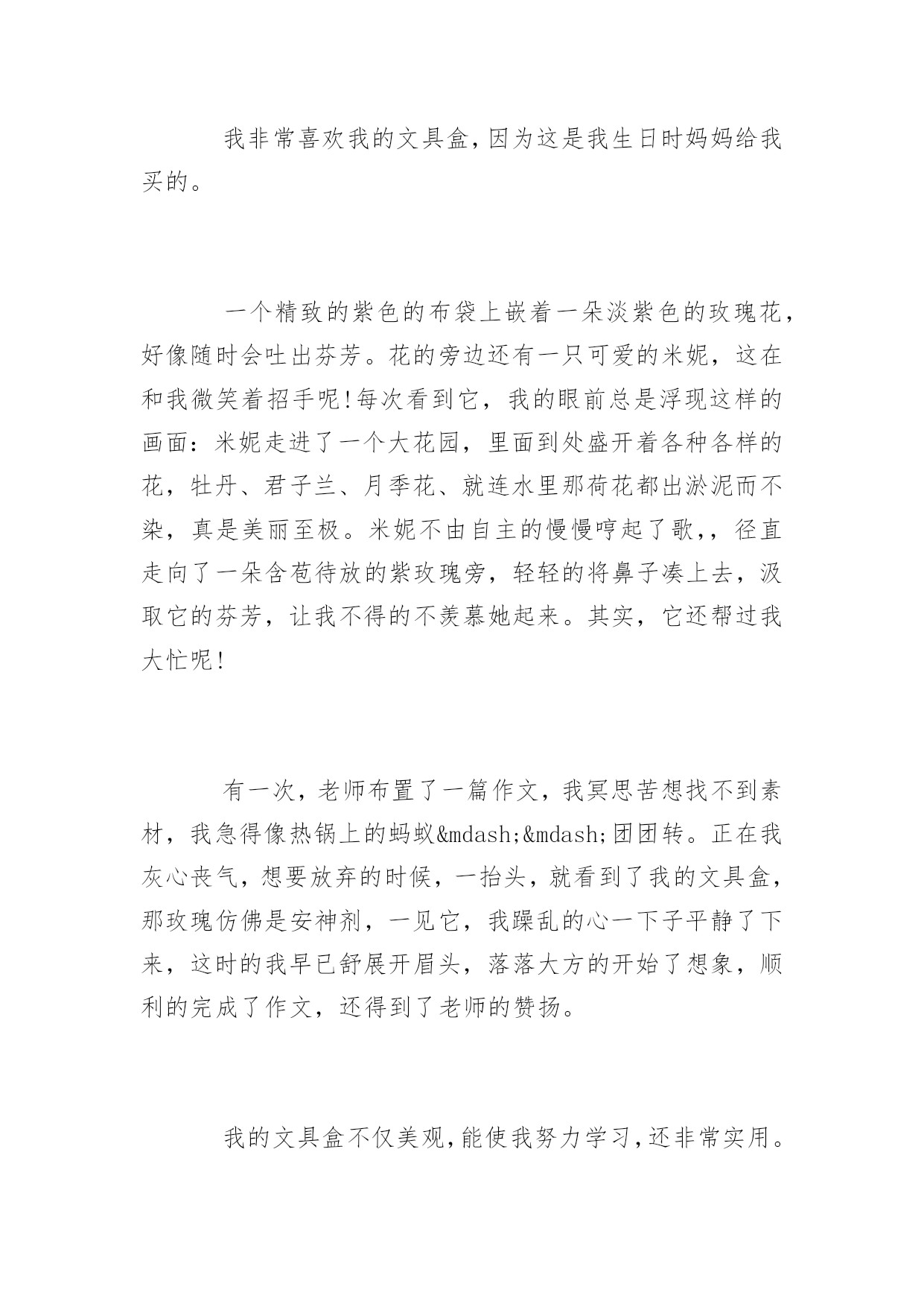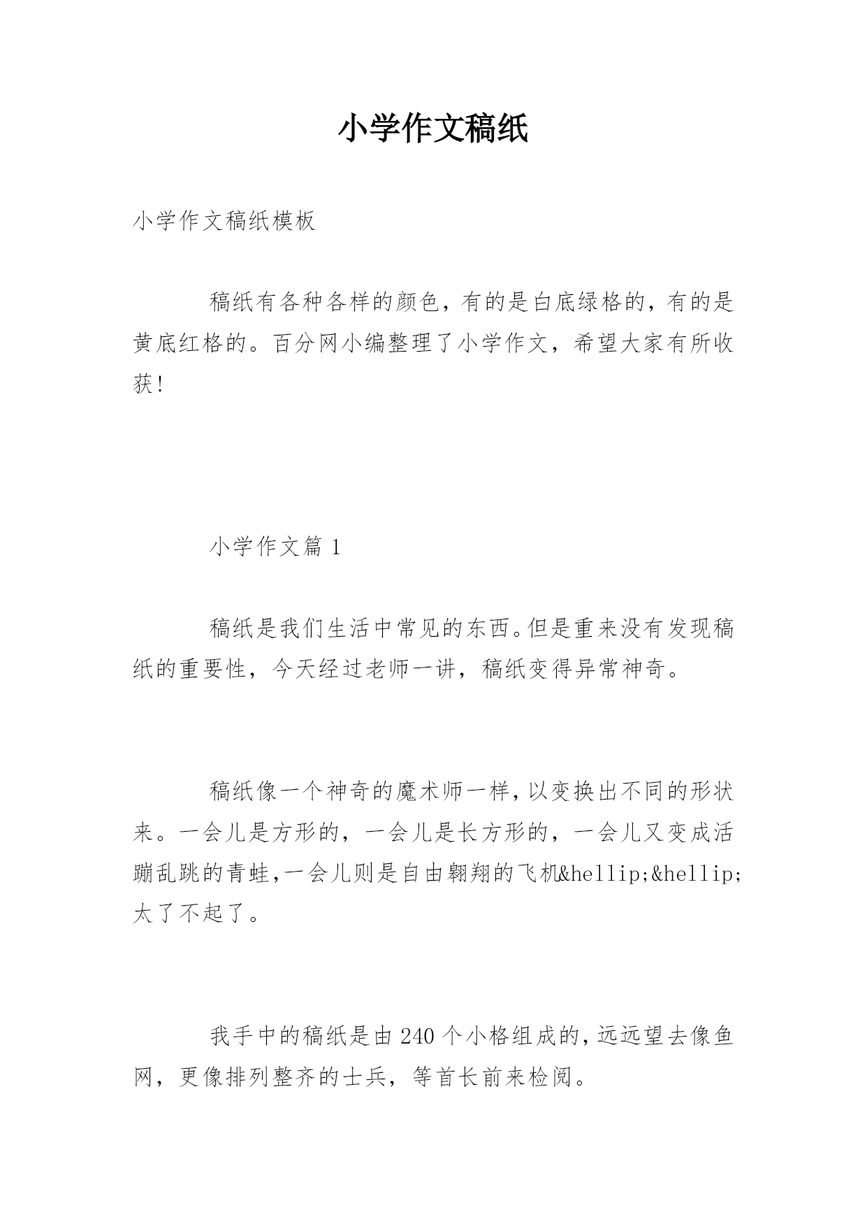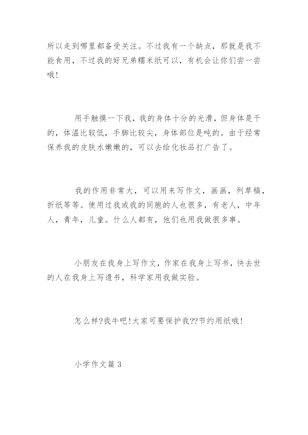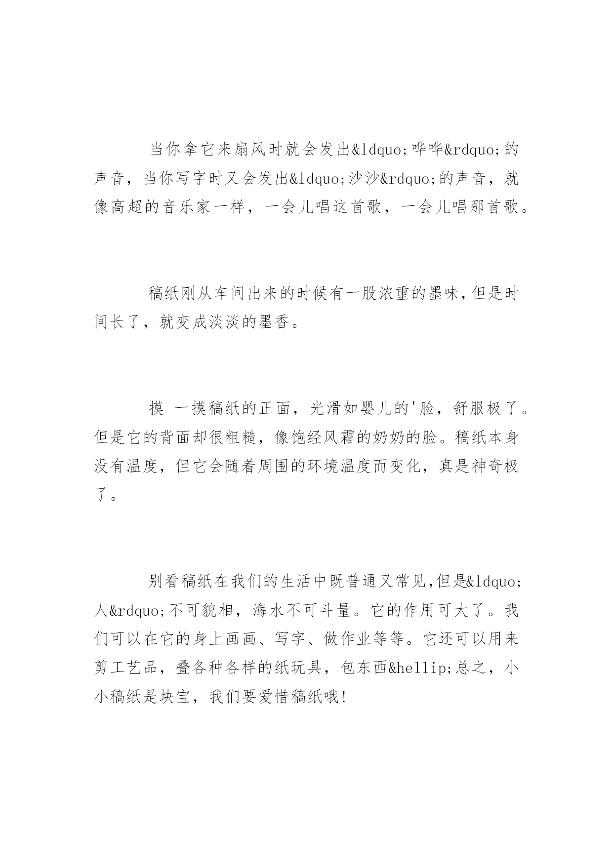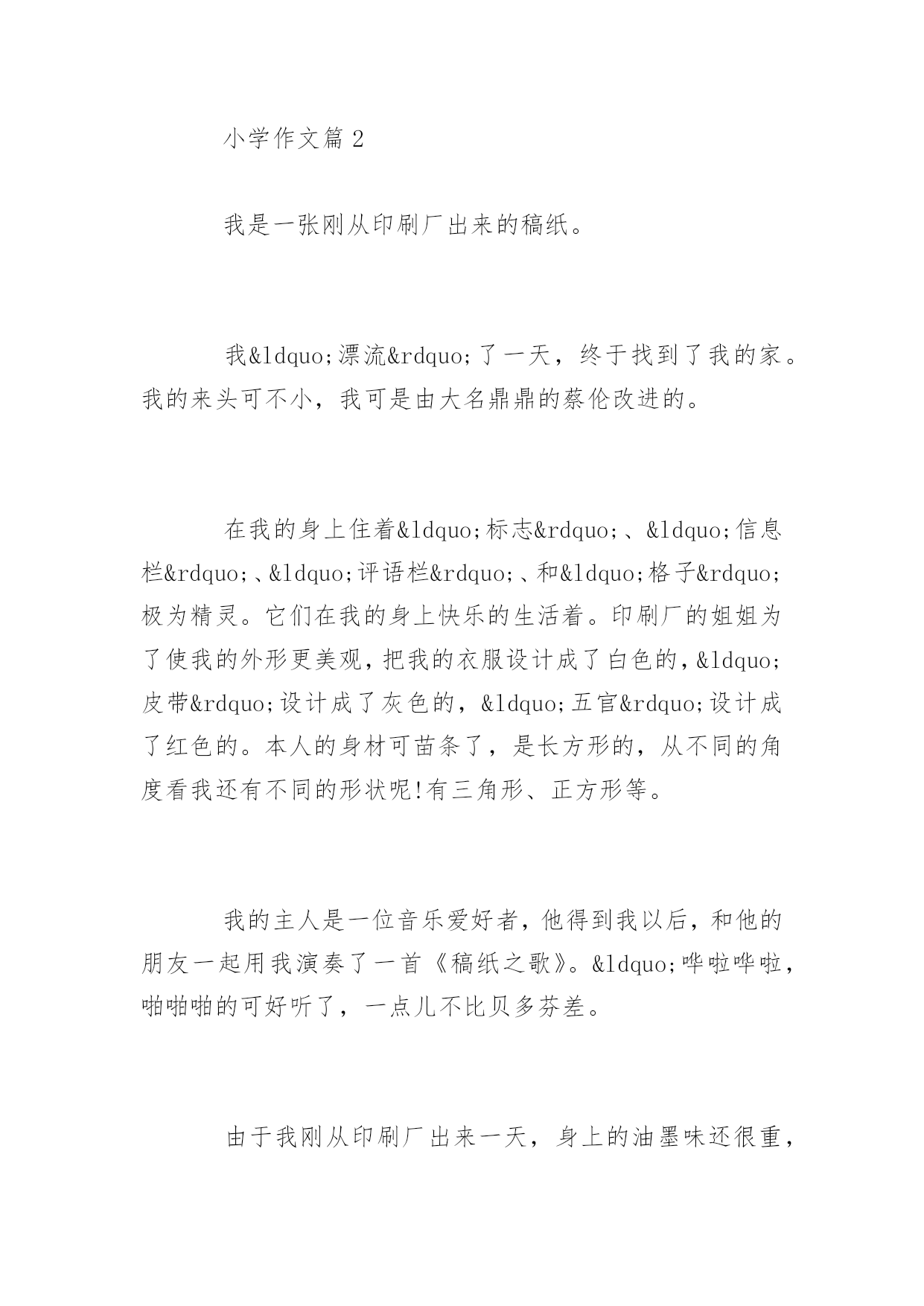 小学作文稿纸小学作文稿纸模板稿纸有各种各样的颜色,有的是白底绿格的,有的是黄底红格的。百分网小编整理了小学作文,希望大家有所收获!小学作文篇1稿纸是我们生活中常见的东西。但是重来没有发现稿纸的重要性,今天经过老师一讲,稿纸变得异常神奇。稿纸像一个神奇的魔术师一样,以变换出不同的形状来。一会儿是方形的,一会儿是长方形的,一会儿又变成活蹦乱跳的青蛙,一会儿则是自由翱翔的飞机……太了不起了。我手中的稿纸是由240个小格组成的,远远望去像鱼网,更像排列整齐的士兵,等首长前来检阅。当你拿它来扇风时就会发出“哗哗”的声音,当你写字时又会发出“沙沙”的声音,就像高超的音乐家一样,一会儿唱这首歌,一会儿唱那首歌。稿纸刚从车间出来的时候有一股浓重的墨味,但是时间长了,就变成淡淡的墨香。摸一摸稿纸的正面,光滑如婴儿的'脸,舒服极了。但是它的背面却很粗糙,像饱经风霜的奶奶的脸。稿纸本身没有温度,但它会随着周围的环境温度而变化,真是神奇极了。别看稿纸在我们的生活中既普通又常见,但是“人”不可貌相,海水不可斗量。它的作用可大了。我们可以在它的身上画画、写字、做作业等等。它还可以用来剪工艺品,叠各种各样的纸玩具,包东西…总之,小小稿纸是块宝,我们要爱惜稿纸哦!小学作文篇2我是一张刚从印刷厂出来的稿纸。我“漂流”了一天,终于找到了我的家。我的来头可不小,我可是由大名鼎鼎的蔡伦改进的。在我的身上住着“标志”、“信息栏”、“评语栏”、和“格子”极为精灵。它们在我的身上快乐的生活着。印刷厂的姐姐为了使我的外形更美观,把我的衣服设计成了白色的,“皮带”设计成了灰色的,“五官”设计成了红色的。本人的身材可苗条了,是长方形的,从不同的角度看我还有不同的形状呢!有三角形、正方形等。我的主人是一位音乐爱好者,他得到我以后,和他的朋友一起用我演奏了一首《稿纸之歌》。“哗啦哗啦,啪啪啪的可好听了,一点儿不比贝多芬差。由于我刚从印刷厂出来一天,身上的油墨味还很重,所以走到哪里都备受关注。不过我有一个缺点,那就是我不能食用,不过我的好兄弟糯米纸可以,有机会让你们尝一尝哦!用手触摸一下我,我的身体十分的光滑,但身体是干的,体温比较低,手脚比较尖,身体部位是吨的。由于经常保养我的皮肤水嫩嫩的,可以去给化妆品打广告了。我的作用非常大,可以用来写作文,画画,列草稿,折纸等等。使用过我或我的同胞的人也很多,有老人,中年人,青年,儿童。什么人都有,他们也用我做很多事。小朋友在我身上写作文,作家在我身上写书,快去世的人在我身上写遗书,科学家用我做实验。怎么样?我牛吧!大家可要保护我??节约用纸哦!小学作文篇3我非常喜欢我的文具盒,因为这是我生日时妈妈给我买的。一个精致的紫色的布袋上嵌着一朵淡紫色的玫瑰花,好像随时会吐出芬芳。花的旁边还有一只可爱的米妮,这在和我微笑着招手呢!每次看到它,我的眼前总是浮现这样的画面:米妮走进了一个大花园,里面到处盛开着各种各样的花,牡丹、君子兰、月季花、就连水里那荷花都出淤泥而不染,真是美丽至极。米妮不由自主的慢慢哼起了歌,,径直走向了一朵含苞待放的紫玫瑰旁,轻轻的将鼻子凑上去,汲取它的芬芳,让我不得的不羡慕她起来。其实,它还帮过我大忙呢!有一次,老师布置了一篇作文,我冥思苦想找不到素材,我急得像热锅上的蚂蚁——团团转。正在我灰心丧气,想要放弃的时候,一抬头,就看到了我的文具盒,那玫瑰仿佛是安神剂,一见它,我躁乱的心一下子平静了下来,这时的我早已舒展开眉头,落落大方的开始了想象,顺利的完成了作文,还得到了老师的赞扬。我的文具盒不仅美观,能使我努力学习,还非常实用。它分为了两部分,一个大口袋里放着铅笔、尺子,橡皮,小刀和彩笔,一个小口袋里装着我最喜欢的两支钢笔,他们都是我的好伙伴。瞧,这就是我的文具盒,我非常爱它!