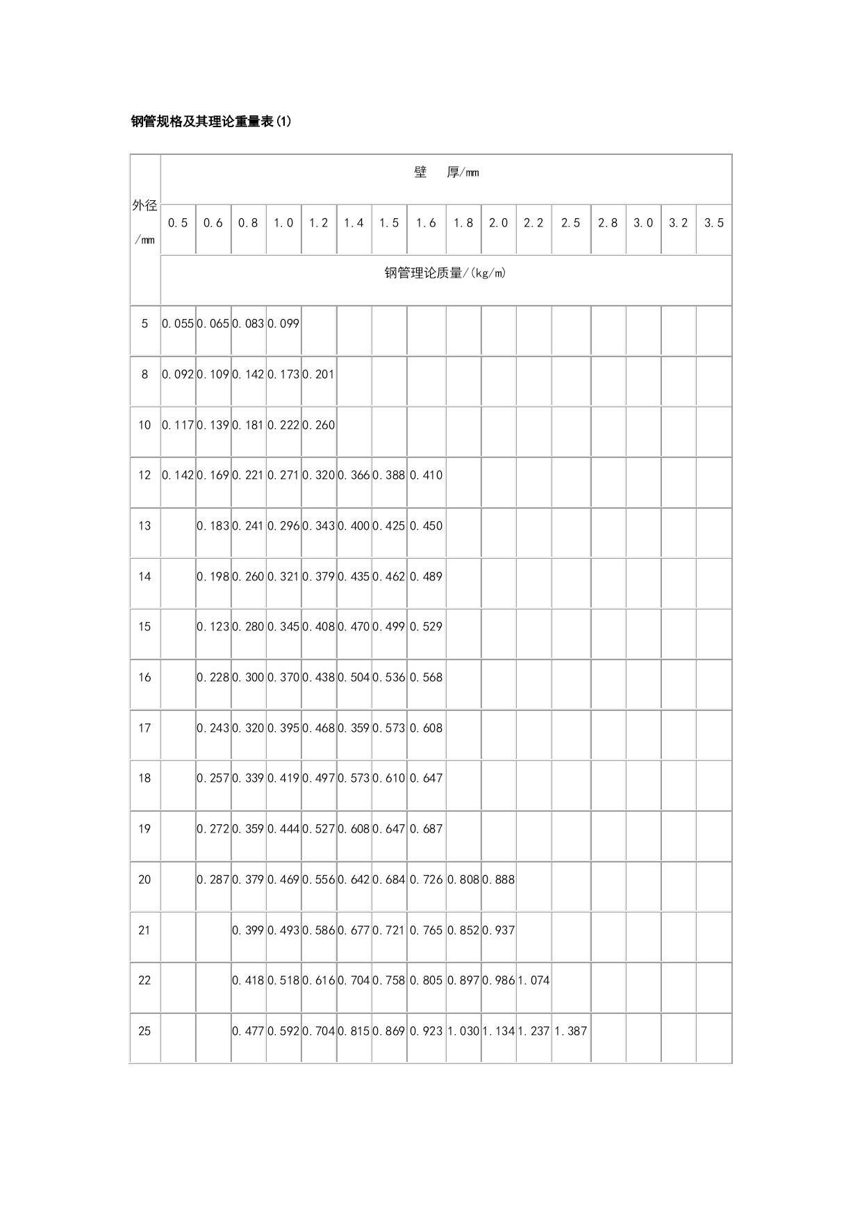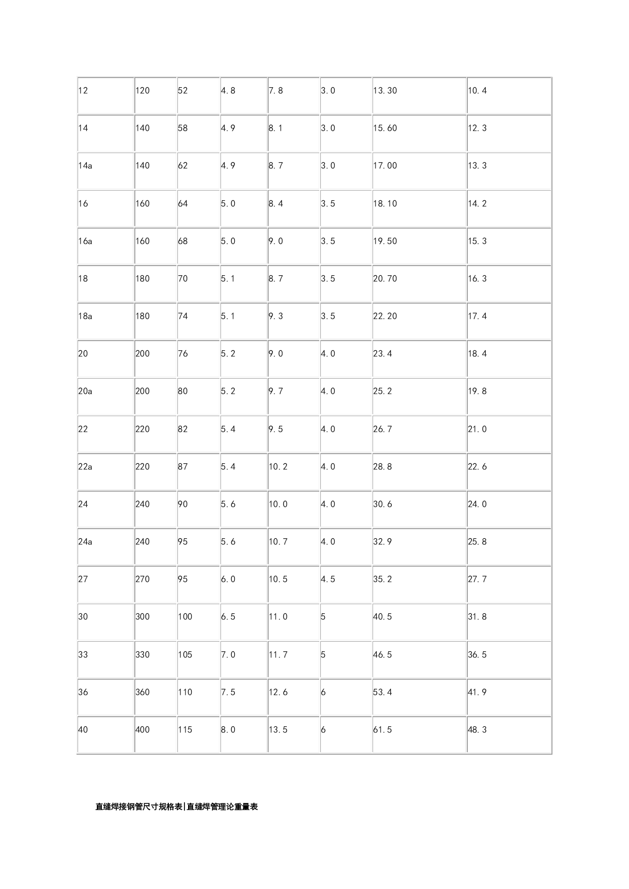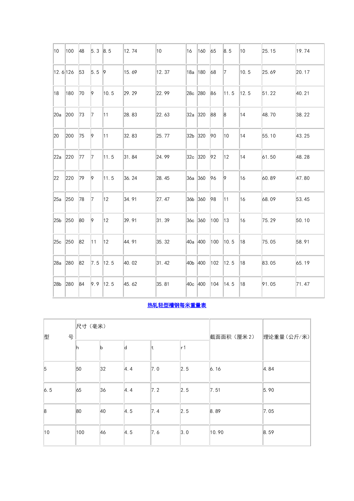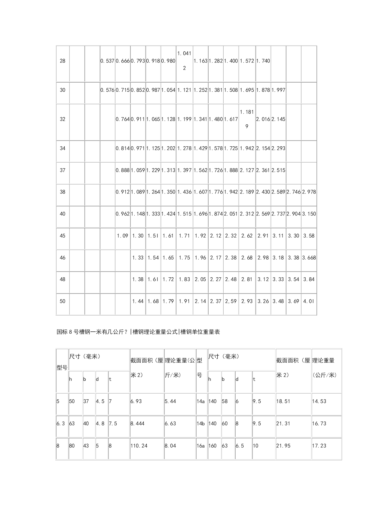 钢管规格及其理论重量表优质资料(可以直接使用,可编辑优质资料,欢迎下载)钢管规格及其理论重量表(1)外径/mm壁厚/mm0.50.60.81.01.21.41.51.61.82.02.22.52.83.03.23.5钢管理论质量/(kg/m)50.0550.0650.0830.09980.0920.1090.1420.1730.201100.1170.1390.1810.2220.260120.1420.1690.2210.2710.3200.3660.3880.410130.1830.2410.2960.3430.4000.4250.450140.1980.2600.3210.3790.4350.4620.489150.1230.2800.3450.4080.4700.4990.529160.2280.3000.3700.4380.5040.5360.568170.2430.3200.3950.4680.3590.5730.608180.2570.3390.4190.4970.5730.6100.647190.2720.3590.4440.5270.6080.6470.687200.2870.3790.4690.5560.6420.6840.7260.8080.888210.3990.4930.5860.6770.7210.7650.8520.937220.4180.5180.6160.7040.7580.8050.8970.9861.074250.4770.5920.7040.8150.8690.9231.0301.1341.2371.387280.5370.6660.7930.9180.9801.04121.1631.2821.4001.5721.740300.5760.7150.8520.9871.0541.1211.2521.3811.5081.6951.8781.997320.7640.9111.0651.1281.1991.3411.4801.6171.18192.0162.145340.8140.9711.1251.2021.2781.4291.5781.7251.9422.1542.293370.8881.0591.2291.3131.3971.5621.7261.8882.1272.3612.515380.9121.0891.2641.3501.4361.6071.7761.9422.1892.4302.5892.7462.978400.9621.1481.3331.4241.5151.6961.8742.0512.3122.5692.7372.9043.150451.091.301.5l1.611.711.922.122.322.622.913.113.303.58461.331.541.651.751.962.172.382.682.983.183.383.668481.381.6l1.721.832.052.272.482.813.123.333.543.84501.441.681.791.912.142.372,592.933.263.483.694.0l国标8号槽钢一米有几公斤?|槽钢理论重量公式|槽钢单位重量表型号尺寸(毫米)截面面积(厘米2)理论重量(公斤/米)型号尺寸(毫米)截面面积(厘米2)理论重量(公斤/米)hbdthbdt550374.576.935.4414a1405869.518.5114.536.363404.87.58.4446.6314b1406089.521.3116.738804358110.248.0416a160636.51021.9517.2310100485.38.512.741016160658.51025.1519.7412.6126535.5915.6912.3718a18068710.525.6920.171818070910.529.2922.9928c2808611.512.551.2240.2120a2007371128.8322.6332a3208881448.7038.22202007591132.8325.7732b32090101455.1043.2522a22077711.531.8424.9932c32092121461.5048.282222079911.536.2428.4536a3609691660.8947.8025a2507871234.9127.4736b36098111668.0953.4525b2508091239.9131.3936c360100131675.2950.1025c25082111244.9135.3240a40010010.51875.0558.9128a280827.512.540.0231.4