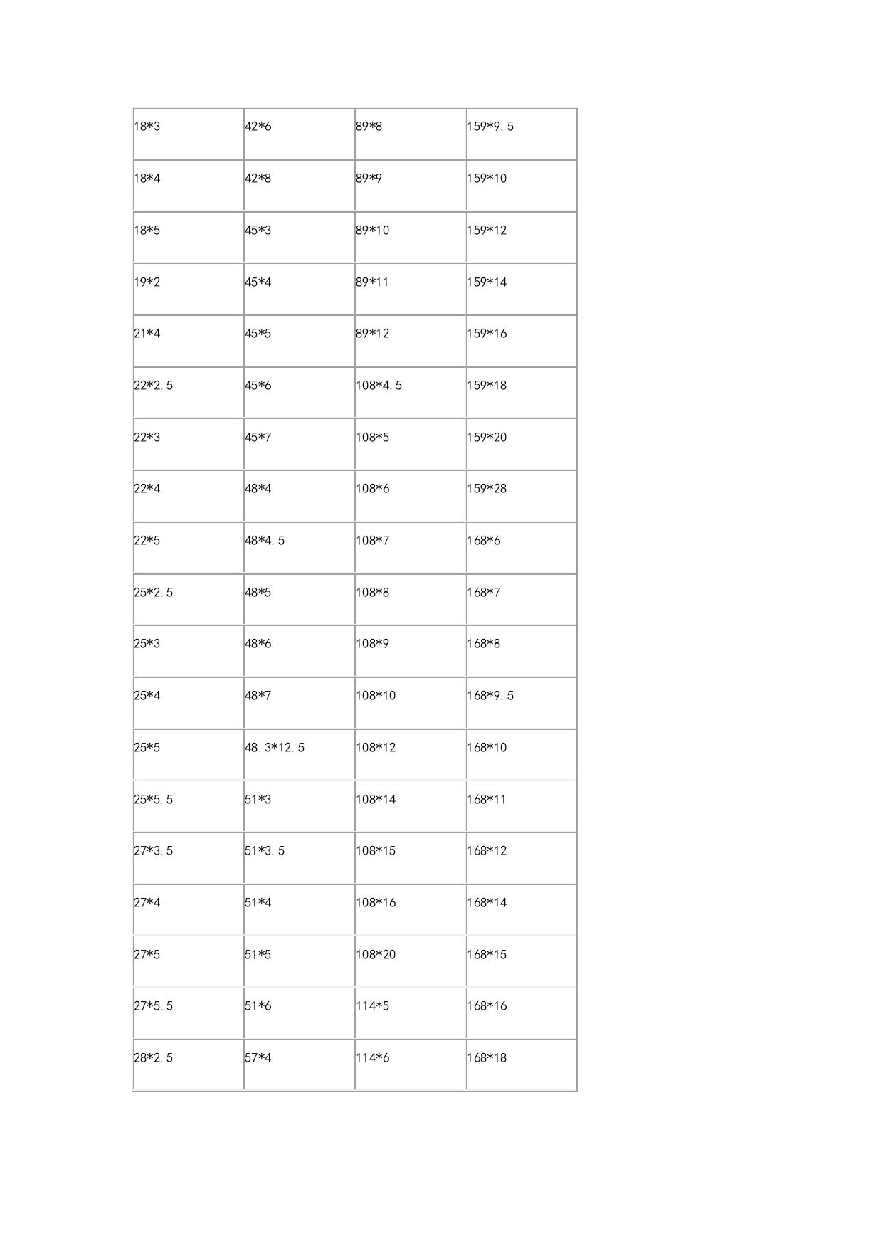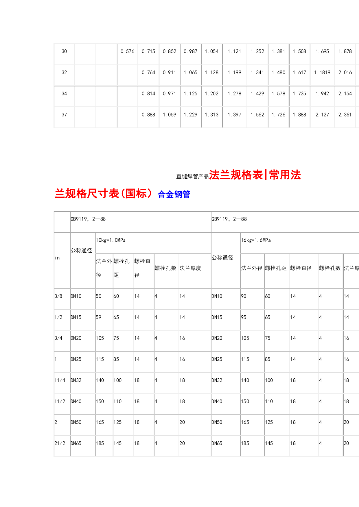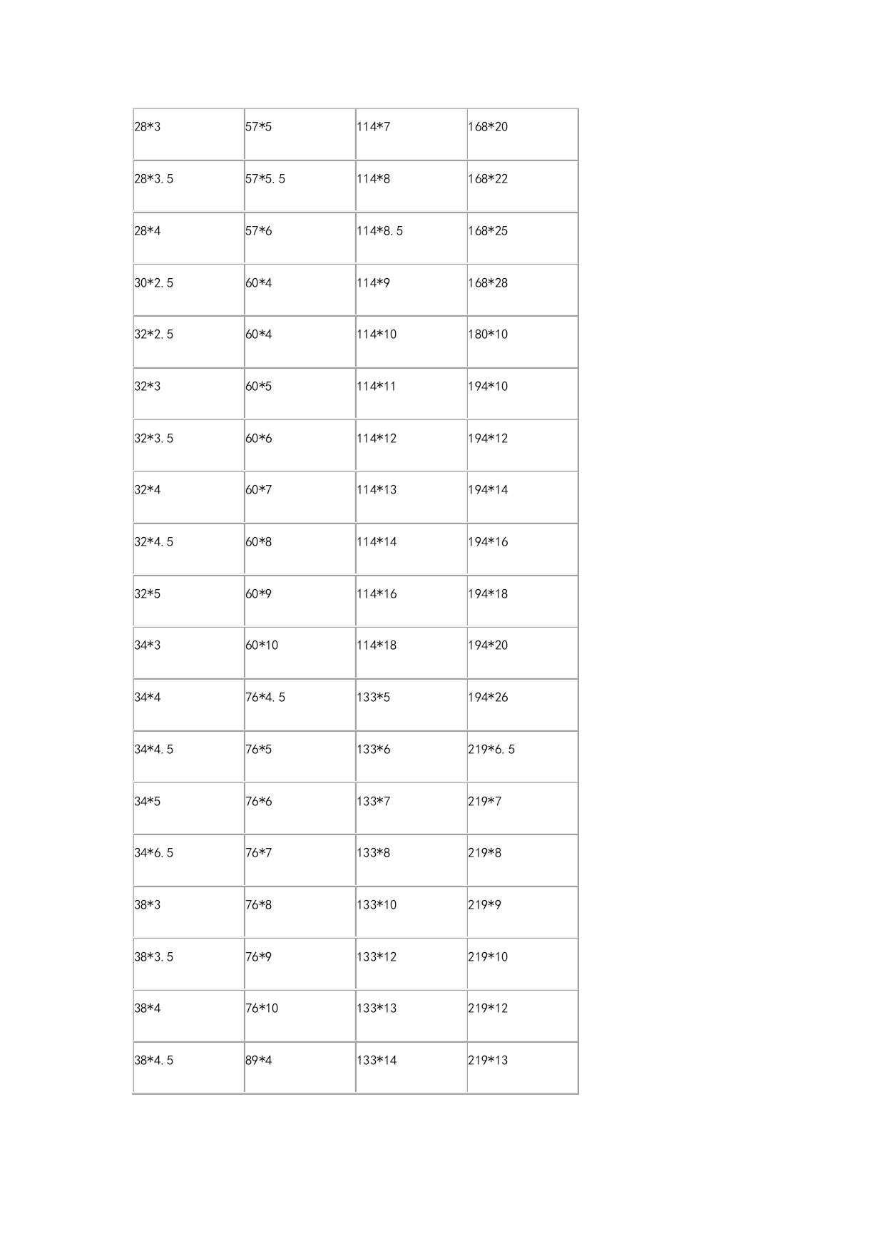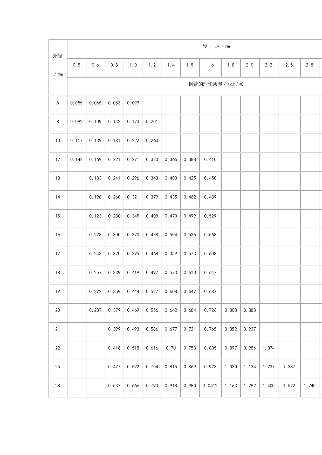 钢管规格及其理论重量表优质资料(可以直接使用,可编辑优质资料,欢迎下载)钢管规格及其理论重量表(1)外径/mm壁厚/mm0.50.60.81.01.21.41.51.61.82.02.22.52.83.03.23.5钢管理论质量/(kg/m)50.0550.0650.0830.09980.0920.1090.1420.1730.201100.1170.1390.1810.2220.260120.1420.1690.2210.2710.3200.3660.3880.410130.1830.2410.2960.3430.4000.4250.450140.1980.2600.3210.3790.4350.4620.489150.1230.2800.3450.4080.4700.4990.529160.2280.3000.3700.4380.5040.5360.568170.2430.3200.3950.4680.3590.5730.608180.2570.3390.4190.4970.5730.6100.647190.2720.3590.4440.5270.6080.6470.687200.2870.3790.4690.5560.6420.6840.7260.8080.888210.3990.4930.5860.6770.7210.7650.8520.937220.4180.5180.6160.7040.7580.8050.8970.9861.074250.4770.5920.7040.8150.8690.9231.0301.1341.2371.387280.5370.6660.7930.9180.9801.04121.1631.2821.4001.5721.740300.5760.7150.8520.9871.0541.1211.2521.3811.5081.6951.8781.997320.7640.9111.0651.1281.1991.3411.4801.6171.18192.0162.145340.8140.9711.1251.2021.2781.4291.5781.7251.9422.1542.293370.8881.0591.2291.3131.3971.5621.7261.8882.1272.3612.515380.9121.0891.2641.3501.4361.6071.7761.9422.1892.4302.5892.7462.978400.9621.1481.3331.4241.5151.6961.8742.0512.3122.5692.7372.9043.150451.091.301.5l1.611.711.922.122.322.622.913.113.303.58461.331.541.651.751.962.172.382.682.983.183.383.668481.381.6l1.721.832.052.272.482.813.123.333.543.84501.441.681.791.912.142.372,592.933.263.483.694.0l国标8号槽钢一米有几公斤?|槽钢理论重量公式|槽钢单位重量表型号尺寸(毫米)截面面积(厘米2)理论重量(公斤/米)型号尺寸(毫米)截面面积(厘米2)理论重量(公斤/米)hbdthbdt550374.576.935.4414a1405869.518.5114.536.363404.87.58.4446.6314b1406089.521.3116.738804358110.248.0416a160636.51021.9517.2310100485.38.512.741016160658.51025.1519.7412.6126535.5915.6912.3718a18068710.525.6920.171818070910.529.2922.9928c2808611.512.551.2240.2120a2007371128.8322.6332a3208881448.7038.22202007591132.8325.7732b32090101455.1043.2522a22077711.531.8424.9932c32092121461.5048.282222079911.536.2428.4536a3609691660.8947.8025a2507871234.9127.4736b36098111668.0953.4525b2508091239.9131.3936c360100131675.2950.1025c25082111244.9135.3240a40010010.51875.0558.9128a280827.512.540.0231.4