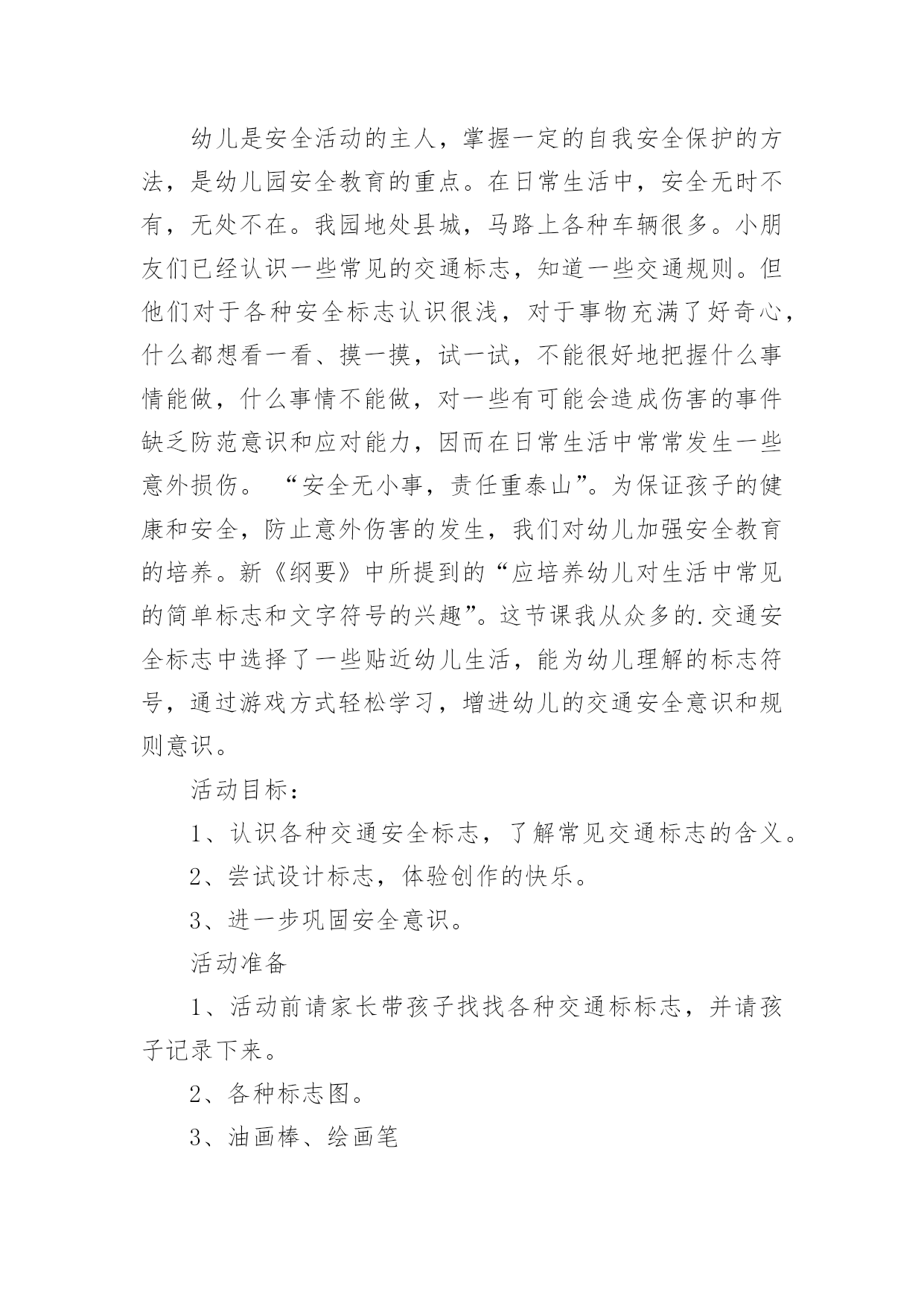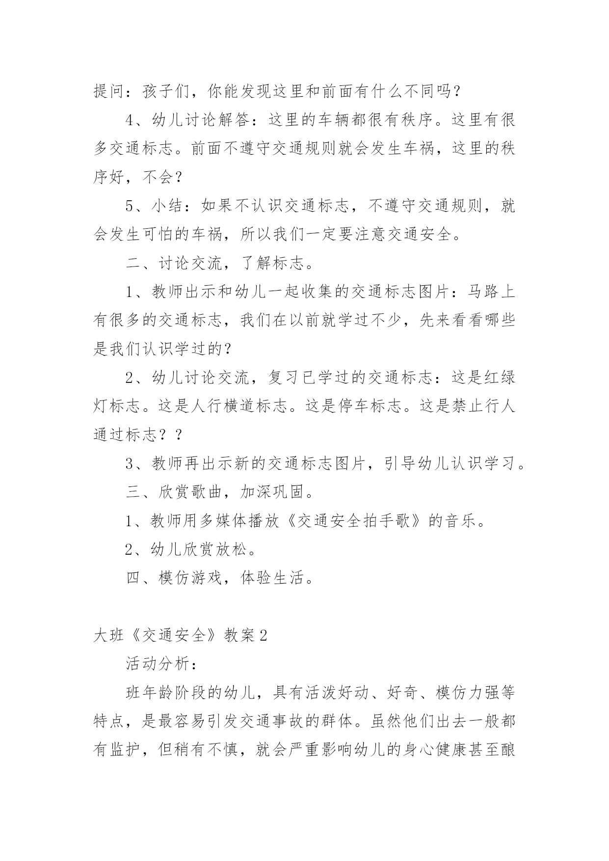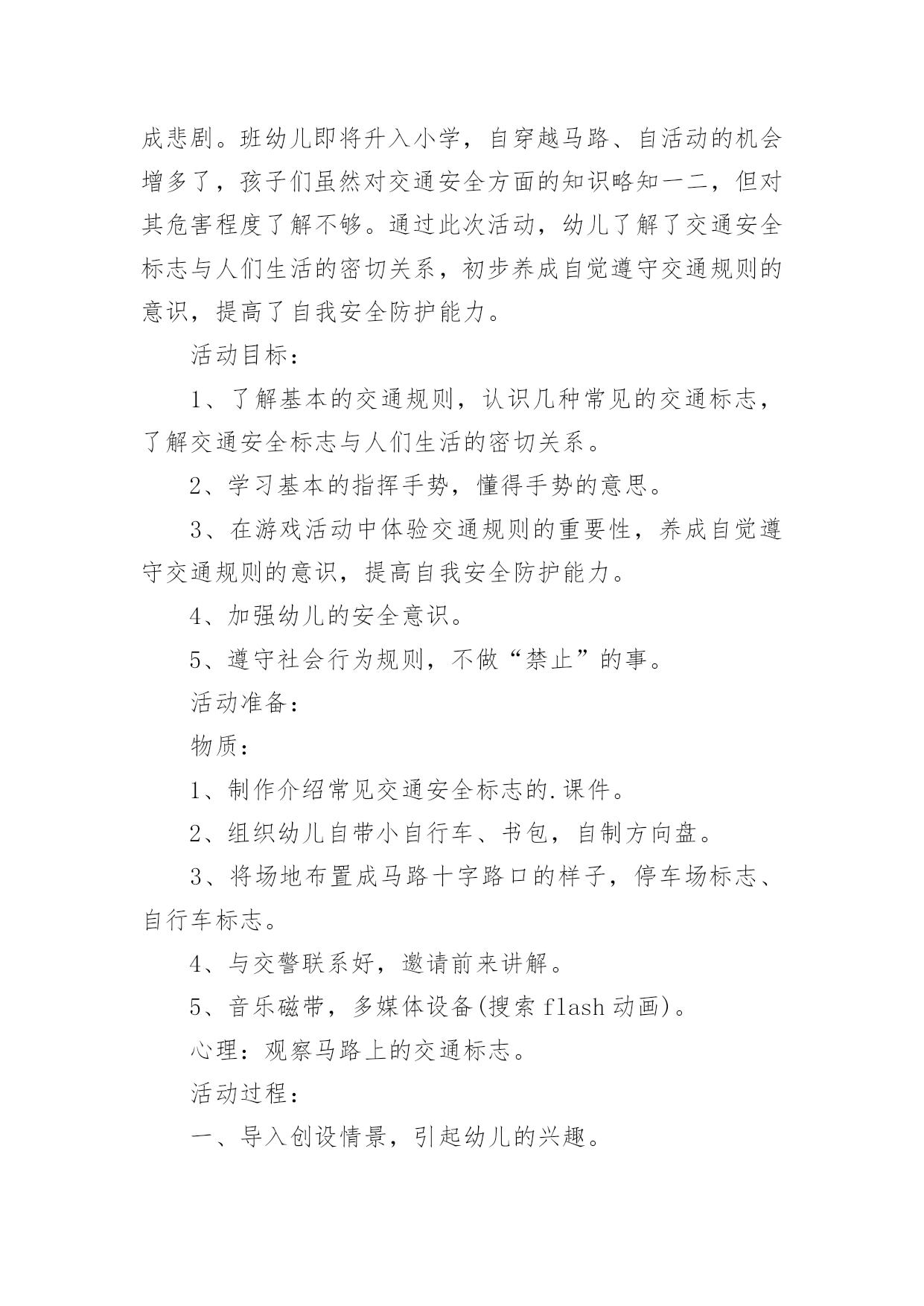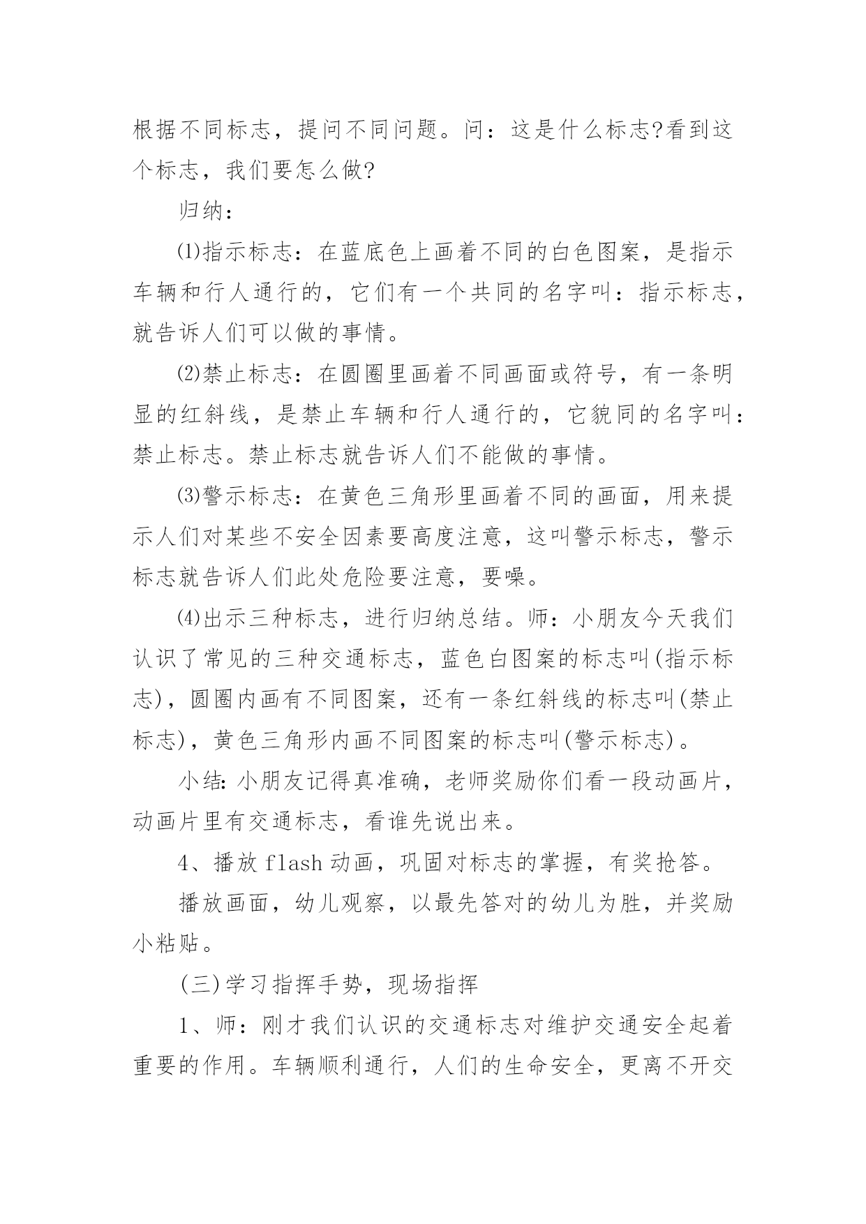 大班《交通安全》教案作为一位杰出的老师,通常需要准备好一份教案,编写教案有利于我们准确把握教材的重点与难点,进而选择恰当的教学方法。教案应该怎么写呢?下面是小编帮大家整理的大班《交通安全》教案,仅供参考,欢迎大家阅读。大班《交通安全》教案1教学目标:1、认识交通标志,了解行走时的交通规则。2、发展幼儿的观察力和口语表达能力,提高幼儿的自我保护能力。3、在活动中体验模仿游戏的快乐。教学准备:教师和幼儿一起收集有关的交通标志图片;自制的交通标志;多媒体课件。教学过程:一、设置悬念,激发兴趣。1、教师用多媒体展示交通混乱的.图片,幼儿仔细观察。师问:孩子们,请问你看到了什么?想到了什么?为什么会这样?2、幼儿讨论交流:马路中间有很多车和人,马路上没有警察叔叔和交通标志就会这样?3、教师继续展示交通井然有序的图片引导幼儿观察,提问:孩子们,你能发现这里和前面有什么不同吗?4、幼儿讨论解答:这里的车辆都很有秩序。这里有很多交通标志。前面不遵守交通规则就会发生车祸,这里的秩序好,不会?5、小结:如果不认识交通标志,不遵守交通规则,就会发生可怕的车祸,所以我们一定要注意交通安全。二、讨论交流,了解标志。1、教师出示和幼儿一起收集的交通标志图片:马路上有很多的交通标志,我们在以前就学过不少,先来看看哪些是我们认识学过的?2、幼儿讨论交流,复习已学过的交通标志:这是红绿灯标志。这是人行横道标志。这是停车标志。这是禁止行人通过标志??3、教师再出示新的交通标志图片,引导幼儿认识学习。三、欣赏歌曲,加深巩固。1、教师用多媒体播放《交通安全拍手歌》的音乐。2、幼儿欣赏放松。四、模仿游戏,体验生活。大班《交通安全》教案2活动分析:班年龄阶段的幼儿,具有活泼好动、好奇、模仿力强等特点,是最容易引发交通事故的群体。虽然他们出去一般都有监护,但稍有不慎,就会严重影响幼儿的身心健康甚至酿成悲剧。班幼儿即将升入小学,自穿越马路、自活动的机会增多了,孩子们虽然对交通安全方面的知识略知一二,但对其危害程度了解不够。通过此次活动,幼儿了解了交通安全标志与人们生活的密切关系,初步养成自觉遵守交通规则的意识,提高了自我安全防护能力。活动目标:1、了解基本的交通规则,认识几种常见的交通标志,了解交通安全标志与人们生活的密切关系。2、学习基本的指挥手势,懂得手势的意思。3、在游戏活动中体验交通规则的重要性,养成自觉遵守交通规则的意识,提高自我安全防护能力。4、加强幼儿的安全意识。5、遵守社会行为规则,不做“禁止”的事。活动准备:物质:1、制作介绍常见交通安全标志的.课件。2、组织幼儿自带小自行车、书包,自制方向盘。3、将场地布置成马路十字路口的样子,停车场标志、自行车标志。4、与交警联系好,邀请前来讲解。5、音乐磁带,多媒体设备(搜索flash动画)。心理:观察马路上的交通标志。活动过程:一、导入创设情景,引起幼儿的兴趣。师:小朋友你们看,这里有斑马线、栏杆,这里象什么地方?(马路)我们就来看马路上发生了什么事情?看谁看得最仔细。二、展开(一)观看情景表演,引起幼儿思考(注意提醒:又发生了一件事情)(表演内容:a、一名汽车司机车速较快,撞伤了横穿马路的小学生;b、一名行人看到交警不在,翻越栏杆横过马路。)问:"刚才你看到了什么?""是什么原因造成了危险事情的发生?""你想对他们说什么?"小结:多么危险可怕的事情,为了我们的生命安全,我们一定要遵守交通规则。(二)认识信号灯标识及几种常见交通标志1、认识信号灯,说说信号灯的作用。师:在生活中,很多马路上都有信号灯,信号灯有几种颜色?它告诉我们什么?(红灯停、绿灯行、黄灯亮了等一等)2、模拟游戏,体验信号灯在交通中的作用。师:我们来个做游戏,《遵守规则的小司机》。男孩扮演小司机,女孩扮演小学生,看信号过马路。交换角色再次游戏。小结:小司机们真遵守交通规则,相信平安一定会伴随你们。3、播放课件,认识几种常见的交通标志,了解交通标志与人们生活的关系。师:在车辆穿梭的马路上,除了信号灯这个交通标志外,还有很多交通标志。今天刘老师就带来了几种,你们想看吗?根据不同标志,提问不同问题。问:这是什么标志?看到这个标志,我们要怎么做?归纳:⑴指示标志:在蓝底色上画着不同的白色图案,是指示车辆和行人通行的,它们有一个共同的名字叫:指示标志,就告诉人们可以做的事情。⑵禁止标志:在圆圈里画着不同画面或符号,有一条明显的红斜线,是禁止车辆和行人通行的,它貌同的名字叫:禁止标志。禁止标志就告诉人们不能做的事情。⑶警示标志:在黄色三角形里画着不同的画面,用来提示人们对某些不安全因素要高度注意,这叫警示标志,警示标志就告诉人们此处危险要注意,要噪。⑷出示三种标志,进行归纳总结。师:小朋友今天我们认识了常见的三种交通标志,蓝色白图案的标志叫(指示标志),圆