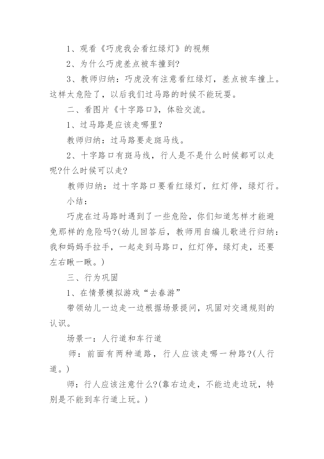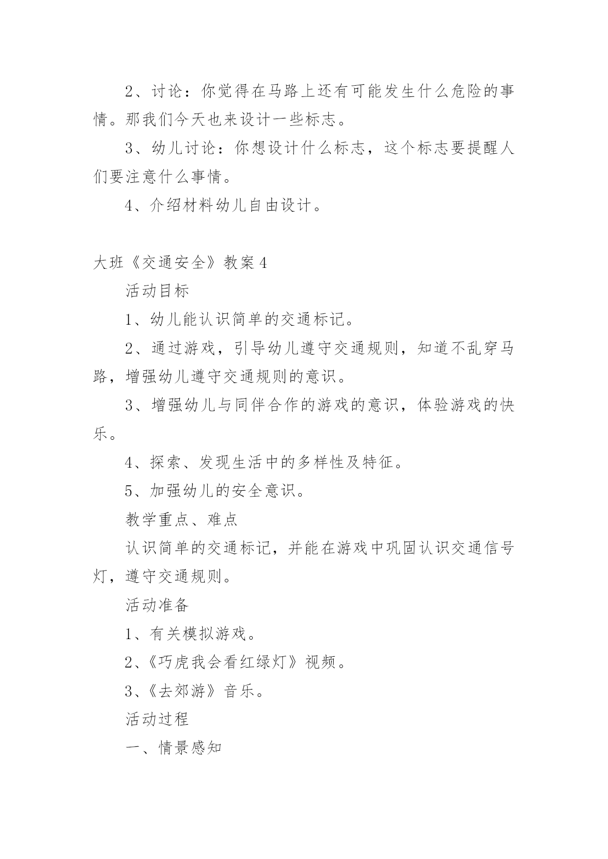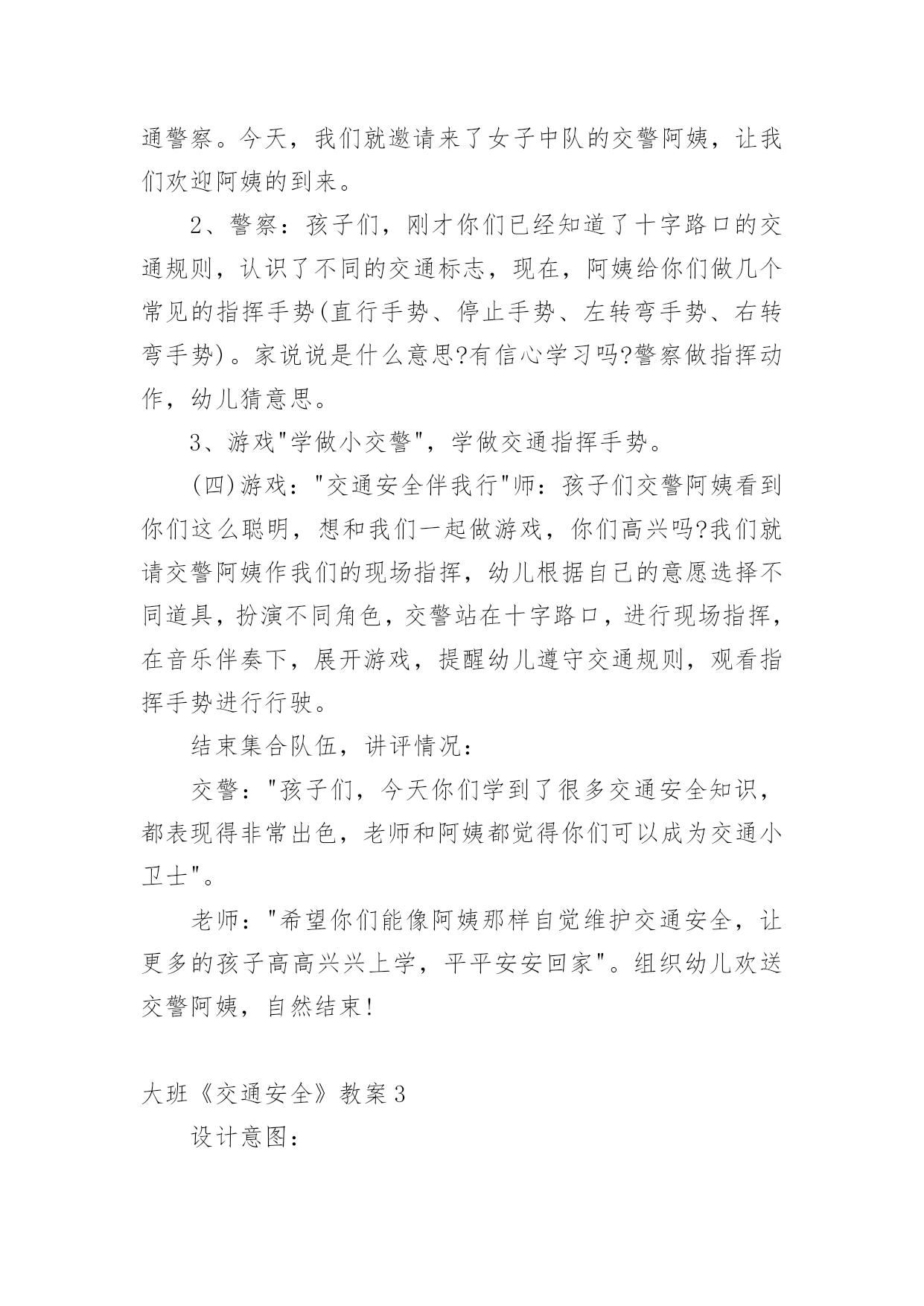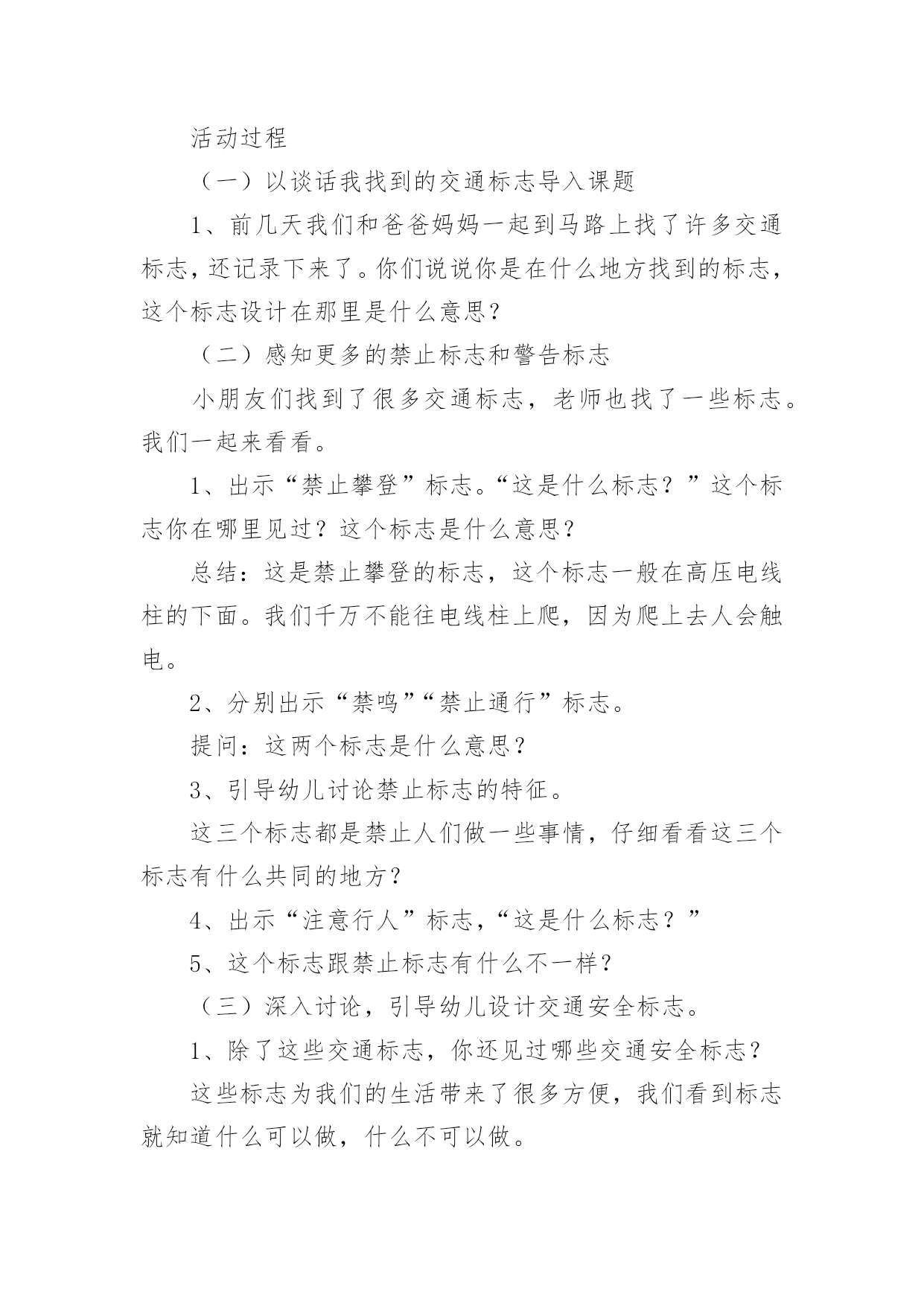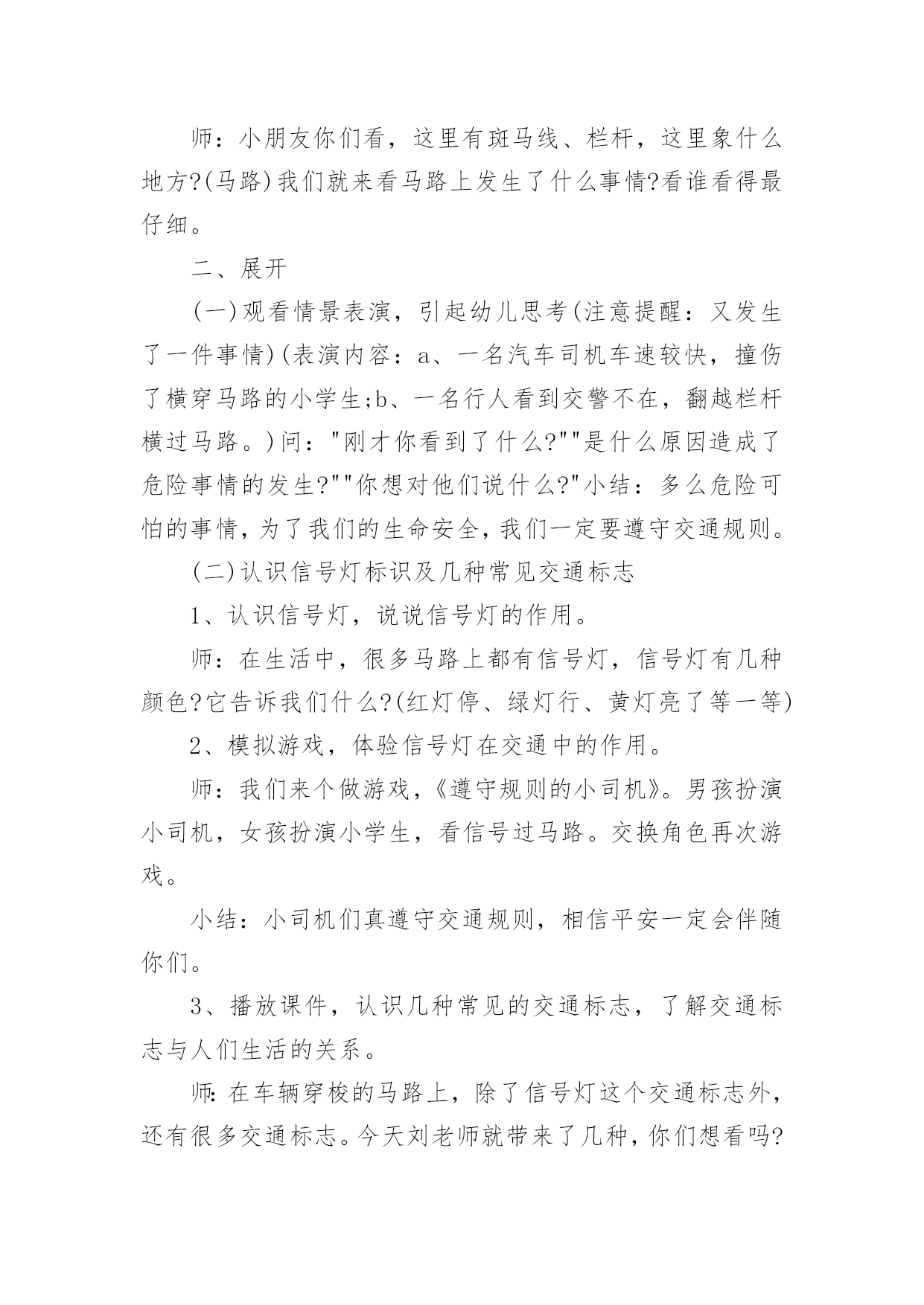 大班《交通安全》教案作为一位杰出的老师,通常需要准备好一份教案,编写教案有利于我们准确把握教材的重点与难点,进而选择恰当的教学方法。教案应该怎么写呢?下面是小编帮大家整理的大班《交通安全》教案,仅供参考,欢迎大家阅读。大班《交通安全》教案1教学目标:1、认识交通标志,了解行走时的交通规则。2、发展幼儿的观察力和口语表达能力,提高幼儿的自我保护能力。3、在活动中体验模仿游戏的快乐。教学准备:教师和幼儿一起收集有关的交通标志图片;自制的交通标志;多媒体课件。教学过程:一、设置悬念,激发兴趣。1、教师用多媒体展示交通混乱的.图片,幼儿仔细观察。师问:孩子们,请问你看到了什么?想到了什么?为什么会这样?2、幼儿讨论交流:马路中间有很多车和人,马路上没有警察叔叔和交通标志就会这样?3、教师继续展示交通井然有序的图片引导幼儿观察,提问:孩子们,你能发现这里和前面有什么不同吗?4、幼儿讨论解答:这里的车辆都很有秩序。这里有很多交通标志。前面不遵守交通规则就会发生车祸,这里的秩序好,不会?5、小结:如果不认识交通标志,不遵守交通规则,就会发生可怕的车祸,所以我们一定要注意交通安全。二、讨论交流,了解标志。1、教师出示和幼儿一起收集的交通标志图片:马路上有很多的交通标志,我们在以前就学过不少,先来看看哪些是我们认识学过的?2、幼儿讨论交流,复习已学过的交通标志:这是红绿灯标志。这是人行横道标志。这是停车标志。这是禁止行人通过标志??3、教师再出示新的交通标志图片,引导幼儿认识学习。三、欣赏歌曲,加深巩固。1、教师用多媒体播放《交通安全拍手歌》的音乐。2、幼儿欣赏放松。四、模仿游戏,体验生活。大班《交通安全》教案2活动分析:班年龄阶段的幼儿,具有活泼好动、好奇、模仿力强等特点,是最容易引发交通事故的群体。虽然他们出去一般都有监护,但稍有不慎,就会严重影响幼儿的身心健康甚至酿成悲剧。班幼儿即将升入小学,自穿越马路、自活动的机会增多了,孩子们虽然对交通安全方面的知识略知一二,但对其危害程度了解不够。通过此次活动,幼儿了解了交通安全标志与人们生活的密切关系,初步养成自觉遵守交通规则的意识,提高了自我安全防护能力。活动目标:1、了解基本的交通规则,认识几种常见的交通标志,了解交通安全标志与人们生活的密切关系。2、学习基本的指挥手势,懂得手势的意思。3、在游戏活动中体验交通规则的重要性,养成自觉遵守交通规则的意识,提高自我安全防护能力。4、加强幼儿的安全意识。5、遵守社会行为规则,不做“禁止”的事。活动准备:物质:1、制作介绍常见交通安全标志的.课件。2、组织幼儿自带小自行车、书包,自制方向盘。3、将场地布置成马路十字路口的样子,停车场标志、自行车标志。4、与交警联系好,邀请前来讲解。5、音乐磁带,多媒体设备(搜索flash动画)。心理:观察马路上的交通标志。活动过程:一、导入创设情景,引起幼儿的兴趣。师:小朋友你们看,这里有斑马线、栏杆,这里象什么地方?(马路)我们就来看马路上发生了什么事情?看谁看得最仔细。二、展开(一)观看情景表演,引起幼儿思考(注意提醒:又发生了一件事情)(表演内容:a、一名汽车司机车速较快,撞伤了横穿马路的小学生;b、一名行人看到交警不在,翻越栏杆横过马路。)问:"刚才你看到了什么?""是什么原因造成了危险事情的发生?""你想对他们说什么?"小结:多么危险可怕的事情,为了我们的生命安全,我们一定要遵守交通规则。(二)认识信号灯标识及几种常见交通标志1、认识信号灯,说说信号灯的作用。师:在生活中,很多马路上都有信号灯,信号灯有几种颜色?它告诉我们什么?(红灯停、绿灯行、黄灯亮了等一等)2、模拟游戏,体验信号灯在交通中的作用。师:我们来个做游戏,《遵守规则的小司机》。男孩扮演小司机,女孩扮演小学生,看信号过马路。交换角色再次游戏。小结:小司机们真遵守交通规则,相信平安一定会伴随你们。3、播放课件,认识几种常见的交通标志,了解交通标志与人们生活的关系。师:在车辆穿梭的马路上,除了信号灯这个交通标志外,还有很多交通标志。今天刘老师就带来了几种,你们想看吗?根据不同标志,提问不同问题。问:这是什么标志?看到这个标志,我们要怎么做?归纳:⑴指示标志:在蓝底色上画着不同的白色图案,是指示车辆和行人通行的,它们有一个共同的名字叫:指示标志,就告诉人们可以做的事情。⑵禁止标志:在圆圈里画着不同画面或符号,有一条明显的红斜线,是禁止车辆和行人通行的,它貌同的名字叫:禁止标志。禁止标志就告诉人们不能做的事情。⑶警示标志:在黄色三角形里画着不同的画面,用来提示人们对某些不安全因素要高度注意,这叫警示标志,警示标志就告诉人们此处危险要注意,要噪。⑷出示三种标志,进行归纳总结。师:小朋友今天我们认识了常见的三种交通标志,蓝色白图案的标志叫(指示标志),圆