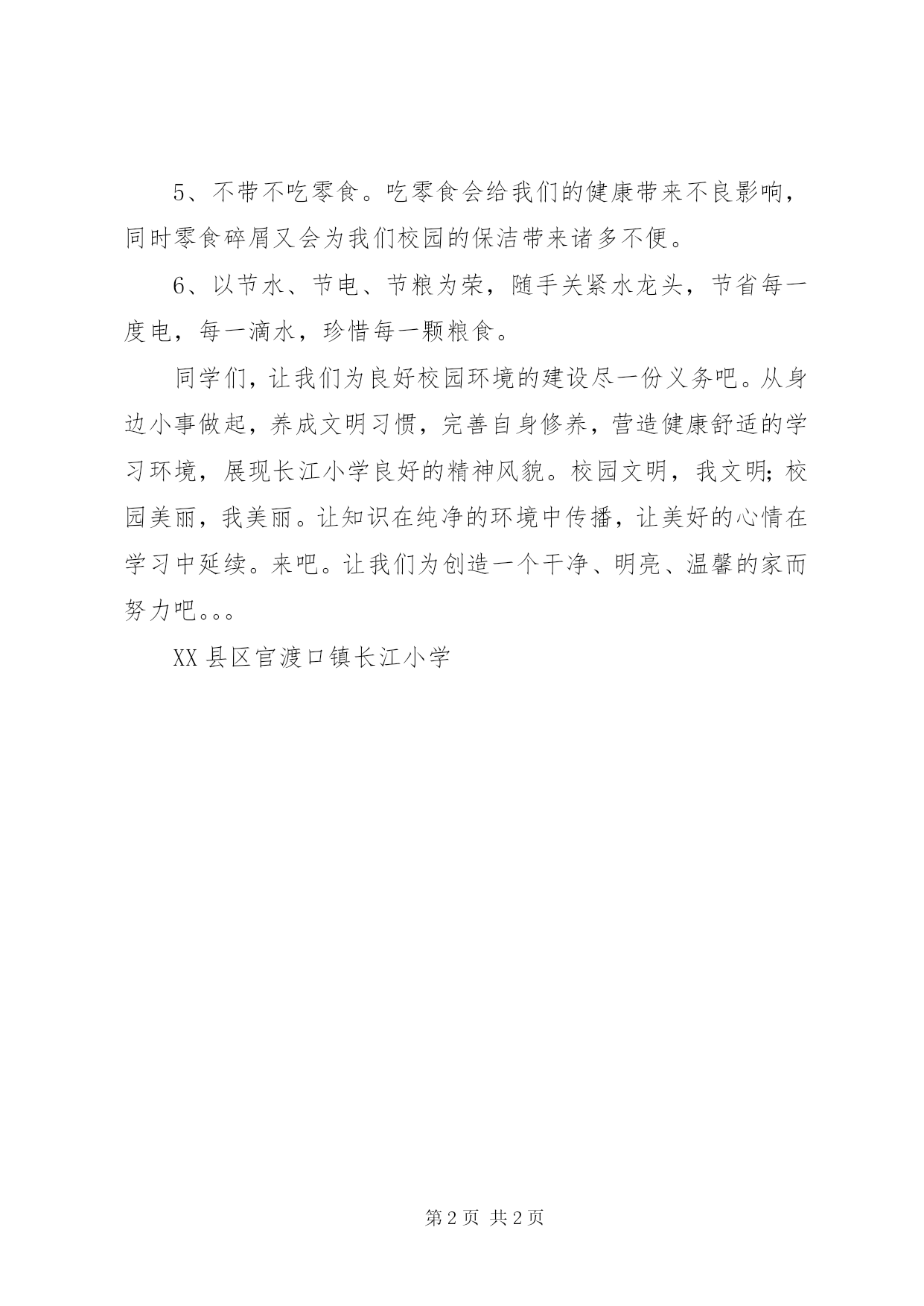 第PAGE\*Arabic\*MERGEFORMAT2页共NUMPAGES\*MERGEFORMAT2页校园环保倡议书敬爱的老师、亲爱的同学们:你们好。阳光明媚,空气清新,鸟语花香是我们梦寐以求的校园环境。多年来,我校一直努力绿化、美化、净化校园。还通过多种渠道普及环保理念,倡导绿色文明,更好的营造环境友好、构建和谐的人文环境。但是,随手乱扔垃圾、肆意浪费粮食、破坏花草树木、上下楼梯不讲秩序等不文明现象还时常出现在同学们的身边。我们每个人都希望在一个清洁、舒适的环境中学习生活,健康地成长,而美丽的环境需要我们共同营造,文明的习惯靠我们平时一点一滴地养成。在此我们特向全校师生发出以下倡议:1、不乱丢果皮纸屑,不随地吐痰,主动清理地面和墙壁上的污垢;2、主动捡拾别人丢在地上的垃圾,养成随手丢下垃圾可耻,弯腰拾起垃圾光荣的良好习惯;争做戴红领巾、讲普通话、做文明卫士小标兵;3、上下楼梯讲秩序,真正做到礼让右行;4、爱护公物,不在桌椅、墙体上乱涂乱画,爱护校园内的一草一木;5、不带不吃零食。吃零食会给我们的健康带来不良影响,同时零食碎屑又会为我们校园的保洁带来诸多不便。6、以节水、节电、节粮为荣,随手关紧水龙头,节省每一度电,每一滴水,珍惜每一颗粮食。同学们,让我们为良好校园环境的建设尽一份义务吧。从身边小事做起,养成文明习惯,完善自身修养,营造健康舒适的学习环境,展现长江小学良好的精神风貌。校园文明,我文明;校园美丽,我美丽。让知识在纯净的环境中传播,让美好的心情在学习中延续。来吧。让我们为创造一个干净、明亮、温馨的家而努力吧。。。XX县区官渡口镇长江小学