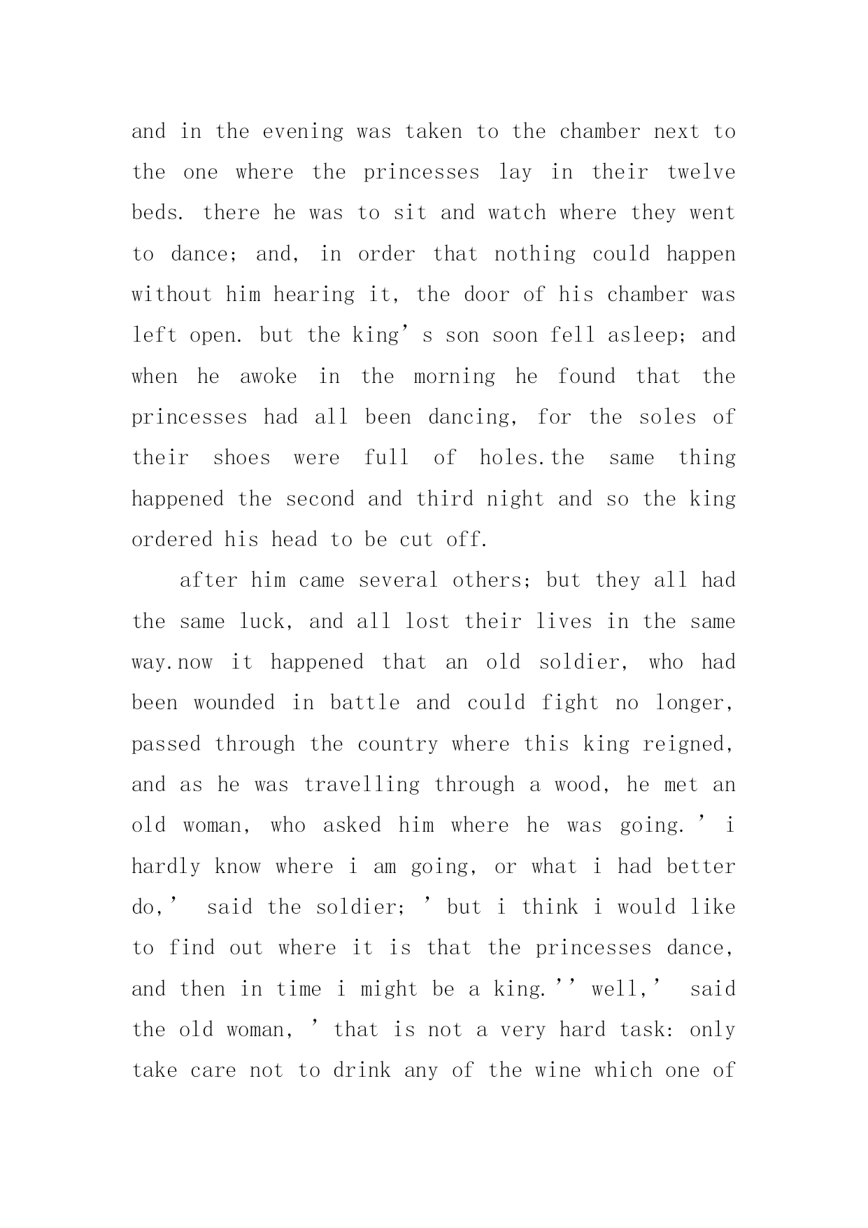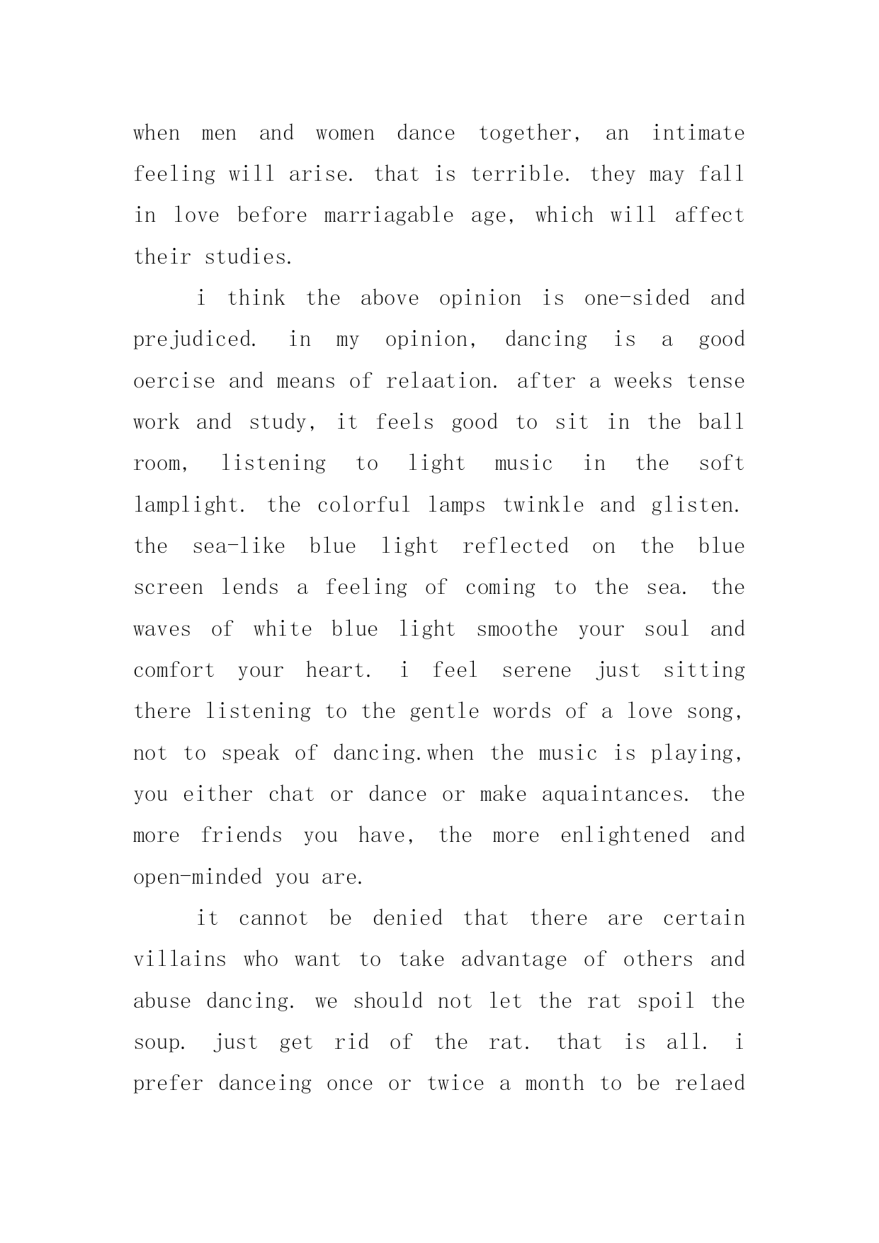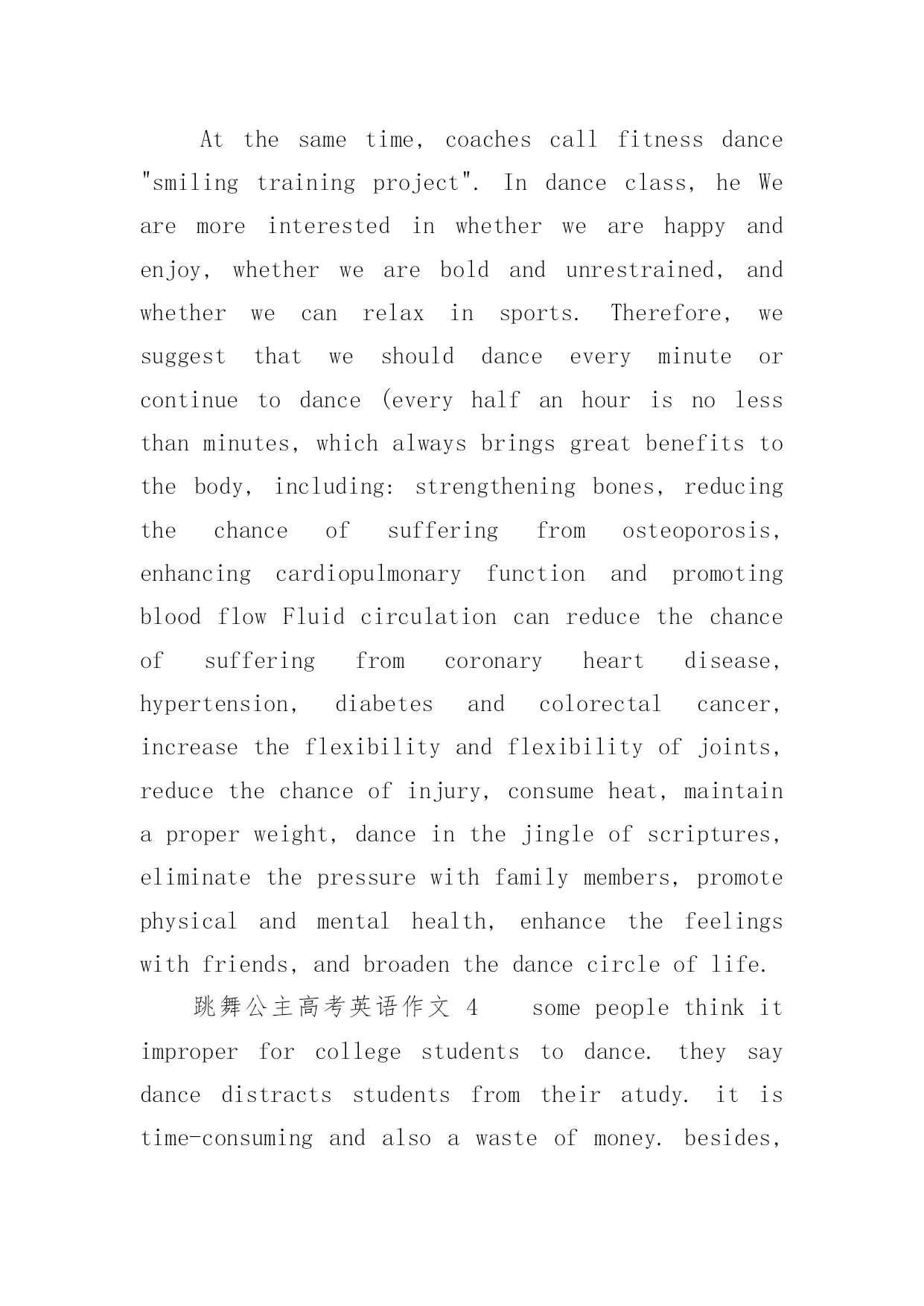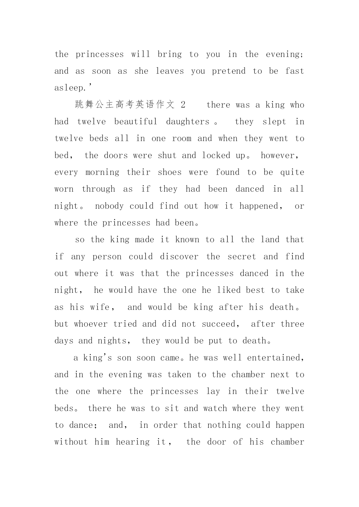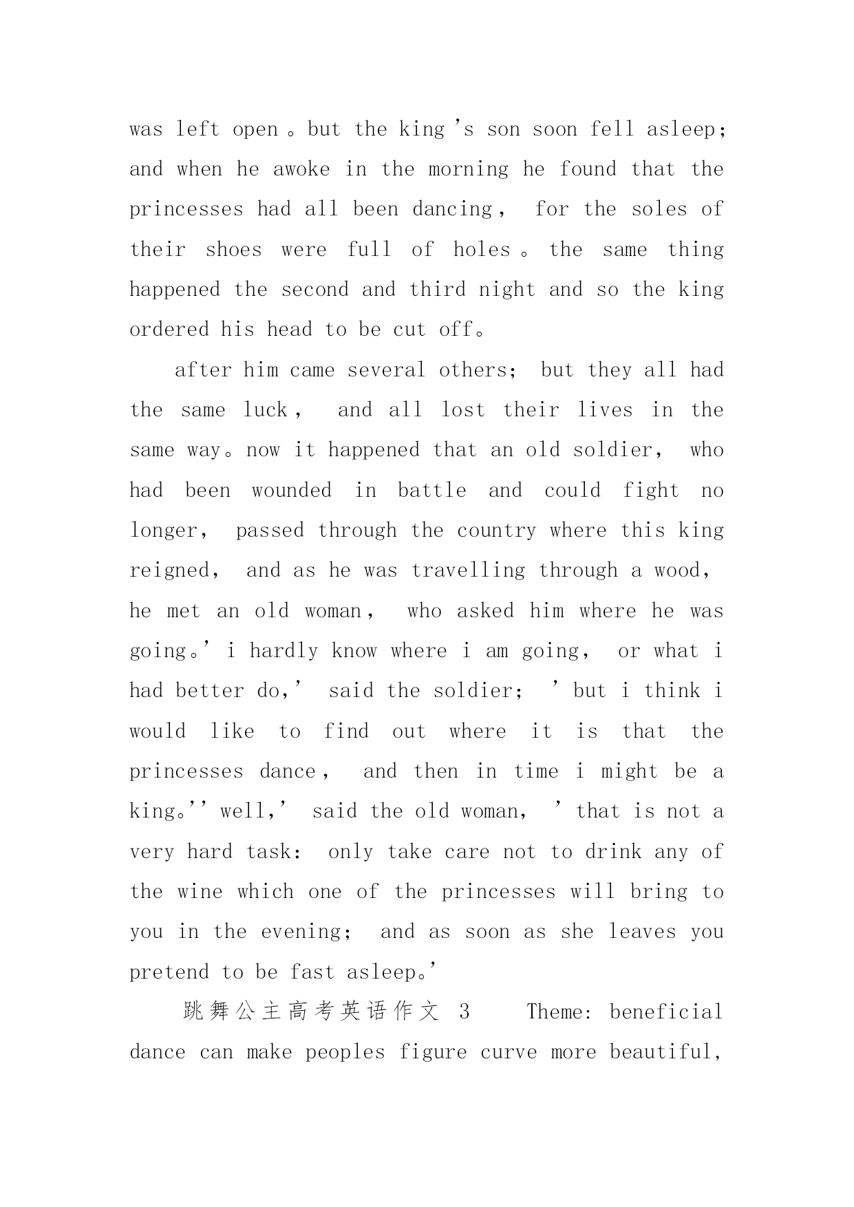 跳舞公主高考英语作文跳舞公主高考英语作文在平凡的学习、工作、生活中,大家对作文都不陌生吧,借助作文人们可以反映客观事物、表达思想感情、传递知识信息。相信很多朋友都对写作文感到非常苦恼吧,下面是小编精心整理的跳舞公主高考英语作文,欢迎大家分享。跳舞公主高考英语作文1therewasakingwhohadtwelvebeautifuldaughters.theysleptintwelvebedsallinoneroomandwhentheywenttobed,thedoorswereshutandlockedup.however,everymorningtheirshoeswerefoundtobequitewornthroughasiftheyhadbeendancedinallnight.nobodycouldfindouthowithappened,orwheretheprincesseshadbeen.sothekingmadeitknowntoallthelandthatifanypersoncoulddiscoverthesecretandfindoutwhereitwasthattheprincessesdancedinthenight,hewouldhavetheonehelikedbesttotakeashiswife,andwouldbekingafterhisdeath.butwhoevertriedanddidnotsucceed,afterthreedaysandnights,theywouldbeputtodeath.aking’ssonsooncame.hewaswellentertained,andintheeveningwastakentothechambernexttotheonewheretheprincesseslayintheirtwelvebeds.therehewastositandwatchwheretheywenttodance;and,inorderthatnothingcouldhappenwithouthimhearingit,thedoorofhischamberwasleftopen.buttheking’ssonsoonfellasleep;andwhenheawokeinthemorninghefoundthattheprincesseshadallbeendancing,forthesolesoftheirshoeswerefullofholes.thesamethinghappenedthesecondandthirdnightandsothekingorderedhisheadtobecutoff.afterhimcameseveralothers;buttheyallhadthesameluck,andalllosttheirlivesinthesameway.nowithappenedthatanoldsoldier,whohadbeenwoundedinbattleandcouldfightnolonger,passedthroughthecountrywherethiskingreigned,andashewastravellingthroughawood,hemetanoldwoman,whoaskedhimwherehewasgoing.’ihardlyknowwhereiamgoing,orwhatihadbetterdo,’saidthesoldier;’butithinkiwouldliketofindoutwhereitisthattheprincessesdance,andthenintimeimightbeaking.’’well,’saidtheoldwoman,’thatisnotaveryhardtask:onlytakecarenottodrinkanyofthewinewhichoneoftheprincesseswillbringtoyouintheevening;andassoonassheleavesyoupretendtobefastasleep.’跳舞公主高考英语作文2therewasakingwhohadtwelvebeautifuldaughters。theysleptintwelvebedsallinoneroomandwhentheywenttobed,thedoorswereshutandlockedup。however,everymorningtheirshoeswerefoundtobequitewornthroughasiftheyhadbeendancedinallnight。nobodycoul