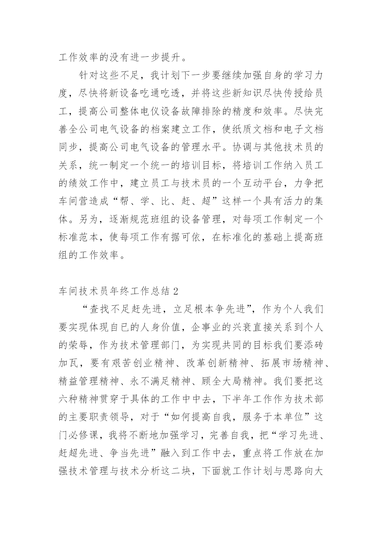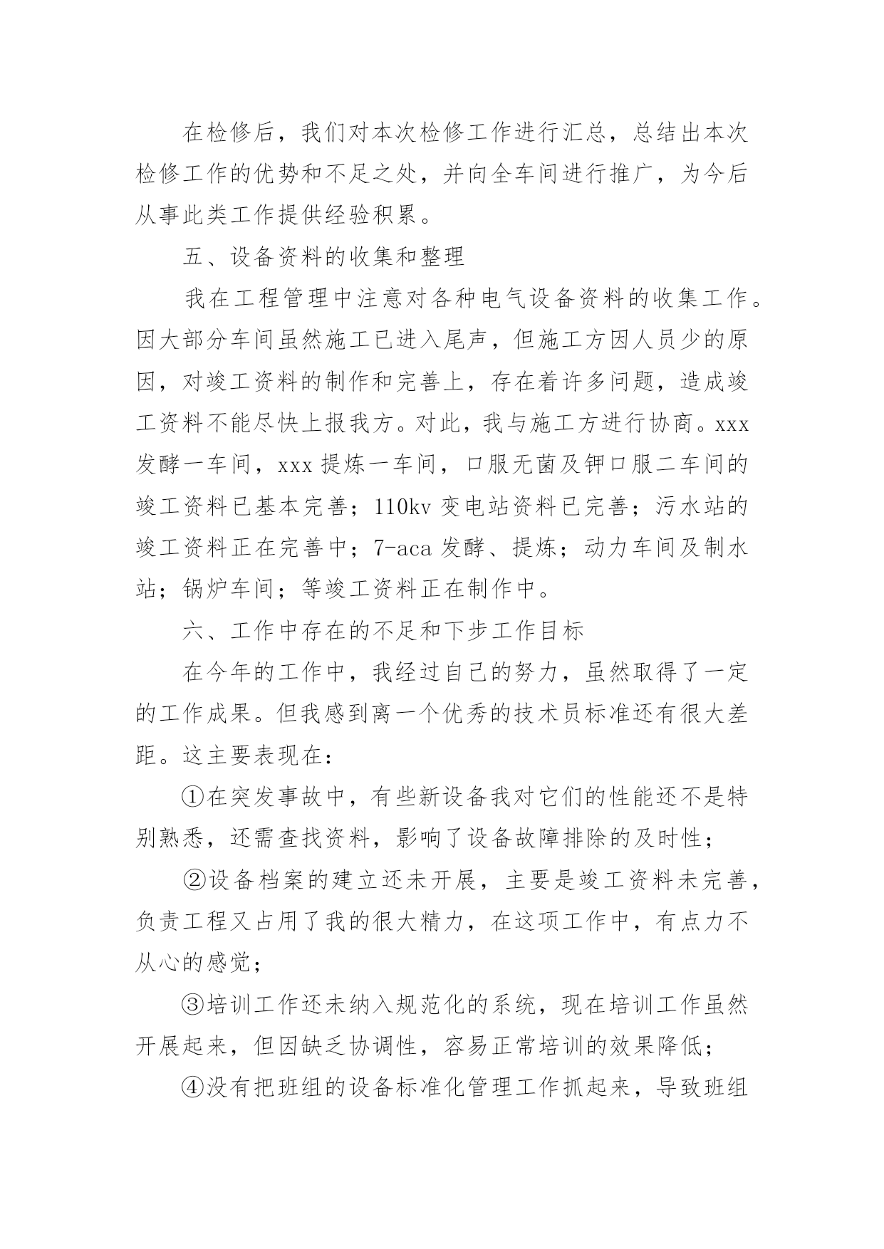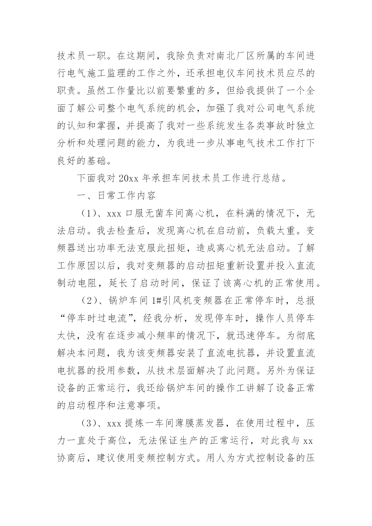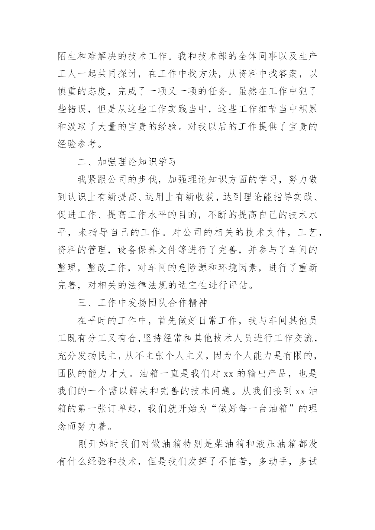 车间技术员年终工作总结车间技术员年终工作总结(10篇)总结是把一定阶段内的有关情况分析研究,做出有指导性的经验方法以及结论的书面材料,它能帮我们理顺知识结构,突出重点,突破难点,让我们一起认真地写一份总结吧。总结怎么写才不会千篇一律呢?下面是小编精心整理的车间技术员年终工作总结,供大家参考借鉴,希望可以帮助到有需要的朋友。车间技术员年终工作总结1紧张而又繁忙的20xx年即将过去了。过去的一年是不平凡的一年,对公司来说也是不平凡的一年,也是我个人专业技能全面进步的一年。在过去的一年之中作为一名技术员,在公司领导和工友们的关心和支持下,通过努力工作,为企业做出了应有的贡献,也有许多做得不足的一面。现将一年来的工作总结如下:一、工作概况我主要负责xx产品的相关技术工作。包括新图纸的画图、审核、工艺、产品的重量计算;生产中的一线操作、现场的技术指导,有时材料零件的准备,到后期的跟踪检验,零部件的请购等。面对一系列繁忙的日常工作任务及生产任务、有时的检验任务;面对在理论和生产实践中遇到的种种陌生和难解决的技术工作。我和技术部的全体同事以及生产工人一起共同探讨,在工作中找方法,从资料中找答案,以慎重的态度,完成了一项又一项的任务。虽然在工作中犯了些错误,但是从这些工作实践当中,这些工作细节当中积累和汲取了大量的宝贵的经验。对我以后的工作提供了宝贵的经验参考。二、加强理论知识学习我紧跟公司的步伐,加强理论知识方面的学习,努力做到认识上有新提高、运用上有新收获,达到理论能指导实践、促进工作、提高工作水平的目的,不断的提高自己的技术水平,来指导自己的工作。对公司的相关的技术文件,工艺,资料的管理,设备保养文件等进行了完善,并参与了车间的整理,整改工作,对车间的危险源和环境因素,进行了重新完善,对相关的法律法规的适宜性进行评估。三、工作中发扬团队合作精神在平时的工作中,首先做好日常工作,我与车间其他员工既有分工又有合,坚持经常和其他技术人员进行工作交流,充分发扬民主,从不主张个人主义,因为个人能力是有限的,团队的能力才大。油箱一直是我们对xx的输出产品,也是我们的一个需以解决和完善的技术问题。从我们接到xx油箱的第一张订单起,我们就开始为“做好每一台油箱”的理念而努力着。刚开始时我们对做油箱特别是柴油箱和液压油箱都没有什么经验和技术,但是我们发挥了不怕苦,多动手,多试验,多讨论,与主机厂多沟通的理念;从实验中得到经验,从失败中得到教训,终于把柴油箱做稳了下来,并从生产实践中得到了许多宝贵的经验,把工装,工艺基本上完善了,形成了小规模的生产。四、工作认真仔细在过去的一年里,感谢公司领导的支持理解,无论是在施工监理过程中,还是在项目竣工验收、零配件的质量验收过程中,我都做到认真仔细,坚持原则,严格按照规范和要求进行。在监理外协项目过程中,亲力亲为,认真负责,对每个关键工序严格把关,发现问题即立要求返工,并向相关主管及时沟通、汇报,使整个施工过程完全处于受控状态,使每个工程项目都能顺利验收。在xx的一年,使我在工作上思想上都有了很大的进步。当然成绩只代表过去,在以后的工作中我会加倍努力,争取做的更好。因为技术在不断进步更新,只有通过不断地学习,辅以求精务实,脚踏实地的作风,方能胜任自己的工作岗位。要使工程施工,技术和质检工作能贯穿始终,还须在工作经验的积累中,逐步培养自己的预见性;不断在现场检查、监督中随时发现问题,解决问题;使自己的现场综合处理能力不断的得到锻炼和提高。自20xx年x月我来到xx一园区工作现今,已有一年多的时间了。在这一年中,我一直在项目部工作,负责电气施工的现场管理及技术指导工作,凭借自己的努力和领导的提携,从一名普通的电气监理,进而又被提拔到兼任电仪车间技术员一职。在这期间,我除负责对南北厂区所属的车间进行电气施工监理的工作之外,还承担电仪车间技术员应尽的职责。虽然工作量比以前要繁重的多,但给我提供了一个全面了解公司整个电气系统的机会,加强了我对公司电气系统的认知和掌握,并提高了我对一些系统发生各类事故时独立分析和处理问题的能力,为我进一步从事电气技术工作打下良好的基础。下面我对20xx年承担车间技术员工作进行总结。一、日常工作内容(1)、xxx口服无菌车间离心机,在料满的情况下,无法启动。我去检查后,发现离心机在启动前,负载太重。变频器送出功率无法克服此扭矩,造成离心机无法启动。了解工作原因以后,我对变频器的启动扭矩重新设置并投入直流制动电阻,延长了启动时间,保证了该离心机的正常使用。(2)、锅炉车间1#引风机变频器在正常停车时,总报“停车时过电流”,经我分析,发现停车时,操作人员停车太快,没有在逐步减小频率的情况下,就迅速停车。为彻底解决本问题,我为该变频器安装了直流电抗器,并设置直流电抗器的投用参数,从技术层面解决了此问