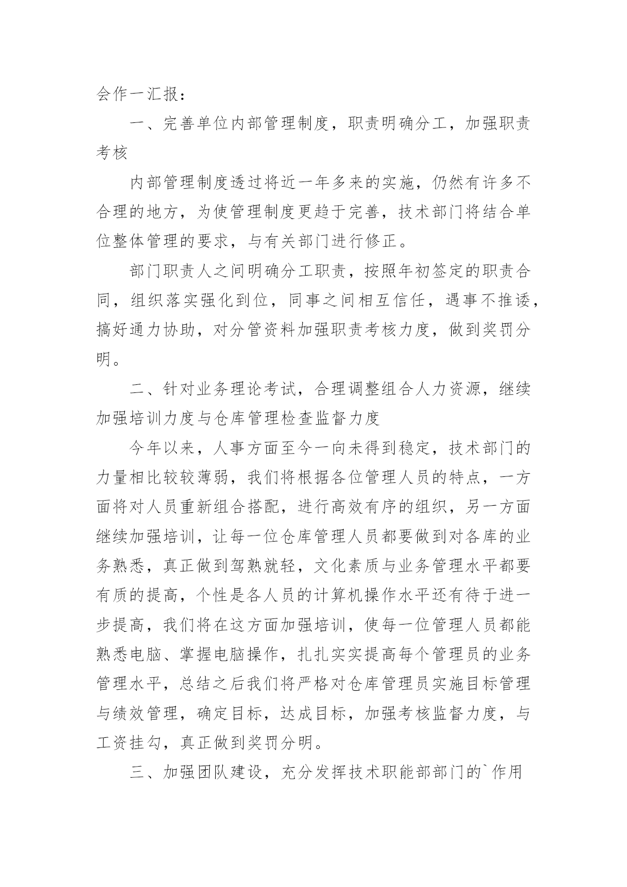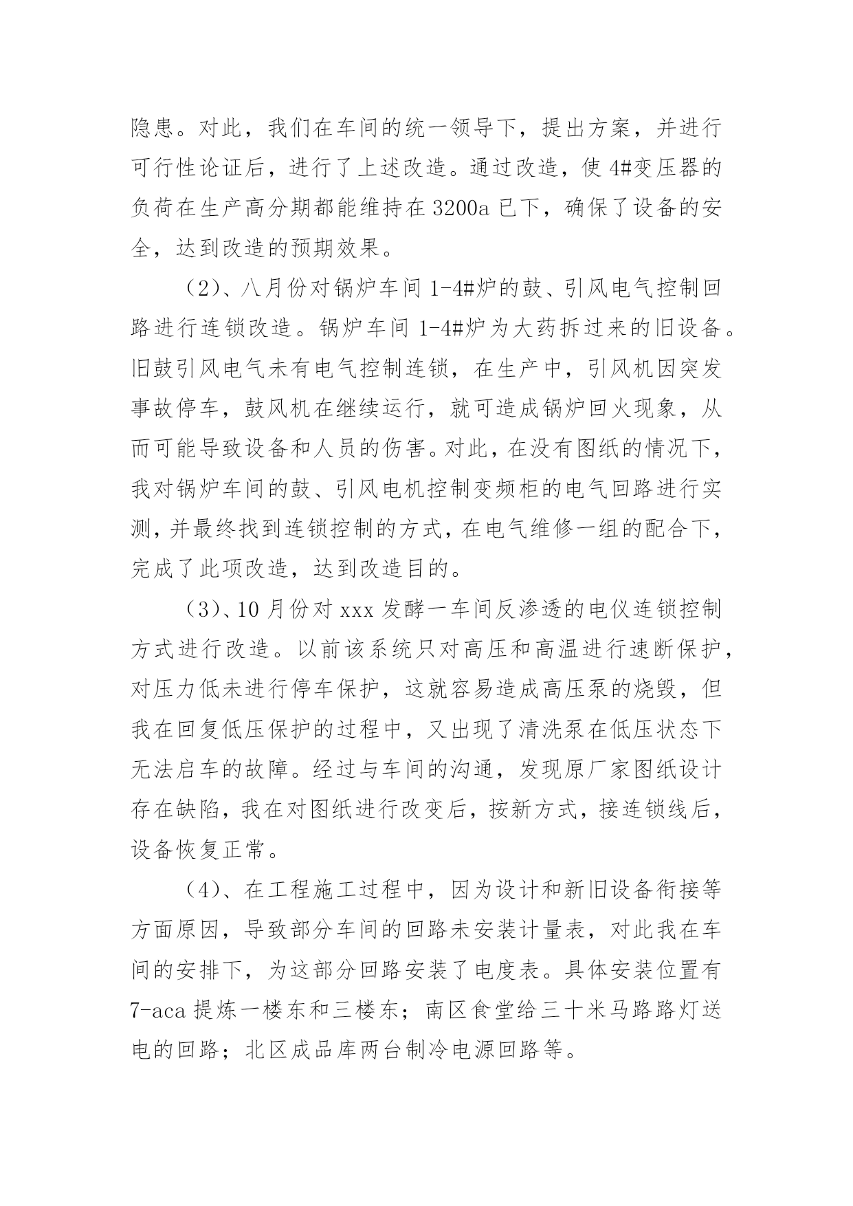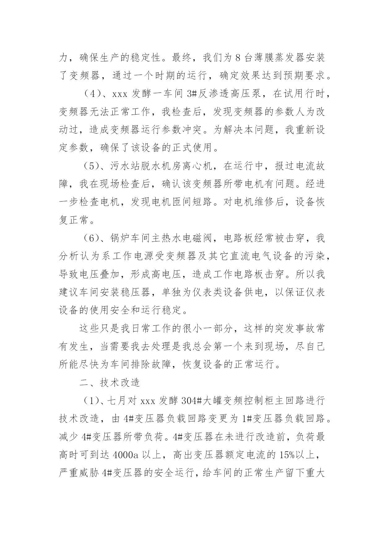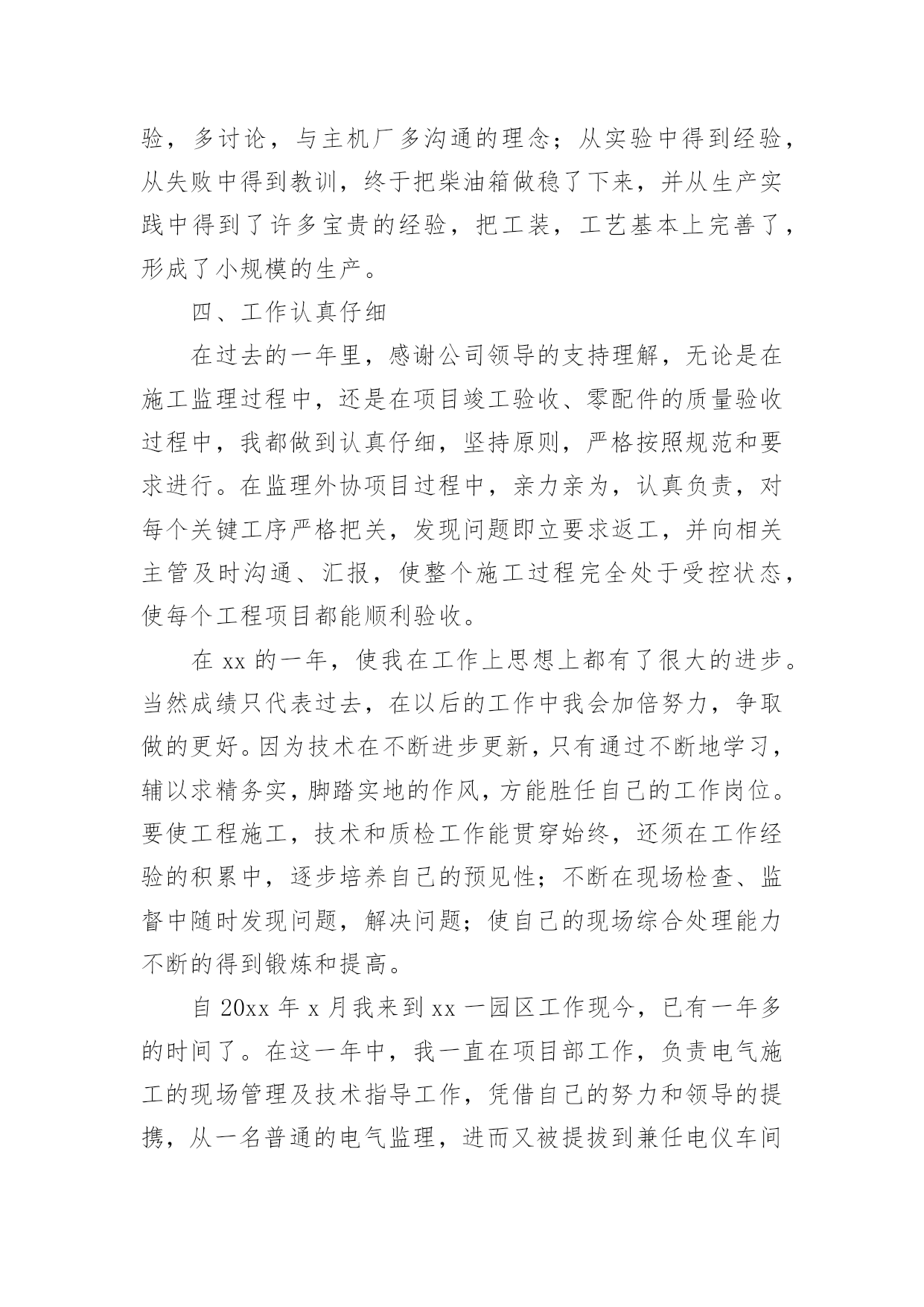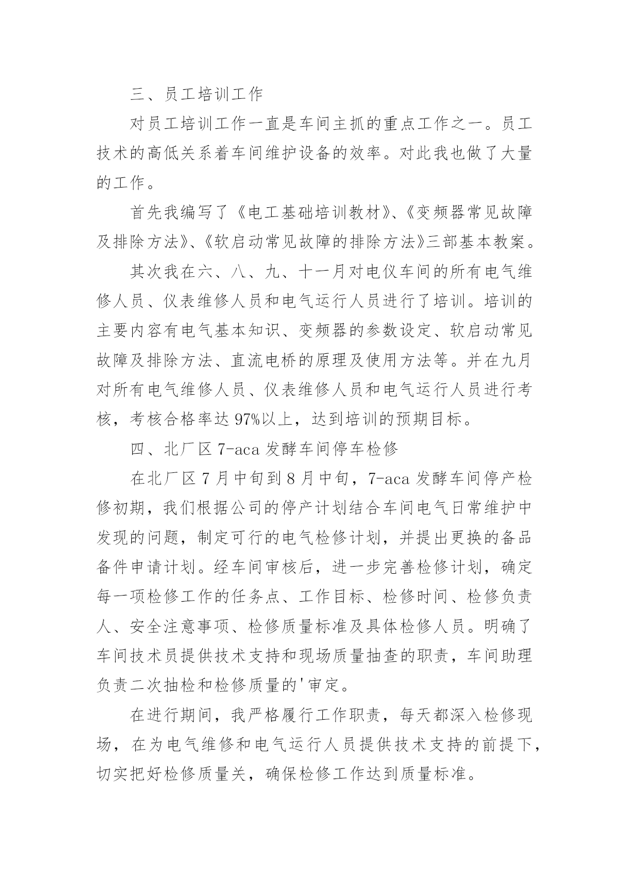 车间技术员年终工作总结车间技术员年终工作总结(10篇)总结是把一定阶段内的有关情况分析研究,做出有指导性的经验方法以及结论的书面材料,它能帮我们理顺知识结构,突出重点,突破难点,让我们一起认真地写一份总结吧。总结怎么写才不会千篇一律呢?下面是小编精心整理的车间技术员年终工作总结,供大家参考借鉴,希望可以帮助到有需要的朋友。车间技术员年终工作总结1紧张而又繁忙的20xx年即将过去了。过去的一年是不平凡的一年,对公司来说也是不平凡的一年,也是我个人专业技能全面进步的一年。在过去的一年之中作为一名技术员,在公司领导和工友们的关心和支持下,通过努力工作,为企业做出了应有的贡献,也有许多做得不足的一面。现将一年来的工作总结如下:一、工作概况我主要负责xx产品的相关技术工作。包括新图纸的画图、审核、工艺、产品的重量计算;生产中的一线操作、现场的技术指导,有时材料零件的准备,到后期的跟踪检验,零部件的请购等。面对一系列繁忙的日常工作任务及生产任务、有时的检验任务;面对在理论和生产实践中遇到的种种陌生和难解决的技术工作。我和技术部的全体同事以及生产工人一起共同探讨,在工作中找方法,从资料中找答案,以慎重的态度,完成了一项又一项的任务。虽然在工作中犯了些错误,但是从这些工作实践当中,这些工作细节当中积累和汲取了大量的宝贵的经验。对我以后的工作提供了宝贵的经验参考。二、加强理论知识学习我紧跟公司的步伐,加强理论知识方面的学习,努力做到认识上有新提高、运用上有新收获,达到理论能指导实践、促进工作、提高工作水平的目的,不断的提高自己的技术水平,来指导自己的工作。对公司的相关的技术文件,工艺,资料的管理,设备保养文件等进行了完善,并参与了车间的整理,整改工作,对车间的危险源和环境因素,进行了重新完善,对相关的法律法规的适宜性进行评估。三、工作中发扬团队合作精神在平时的工作中,首先做好日常工作,我与车间其他员工既有分工又有合,坚持经常和其他技术人员进行工作交流,充分发扬民主,从不主张个人主义,因为个人能力是有限的,团队的能力才大。油箱一直是我们对xx的输出产品,也是我们的一个需以解决和完善的技术问题。从我们接到xx油箱的第一张订单起,我们就开始为“做好每一台油箱”的理念而努力着。刚开始时我们对做油箱特别是柴油箱和液压油箱都没有什么经验和技术,但是我们发挥了不怕苦,多动手,多试验,多讨论,与主机厂多沟通的理念;从实验中得到经验,从失败中得到教训,终于把柴油箱做稳了下来,并从生产实践中得到了许多宝贵的经验,把工装,工艺基本上完善了,形成了小规模的生产。四、工作认真仔细在过去的一年里,感谢公司领导的支持理解,无论是在施工监理过程中,还是在项目竣工验收、零配件的质量验收过程中,我都做到认真仔细,坚持原则,严格按照规范和要求进行。在监理外协项目过程中,亲力亲为,认真负责,对每个关键工序严格把关,发现问题即立要求返工,并向相关主管及时沟通、汇报,使整个施工过程完全处于受控状态,使每个工程项目都能顺利验收。在xx的一年,使我在工作上思想上都有了很大的进步。当然成绩只代表过去,在以后的工作中我会加倍努力,争取做的更好。因为技术在不断进步更新,只有通过不断地学习,辅以求精务实,脚踏实地的作风,方能胜任自己的工作岗位。要使工程施工,技术和质检工作能贯穿始终,还须在工作经验的积累中,逐步培养自己的预见性;不断在现场检查、监督中随时发现问题,解决问题;使自己的现场综合处理能力不断的得到锻炼和提高。自20xx年x月我来到xx一园区工作现今,已有一年多的时间了。在这一年中,我一直在项目部工作,负责电气施工的现场管理及技术指导工作,凭借自己的努力和领导的提携,从一名普通的电气监理,进而又被提拔到兼任电仪车间技术员一职。在这期间,我除负责对南北厂区所属的车间进行电气施工监理的工作之外,还承担电仪车间技术员应尽的职责。虽然工作量比以前要繁重的多,但给我提供了一个全面了解公司整个电气系统的机会,加强了我对公司电气系统的认知和掌握,并提高了我对一些系统发生各类事故时独立分析和处理问题的能力,为我进一步从事电气技术工作打下良好的基础。下面我对20xx年承担车间技术员工作进行总结。一、日常工作内容(1)、xxx口服无菌车间离心机,在料满的情况下,无法启动。我去检查后,发现离心机在启动前,负载太重。变频器送出功率无法克服此扭矩,造成离心机无法启动。了解工作原因以后,我对变频器的启动扭矩重新设置并投入直流制动电阻,延长了启动时间,保证了该离心机的正常使用。(2)、锅炉车间1#引风机变频器在正常停车时,总报“停车时过电流”,经我分析,发现停车时,操作人员停车太快,没有在逐步减小频率的情况下,就迅速停车。为彻底解决本问题,我为该变频器安装了直流电抗器,并设置直流电抗器的投用参数,从技术层面解决了此问