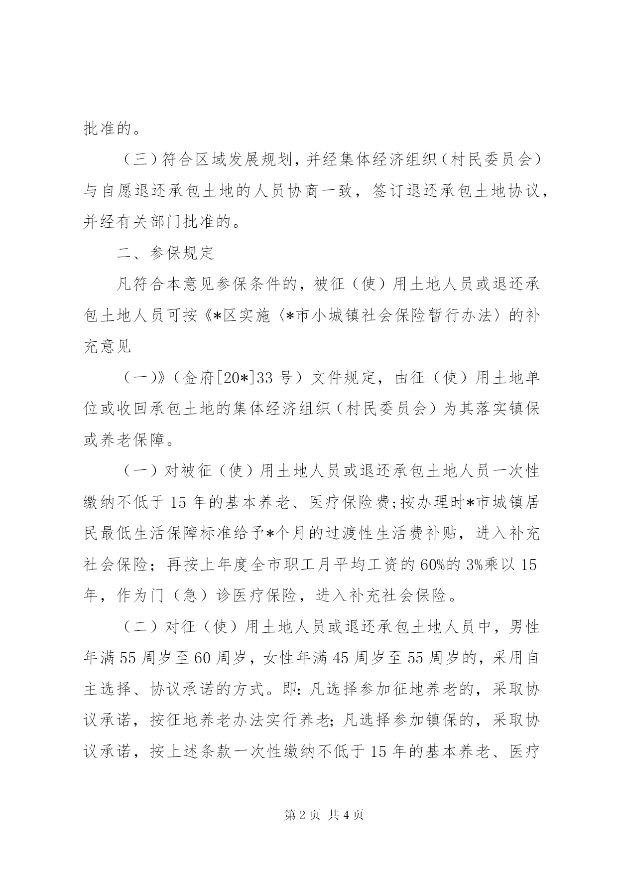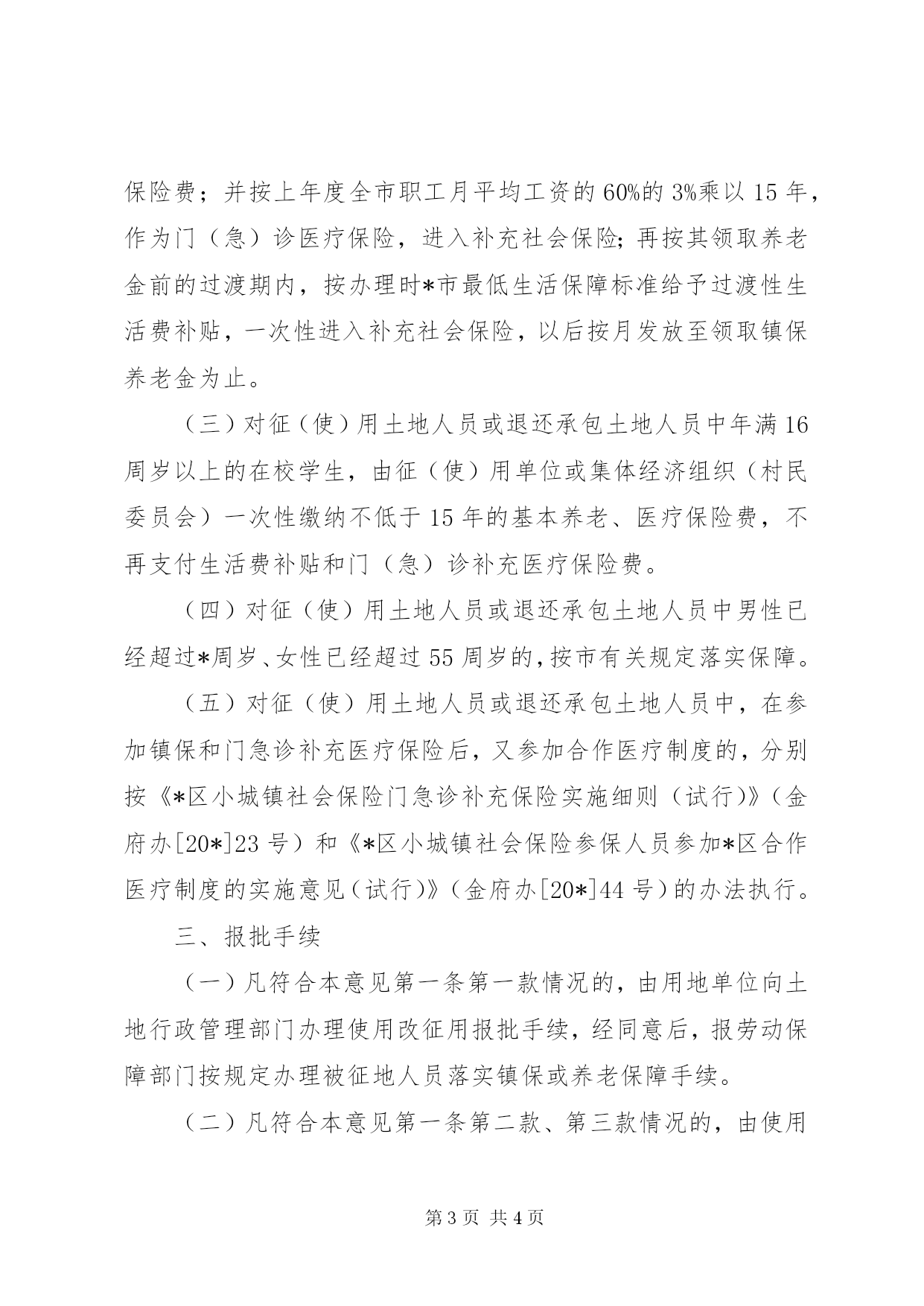 第PAGE\*Arabic\*MERGEFORMAT4页共NUMPAGES\*MERGEFORMAT4页城镇社会保险实施意见(市)为了进一步积极、稳妥地推进小城镇社会保险(以下简称镇保),根据《*市小城镇社会保险暂行办法》(沪府发[20*]65号)(以下简称《暂行办法》)和*市镇保工作协调推进联席会议办公室等部门《关于实施〈*市小城镇社会保险暂行办法〉若干问题处理意见的通知(二)》(沪镇保办发[20*]1号)的有关规定,结合本区实际,对符合条件的被使用土地人员、退还承包土地人员参加镇保的有关问题,特制定补充意见(四)。一、参保条件凡符合下列条件之一的本区农村被使用集体所有土地中涉及1999年土地延包确权后的人员,或自愿退还承包土地的人员,如使用土地单位,或收回土地的集体经济组织(村民委员会)具备经济支付能力的,均可为其按《暂行办法》落实镇保或养老保障,办理户籍转性手续,并相应变更或交还土地承包经营权证。(一)原经土地行政管理部门批准的使用土地,并符合土地利用总体规划的,由土地使用单位提出土地使用改征用的申请,并经有关部门批准的。(二)原经土地行政管理部门批准的使用土地,暂时不被实施土地使用改征用的,如土地使用单位提出申请,并经有关部门批准的。(三)符合区域发展规划,并经集体经济组织(村民委员会)与自愿退还承包土地的人员协商一致,签订退还承包土地协议,并经有关部门批准的。二、参保规定凡符合本意见参保条件的,被征(使)用土地人员或退还承包土地人员可按《*区实施〈*市小城镇社会保险暂行办法〉的补充意见(一)》(金府[20*]33号)文件规定,由征(使)用土地单位或收回承包土地的集体经济组织(村民委员会)为其落实镇保或养老保障。(一)对被征(使)用土地人员或退还承包土地人员一次性缴纳不低于15年的基本养老、医疗保险费;按办理时*市城镇居民最低生活保障标准给予*个月的过渡性生活费补贴,进入补充社会保险;再按上年度全市职工月平均工资的60%的3%乘以15年,作为门(急)诊医疗保险,进入补充社会保险。(二)对征(使)用土地人员或退还承包土地人员中,男性年满55周岁至60周岁,女性年满45周岁至55周岁的,采用自主选择、协议承诺的方式。即:凡选择参加征地养老的,采取协议承诺,按征地养老办法实行养老;凡选择参加镇保的,采取协议承诺,按上述条款一次性缴纳不低于15年的基本养老、医疗保险费;并按上年度全市职工月平均工资的60%的3%乘以15年,作为门(急)诊医疗保险,进入补充社会保险;再按其领取养老金前的过渡期内,按办理时*市最低生活保障标准给予过渡性生活费补贴,一次性进入补充社会保险,以后按月发放至领取镇保养老金为止。(三)对征(使)用土地人员或退还承包土地人员中年满16周岁以上的在校学生,由征(使)用单位或集体经济组织(村民委员会)一次性缴纳不低于15年的基本养老、医疗保险费,不再支付生活费补贴和门(急)诊补充医疗保险费。(四)对征(使)用土地人员或退还承包土地人员中男性已经超过*周岁、女性已经超过55周岁的,按市有关规定落实保障。(五)对征(使)用土地人员或退还承包土地人员中,在参加镇保和门急诊补充医疗保险后,又参加合作医疗制度的,分别按《*区小城镇社会保险门急诊补充保险实施细则(试行)》(金府办[20*]23号)和《*区小城镇社会保险参保人员参加*区合作医疗制度的实施意见(试行)》(金府办[20*]44号)的办法执行。三、报批手续(一)凡符合本意见第一条第一款情况的,由用地单位向土地行政管理部门办理使用改征用报批手续,经同意后,报劳动保障部门按规定办理被征地人员落实镇保或养老保障手续。(二)凡符合本意见第一条第二款、第三款情况的,由使用土地单位或集体经济组织(村民委员会)向所在地镇人民政府提出申请,经审核后,由镇人民政府向区人民政府报告,经审核同意后,由区人民政府报请市劳动保障部门办妥有关手续后,落实镇保或养老保障手续。